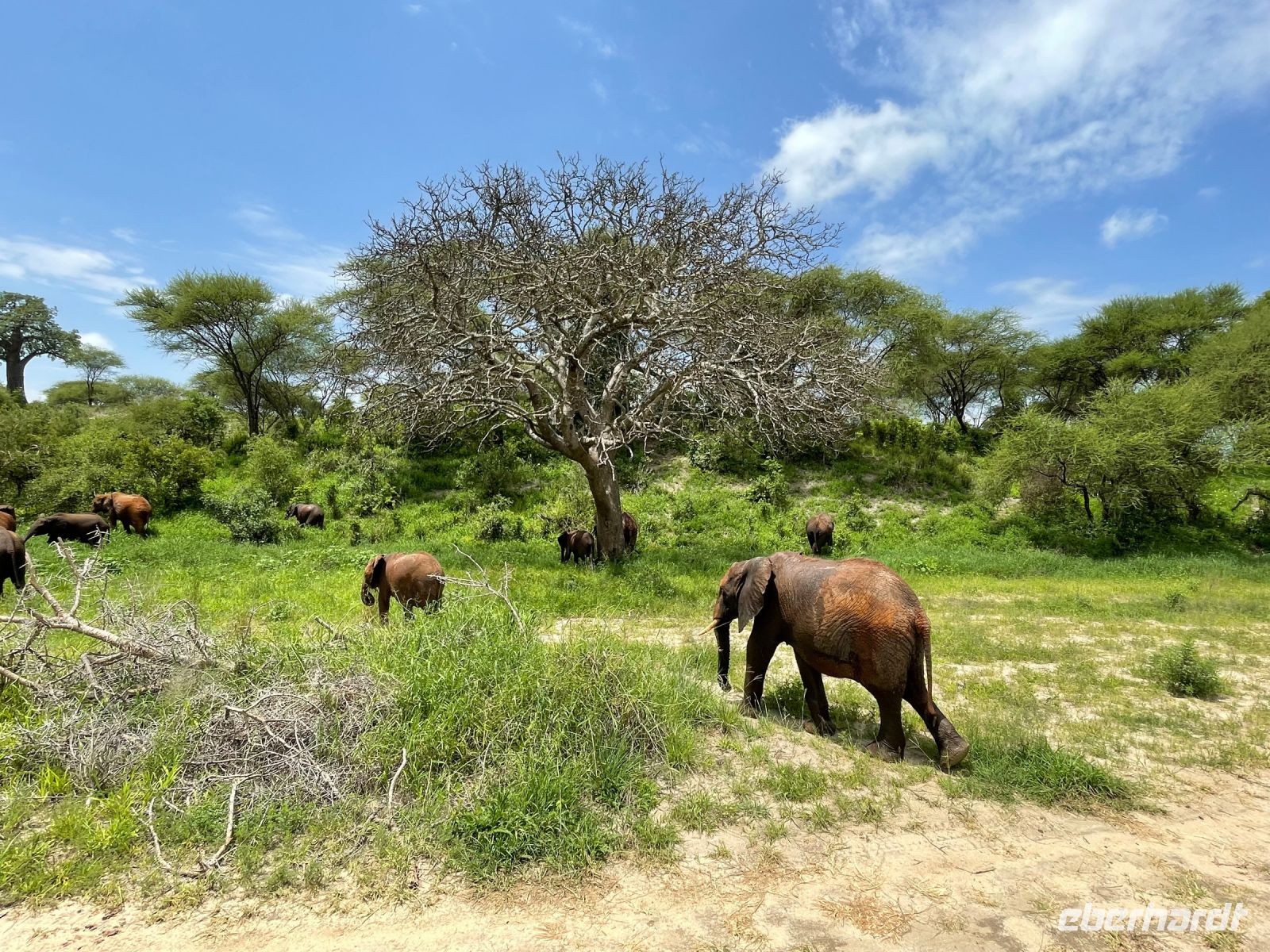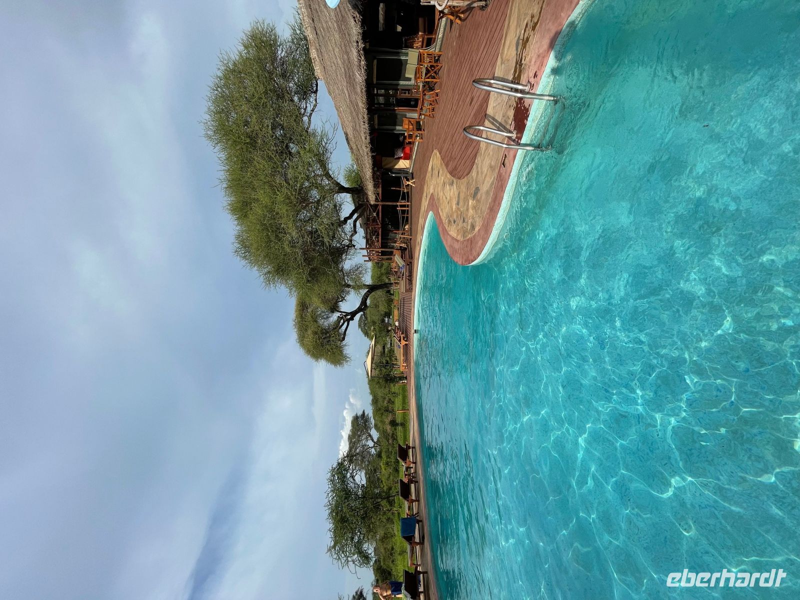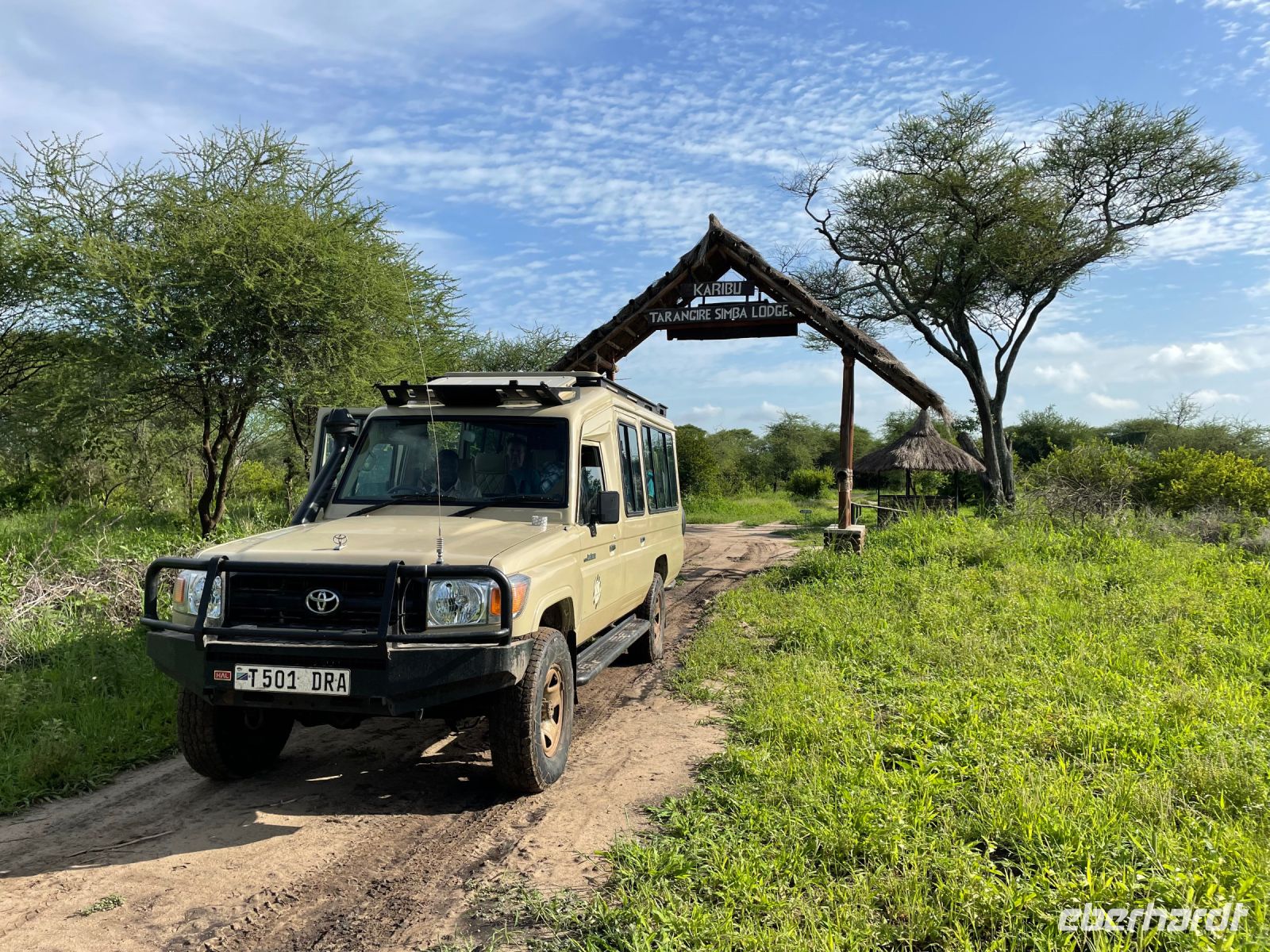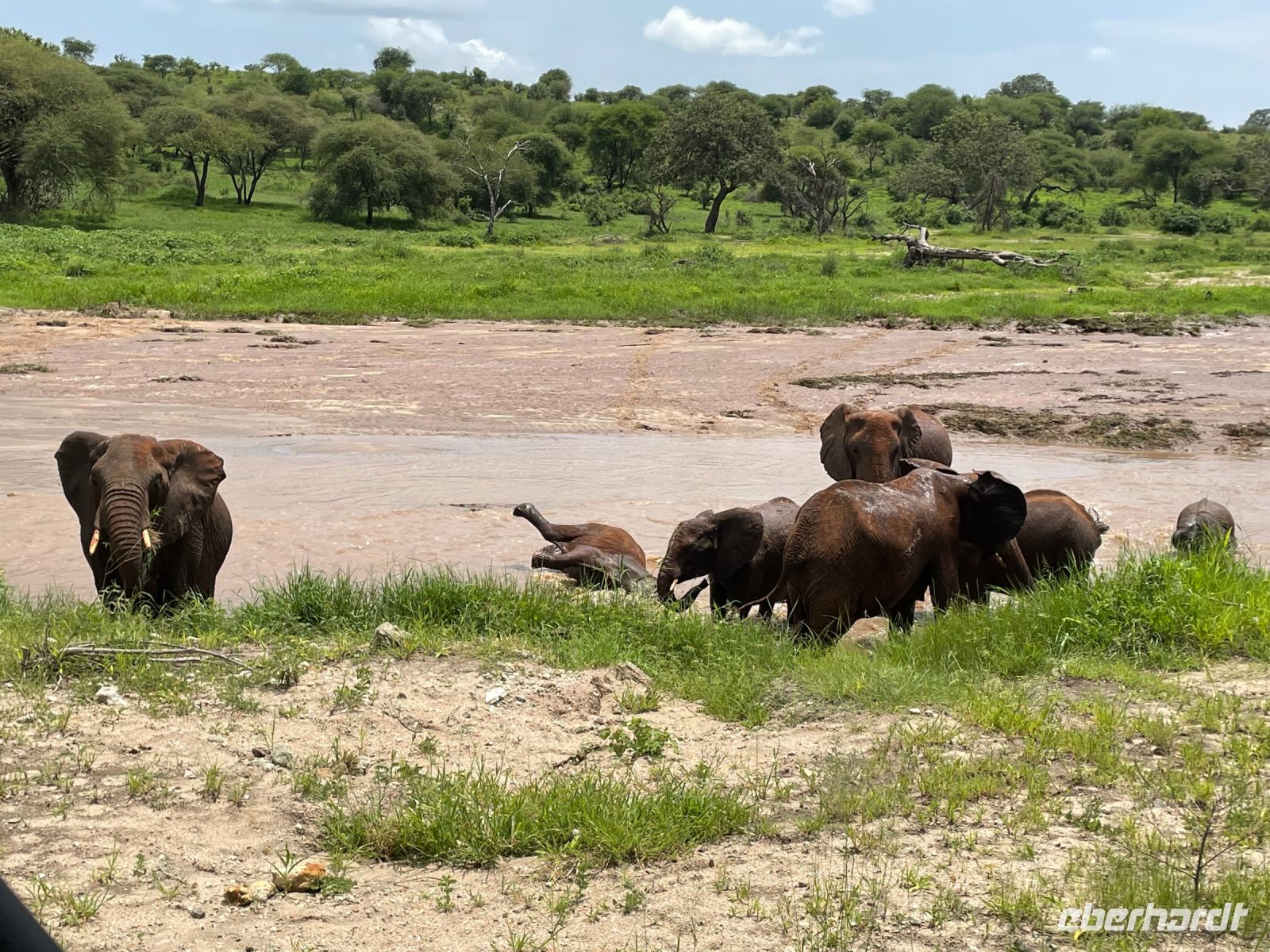 Tag 4, Nationalpark Nummer 2: der Tarangire-Nationalpark im Norden. Gegen Mittag starten wir hier unsere Safari und sehen gleich zu Beginn viele Elefanten und sogar drei Geparden. Wir sind genau zur richtigen Stelle am richtigen Ort und total begeistert. Danach geht es weiter zum Tarangiri Fluss, wo wir nochmals Unmengen an Elefanten entdecken. Gegen 17:00 Uhr erreichen wir unsere Tarangire Lodge und werden freundlich beim Check-In begrüßt. Wir erhalten eine Sicherheitseinweisung für unseren Aufenthalt, da man hier abends/nachts nicht alleine zum Zelt laufen darf, aufgrund der wilden Tiere. Die Lodge ist wunderschön und hat einen Pool. Nach dem Abendessen sitzen wir wieder gemeinsam am Lagerfeuer und schauen die Bilder und Videos der letzten beiden Safaris an.