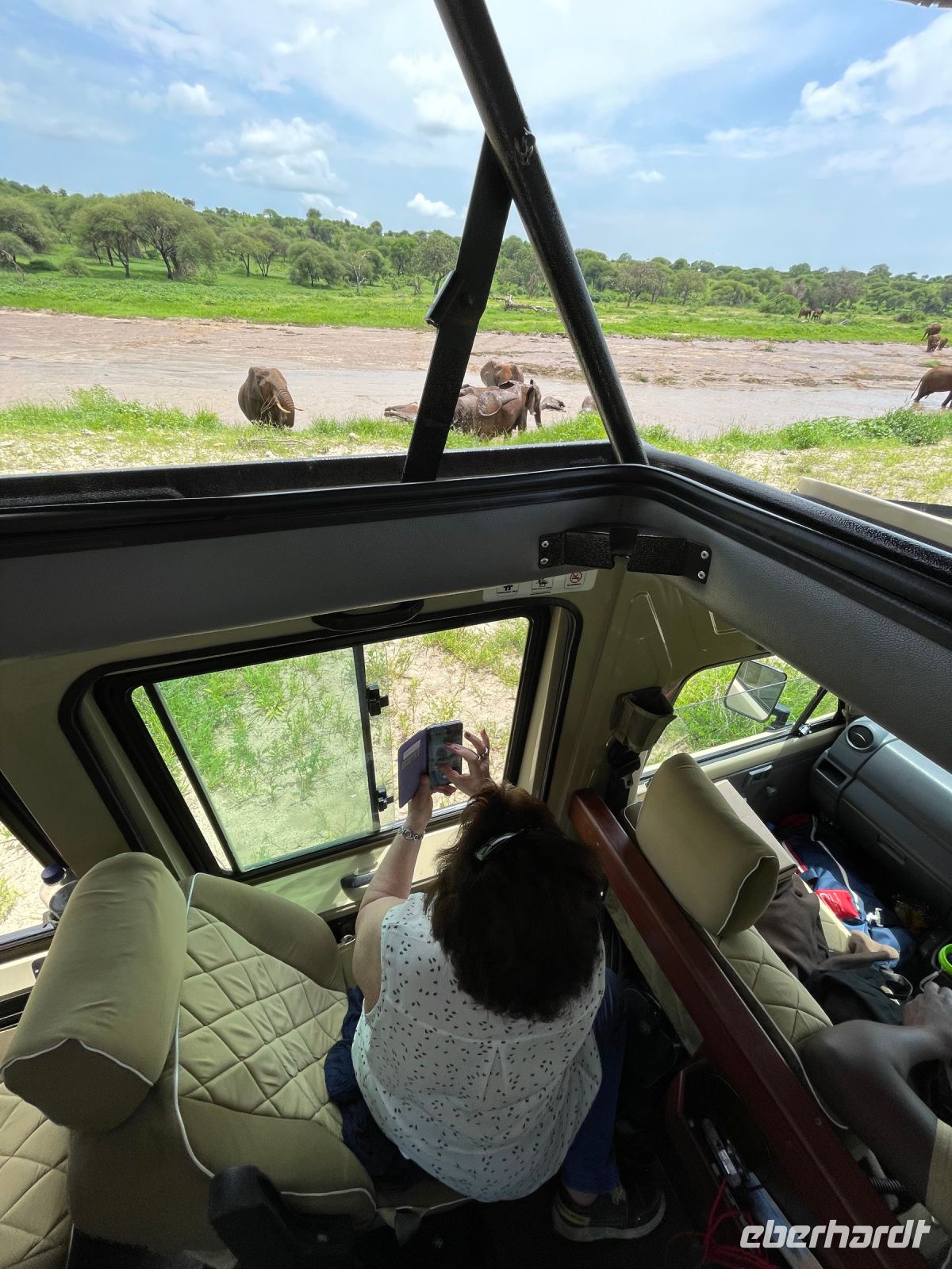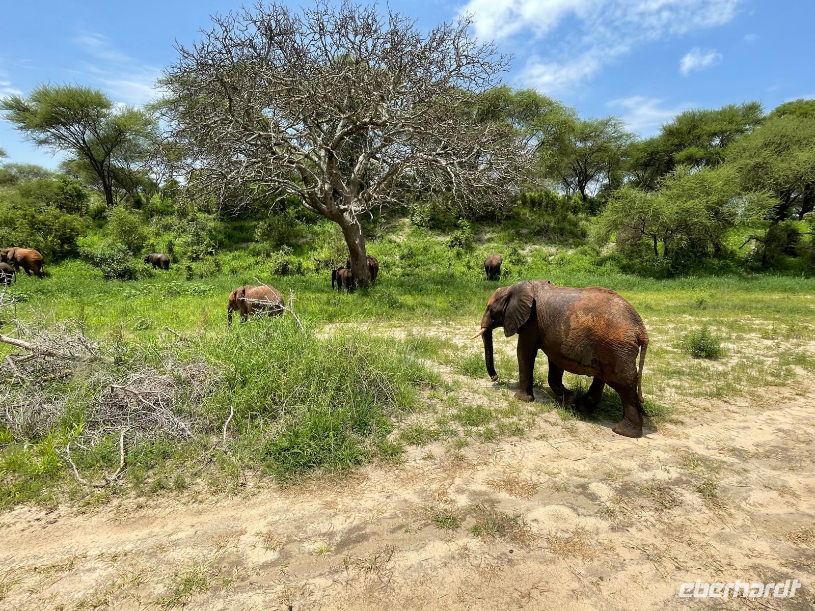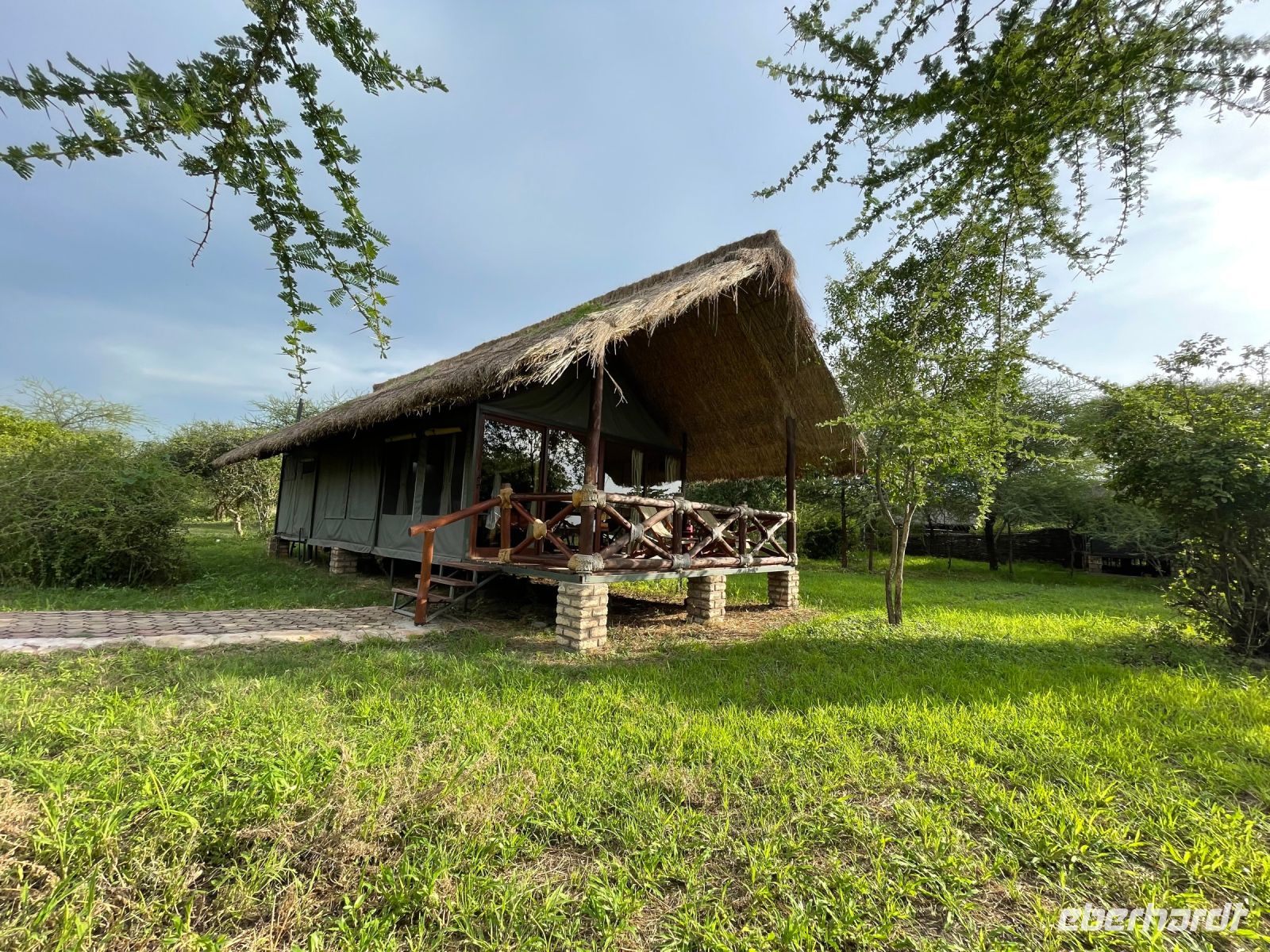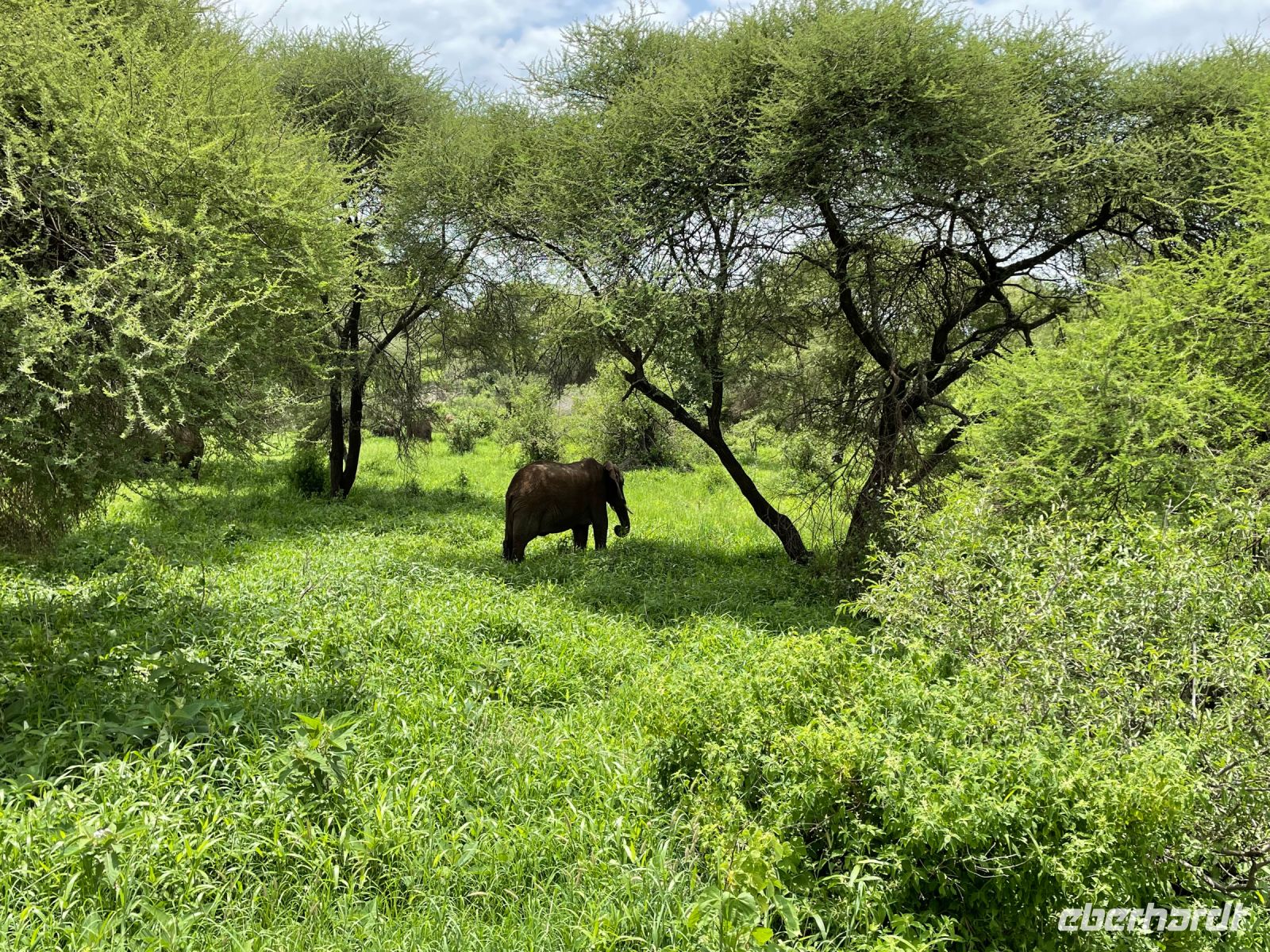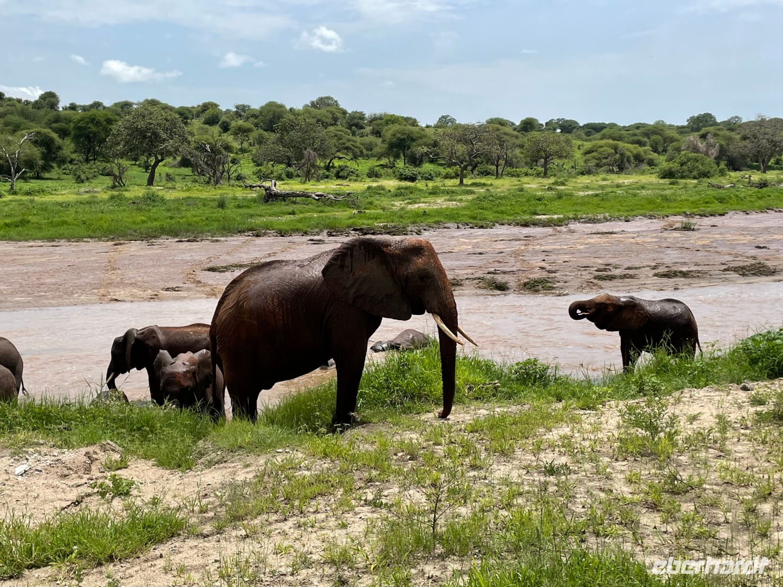 Tag 4, Nationalpark Nummer 2: der Tarangire-Nationalpark im Norden. Gegen Mittag starten wir hier unsere Safari und sehen gleich zu Beginn viele Elefanten und sogar drei Geparden. Wir sind genau zur richtigen Stelle am richtigen Ort und total begeistert. Danach geht es weiter zum Tarangiri Fluss, wo wir nochmals Unmengen an Elefanten entdecken. Gegen 17:00 Uhr erreichen wir unsere Tarangire Lodge und werden freundlich beim Check-In begrüßt. Wir erhalten eine Sicherheitseinweisung für unseren Aufenthalt, da man hier abends/nachts nicht alleine zum Zelt laufen darf, aufgrund der wilden Tiere. Die Lodge ist wunderschön und hat einen Pool. Nach dem Abendessen sitzen wir wieder gemeinsam am Lagerfeuer und schauen die Bilder und Videos der letzten beiden Safaris an.
