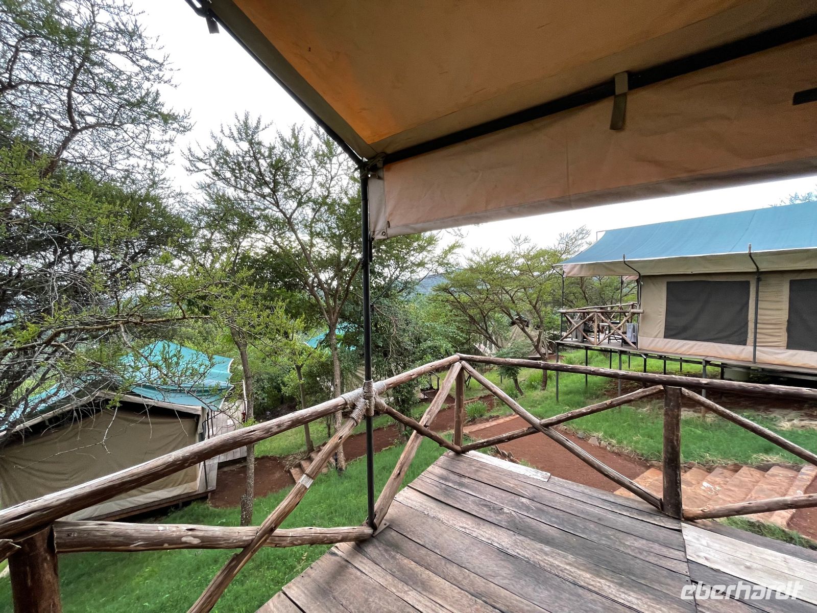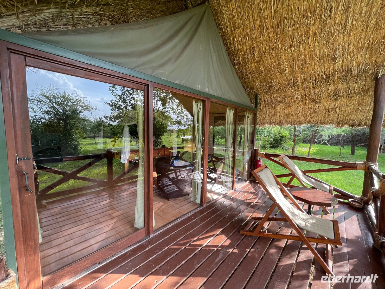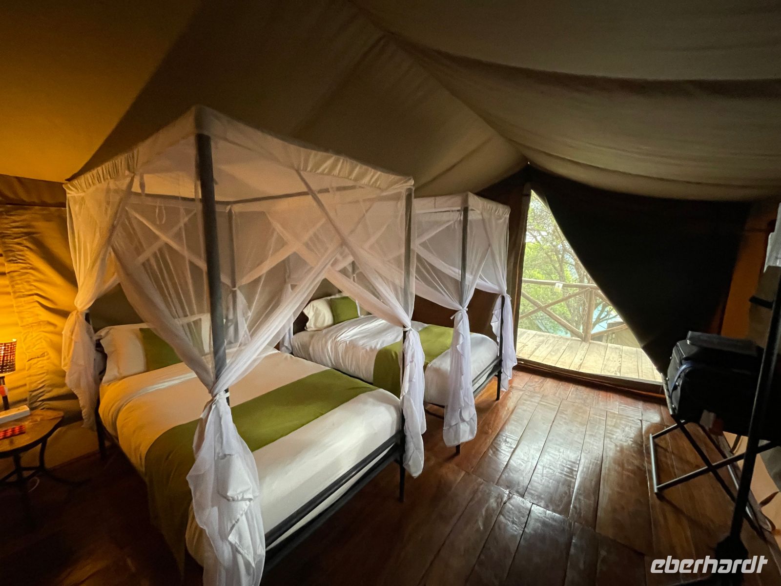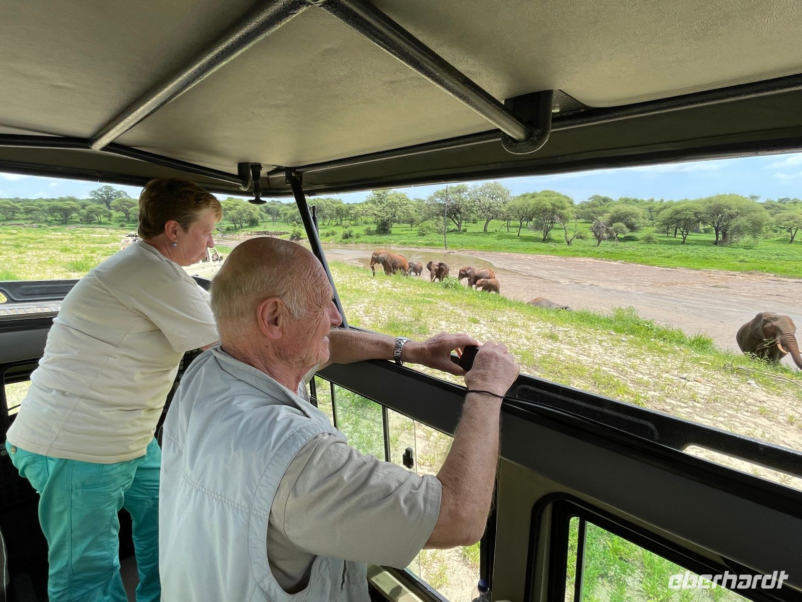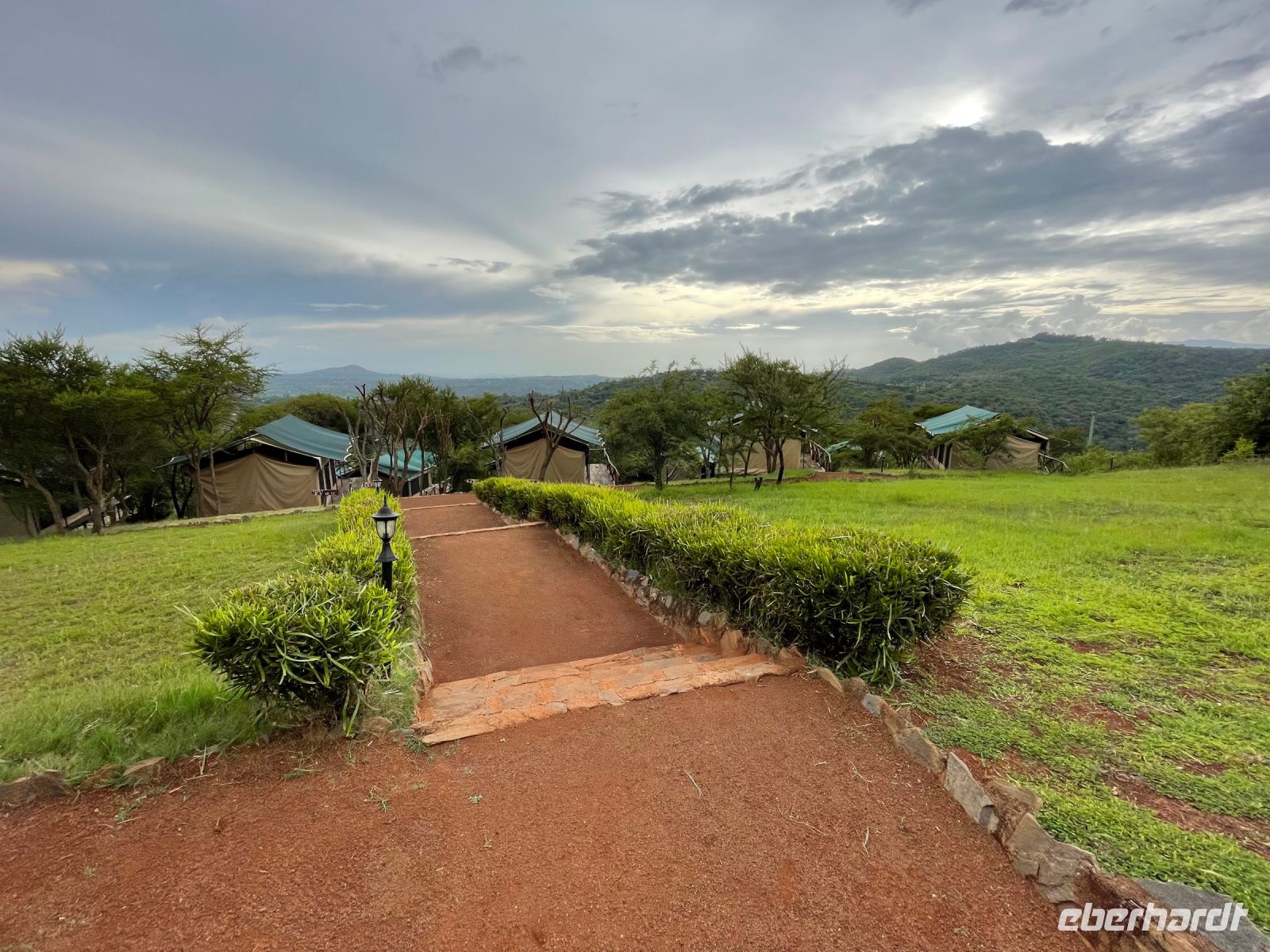 Tag 4, Nationalpark Nummer 2: der Tarangire-Nationalpark im Norden. Gegen Mittag starten wir hier unsere Safari und sehen gleich zu Beginn viele Elefanten und sogar drei Geparden. Wir sind genau zur richtigen Stelle am richtigen Ort und total begeistert. Danach geht es weiter zum Tarangiri Fluss, wo wir nochmals Unmengen an Elefanten entdecken. Gegen 17:00 Uhr erreichen wir unsere Tarangire Lodge und werden freundlich beim Check-In begrüßt. Wir erhalten eine Sicherheitseinweisung für unseren Aufenthalt, da man hier abends/nachts nicht alleine zum Zelt laufen darf, aufgrund der wilden Tiere. Die Lodge ist wunderschön und hat einen Pool. Nach dem Abendessen sitzen wir wieder gemeinsam am Lagerfeuer und schauen die Bilder und Videos der letzten beiden Safaris an.