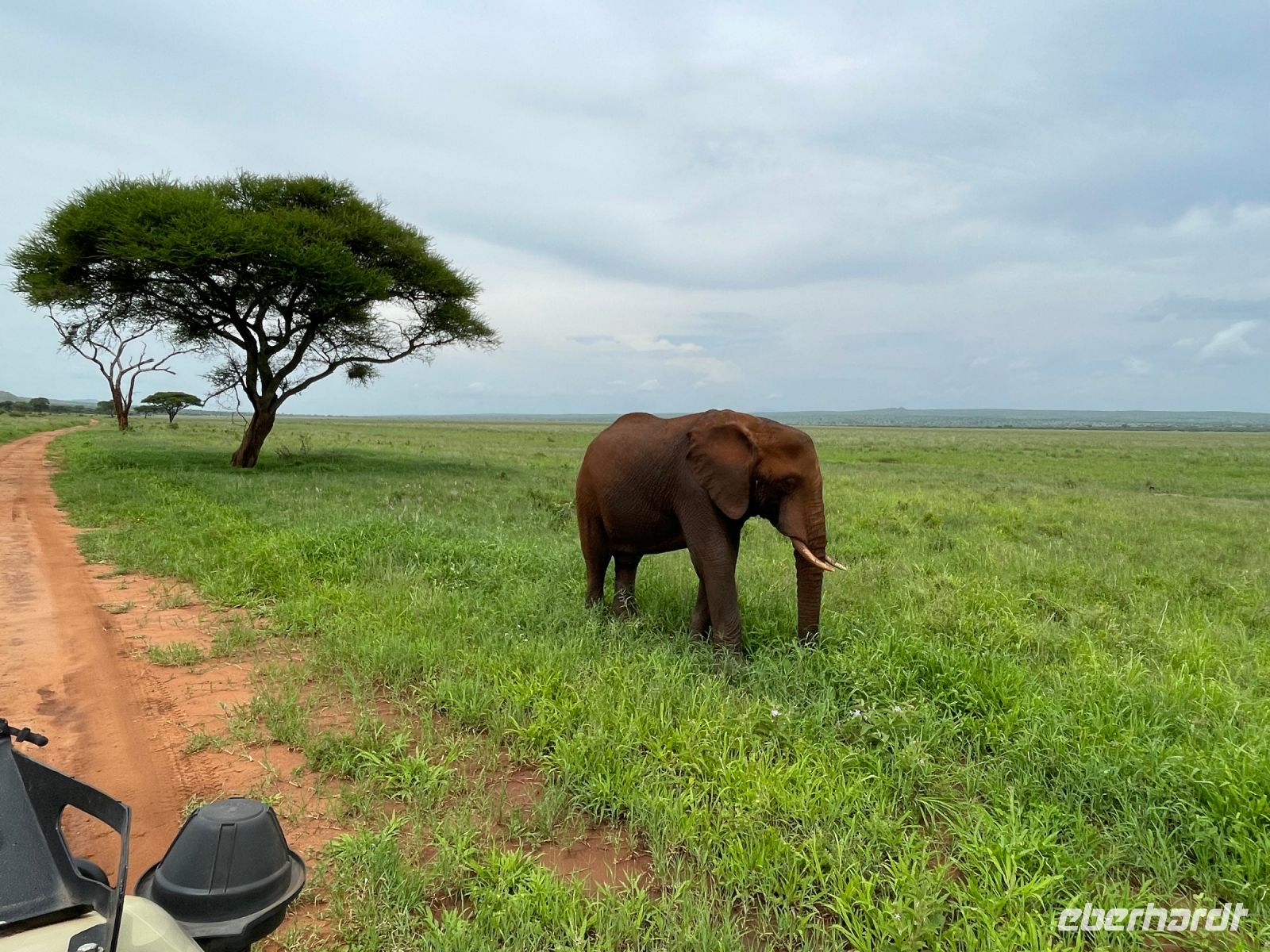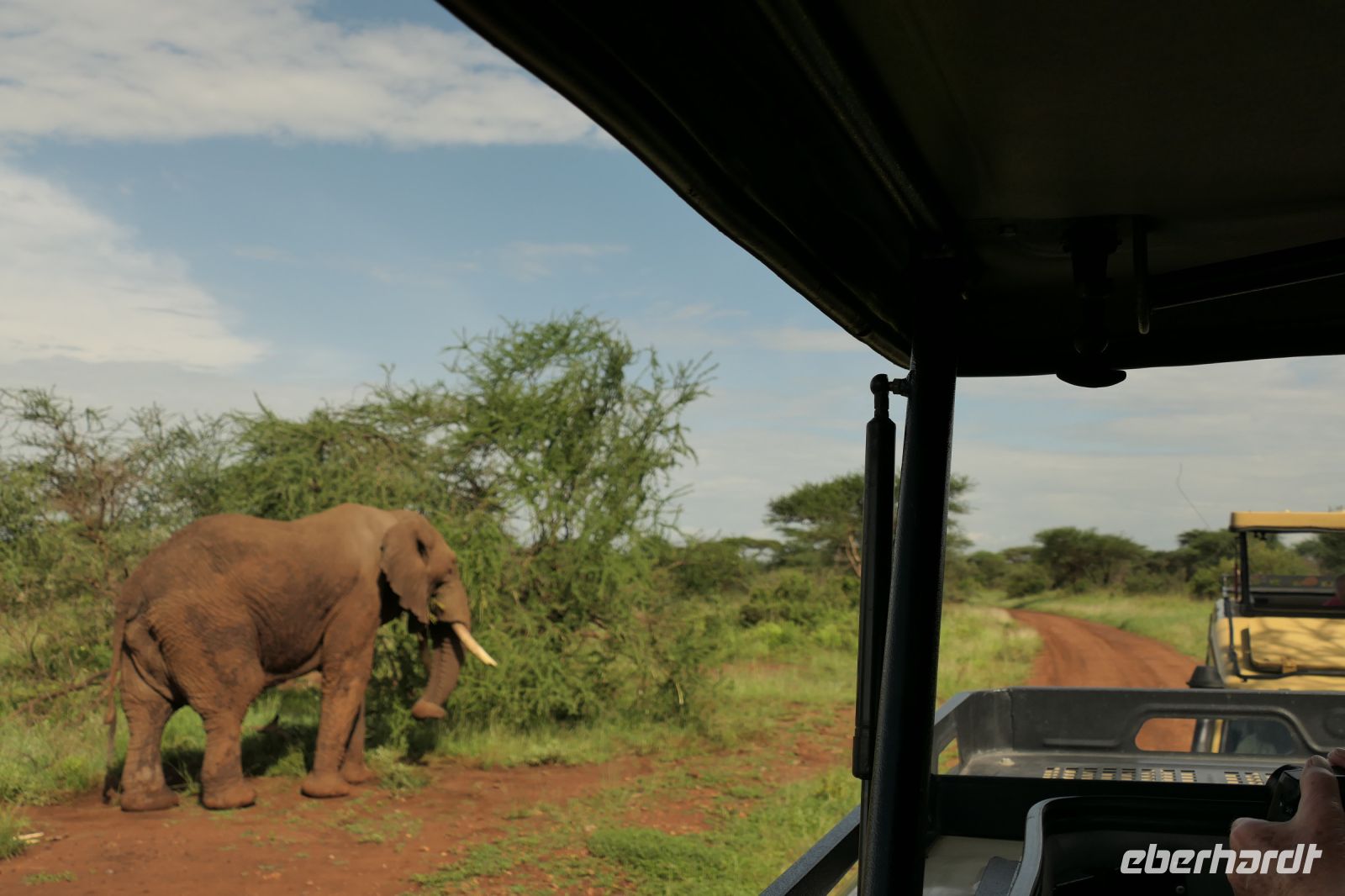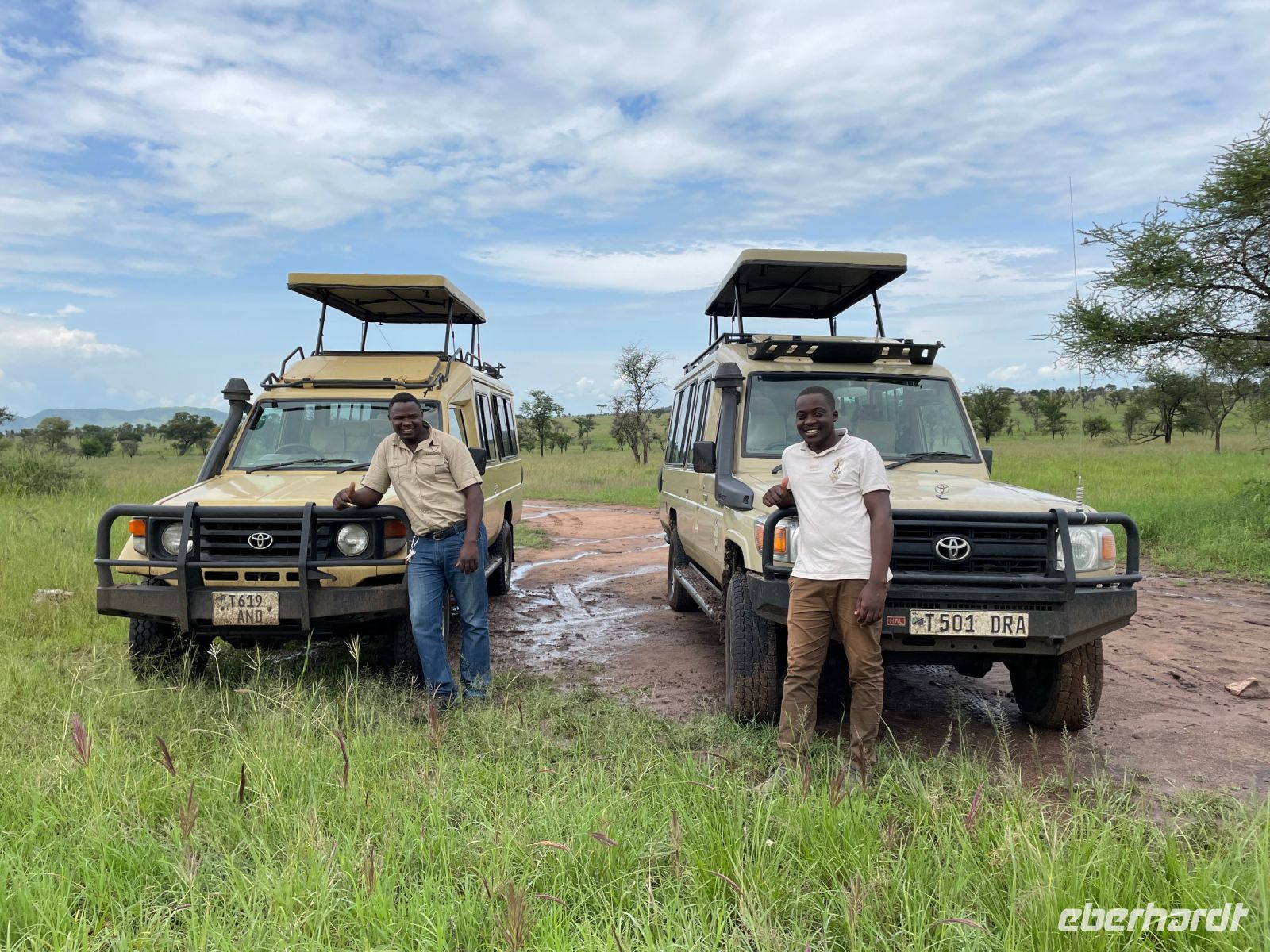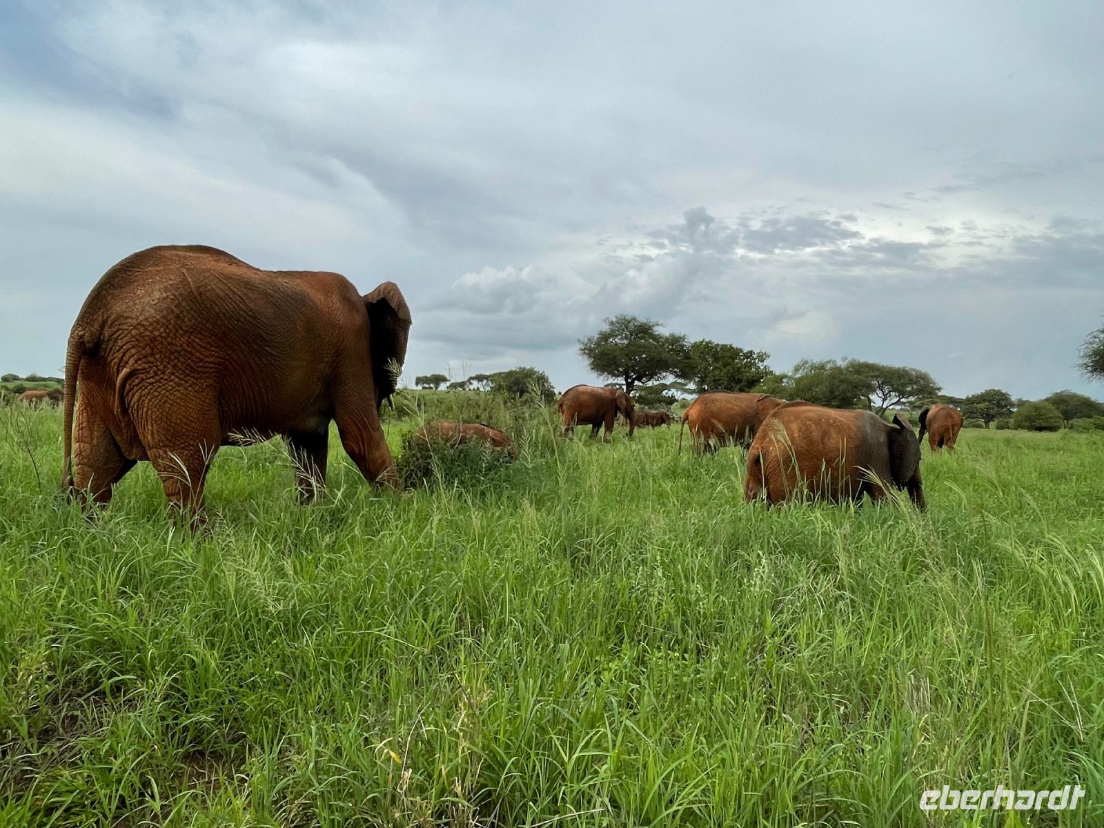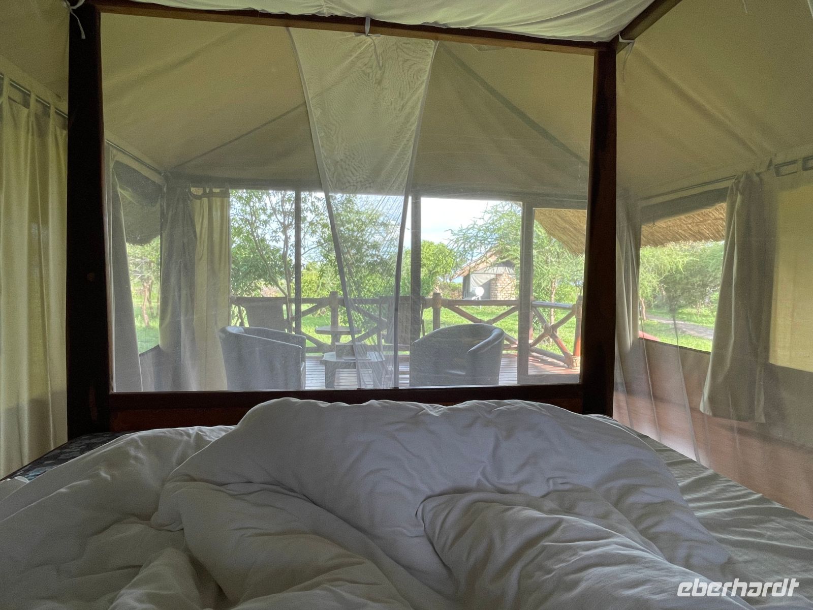 Tag 4, Nationalpark Nummer 2: der Tarangire-Nationalpark im Norden. Gegen Mittag starten wir hier unsere Safari und sehen gleich zu Beginn viele Elefanten und sogar drei Geparden. Wir sind genau zur richtigen Stelle am richtigen Ort und total begeistert. Danach geht es weiter zum Tarangiri Fluss, wo wir nochmals Unmengen an Elefanten entdecken. Gegen 17:00 Uhr erreichen wir unsere Tarangire Lodge und werden freundlich beim Check-In begrüßt. Wir erhalten eine Sicherheitseinweisung für unseren Aufenthalt, da man hier abends/nachts nicht alleine zum Zelt laufen darf, aufgrund der wilden Tiere. Die Lodge ist wunderschön und hat einen Pool. Nach dem Abendessen sitzen wir wieder gemeinsam am Lagerfeuer und schauen die Bilder und Videos der letzten beiden Safaris an.