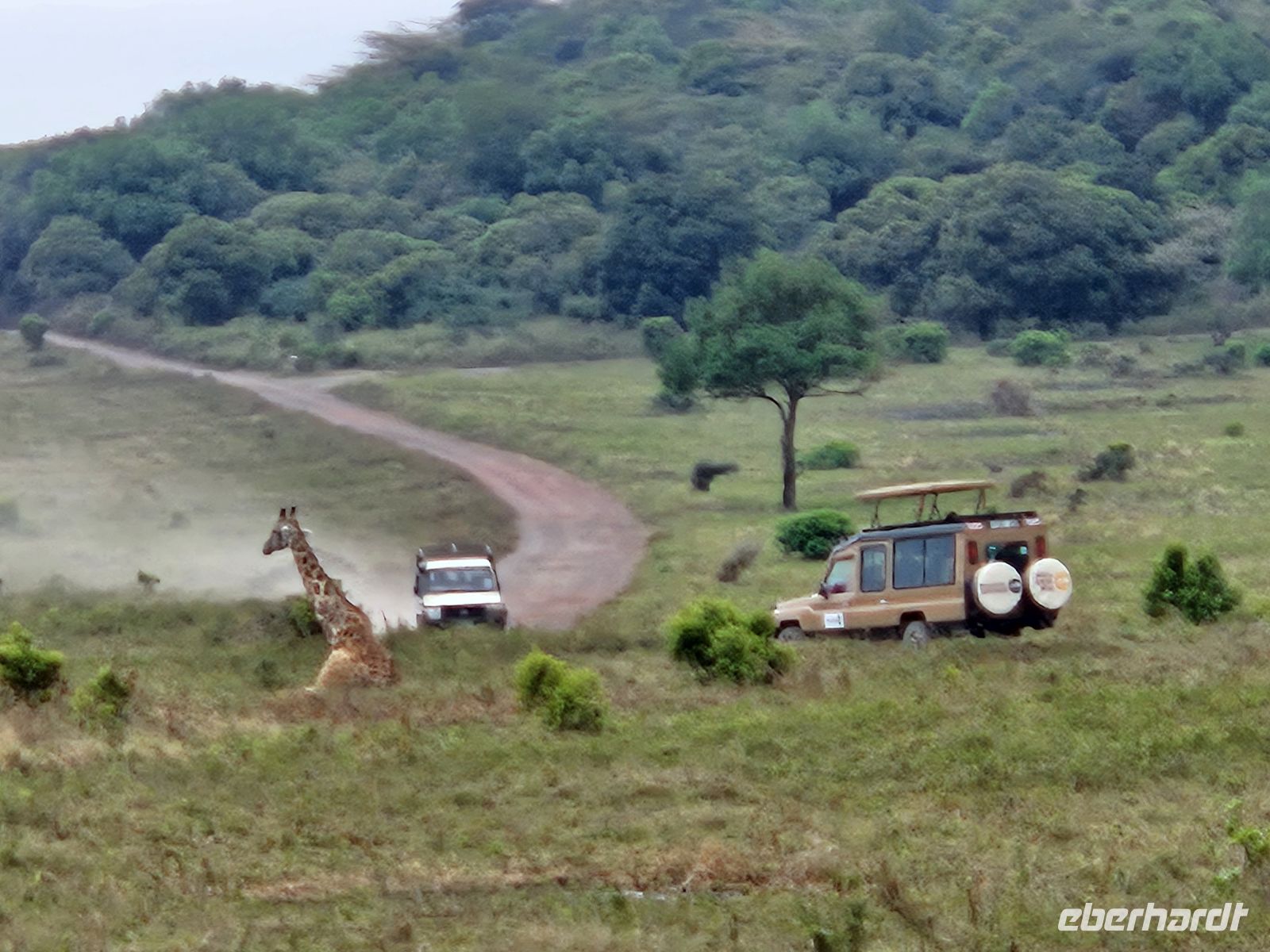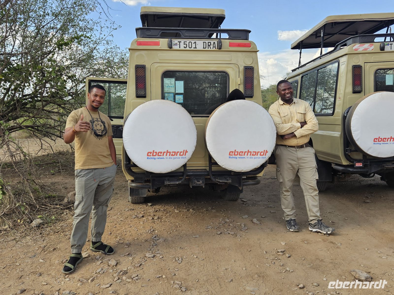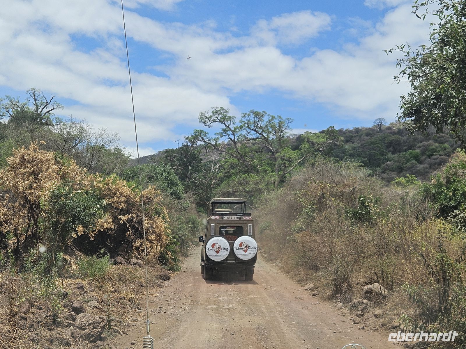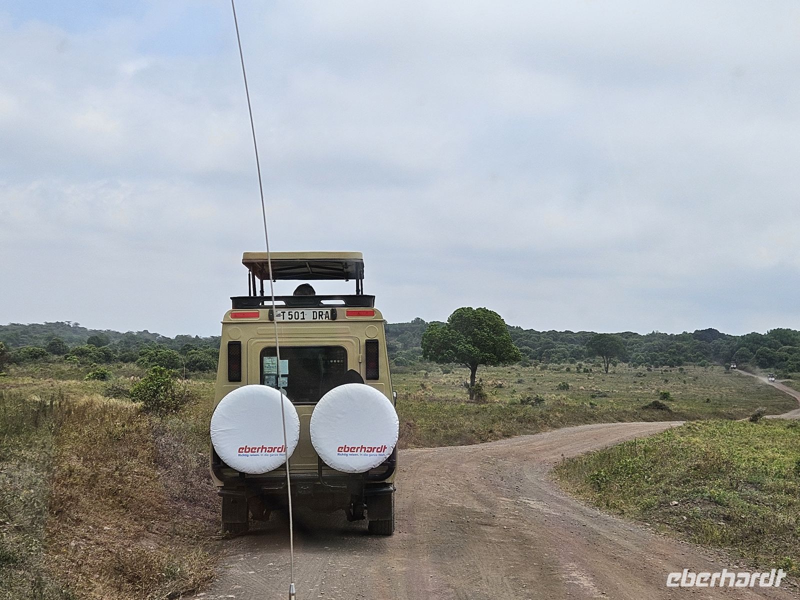 Nach dem Frühstück in unserer Lodge, standen unsere zwei Jeeps mit Eberhardt-Branding bereit und wir brachen in Richtung des Arusha-Nationalparks auf. Vorher hatten wir von unserem Driverguide bereits ein kurzes Briefing erhalten, wie man sich auf den Safaris zu verhalten hat und wie unser Programm für die kommenden Tage aussieht. Unser zweiter Driverguide ist Brian.