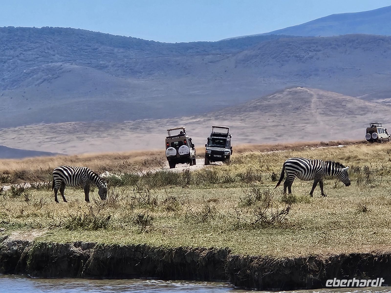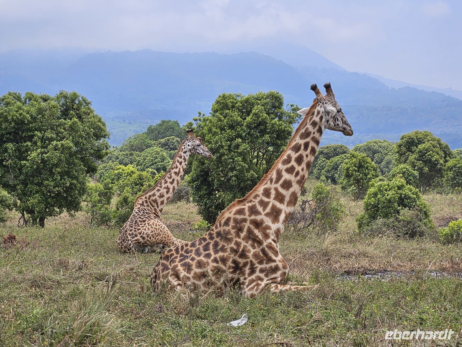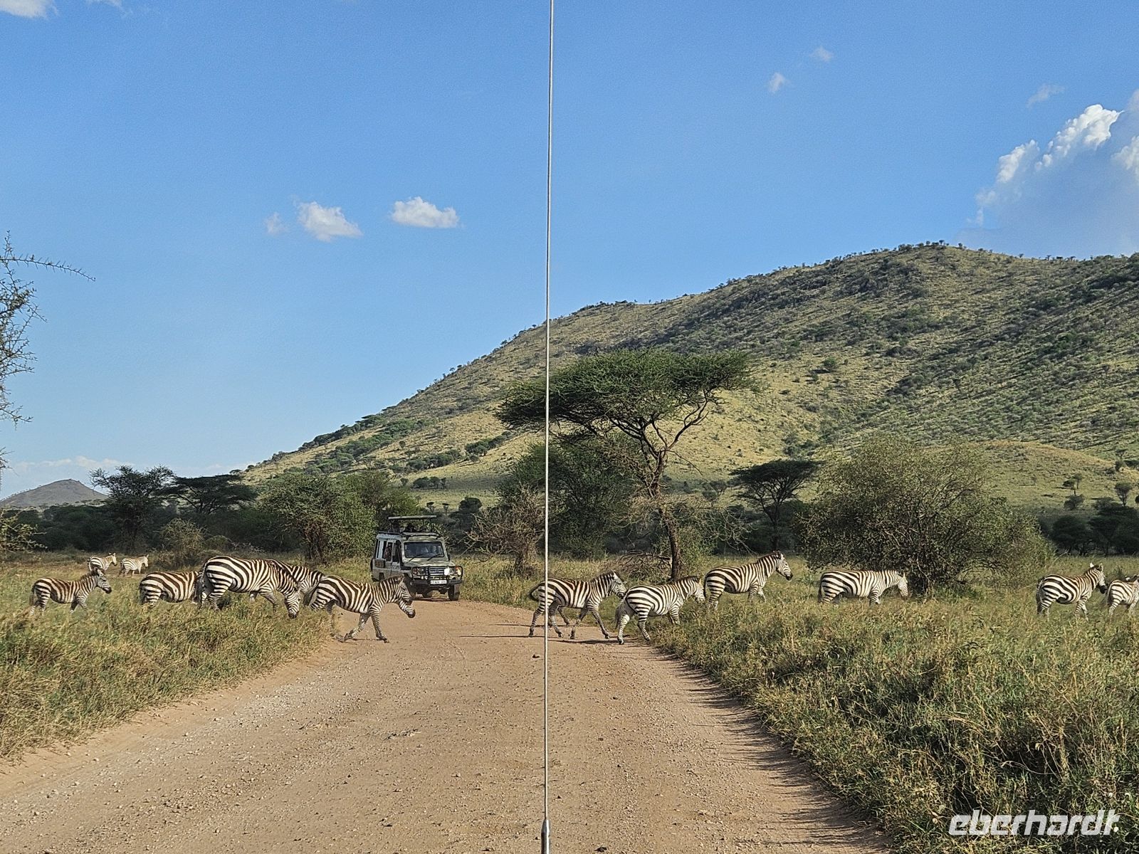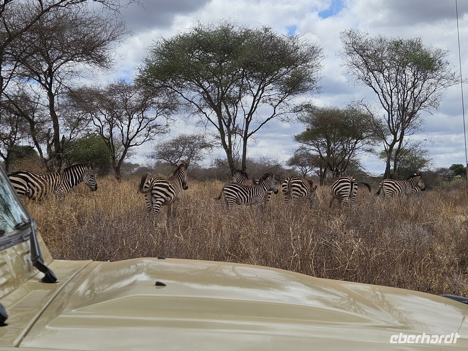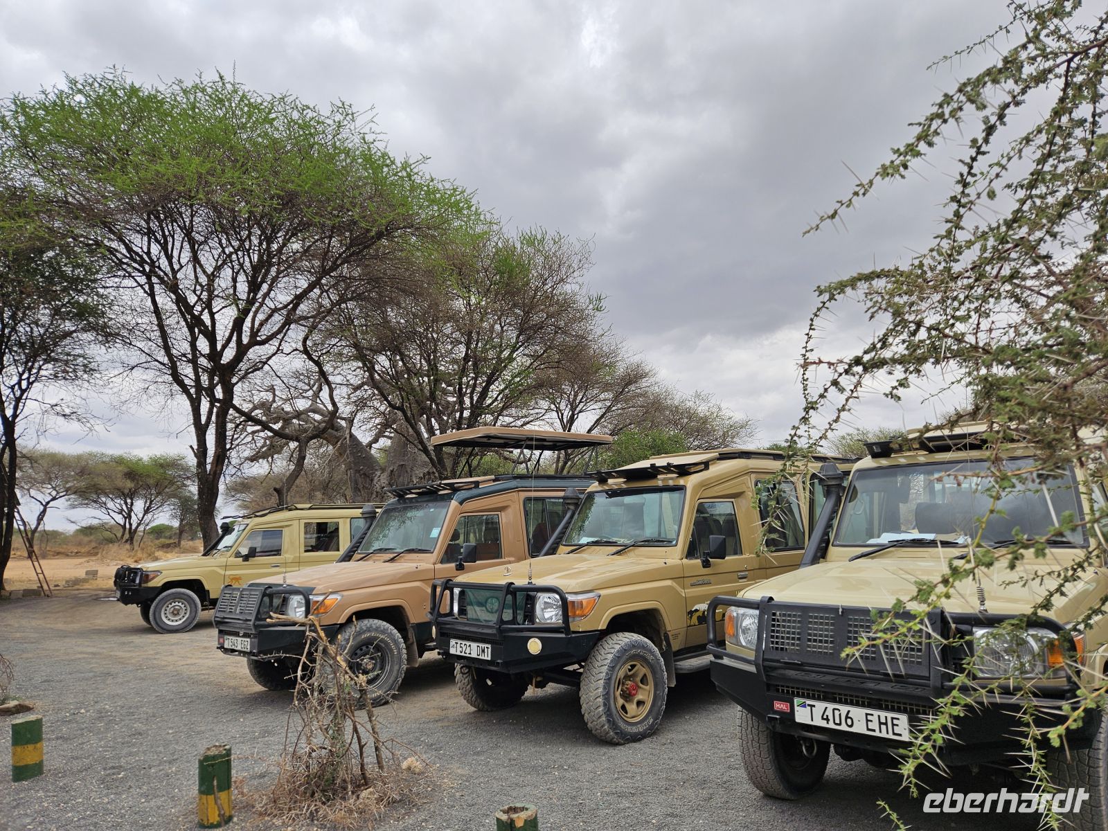 Nach dem Frühstück in unserer Lodge, standen unsere zwei Jeeps mit Eberhardt-Branding bereit und wir brachen in Richtung des Arusha-Nationalparks auf. Vorher hatten wir von unserem Driverguide bereits ein kurzes Briefing erhalten, wie man sich auf den Safaris zu verhalten hat und wie unser Programm für die kommenden Tage aussieht. Unser zweiter Driverguide ist Brian.