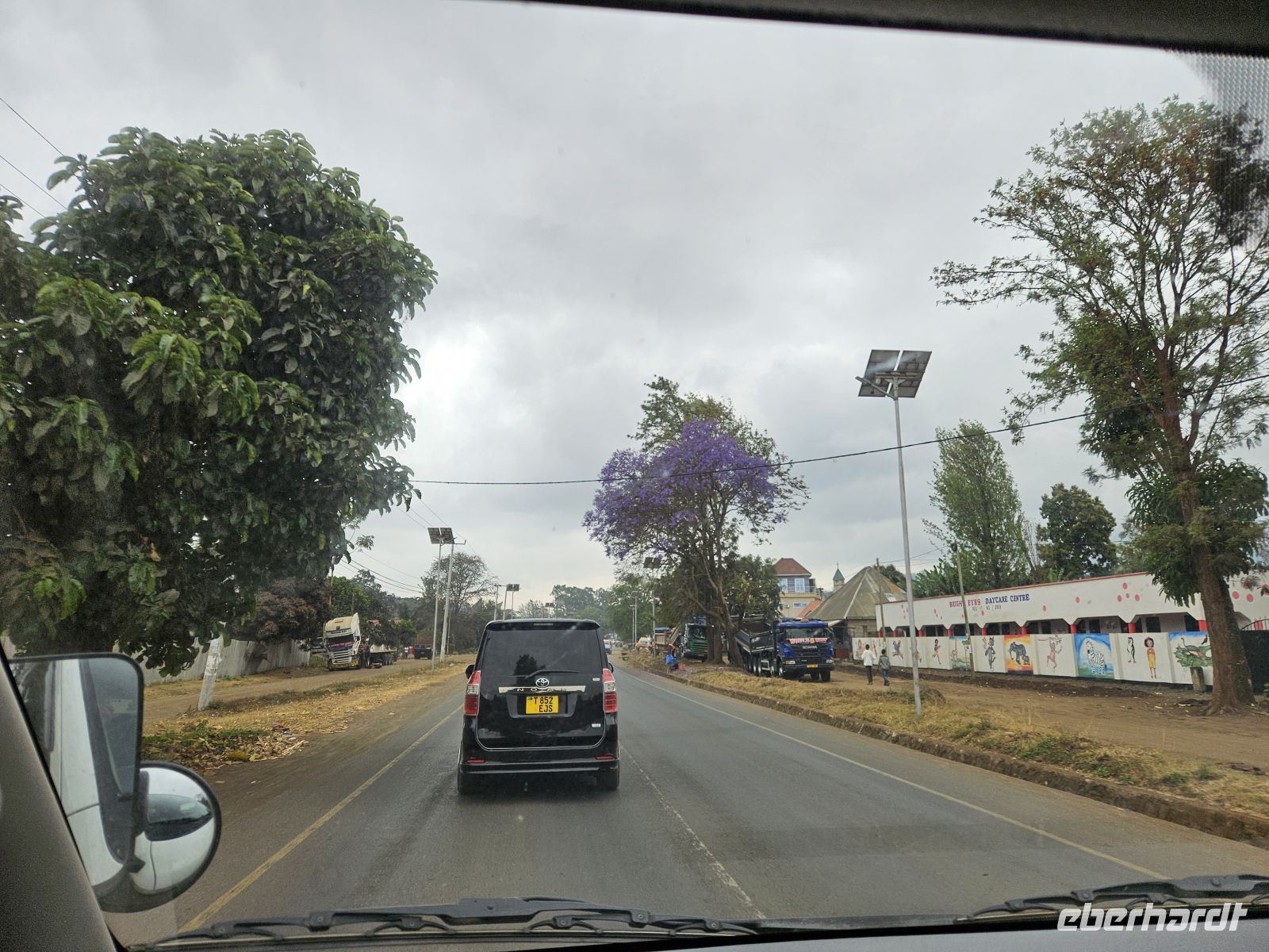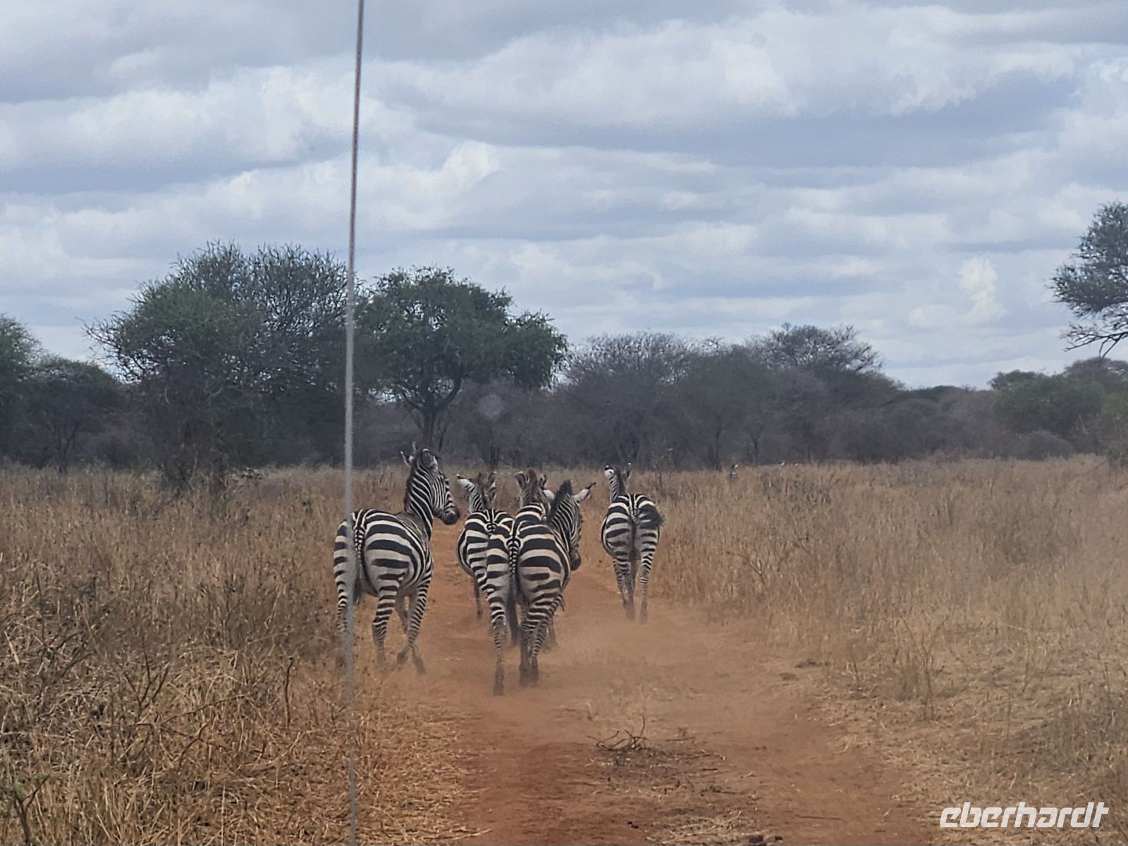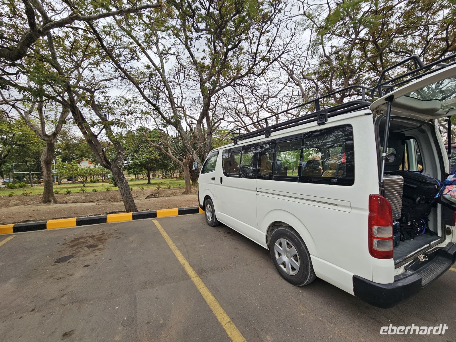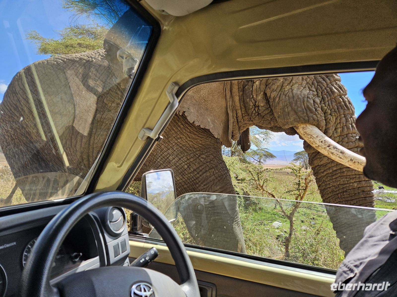 Nach dem Frühstück in unserer Lodge, standen unsere zwei Jeeps mit Eberhardt-Branding bereit und wir brachen in Richtung des Arusha-Nationalparks auf. Vorher hatten wir von unserem Driverguide bereits ein kurzes Briefing erhalten, wie man sich auf den Safaris zu verhalten hat und wie unser Programm für die kommenden Tage aussieht. Unser zweiter Driverguide ist Brian.