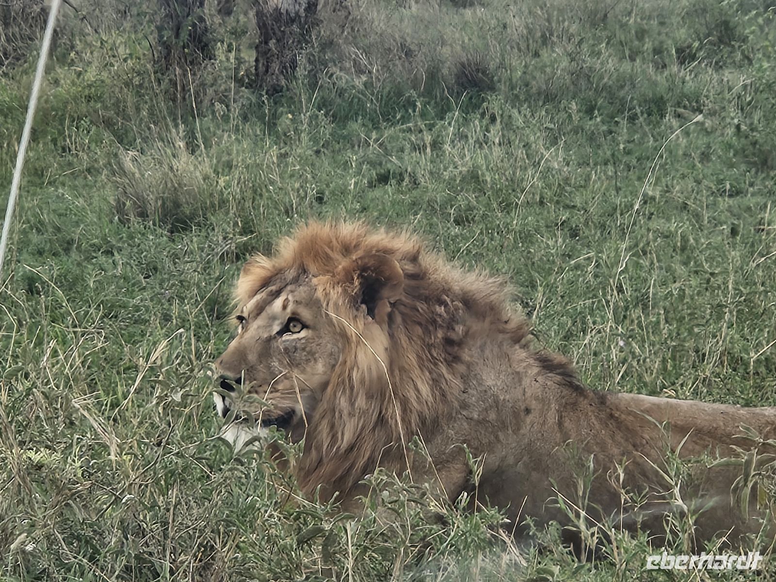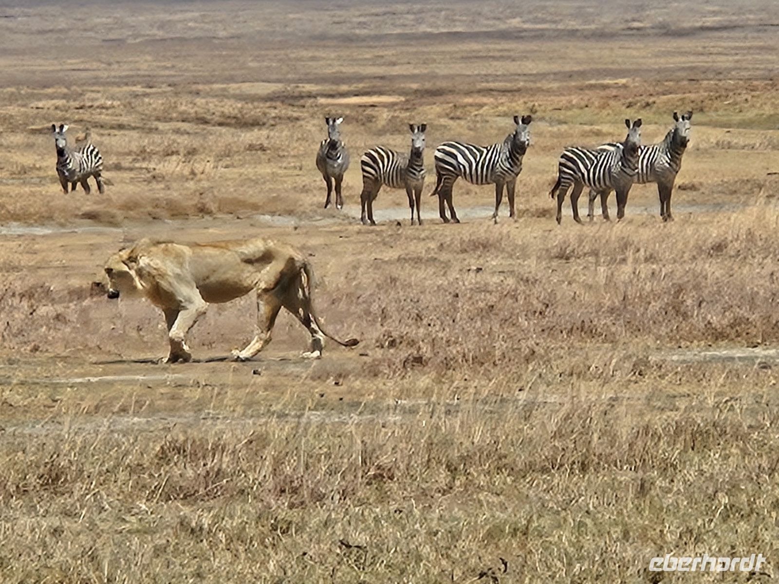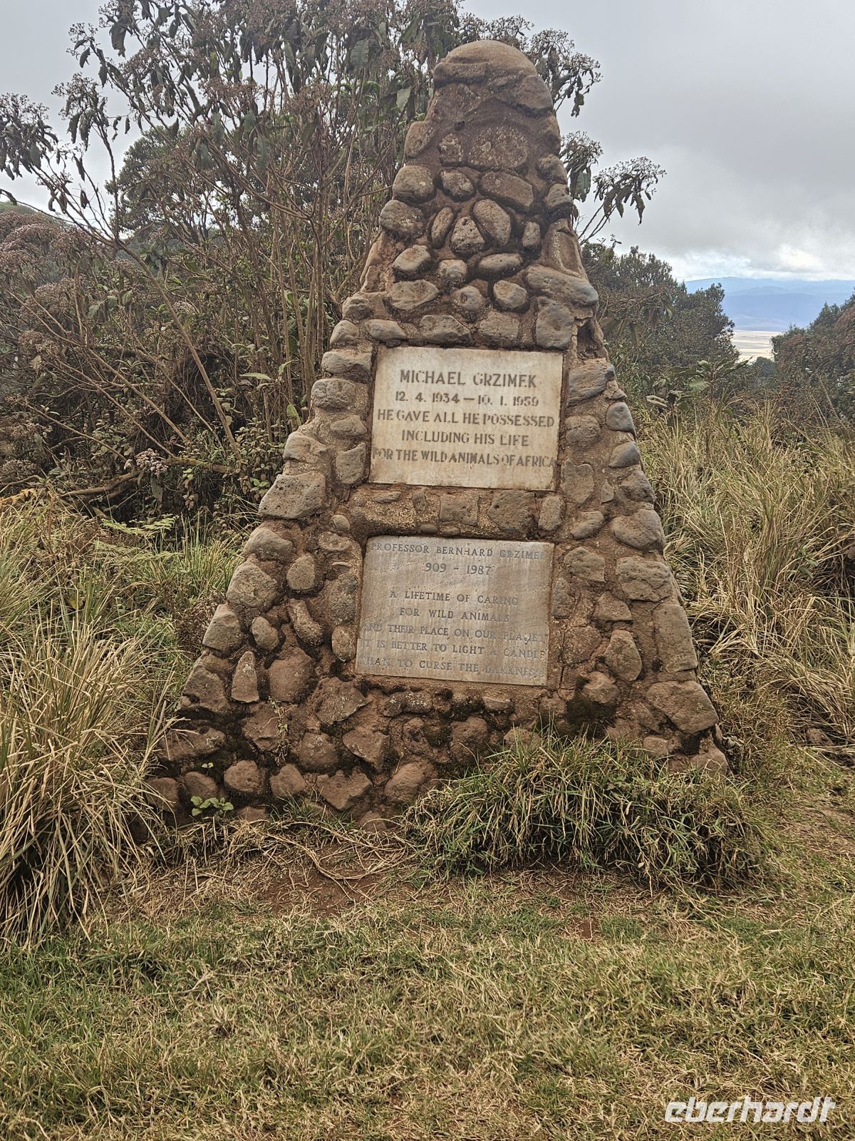 Beim Frühstück in der Lodge konnten wir uns auch gleich unsere Lunchboxen für den Tag zusammenstellen lassen. Dies ist eine gute Variante, um nur auszuwählen, was man auch wirklich essen möchte. Unser heutiges Ziel für heute war der Ngorongoro-Krater. Nirgendwo sonst in Afrika leben so viele Tiere auf so engem wie im Krater des erloschenen Ngrorongoro-Vulkans – dem größten Riesenkrater am östlichen Rand der Serengeti. Fährt man in das Gebiet ein, befindet man sich zunächst in ca. 1100 Metern Höhe und fährt durch immergrüne Wälder. Hier fühlen sich die Paviane besonders wohl und springen in kleinen Grüppchen über die Straße oder durch die Bäume. In der Nähe des Kraterrands findet sich das Grab von Michael und Bernhard Grzimek. Im Jahr 1959 waren Vater und Sohn im Serengeti-Park unterwegs, zu dem damals auch das Gelände des Ngrongoro-Kraters gehörte. Bernhard Grzimek war Zoodirektor des Frankfurter Zoos und hatte den Auftrag die Tiere in der Serengeti zu zählen. Die beiden waren mit einem Hubschreiber, der mit Zebrastreifen bemalt war, unterwegs und konnten auf diese Art und Weise im Tiefflug die Tiere zählen. Ihre Erlebnissen filmten sie und aus den Filmaufnahmen entstand der oscarprämierte Dokumentarfilm „Serengeti darf nicht sterben“. Als die Dreharbeiten bereits abgeschlossen haben, kam Michael Grzimek mit nur 25 Jahren mit dem Hubschrauber ums Leben. Bernhard Grzimek starb im Jahr 1987 an einem Schlaganfall. Seine Asche wurde zu seinem Sohn am Ngrongoro-Krater überführt. Am Kraterrand bot sich bereits ein toller Ausblick auf den Krater. Nach einigen Fotos traten wir die Fahrt bergab in den Krater hinein ein. In dem Riesenkrater könnte ganz Berlin untergebracht sein. Das ganze Ngorongoro-Gebiet umfasst eine Gesamtfläche von 8300 m² . Ngorongoro ist ein einzigartiger Zusammenschluss verschiedener Ökosysteme. So erblickten wir in den wüstenartigen Savannen Löwen mit mächtigen Mähnen, die einfach an einer Gruppe von Zebras vorbeispazierten oder sich zwischen den Jeeps versteckten. Die uns schon bekannten Zebra- und Gnuherden begegneten uns bei der Fahrt durch den Krater ebenfalls immer wieder.