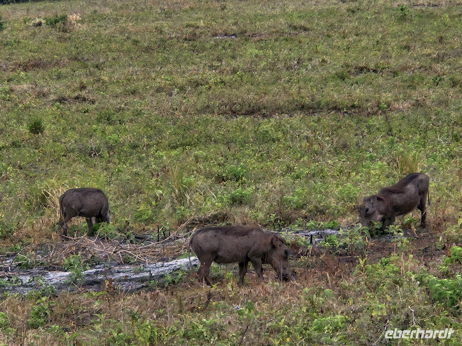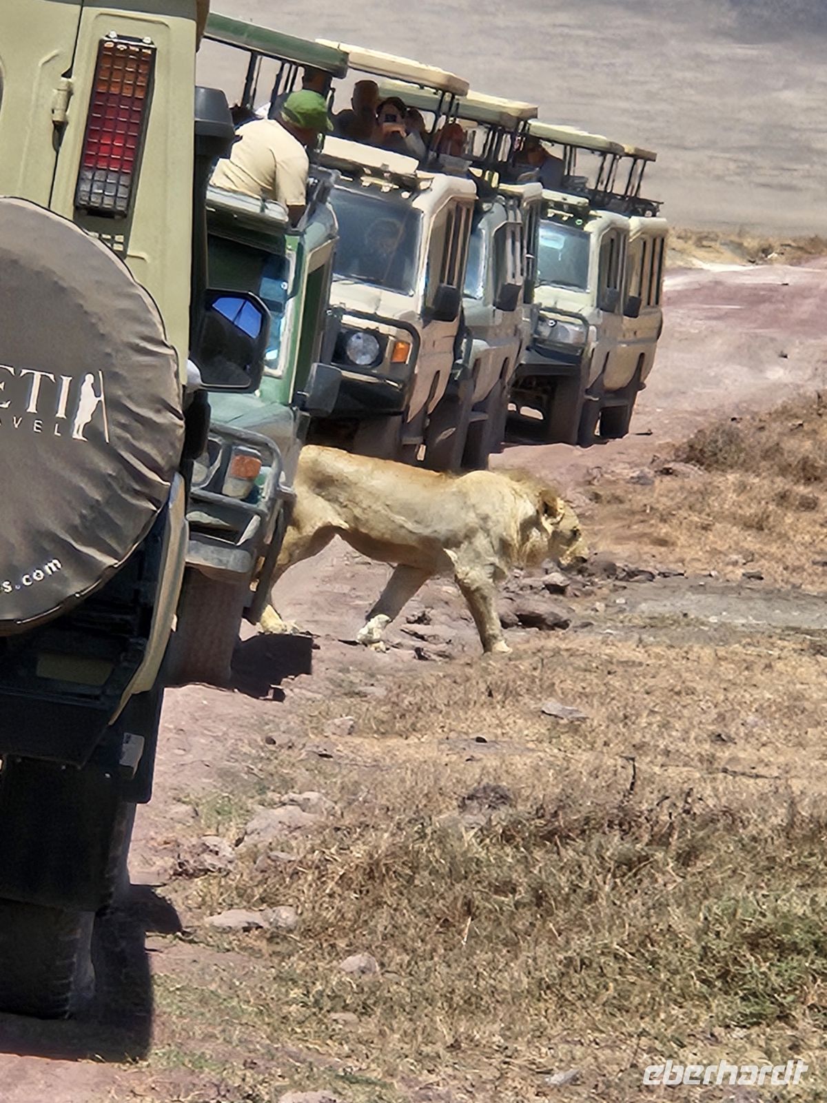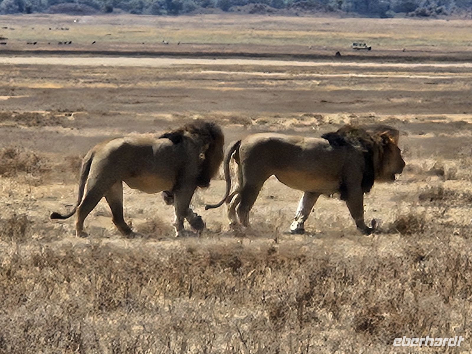 Beim Frühstück in der Lodge konnten wir uns auch gleich unsere Lunchboxen für den Tag zusammenstellen lassen. Dies ist eine gute Variante, um nur auszuwählen, was man auch wirklich essen möchte. Unser heutiges Ziel für heute war der Ngorongoro-Krater. Nirgendwo sonst in Afrika leben so viele Tiere auf so engem wie im Krater des erloschenen Ngrorongoro-Vulkans – dem größten Riesenkrater am östlichen Rand der Serengeti. Fährt man in das Gebiet ein, befindet man sich zunächst in ca. 1100 Metern Höhe und fährt durch immergrüne Wälder. Hier fühlen sich die Paviane besonders wohl und springen in kleinen Grüppchen über die Straße oder durch die Bäume. In der Nähe des Kraterrands findet sich das Grab von Michael und Bernhard Grzimek. Im Jahr 1959 waren Vater und Sohn im Serengeti-Park unterwegs, zu dem damals auch das Gelände des Ngrongoro-Kraters gehörte. Bernhard Grzimek war Zoodirektor des Frankfurter Zoos und hatte den Auftrag die Tiere in der Serengeti zu zählen. Die beiden waren mit einem Hubschreiber, der mit Zebrastreifen bemalt war, unterwegs und konnten auf diese Art und Weise im Tiefflug die Tiere zählen. Ihre Erlebnissen filmten sie und aus den Filmaufnahmen entstand der oscarprämierte Dokumentarfilm „Serengeti darf nicht sterben“. Als die Dreharbeiten bereits abgeschlossen haben, kam Michael Grzimek mit nur 25 Jahren mit dem Hubschrauber ums Leben. Bernhard Grzimek starb im Jahr 1987 an einem Schlaganfall. Seine Asche wurde zu seinem Sohn am Ngrongoro-Krater überführt. Am Kraterrand bot sich bereits ein toller Ausblick auf den Krater. Nach einigen Fotos traten wir die Fahrt bergab in den Krater hinein ein. In dem Riesenkrater könnte ganz Berlin untergebracht sein. Das ganze Ngorongoro-Gebiet umfasst eine Gesamtfläche von 8300 m² . Ngorongoro ist ein einzigartiger Zusammenschluss verschiedener Ökosysteme. So erblickten wir in den wüstenartigen Savannen Löwen mit mächtigen Mähnen, die einfach an einer Gruppe von Zebras vorbeispazierten oder sich zwischen den Jeeps versteckten. Die uns schon bekannten Zebra- und Gnuherden begegneten uns bei der Fahrt durch den Krater ebenfalls immer wieder.