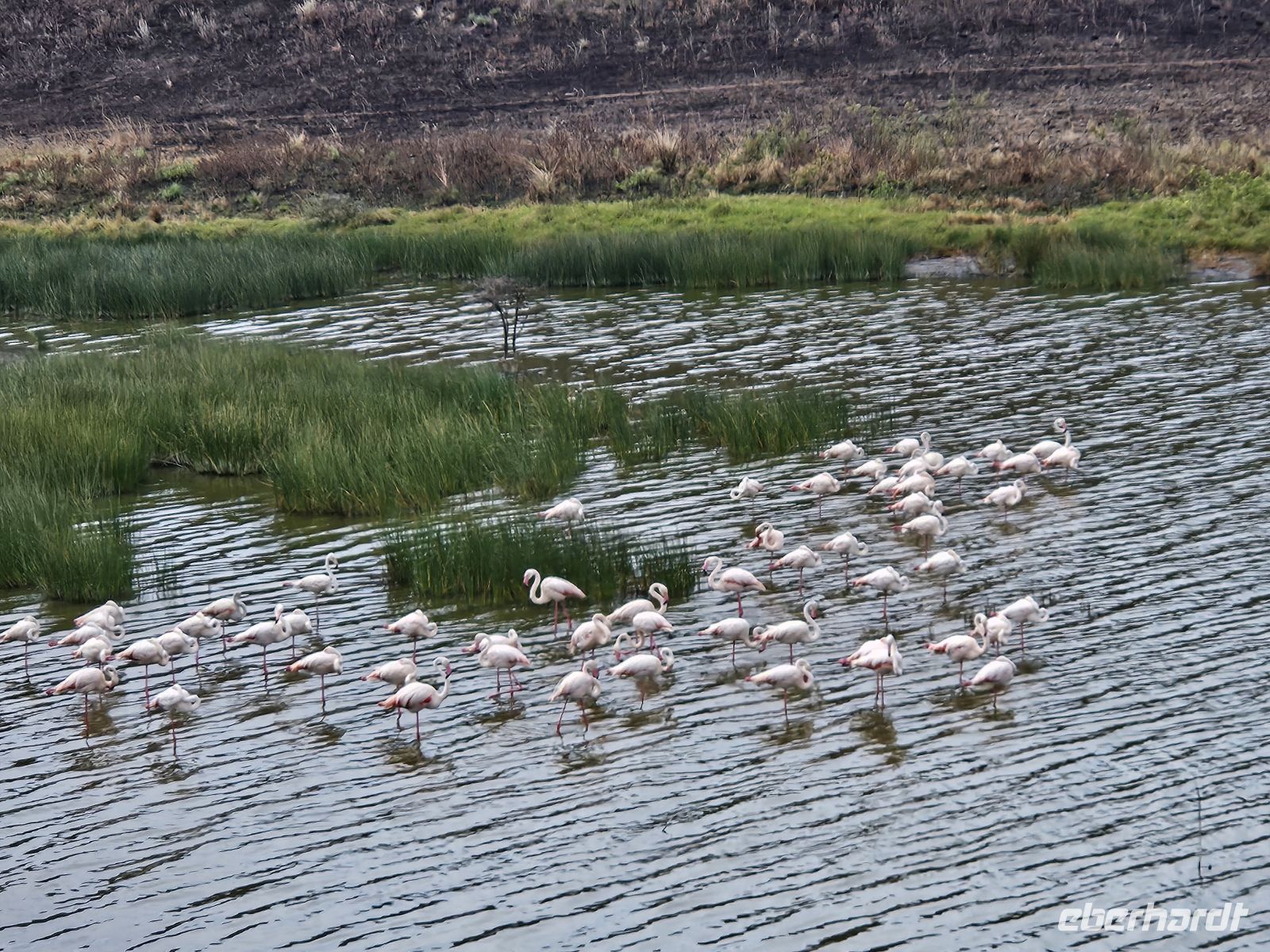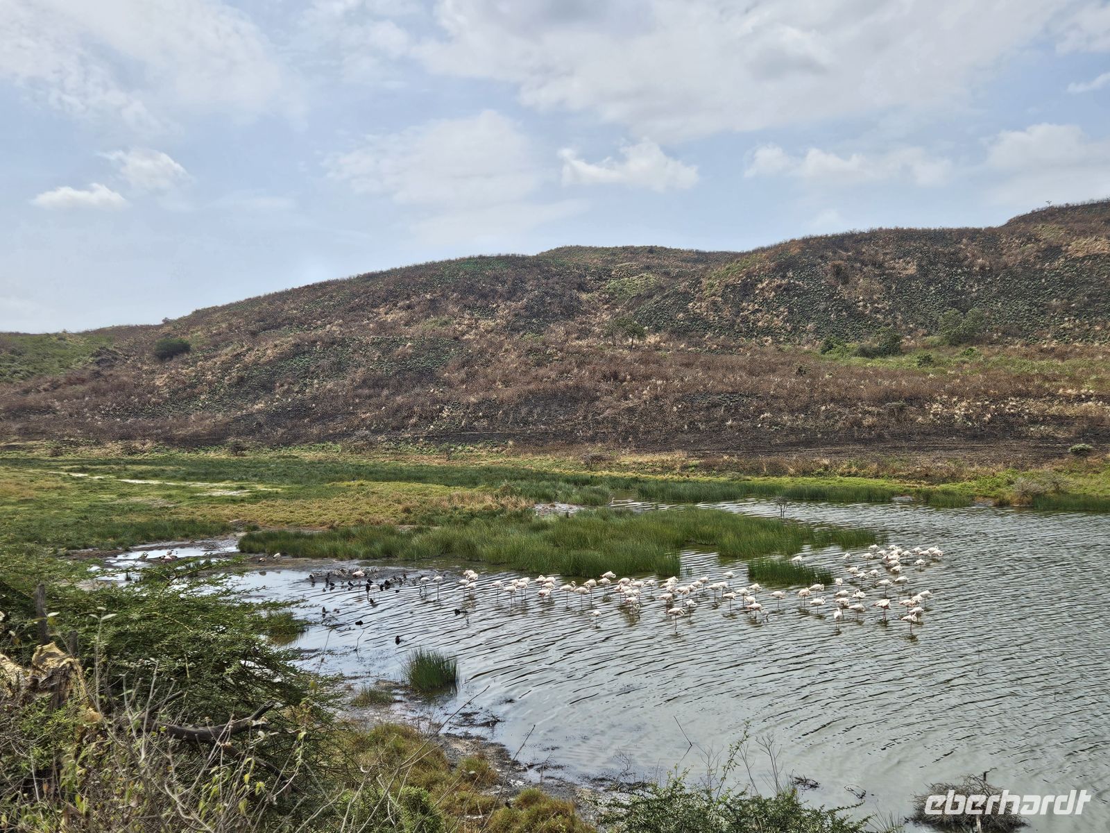 Der große Momella-See ist ein Süßwassersee und somit ein Paradies für Flamingos. Ihre rosane Farbe erhalten sie durch Farbpartikeln, die in den Algen und kleinen Krebsen ihrer täglichen Nahrung enthalten sind. Diese Farbstoffe lagern sich in den Federn und der Haut der Flamingos ab, wodurch ihr normalerweise weißes oder graues Gefieder die charakteristische rosa bis pinke Färbung annimmt.
