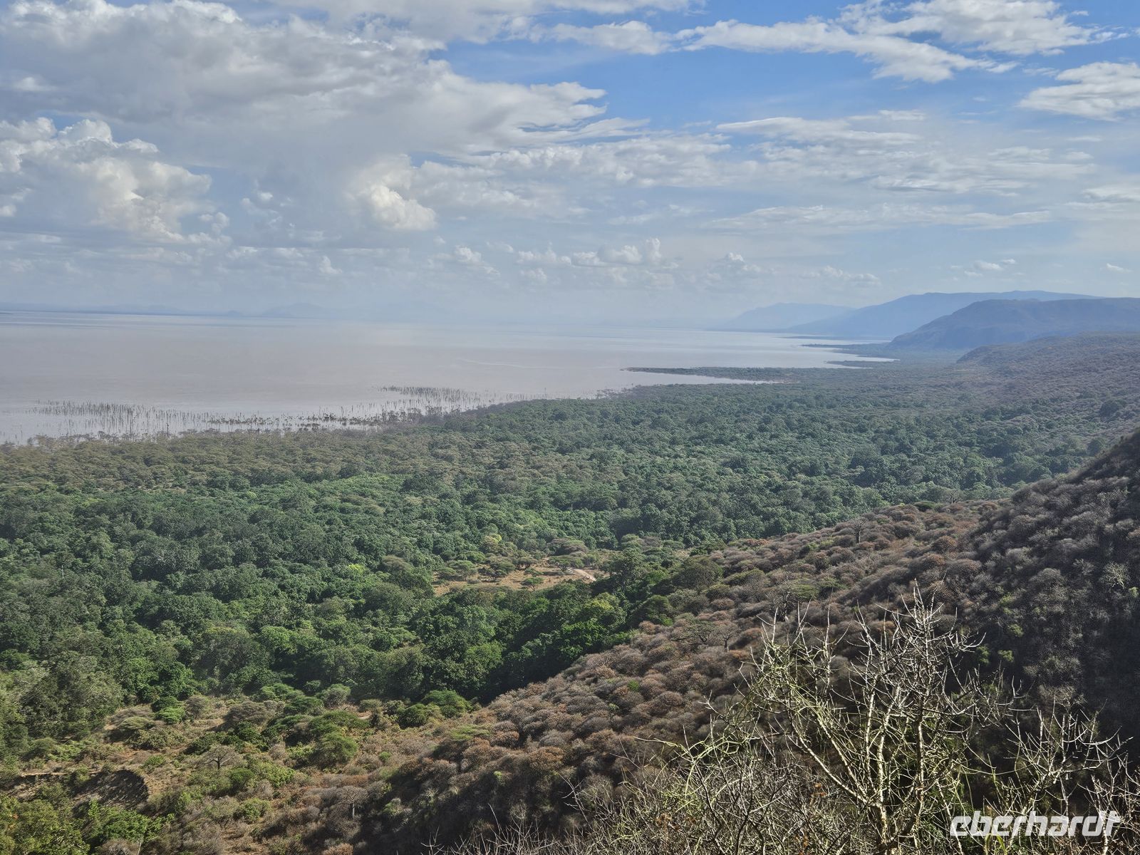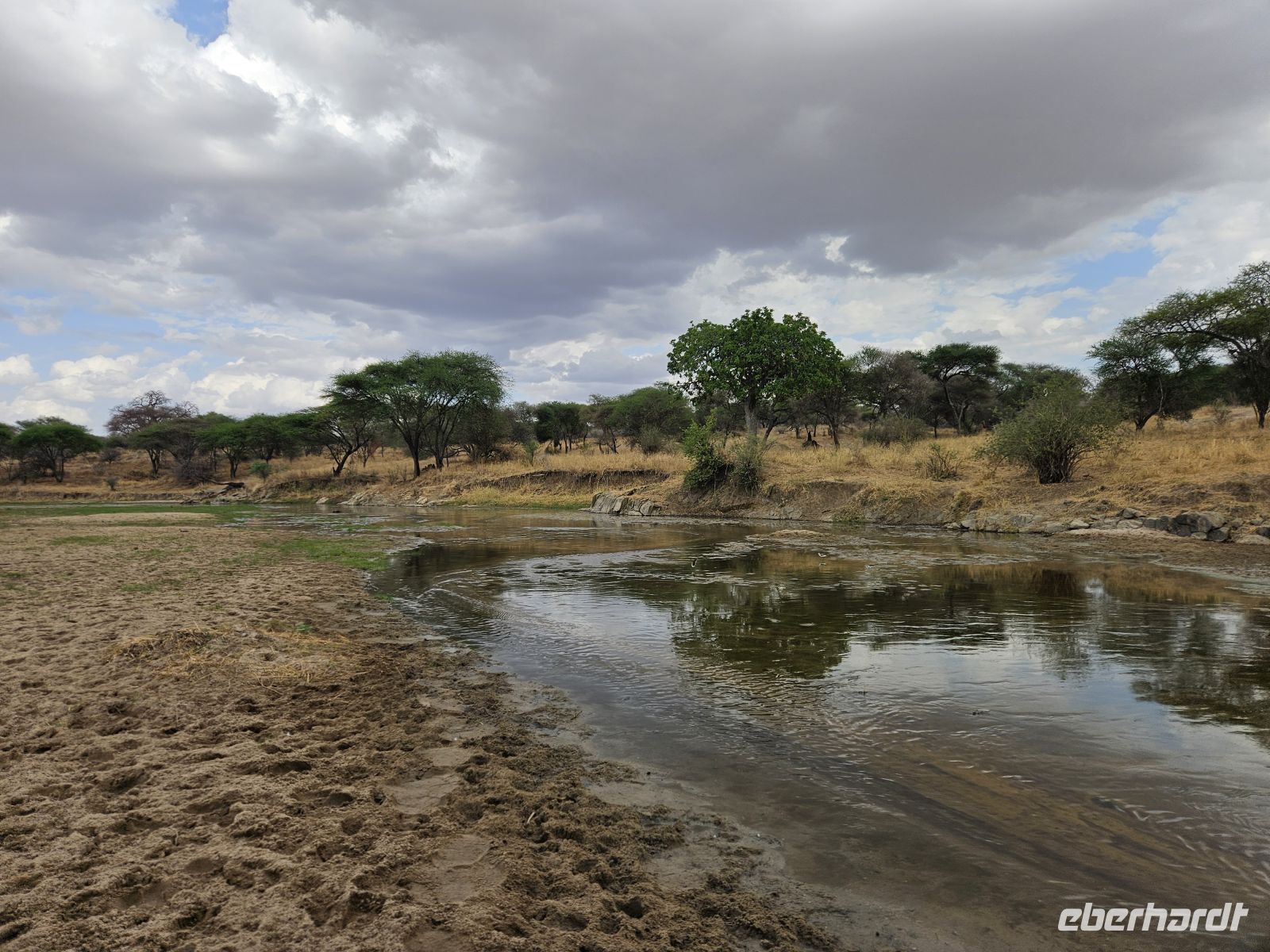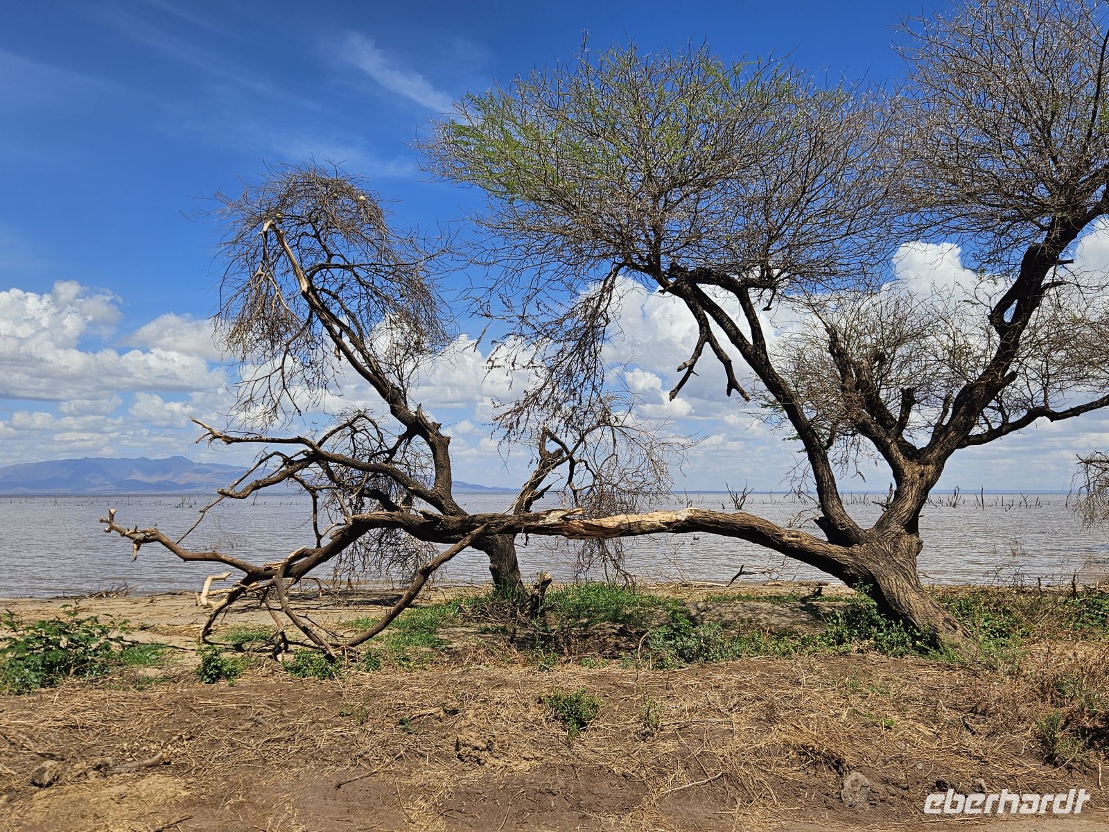 In dem Bereich des Sees konnten wir auch die Schuppen eines Barans entdecken – dieser zog sich jedoch schnell zurück. Der Lake Manyara ist ein natronhaltiger Süßwasser-See und war einst ein Paradies für Flamingos. Das Natron hat den See über die Jahre in einen Salzwasser See verwandelt und greift die Pflanzen und Bäume an. Deswegen ragen aus dem See auch die abgestorbenen Bäume und die Szenerie hat etwas karges und futuristisches. Den angrenzenden Bäumen und Pflanzen wird die Flüssigkeit komplett entzogen und alles, was sich im Inneren des Sees befindet, wird durch das