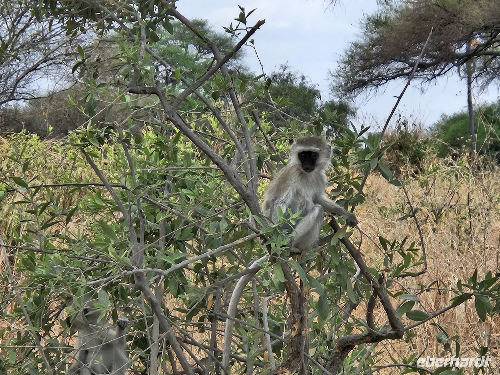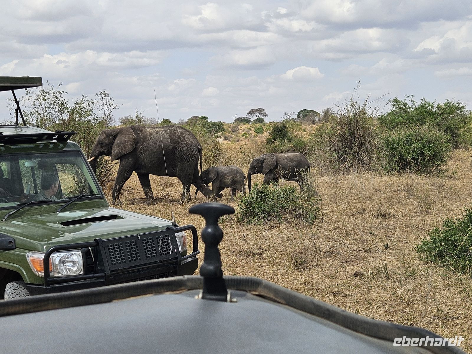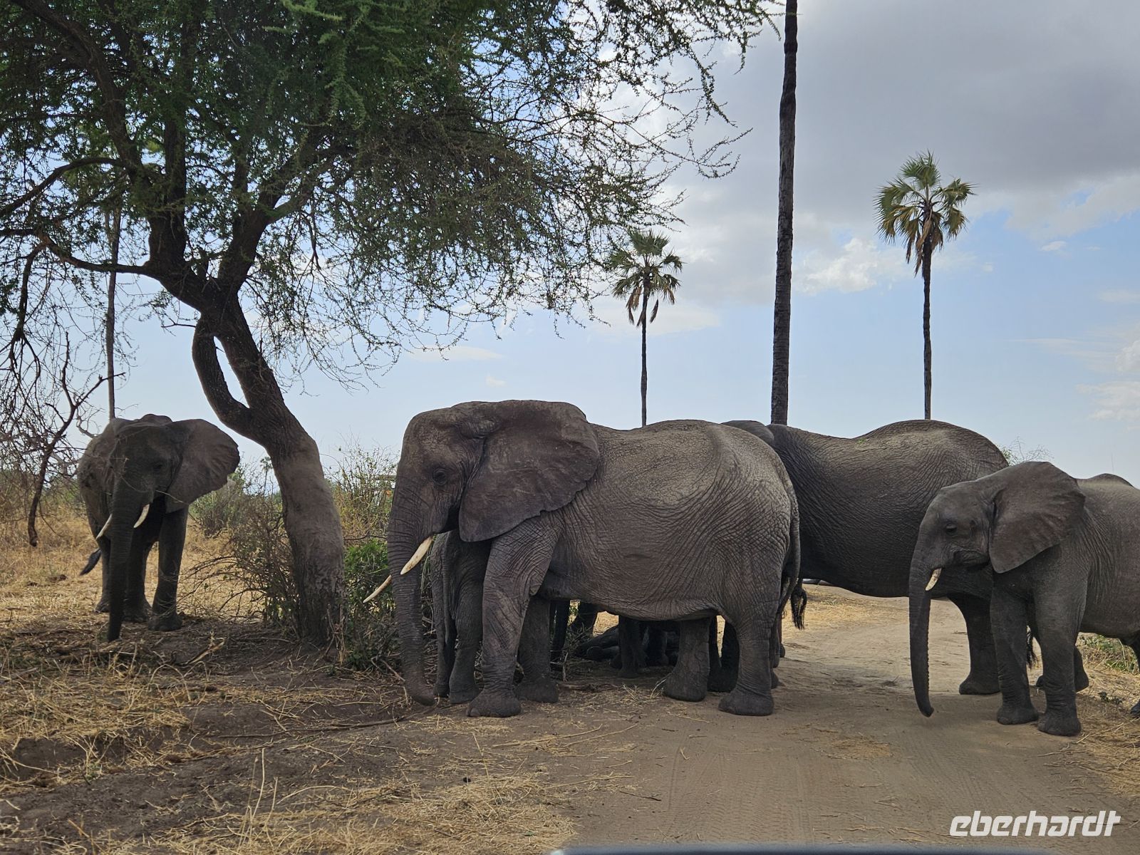 Vor dem East-Gate sammelten sich bereits eine Vielzahl von Jeeps. Die Formalitäten konnten aber schnell geklärt werden und so legten wir gleich nach Einfahrt in den Nationalpark unsere Mittagspause ein. Die Lunchboxen hierfür hatten wir wieder in Arusha erhalten. Zu unserer Mittagspause gesellten sich unter anderem ein Äffchen und ein Sterling-Vogel. Nachdem wir gestern die Zebras nur aus der Entfernung erblickt haben, kamen sie uns diesmal in kleinen Grüppchen ganz nah. Das nächste Highlicht war eine Gruppe von Elefanten. Während unseres heutigen Safaritages trafen wir immer wieder auf mehrere Elefantengruppen. Unter ihnen waren auch immer einige Jungtiere.