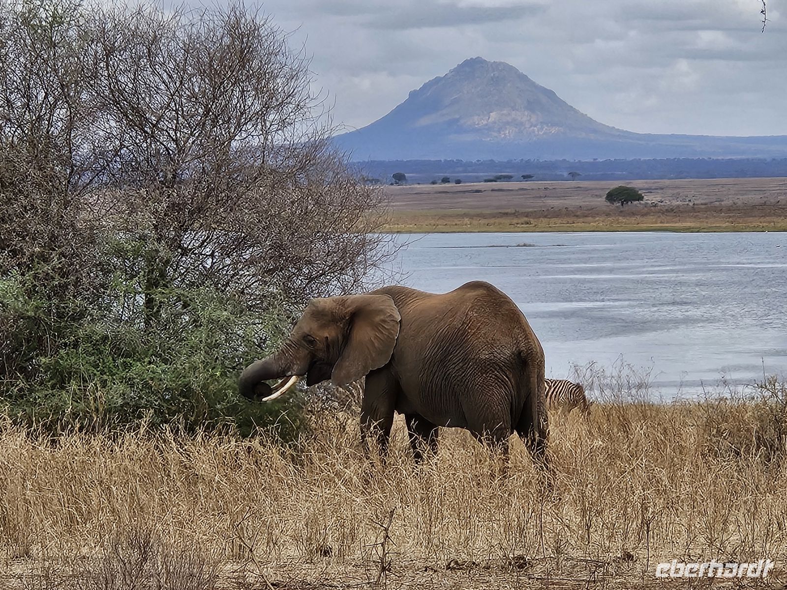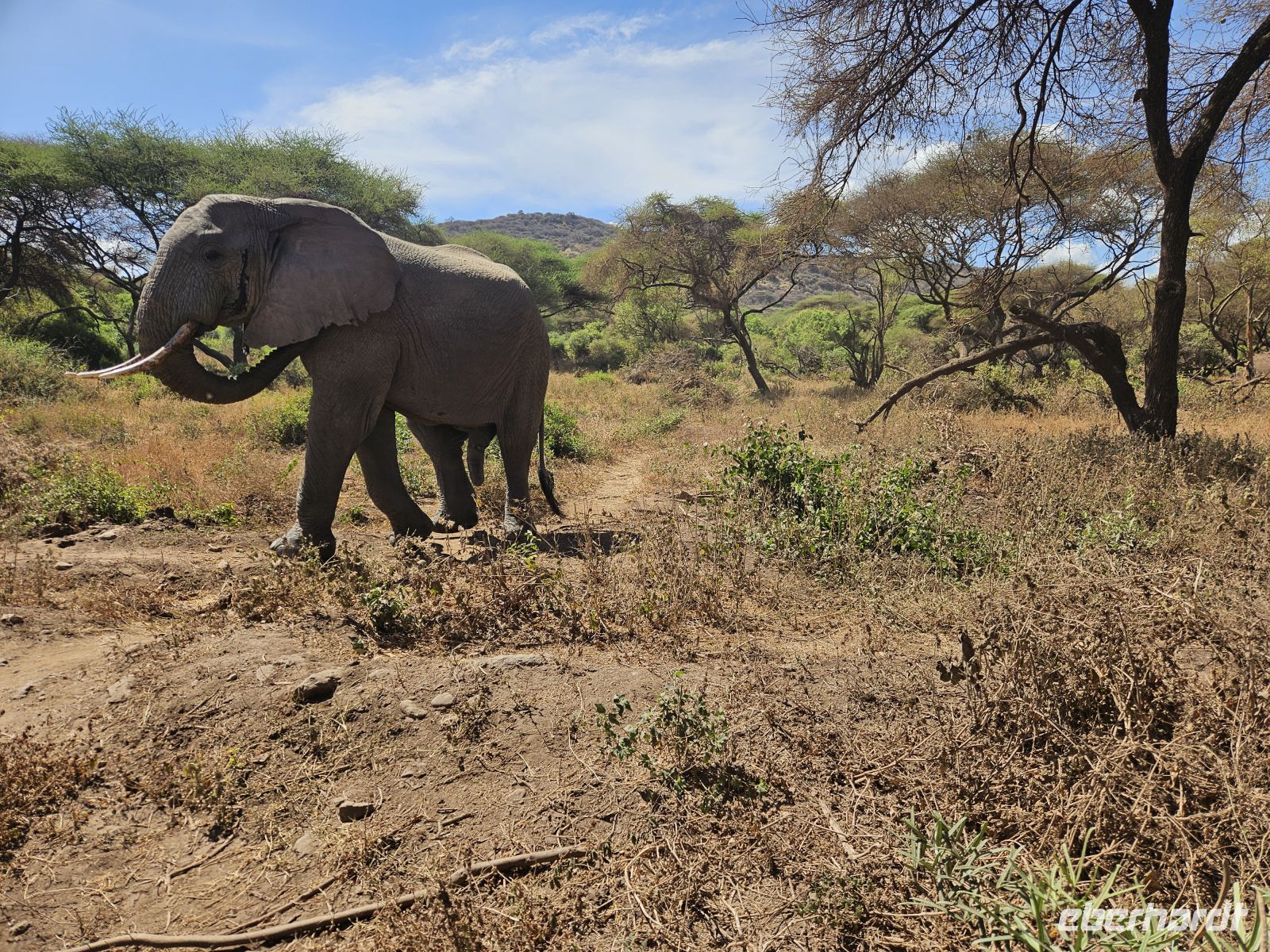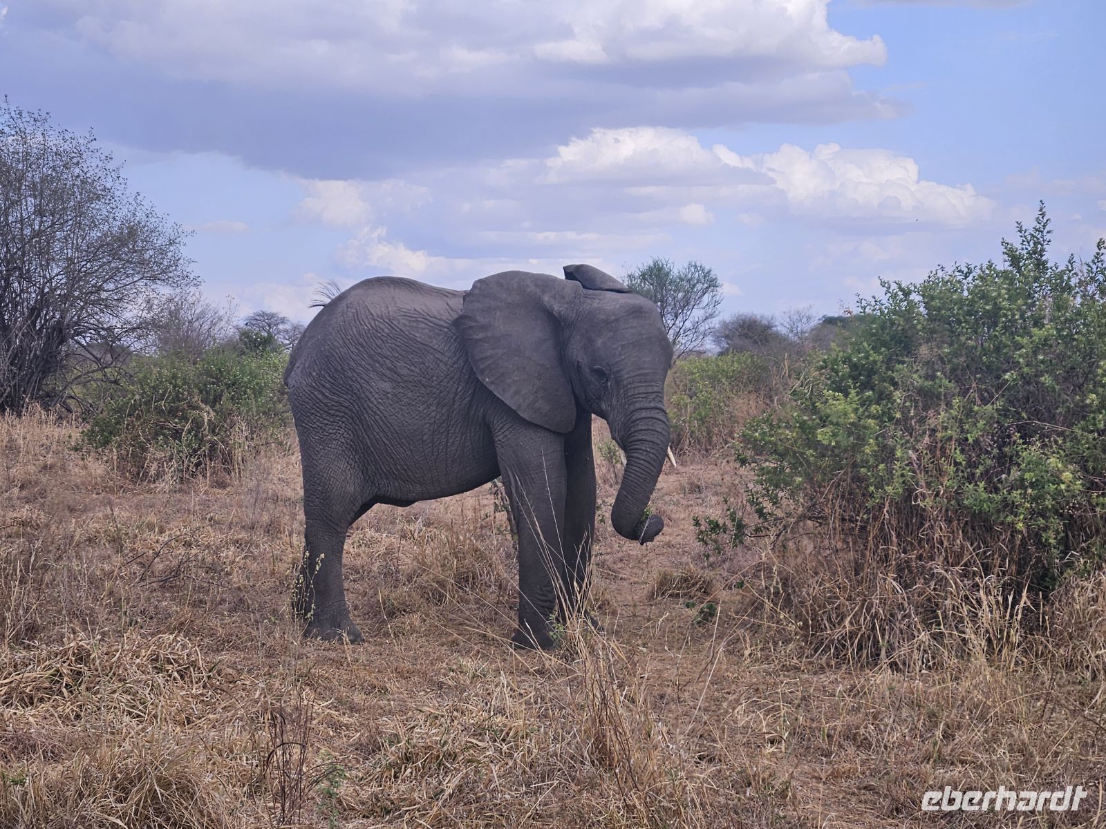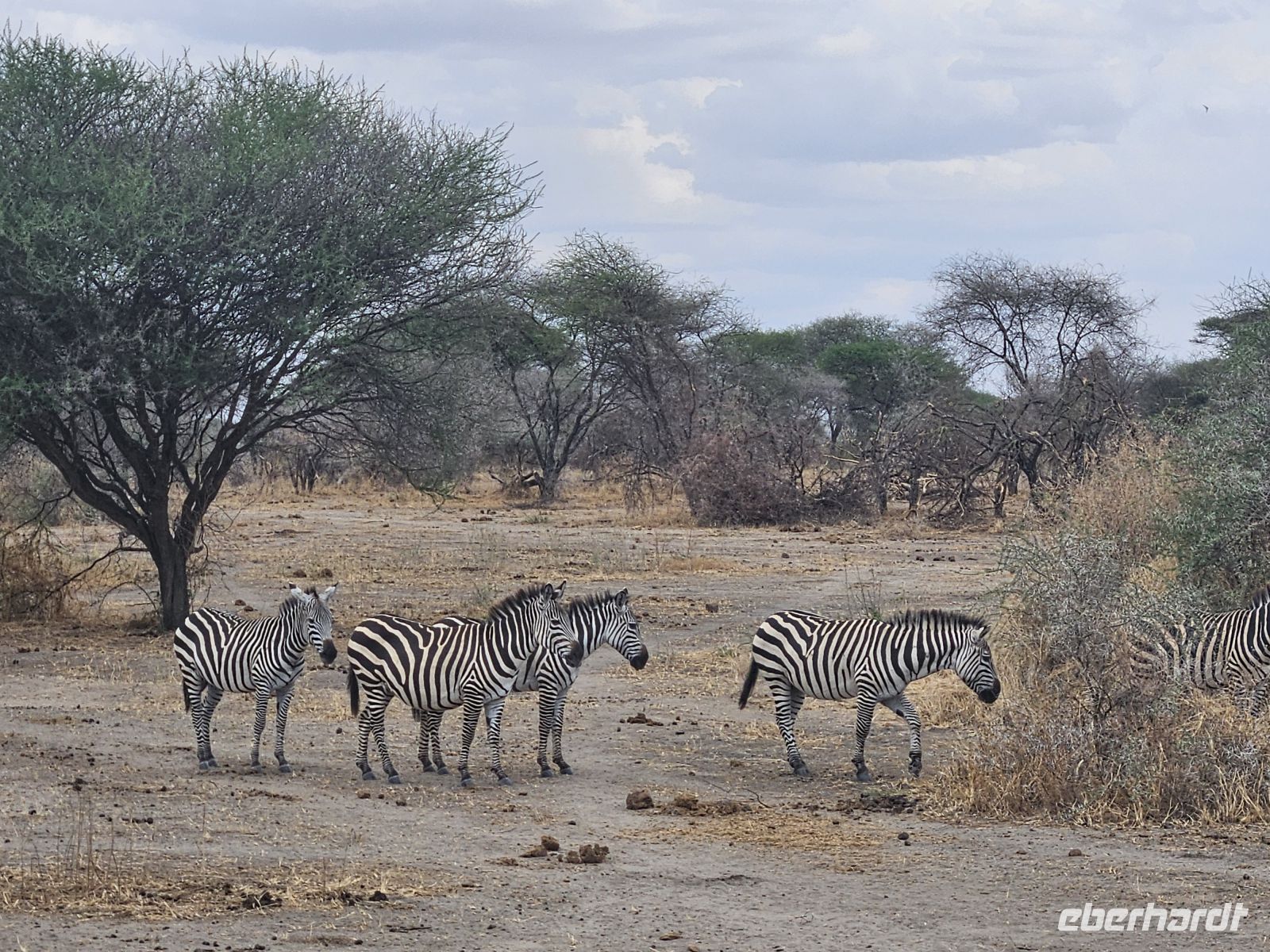 Vor dem East-Gate sammelten sich bereits eine Vielzahl von Jeeps. Die Formalitäten konnten aber schnell geklärt werden und so legten wir gleich nach Einfahrt in den Nationalpark unsere Mittagspause ein. Die Lunchboxen hierfür hatten wir wieder in Arusha erhalten. Zu unserer Mittagspause gesellten sich unter anderem ein Äffchen und ein Sterling-Vogel. Nachdem wir gestern die Zebras nur aus der Entfernung erblickt haben, kamen sie uns diesmal in kleinen Grüppchen ganz nah. Das nächste Highlicht war eine Gruppe von Elefanten. Während unseres heutigen Safaritages trafen wir immer wieder auf mehrere Elefantengruppen. Unter ihnen waren auch immer einige Jungtiere.