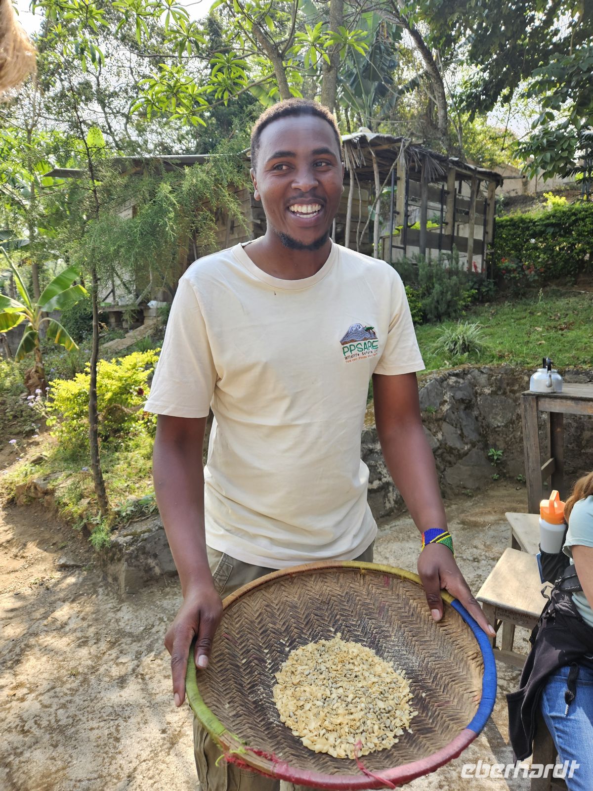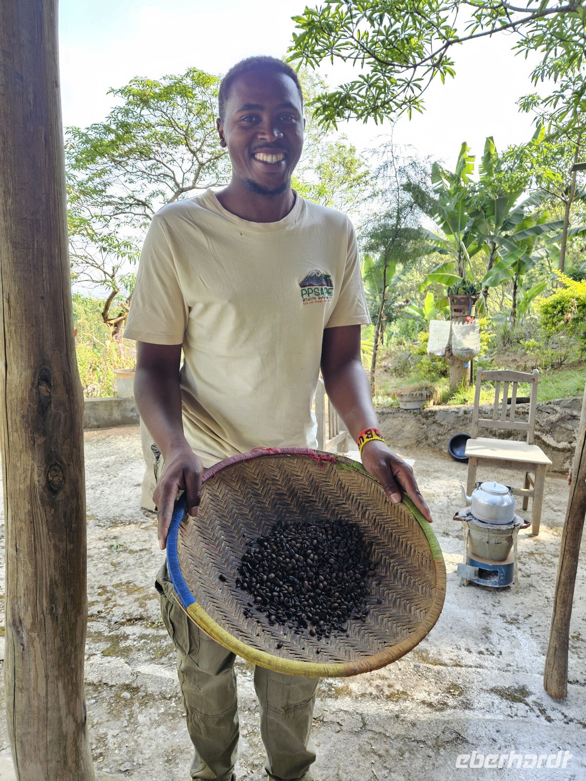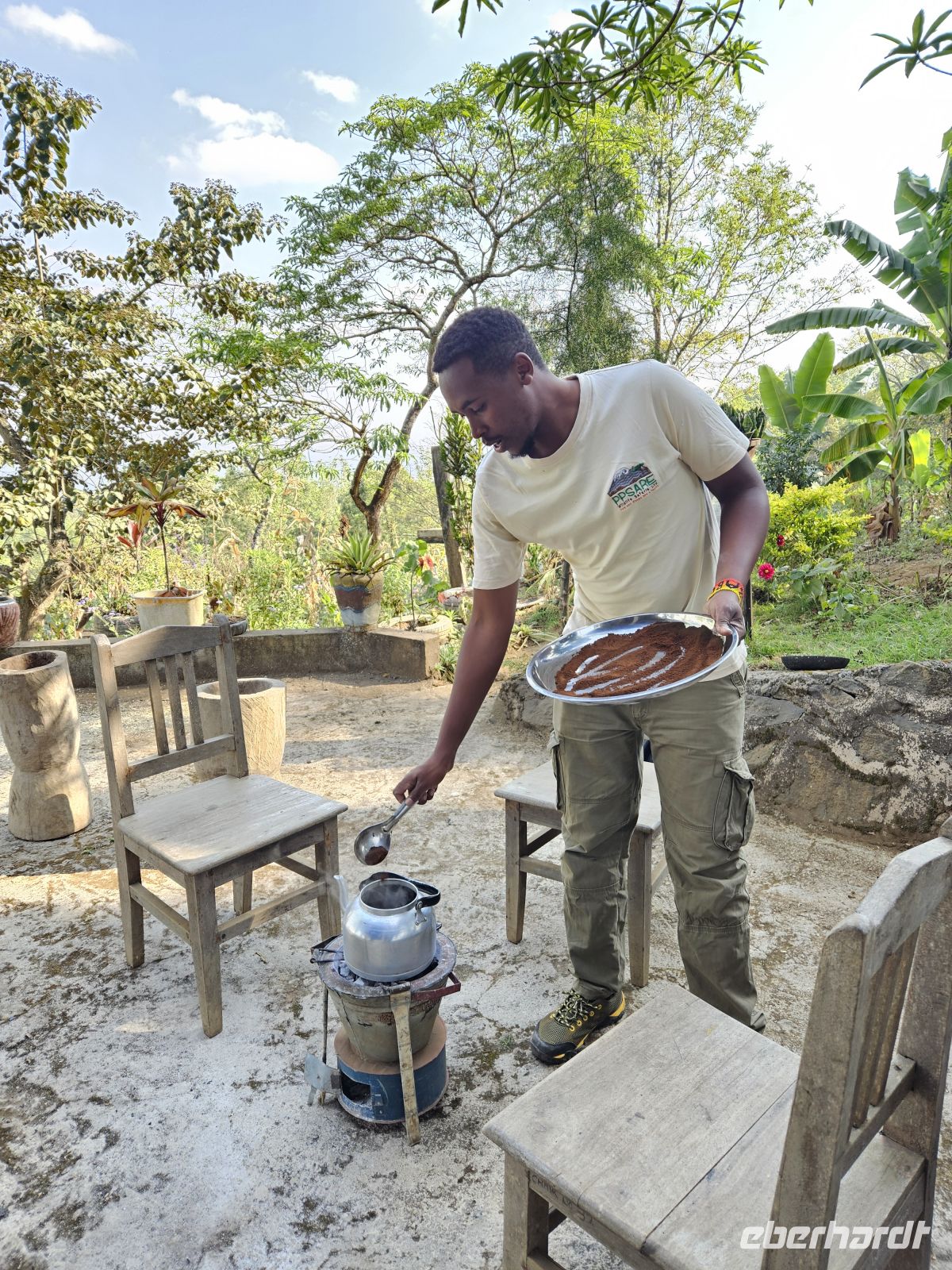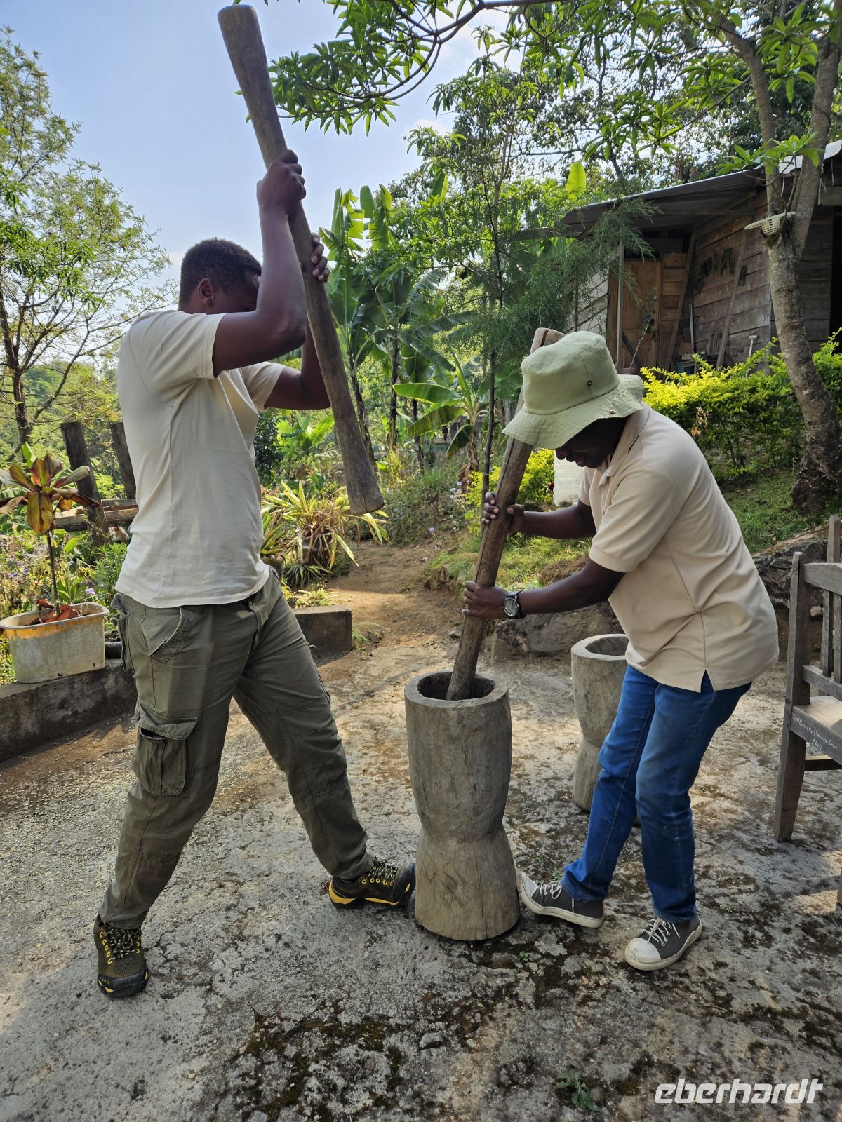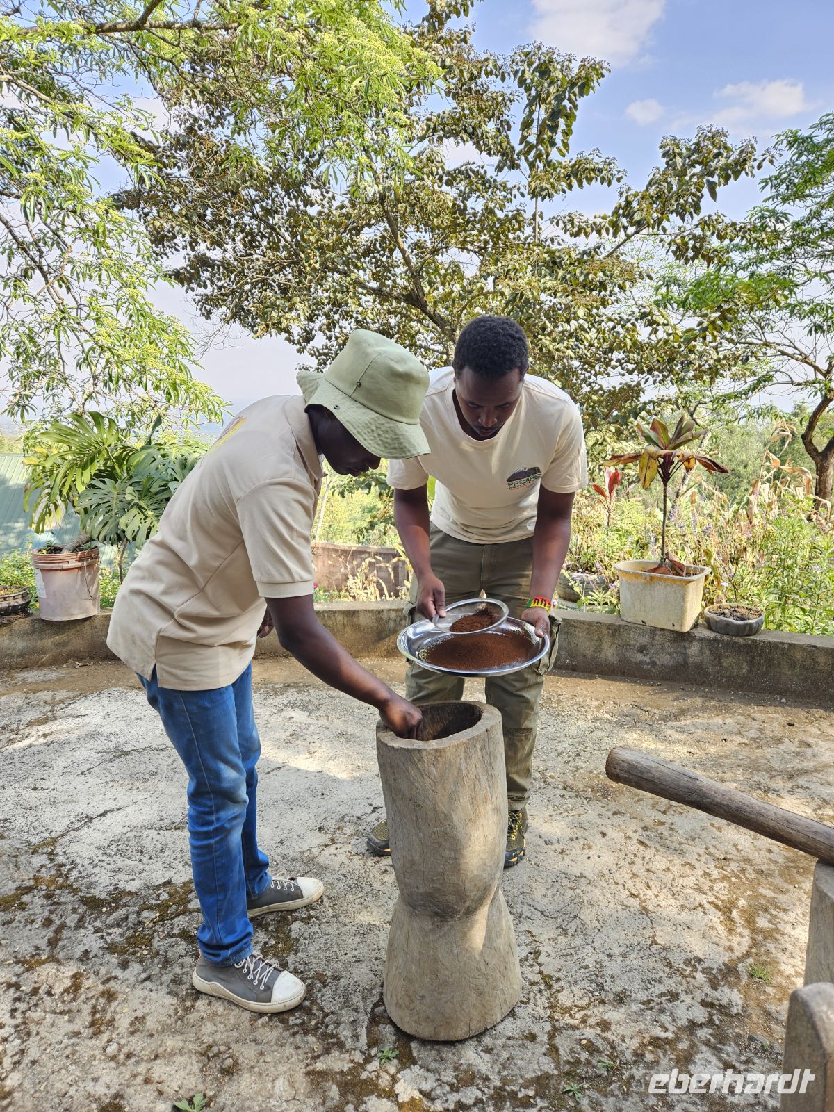 Am frühen Morgen gab es mit der discover Airlines in Mumbasa (Kenia) am frühen Morgen noch einen Zwischenstopp, bei dem die Crew wechselte und das Flugzeug frisch betankt wurde. Aufgrund eines technischen Problems, gab es auch hier wieder eine Verzögerung. Letztendlich kamen wir jedoch wohlbehalten gegen 08.20 Uhr in Kilimandscharo an. Nach der Passkontrolle und dem Vorzeigen unserer Visaformulare, wurden wir bereits von unserem Transferfahrer Emanuelle erwartet, der uns in ca. anderthalb Stunden zur Karama Lodge brachte. In der Lodge angekommen, stießen wir endlich auch auf den Rest der Reisegruppe. Nach dem Bezug unserer Lodges und einer kleinen Stärkung stand auch endlich unser erster Programmpunkt an: der Besuch unserer Kaffeefarm. Unsere Guides heute waren Babuu und Andrew. An der Kaffeeplantage angekommen erzählte uns Babuu viel über die heimischen Pflanzen. So wirken die gekochten Blätter des Quinine-Baumes sehr gut gegen Malaria. Die Kaffeeernte erfolgt zwischen Anfang August bis zum Februar. Anfangs sind die Kaffeebohnen sehr wachsig und müssen erst drei Tage in Wasser eingelegt, fermentiert und getrocknet werden, damit sie ihre wachsige Schicht verlieren. Mit den getrockneten hellen Kaffeebohnen sind wir mit Babuu und Andrew einmal den kompletten Vorgang der Kaffeegewinnung durchlaufen. Die getrockneten Kaffeebohnen werden zunächst mit einem Mörser zerstoßen, damit sie sich von der Schale lösen. Wenn nur noch die Kerne übrigbleiben, werden diese unter ständigem Rühren geröstet, bei dem der Kaffee seine bekannte dunkelbraune Farbe erhält und sein Aroma entfaltet. Die Kaffeebohnen werden dann mit dem Mörser fein gemahlen. Dabei sangen Babuu und Andrew den in Tansania allseits bekannten „Jambo Song“. Jetzt endlich lag uns das Kaffeepulver vor und wir konnten eine Tasse frisch gekochten Kaffee genießen. Beim Kaffeetrinken erzählte uns Andrew von dem Projekt „The Small Things“. Die Organisation gibt Waisenkindern ein zu hause. Der Gebäudekomplex befindet sich direkt neben der Kaffeeplantage. Andrew ist hier selbst aufgewachsen und ihm liegt es am Herzen, dass die Kinder glücklich sind und einen Ort haben, an dem sie sich wohlfühlen.