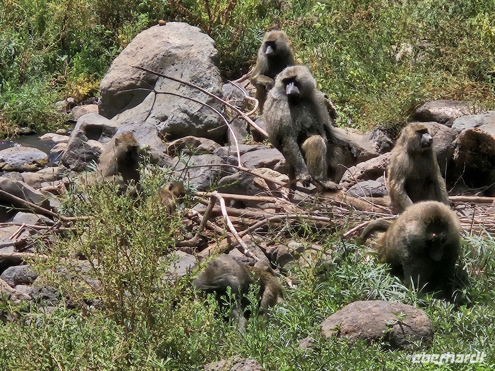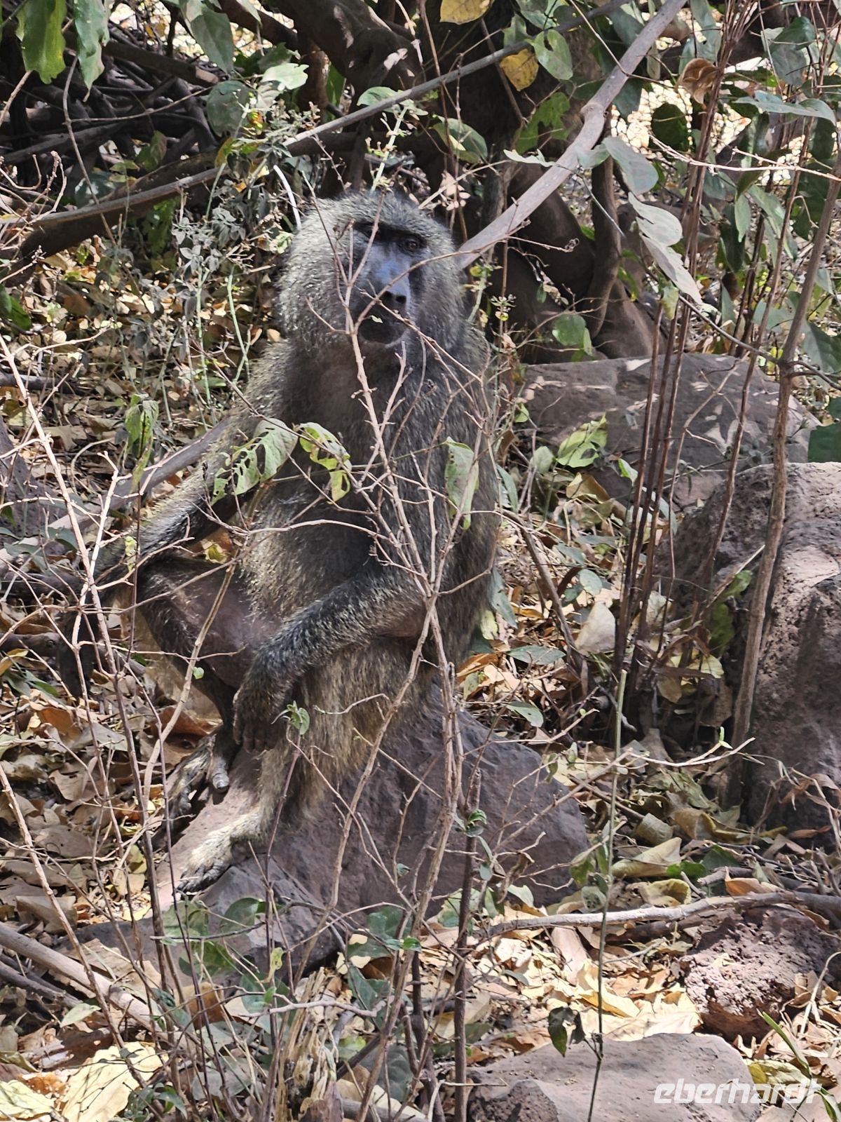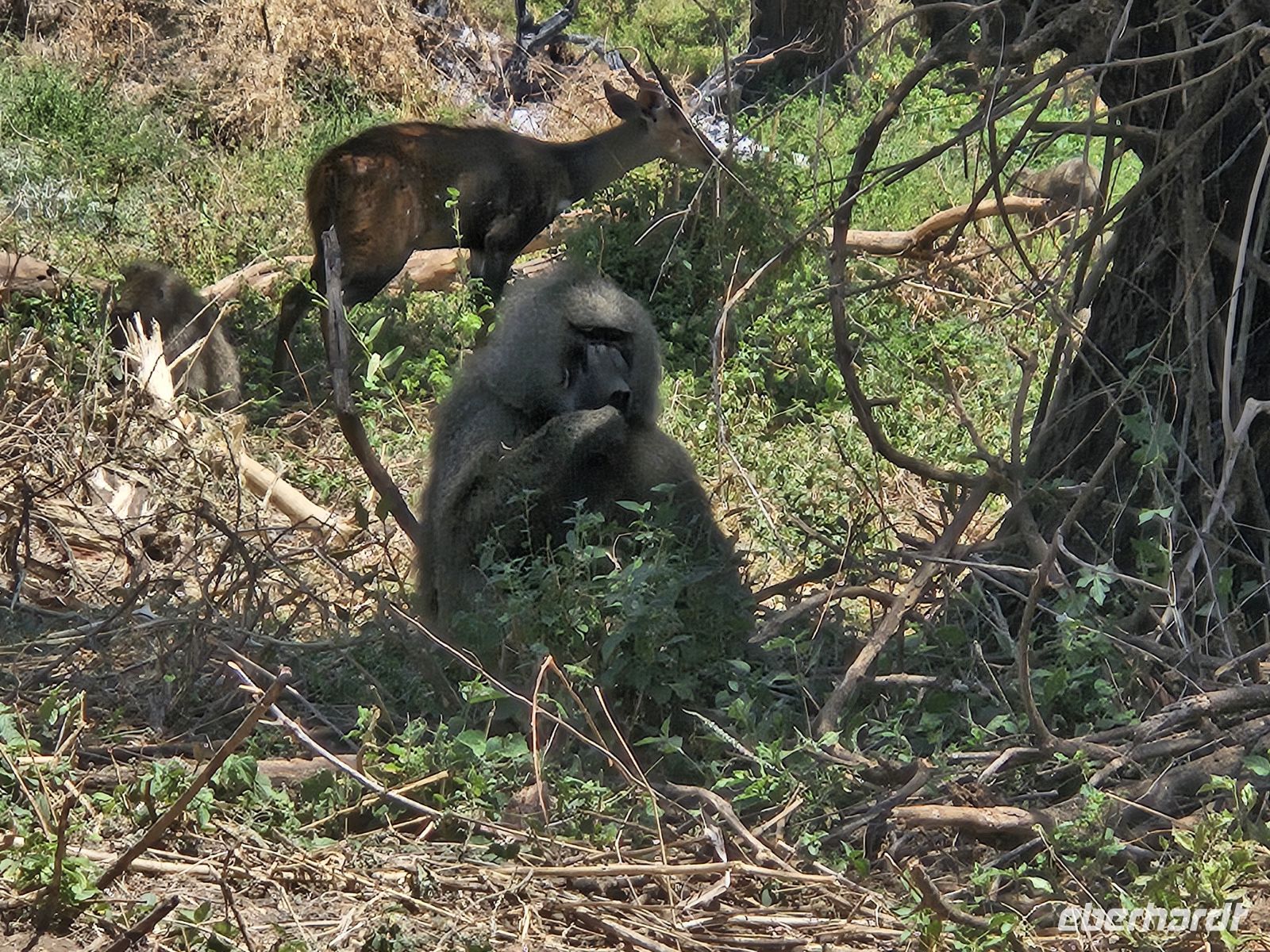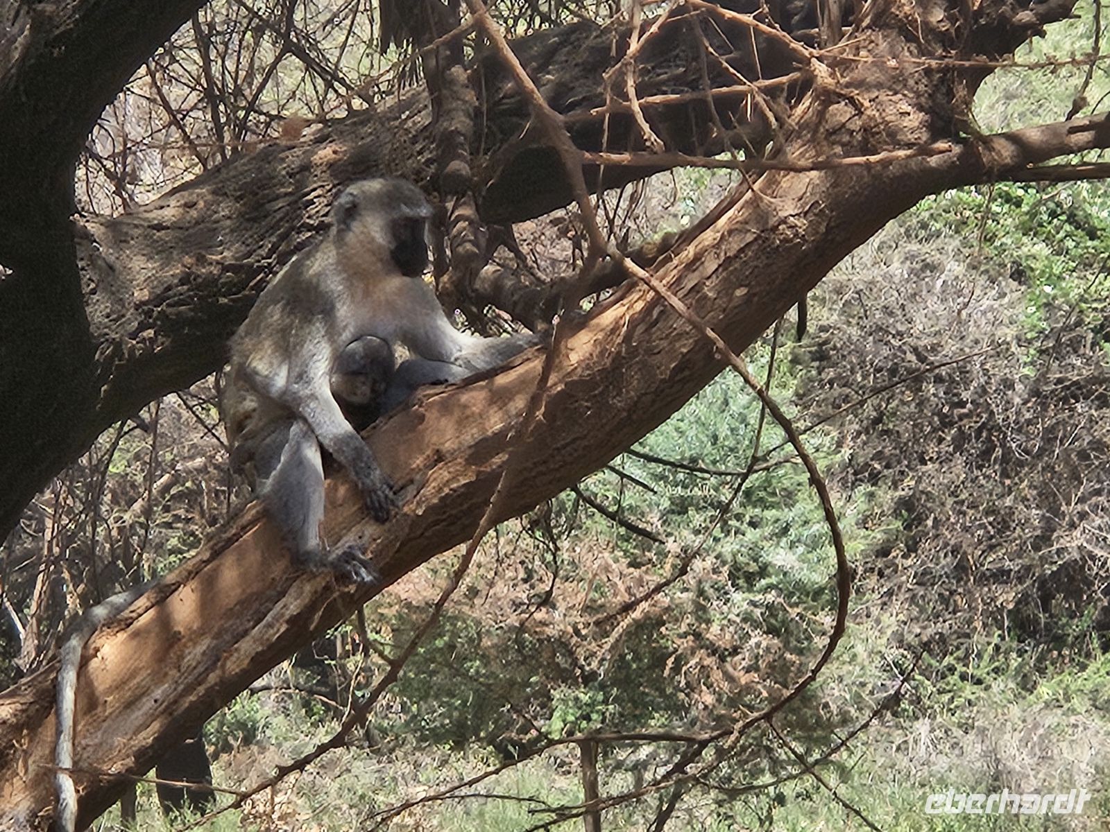 Durch die Bäume huschten auch immer wieder einige Paviane. Einmal entdeckten wir sogar eine größere Familie. Hier musste sich das Junge bei seiner Mutter der Behandlung des Entlausens unterziehen.