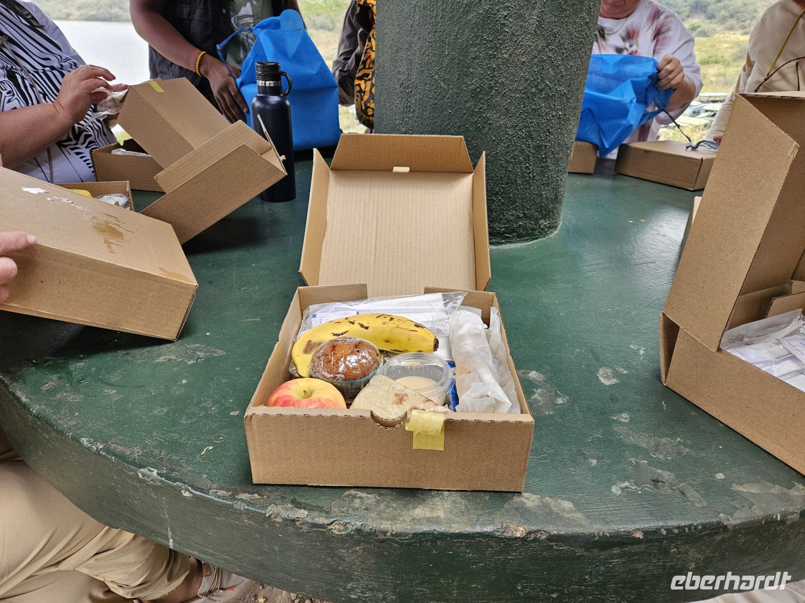 Die Mittagspause verbrachten wir mit Blick auf den wunderschönen großen Momella-See. Für unterwegs wurden uns am Morgen Lunchboxen mit Obst, Salat, Brot, Hähnchenspießen, einem Muffin und vielem mehr mitgegeben.