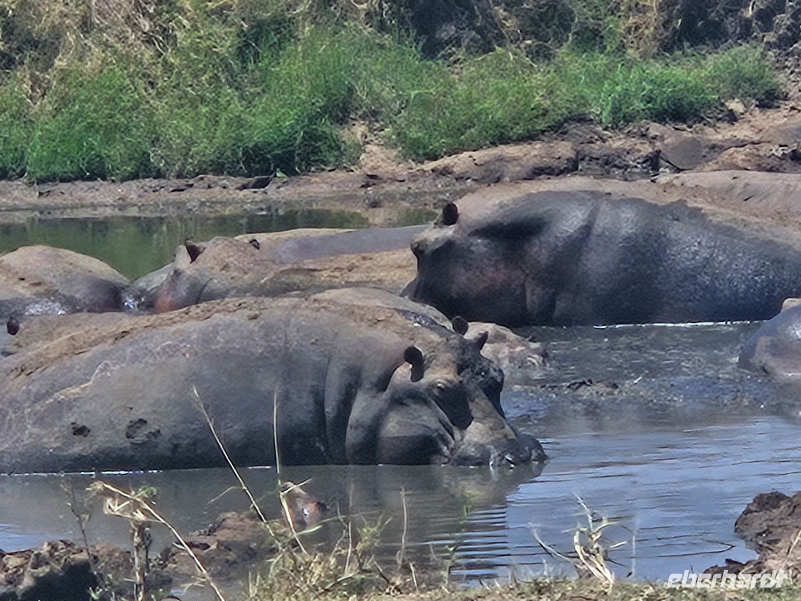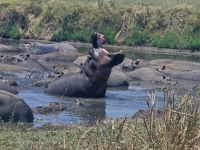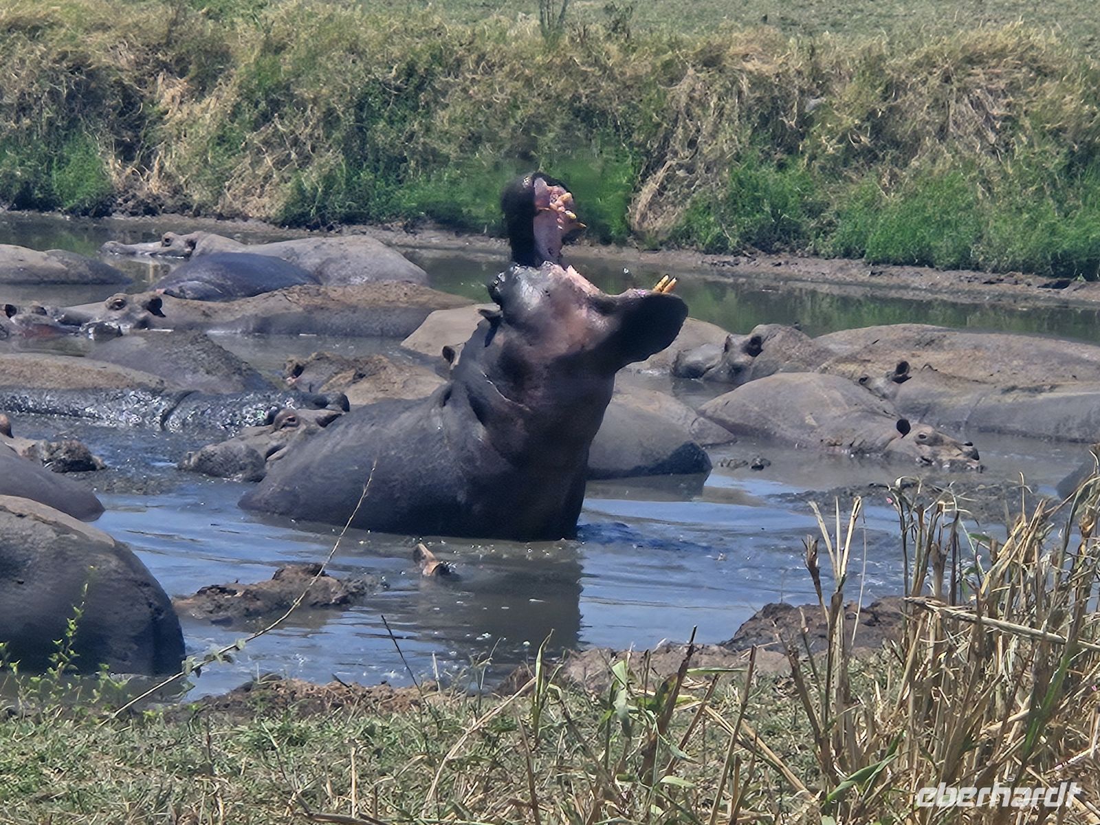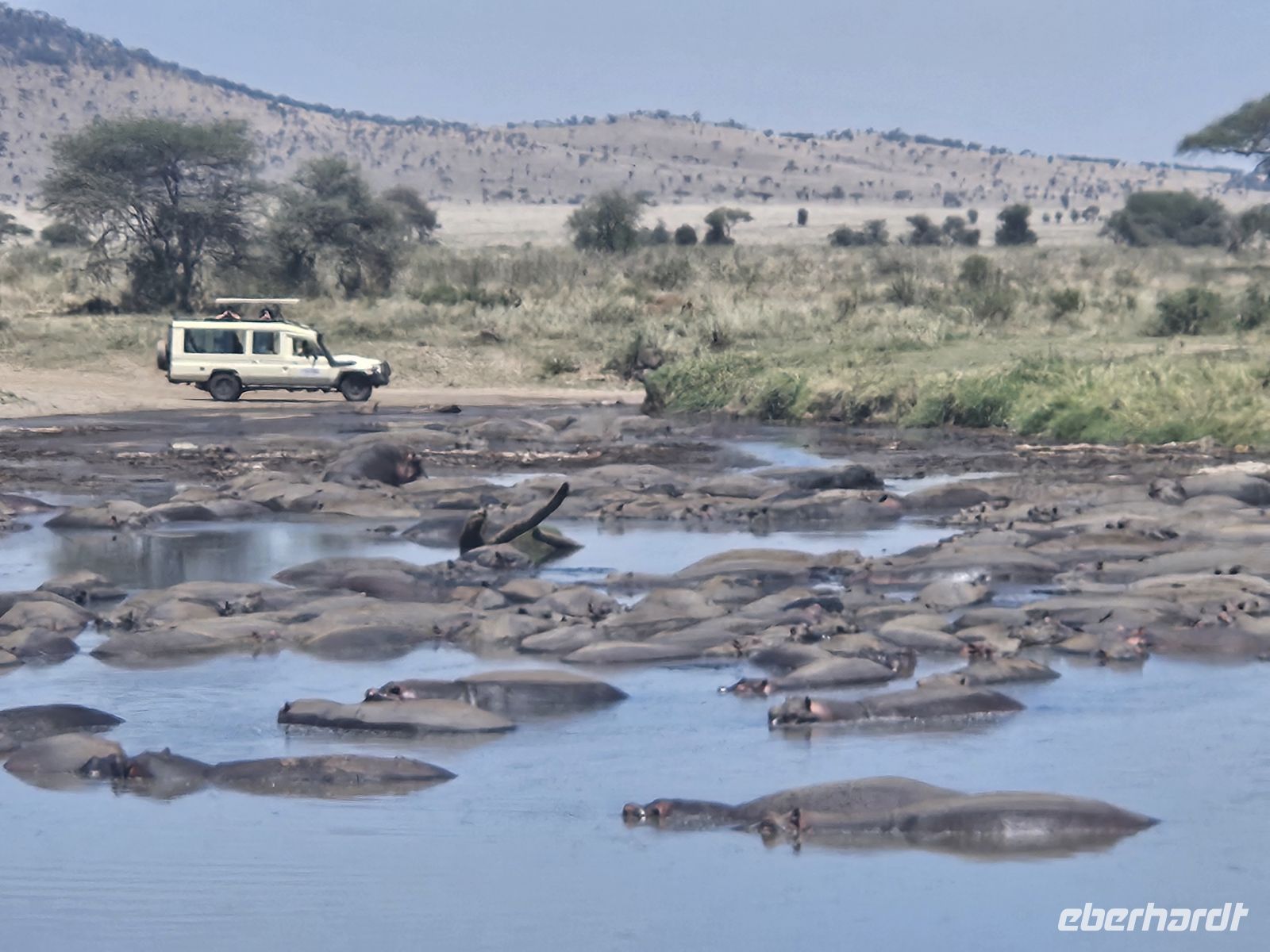 Für zwei aus unserer Gruppe hieß es bereits am frühen Morgen aufzustehen: Optional hatte man die Möglichkeit eine Ballonfahrt über die Serengeti zu buchen. Ein Transfer holte unsere beiden Kunden bereits kurz vor 05.00 Uhr von unserer Lodge ab. Die verbliebene Gruppe frühstückte ganz entspannt in der Lodge und holte gegen 10.00 Uhr die Ballonfahrer von dem Ballonbüro ab. Wieder komplett unternahmen wie eine Vormittagspirschfahrt. Heute sahen wir einige Hippopools mit riesigen Nilpferden, die auch sehr aktiv waren und immer wieder ihren Kopf aus dem Wasser steckten oder ihr riesiges Maul aufrissen. Aus der Entfernung und wenn die Nilpferde unter Wasser getaucht sind, sehen sie aus wie Steine. Nilpferde wirken auf den ersten Blick sehr behebig und faul. Sie können aber sehr aggressiv werden und haben die meisten Menschenopfer zu verbuchen, weil ihre Geschwindigkeit und Kraft oftmals sehr falsch eingeschätzt wird.
