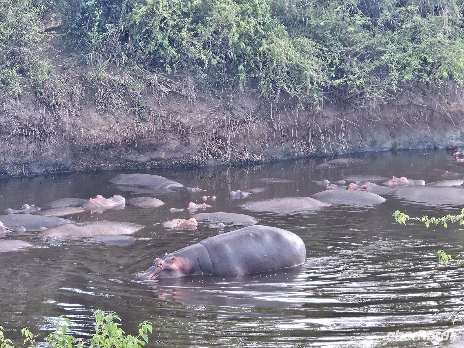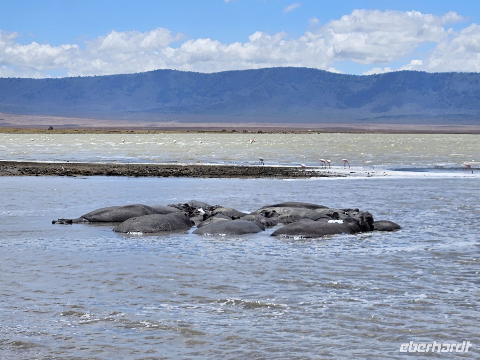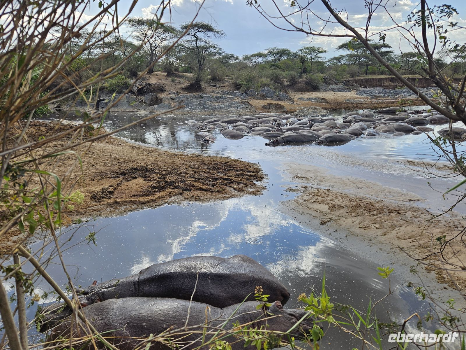 Für zwei aus unserer Gruppe hieß es bereits am frühen Morgen aufzustehen: Optional hatte man die Möglichkeit eine Ballonfahrt über die Serengeti zu buchen. Ein Transfer holte unsere beiden Kunden bereits kurz vor 05.00 Uhr von unserer Lodge ab. Die verbliebene Gruppe frühstückte ganz entspannt in der Lodge und holte gegen 10.00 Uhr die Ballonfahrer von dem Ballonbüro ab. Wieder komplett unternahmen wie eine Vormittagspirschfahrt. Heute sahen wir einige Hippopools mit riesigen Nilpferden, die auch sehr aktiv waren und immer wieder ihren Kopf aus dem Wasser steckten oder ihr riesiges Maul aufrissen. Aus der Entfernung und wenn die Nilpferde unter Wasser getaucht sind, sehen sie aus wie Steine. Nilpferde wirken auf den ersten Blick sehr behebig und faul. Sie können aber sehr aggressiv werden und haben die meisten Menschenopfer zu verbuchen, weil ihre Geschwindigkeit und Kraft oftmals sehr falsch eingeschätzt wird.
