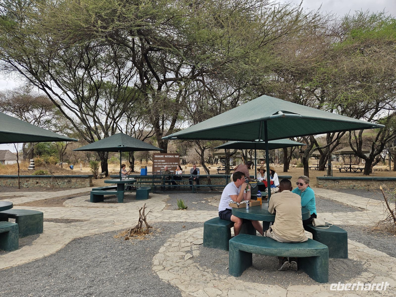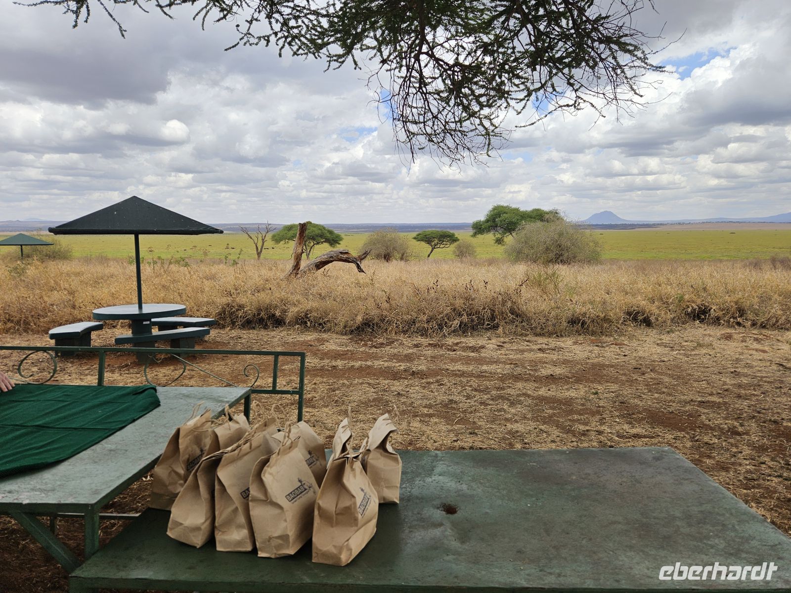 Im Inneren des Nationalparks packten wir um die Mittagszeit unsere Lunchboxen aus der Lodge aus. Wir wurden heute mit verschiedenen Salaten, Obst und Beilagen verpflegt. Zum Abschluss der Mittagspause brüht uns Furah immer Kaffee mit heißem Wasser aus der Thermoskanne auf.