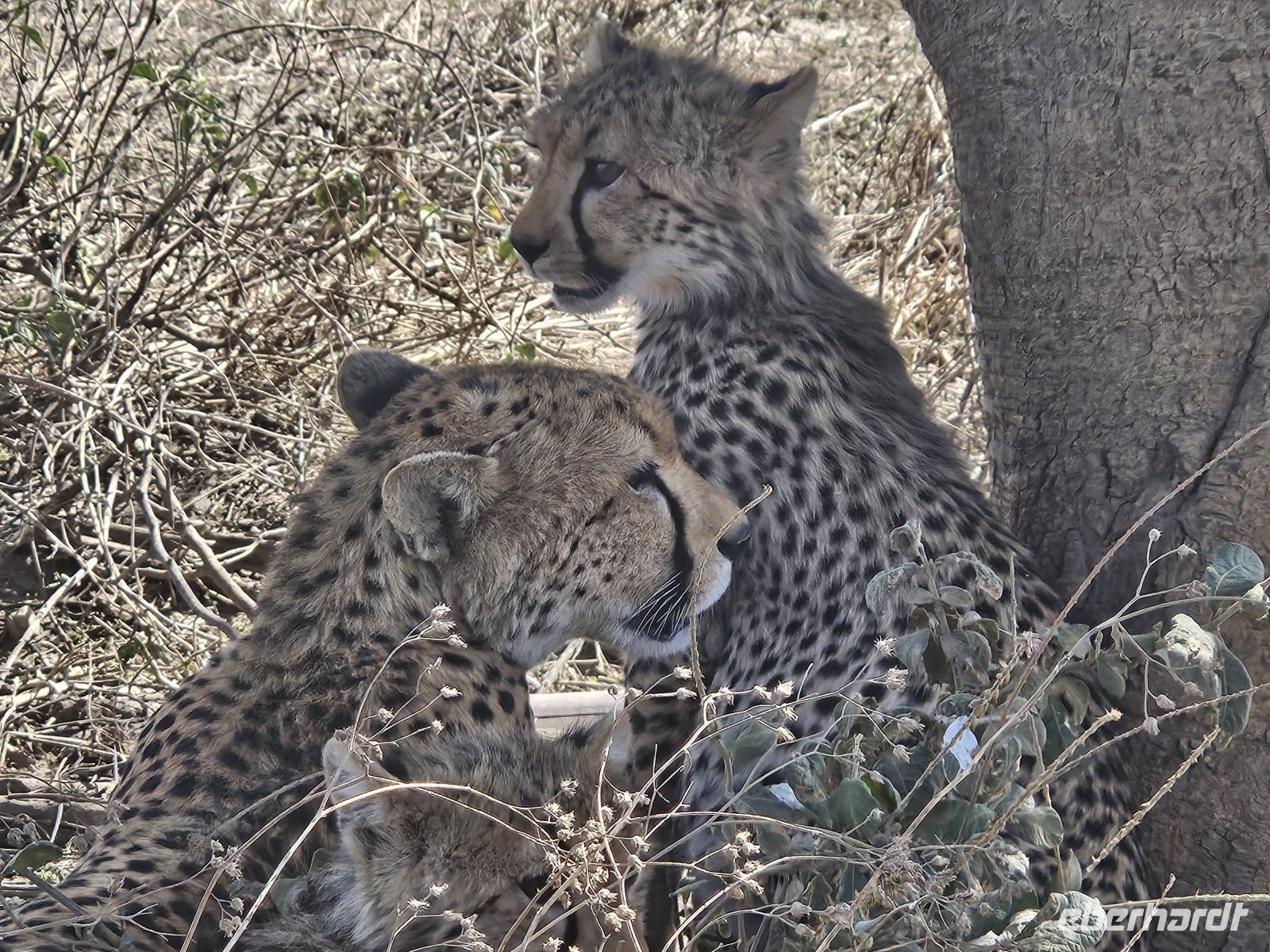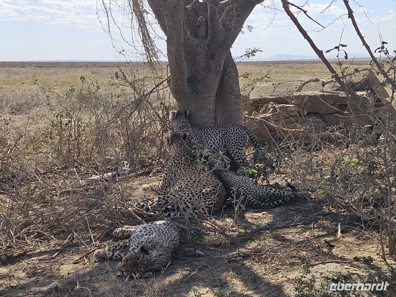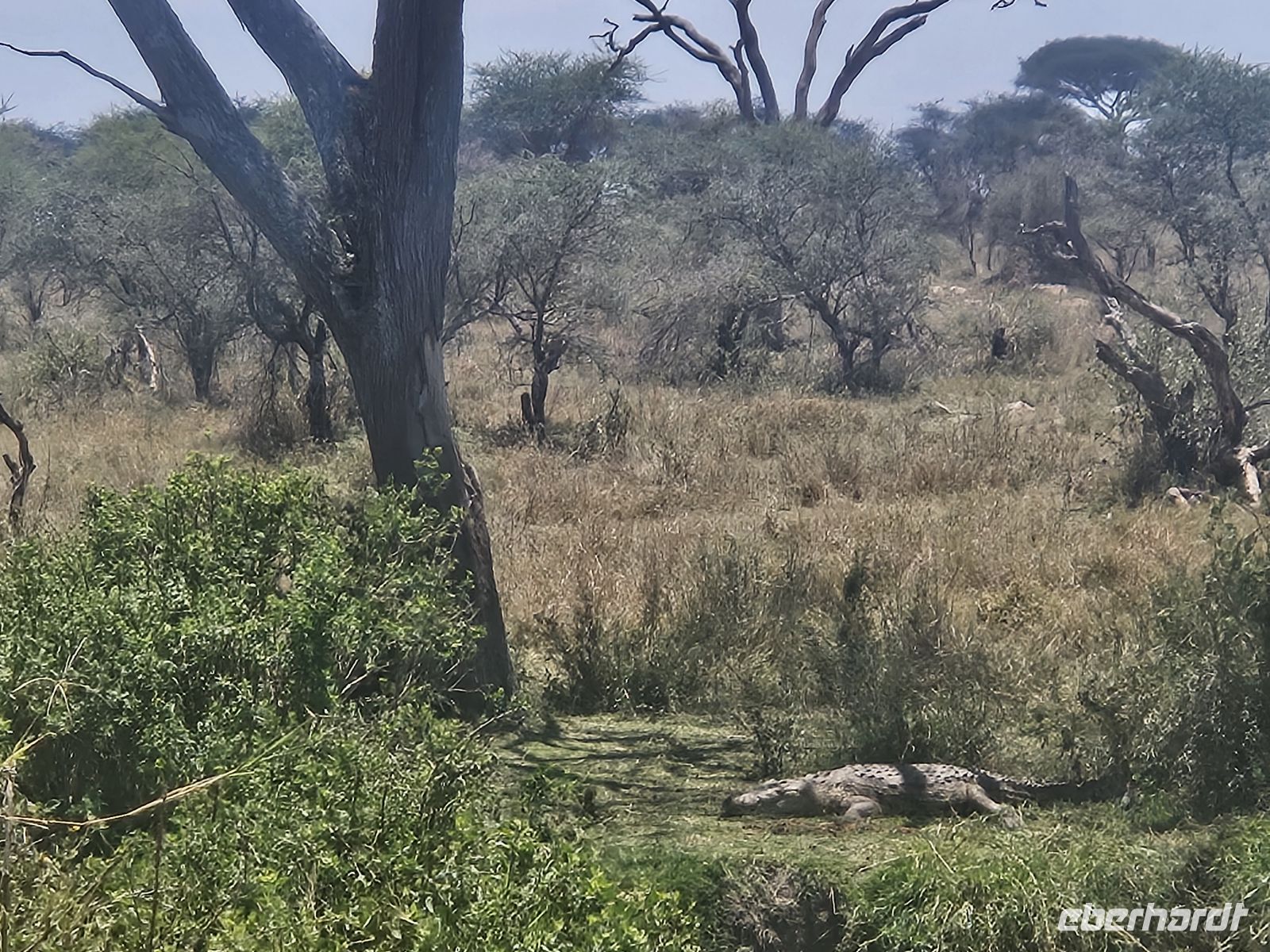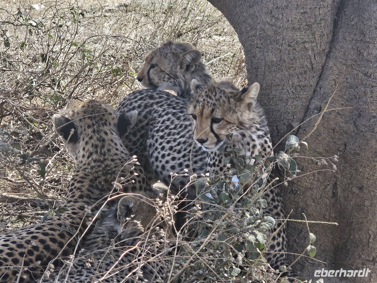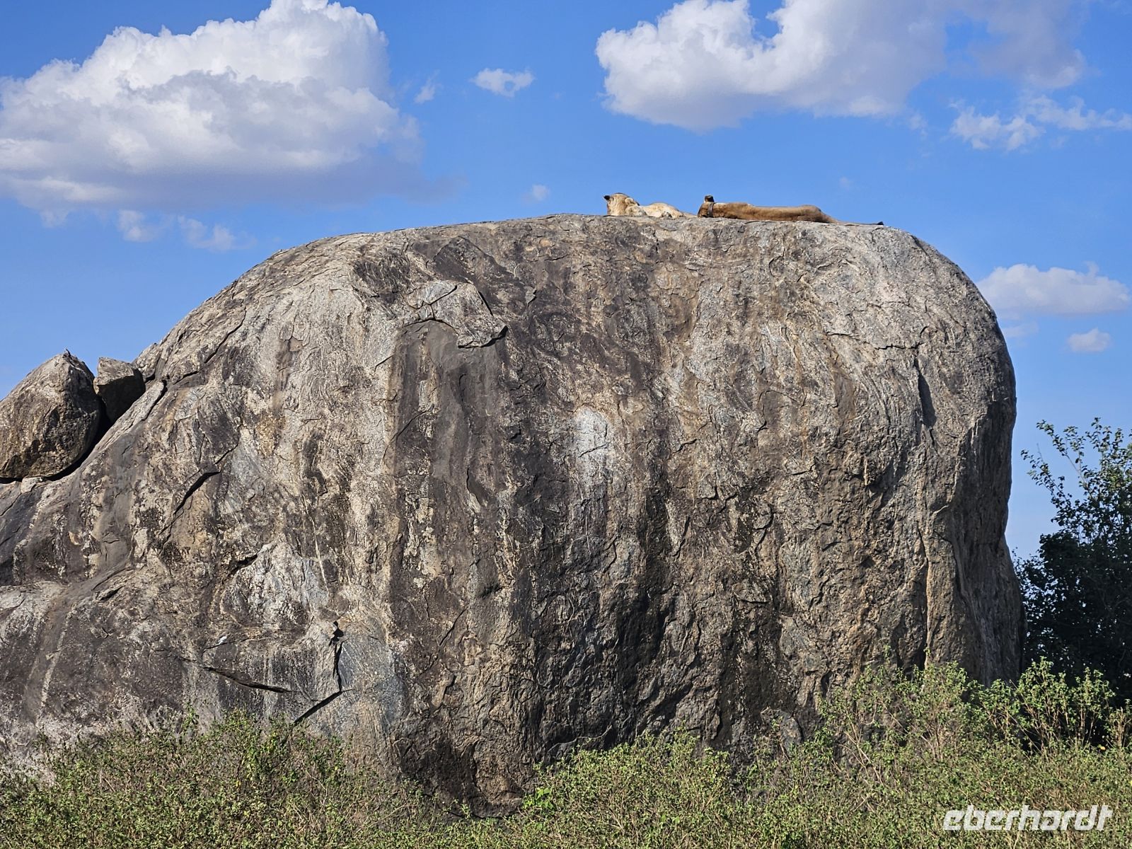Frisch gestärkt setzen wir unsere Fahrt fort und überquerten am Nachmittag die Grenze zum Serengeti-Nationalpark. Auf der Fahrt erwartete uns gleich ein echtes Highlicht: direkt an der Straße unter einem Baum begegneten uns vier Geparden, die vor sich hingedöst hatten und langsam wieder aufwachten und die Umgebung erkundeten. Auf einem großen Felsen entdeckten wir auf der Fahrt zudem noch zwei schlafende Löwen.