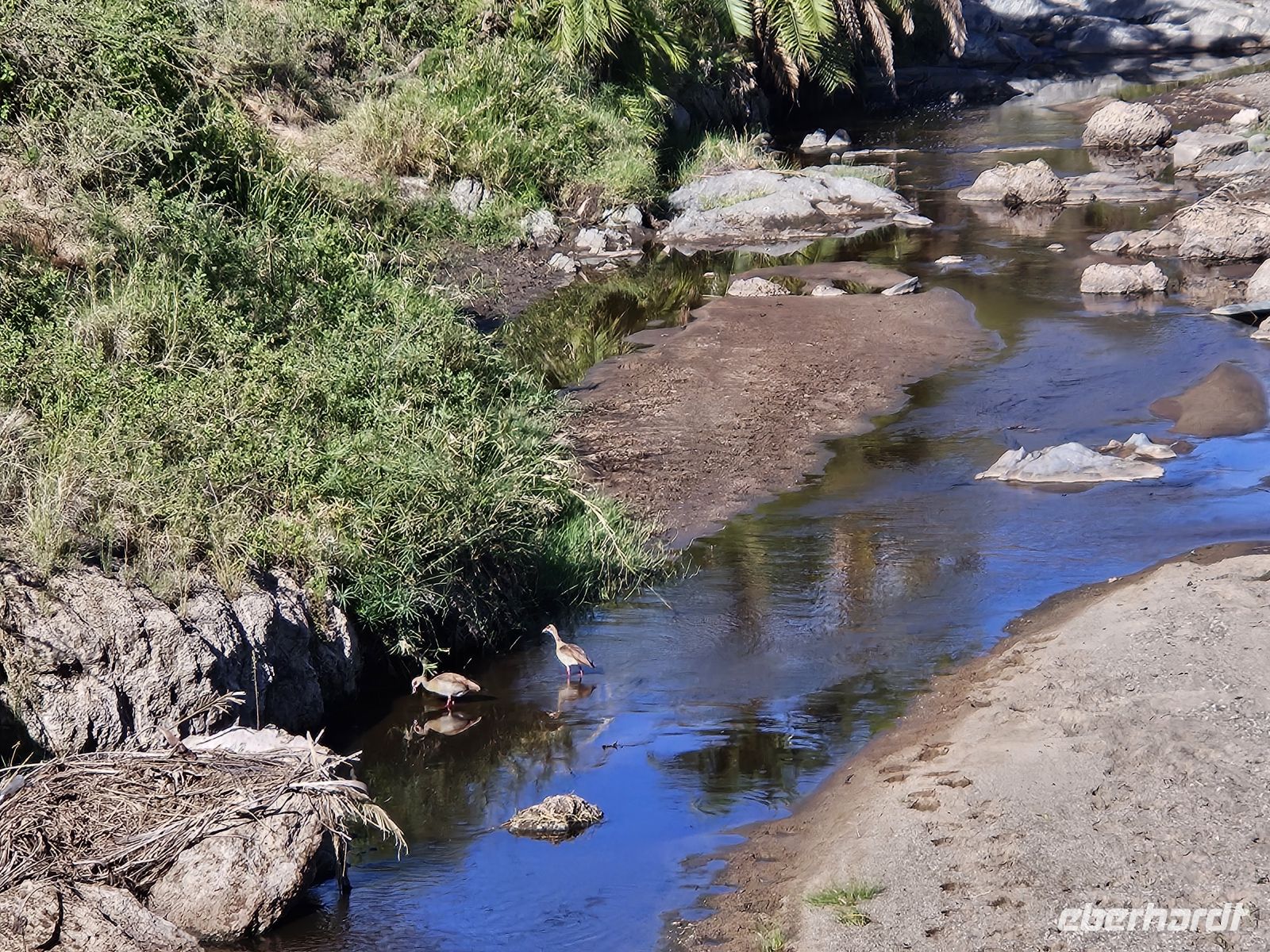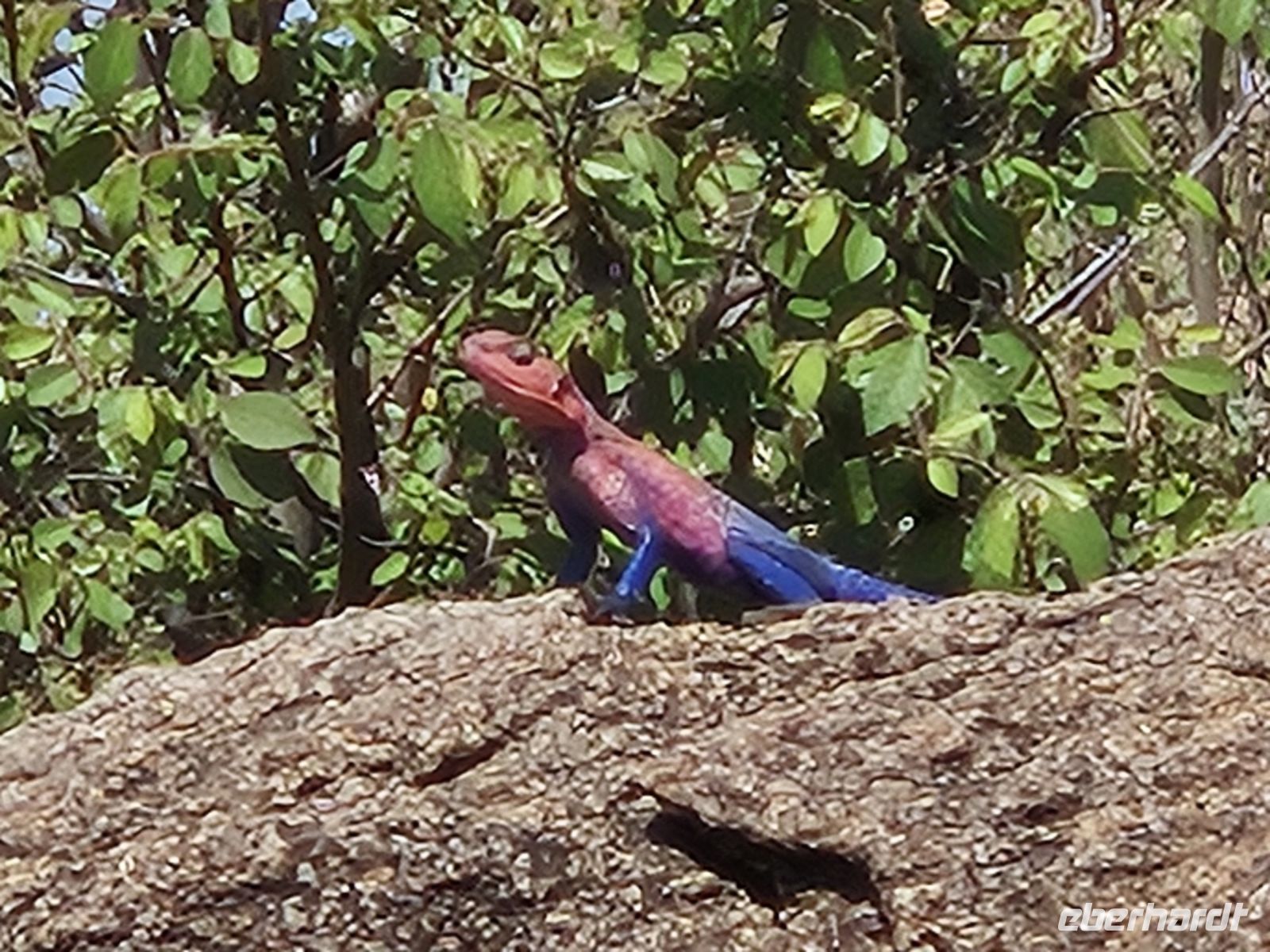 Während der Fahrt entdeckten wir auch zahlreiche Lebewesen, die uns während der Reise bisher noch nicht begegnet waren: Die Agama-Eidechse hat aufgrund ihres roten Kopfes und dem blauen Körper auch den Spitznamen „Spider Man“. Zudem entdeckten wir den Greifvogel „Sekretär“. Dieser fiel besonders durch seine markanten und abstehenden Federn im Kopfbereich auf.