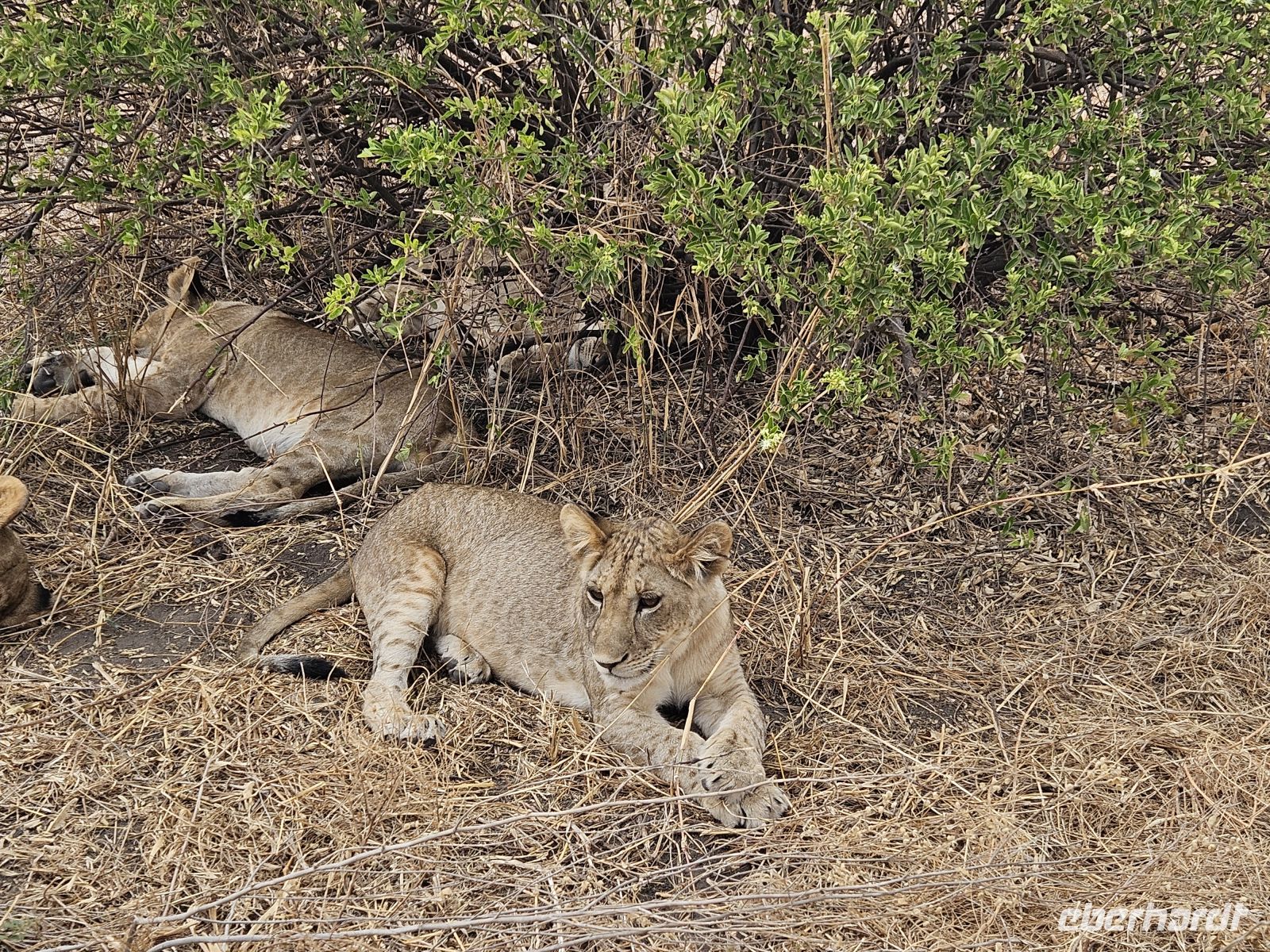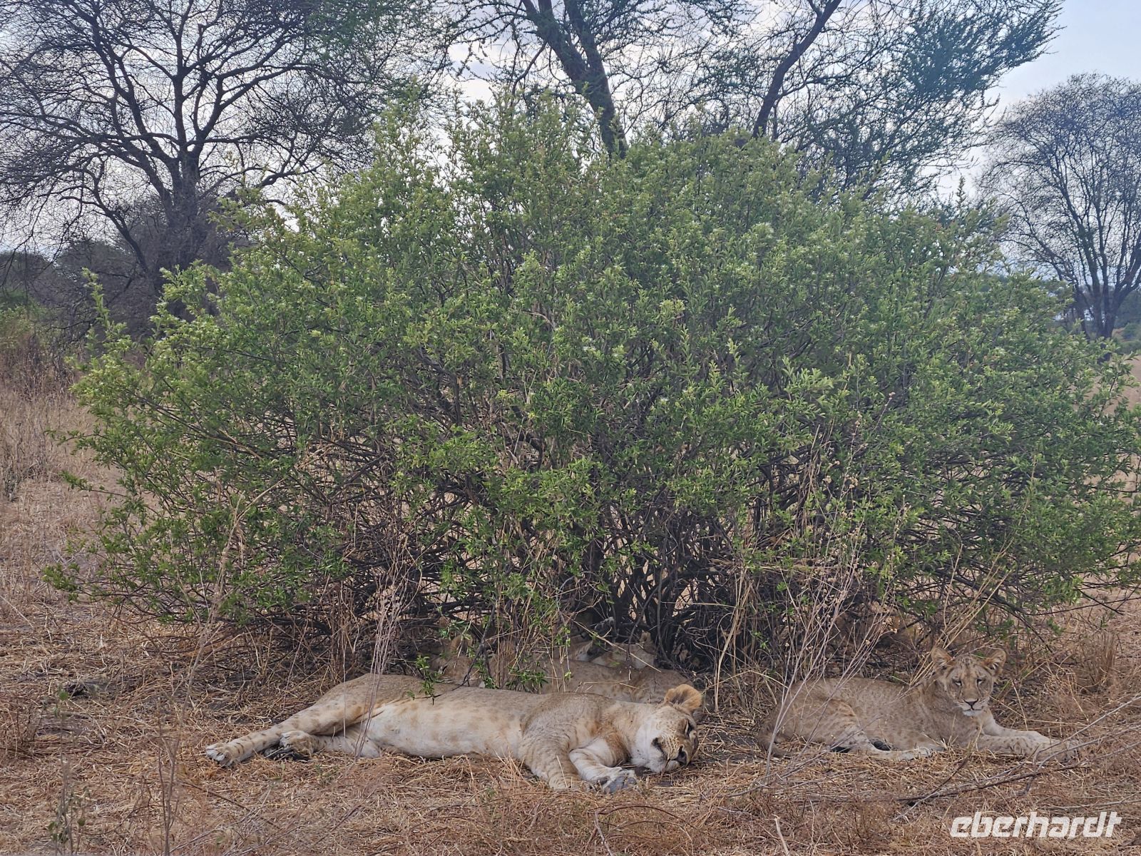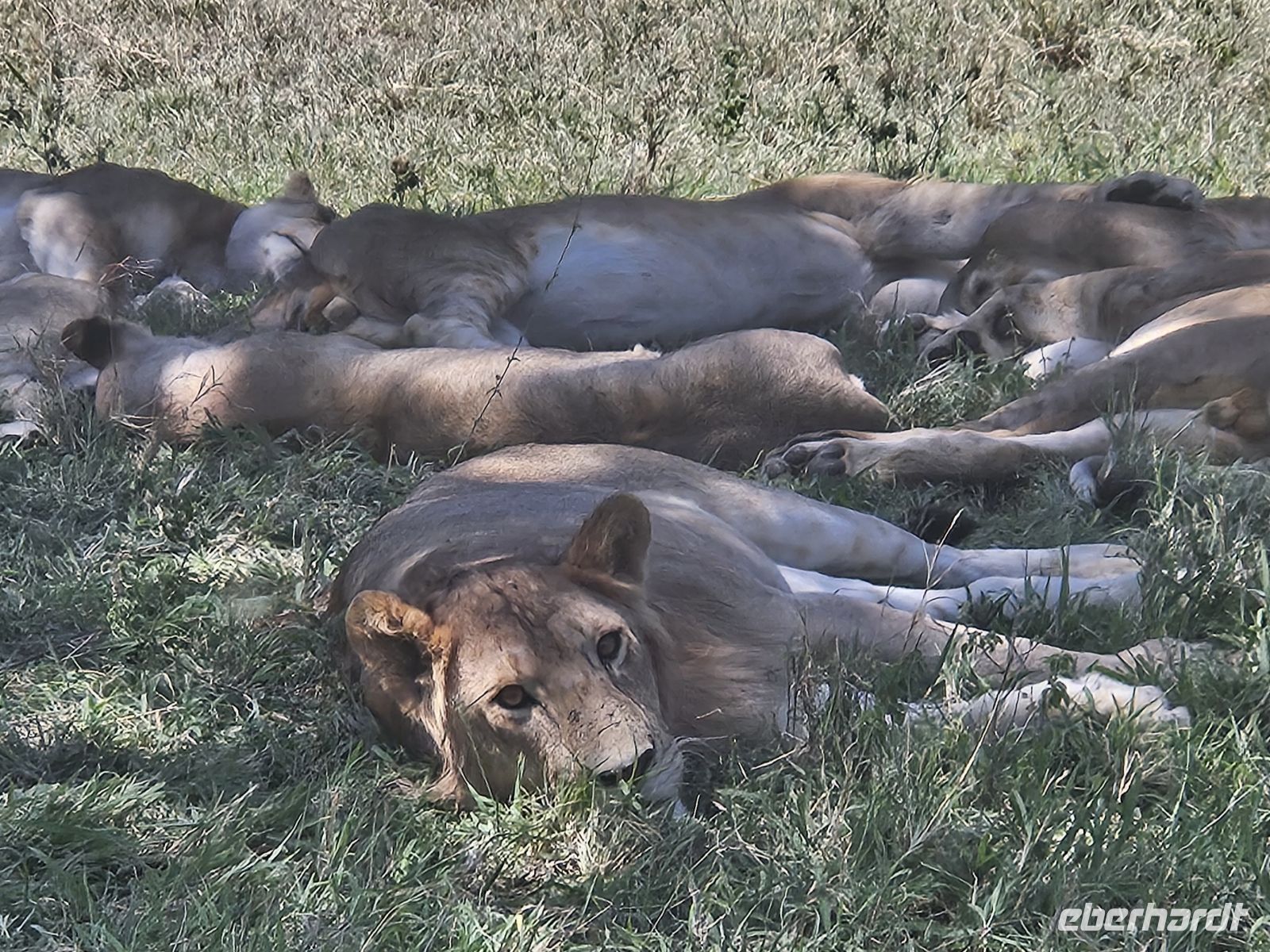 Echtes Highlight für heute war eine Gruppe von acht Löwinnen und Junglöwen, die es sich unter einem Baum gemütlich gemacht hatten und vor sich hindösten. Einer der Junglöwen erwachte langsam aus seinem Schlaf – ließ dich dabei von den um ihn herumstehenden Jeeps aber gar nicht beeindrucken. Furah erzählte uns, dass die Löwen im Rudel Jagen und danach 4-5 Tage ohne Jagen und viel Essen auskommen.