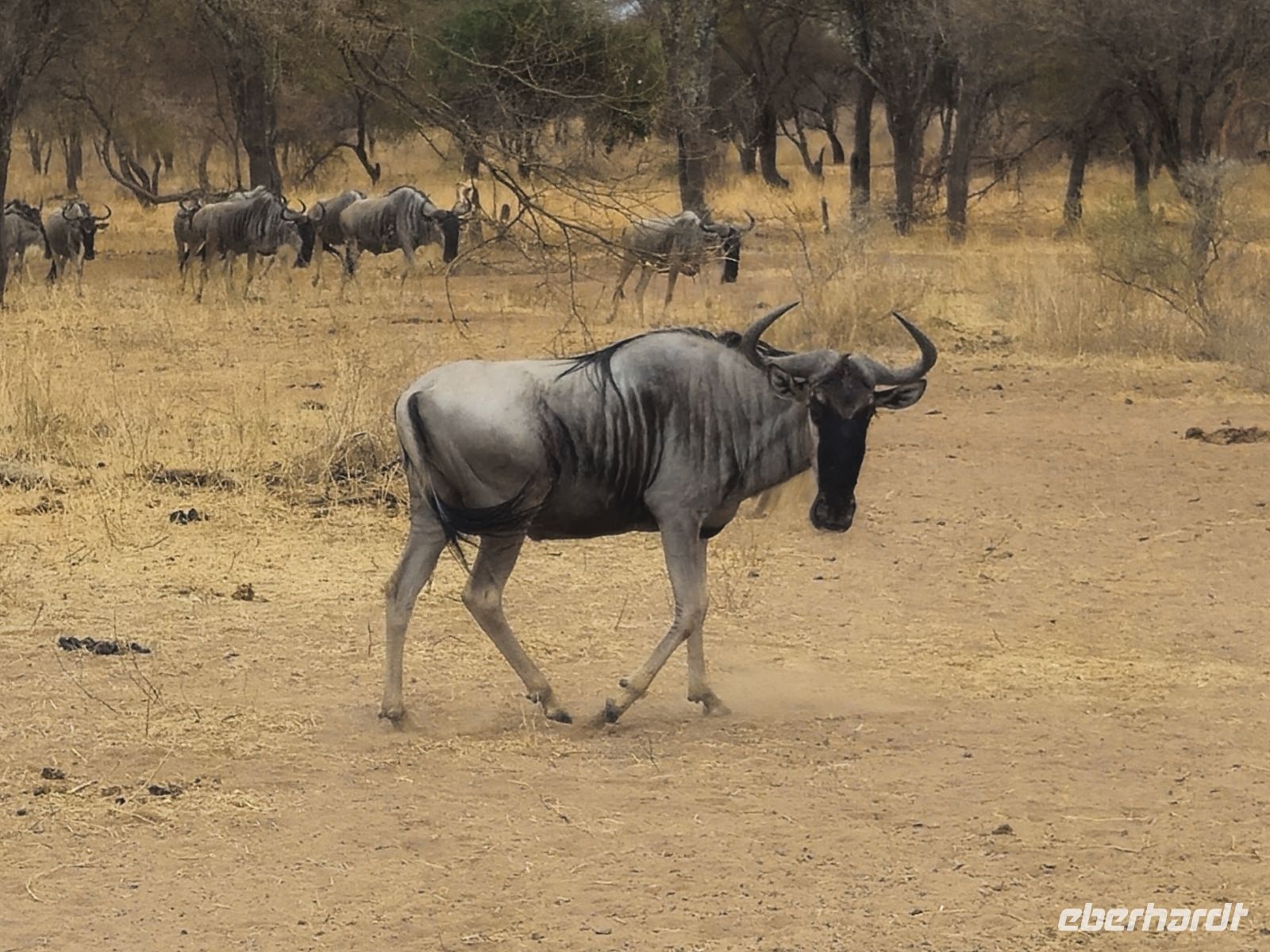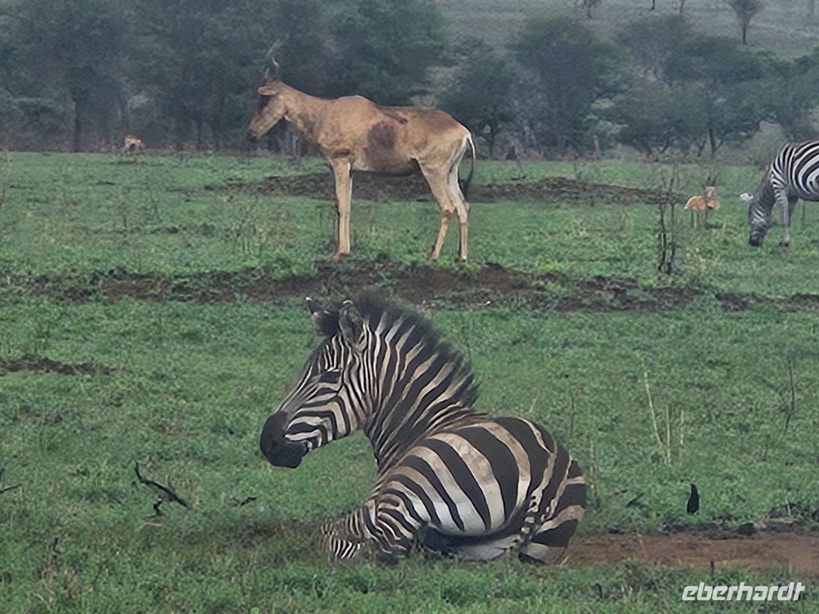 Nach einem stärkenden Frühstück, begannen wir unsere Pirschfahrt heute schon um 07.30 Uhr. Zu Beginn liefen uns nur einige Zebras über den Weg. Furah sagte hierzu immer scherzhaft „Zebrastreifen“. Zudem fiel uns auf, dass sich die Gnus besonders gerne in der Nähe der Zebras aufhielten. Dies hängt damit zusammen, dass Gnus sehr vergesslich sind und keinen guten Orientierungssinn haben. Zebras dagegen sind sehr intelligente Tiere und können sich bestens in der Natur zurechtfinden. Somit benutzen die Gnus die Zebras gerne als „GPS“. In dem Sinne sind Furah und Brian als unsere Driverguides ebenfalls Zebras und die Touristen die Gnus, die Unterstützung brauchen, um sich im Nationalpark zurechtzufinden.