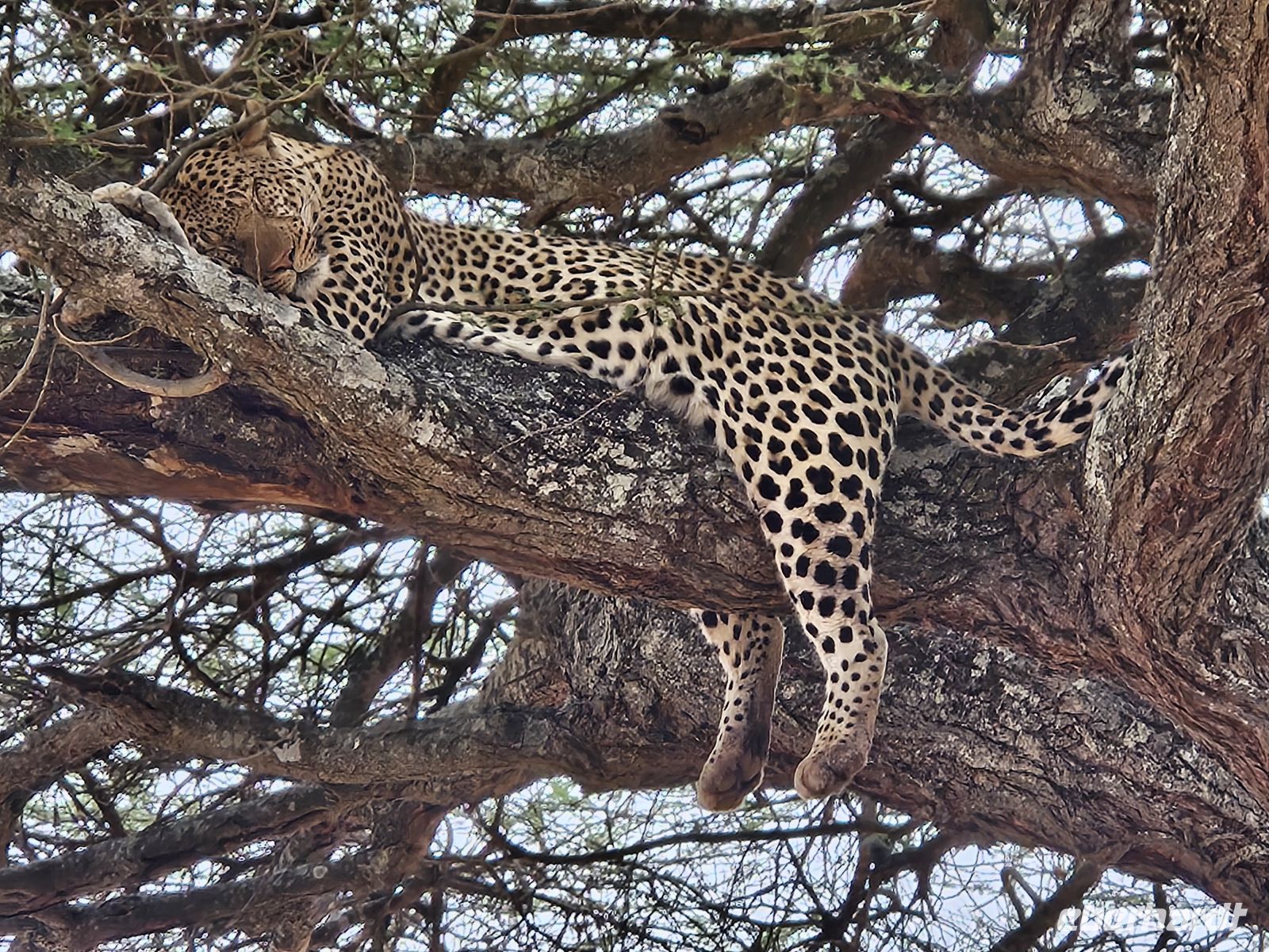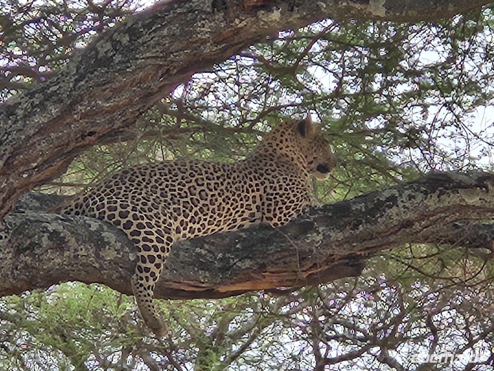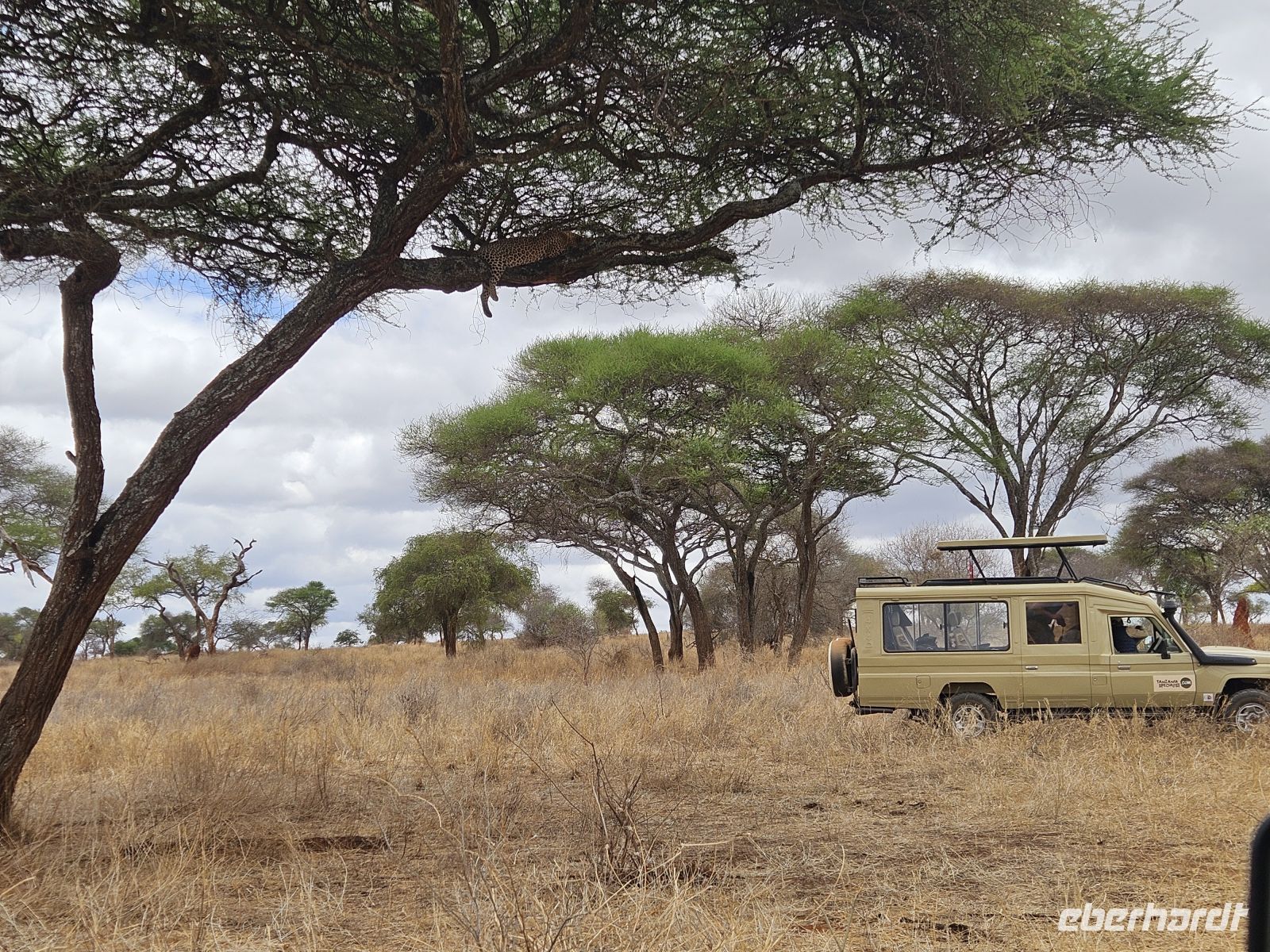 Bit dem Fernglas konnten wir auch bereits den ersten Leoparden erkennen. Etwas später kam aber ein Tipp über Funk, dass eine Leopardin soeben ein Impala erlegt hätte und jetzt auf einem Baum ausruht. Und tatsächlich: hoch oben auf einem Baum fand sich die Leopardin mit ihrem wunderschönen markanten Fell und fiel nach ihrem