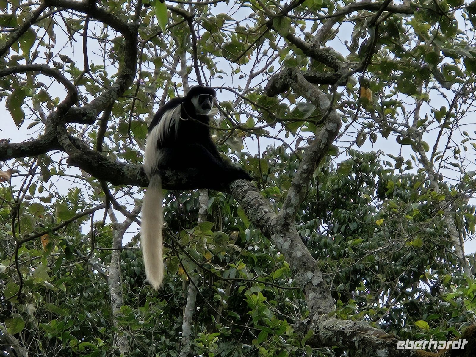 Auf dem Rückweg begegneten uns mehrere Mantelaffen. Diese sind besonders gut an ihrem schwarzen Fell und dem markanten weißen Schwanz und weißem Fell an den Armen zu erkennen.