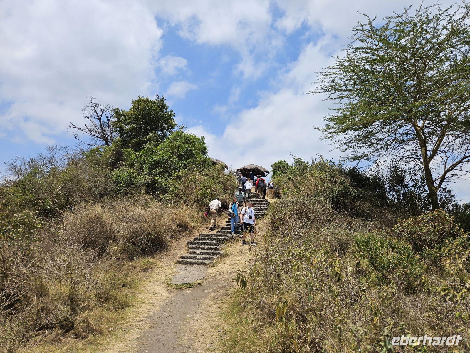 Kurz vor unserer Mittagspause erreichten wir den Rand des Ngurdoto-Kraters. In den 400 Meter tiefen Krater darf man jedoch nicht reinfahren.