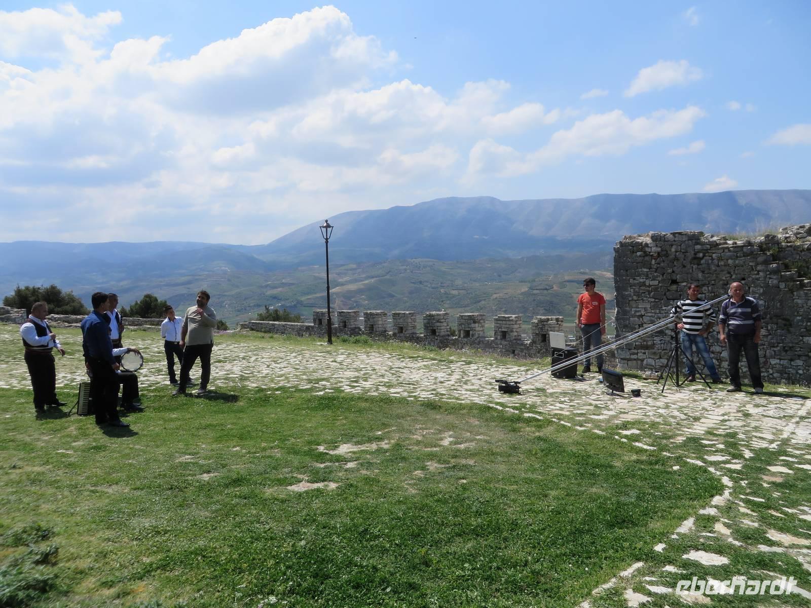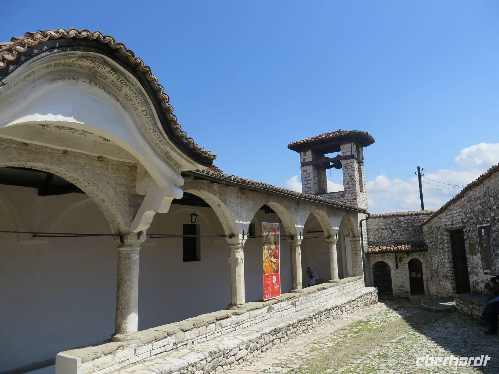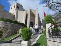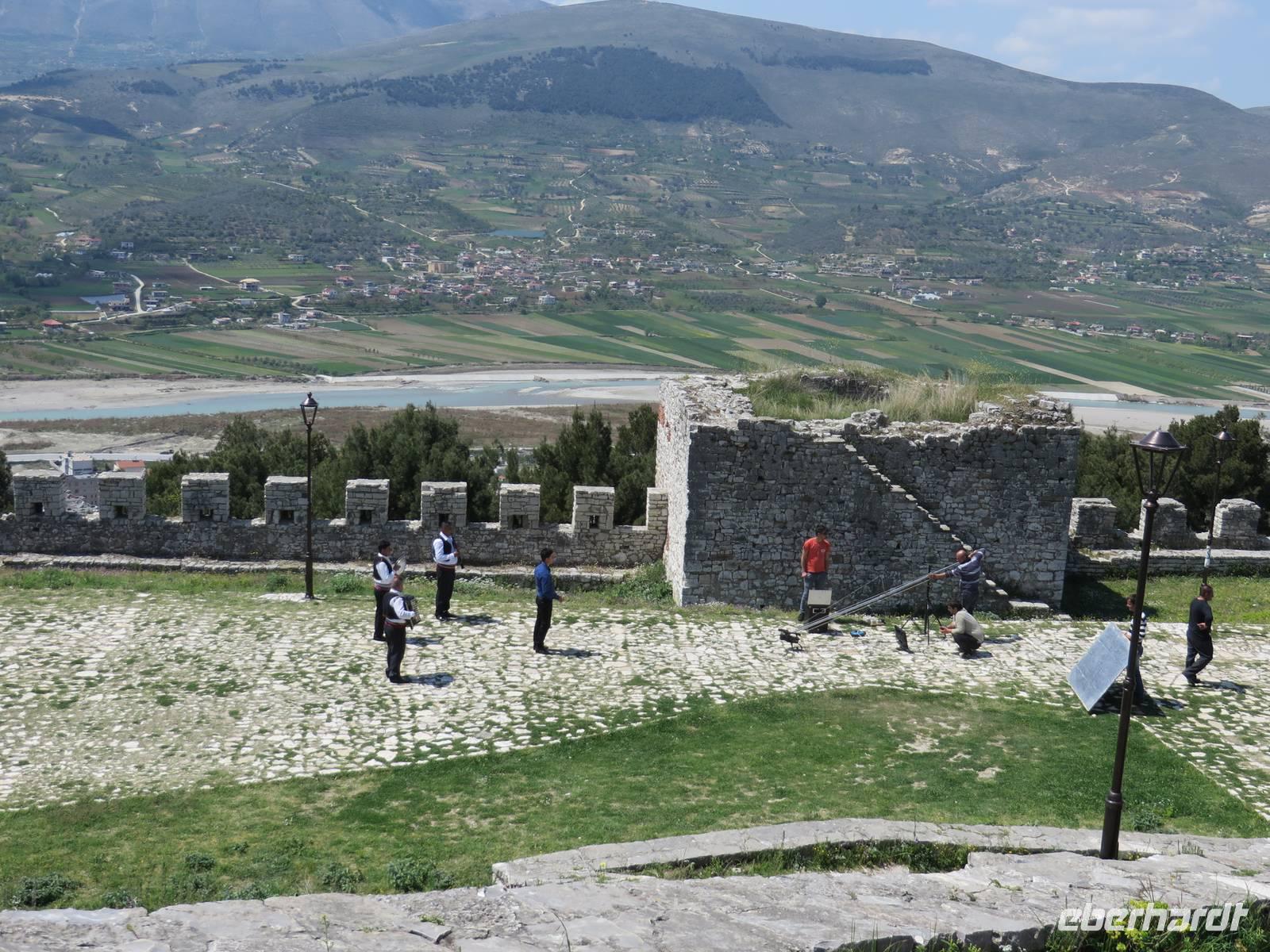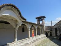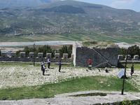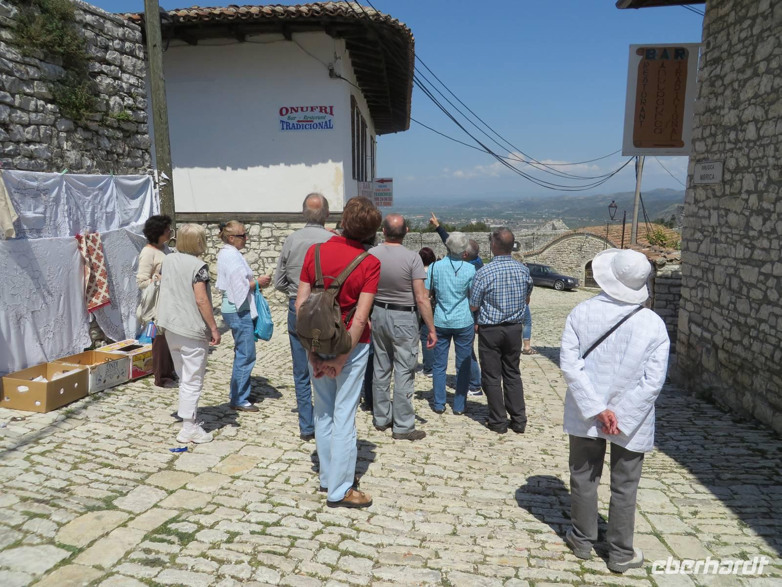 Der Tag beginnt um 7.30 Uhr mit einem Frühstückbuffet im Hotel. Das Restaurant ist klein, aber die Versorgung super. Der Kaffee wird sogar jedem persönlich an den Platz gebracht. Um 9.00 Uhr verladen wir die Koffer und fahren Richtung Berat. Koli stellt uns eine albanische Spezialität vor - den „Skanderbeg" ein albanischer Weinbrand, der seit 1967 in Tirana hergestellt wird und als Nationalgetränk der Albaner gilt. Die Stimmung ist ausgezeichnet. Die Straße ist gut ausgebaut und so sind wir nach knappen zwei Stunden in Berat. Die Stadt ist der Stolz der albanischen Geschichte und Teil des UNESCO Kulturerbes. Auf dem Weg zur Festung ist heute ein Filmteam unterwegs, das gerade dabei ist, ein Musikvideo zu drehen. Ihre Begeisterung darüber, dass wir stehen bleiben und sie von allen Seiten fotografieren, hält sich verständlicherweise in Grenzen, aber sie halten höflich aus, bis wir uns verziehen. Zweitausendvierhundert Jahre haben östliche und westliche Kulturen in der Festung ihre Spuren hinterlassen. Innerhalb der Anlage gibt es freskenreiche Kirchen und eine Schule für Ikonenmalerei. Besonders interessant macht die Festung, dass sie heute noch bewohnt ist. Freundlich werden wir in das eine oder andere Haus eingeladen. Auf Grund der Vielzahl der übereinander gebauten Fenster wird Berat auch „die Stadt der tausend Fenster" genannt. Mit guter Kondition erobern wir die Stadt auf rutschigem Kopfsteinpflaster, das zwar schön aussieht, aber die Besichtigung doch recht beschwerlich macht. Ordentlich geschafft legen wir eine Mittagspause im Restaurant unterhalb der Burg ein. Es gibt leckere Gemüsesuppe und einen Grappa vom Hause. Anschließend besuchen wir das MuseumOnufri-Museum. Er gilt als bedeutendster Vertreter der byzantinischen Malerei des 16. Jahrhunderts. Bekannt ist die vom ihm verwendete rote Farbe, die auch als „Onufri-Rot" bezeichnet wird. In unserem Programm ist keine Museumsführung vorgesehen, aber das Museum wird von einem enthusiastischen Guide betreut, der es sich nicht nehmen lässt, uns den Maler und seine Werke näher zu bringen. Auch die Ikonastase erklärt er uns in allen Einzelheiten. Übernachten werden wir heute im Hotel „Grand White City". Hier erwartet uns auch das Abendessen. Mit gefüllten Oliven, Paprikapastete und Bruscetta als Vorspeise, drei Sorten Teigtaschen, Lamm oder Chicken mit Reis und Kartoffeln zum Hauptgang und Joghurt mit Honig zum Nachtisch, so werden wir heute verwöhnt.