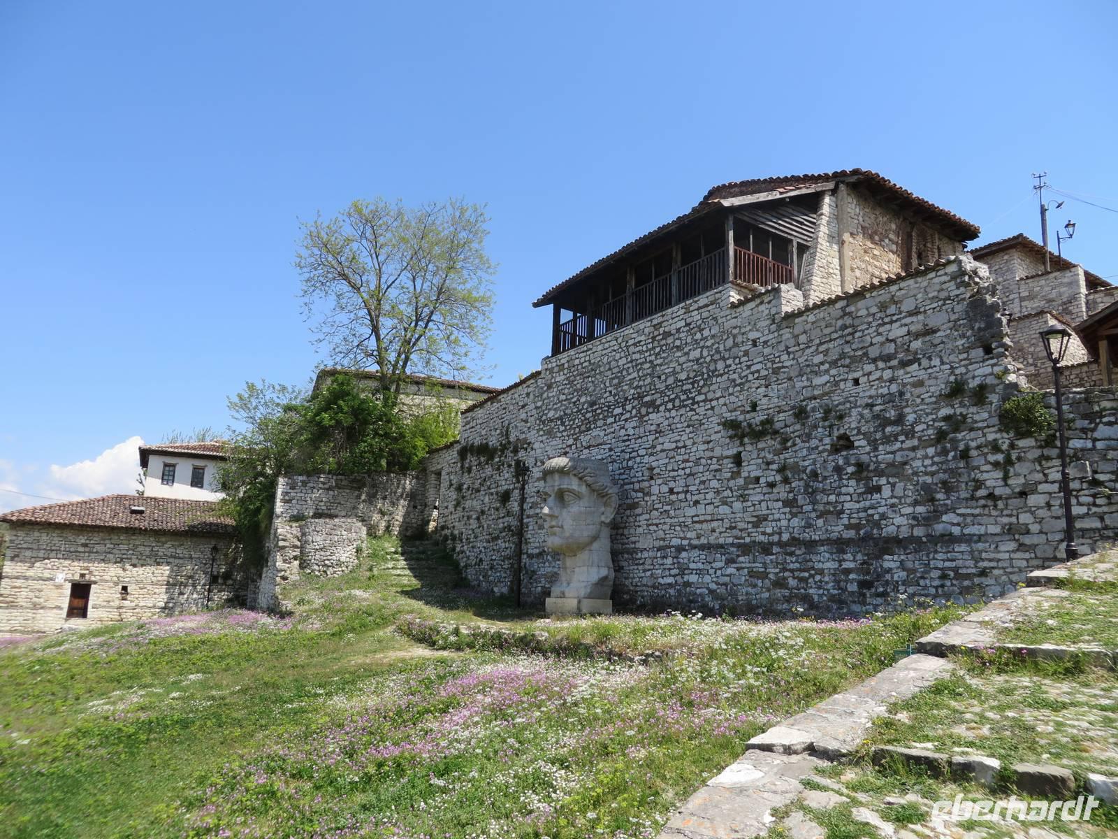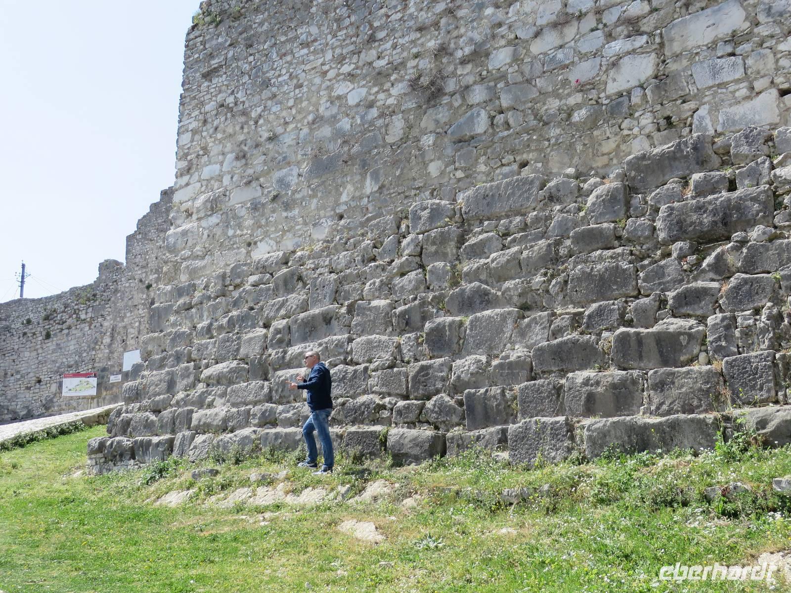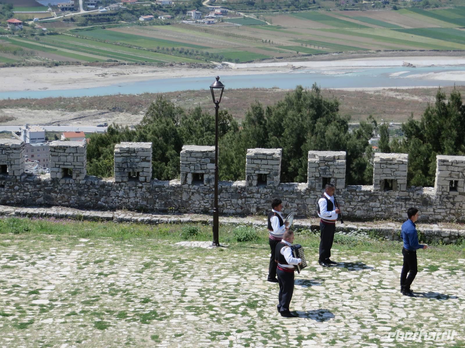 Der Tag beginnt um 7.30 Uhr mit einem Frühstückbuffet im Hotel. Das Restaurant ist klein, aber die Versorgung super. Der Kaffee wird sogar jedem persönlich an den Platz gebracht. Um 9.00 Uhr verladen wir die Koffer und fahren Richtung Berat. Koli stellt uns eine albanische Spezialität vor - den „Skanderbeg" ein albanischer Weinbrand, der seit 1967 in Tirana hergestellt wird und als Nationalgetränk der Albaner gilt. Die Stimmung ist ausgezeichnet. Die Straße ist gut ausgebaut und so sind wir nach knappen zwei Stunden in Berat. Die Stadt ist der Stolz der albanischen Geschichte und Teil des UNESCO Kulturerbes. Auf dem Weg zur Festung ist heute ein Filmteam unterwegs, das gerade dabei ist, ein Musikvideo zu drehen. Ihre Begeisterung darüber, dass wir stehen bleiben und sie von allen Seiten fotografieren, hält sich verständlicherweise in Grenzen, aber sie halten höflich aus, bis wir uns verziehen. Zweitausendvierhundert Jahre haben östliche und westliche Kulturen in der Festung ihre Spuren hinterlassen. Innerhalb der Anlage gibt es freskenreiche Kirchen und eine Schule für Ikonenmalerei. Besonders interessant macht die Festung, dass sie heute noch bewohnt ist. Freundlich werden wir in das eine oder andere Haus eingeladen. Auf Grund der Vielzahl der übereinander gebauten Fenster wird Berat auch „die Stadt der tausend Fenster" genannt. Mit guter Kondition erobern wir die Stadt auf rutschigem Kopfsteinpflaster, das zwar schön aussieht, aber die Besichtigung doch recht beschwerlich macht. Ordentlich geschafft legen wir eine Mittagspause im Restaurant unterhalb der Burg ein. Es gibt leckere Gemüsesuppe und einen Grappa vom Hause. Anschließend besuchen wir das MuseumOnufri-Museum. Er gilt als bedeutendster Vertreter der byzantinischen Malerei des 16. Jahrhunderts. Bekannt ist die vom ihm verwendete rote Farbe, die auch als „Onufri-Rot" bezeichnet wird. In unserem Programm ist keine Museumsführung vorgesehen, aber das Museum wird von einem enthusiastischen Guide betreut, der es sich nicht nehmen lässt, uns den Maler und seine Werke näher zu bringen. Auch die Ikonastase erklärt er uns in allen Einzelheiten. Übernachten werden wir heute im Hotel „Grand White City". Hier erwartet uns auch das Abendessen. Mit gefüllten Oliven, Paprikapastete und Bruscetta als Vorspeise, drei Sorten Teigtaschen, Lamm oder Chicken mit Reis und Kartoffeln zum Hauptgang und Joghurt mit Honig zum Nachtisch, so werden wir heute verwöhnt.