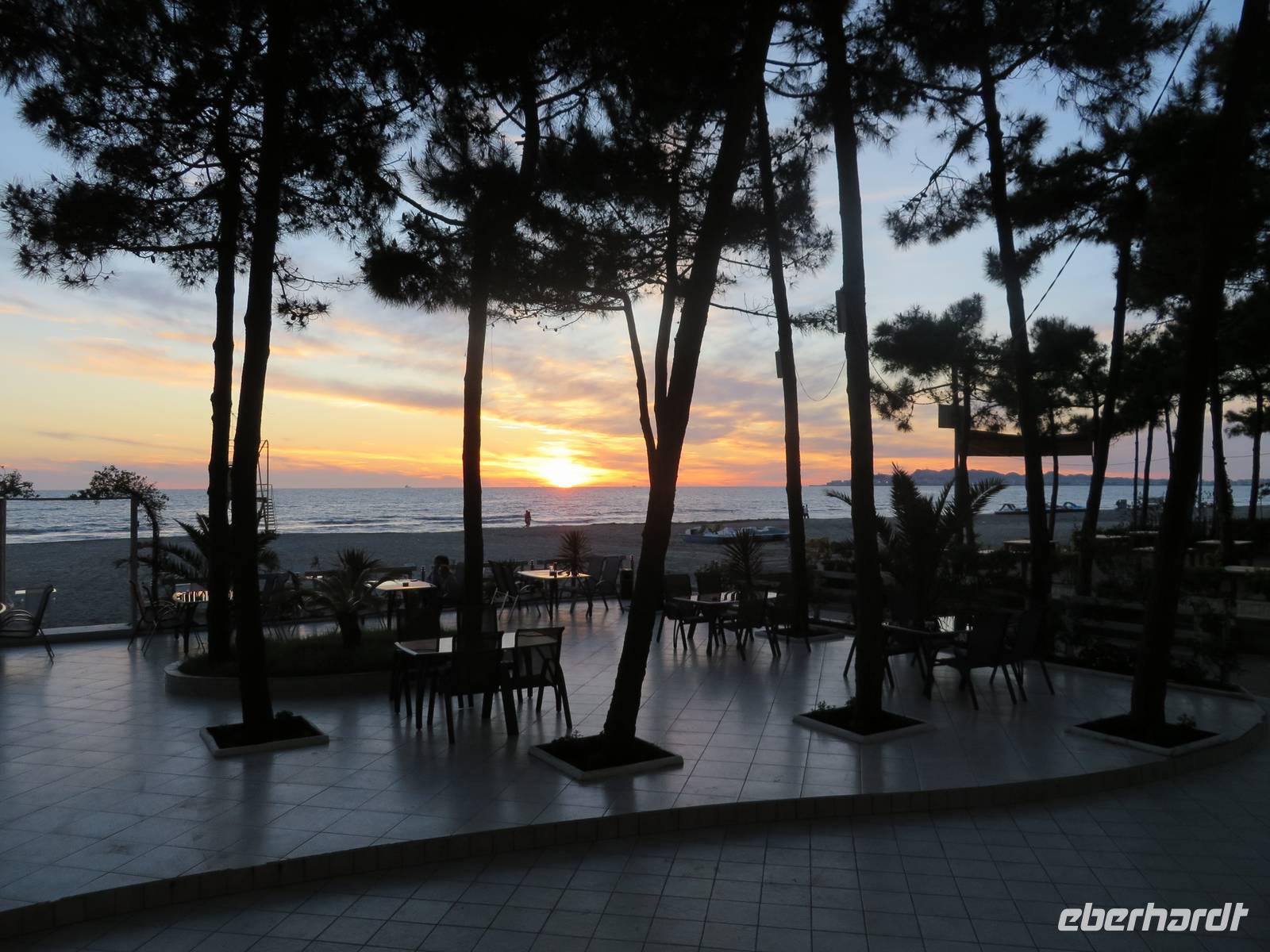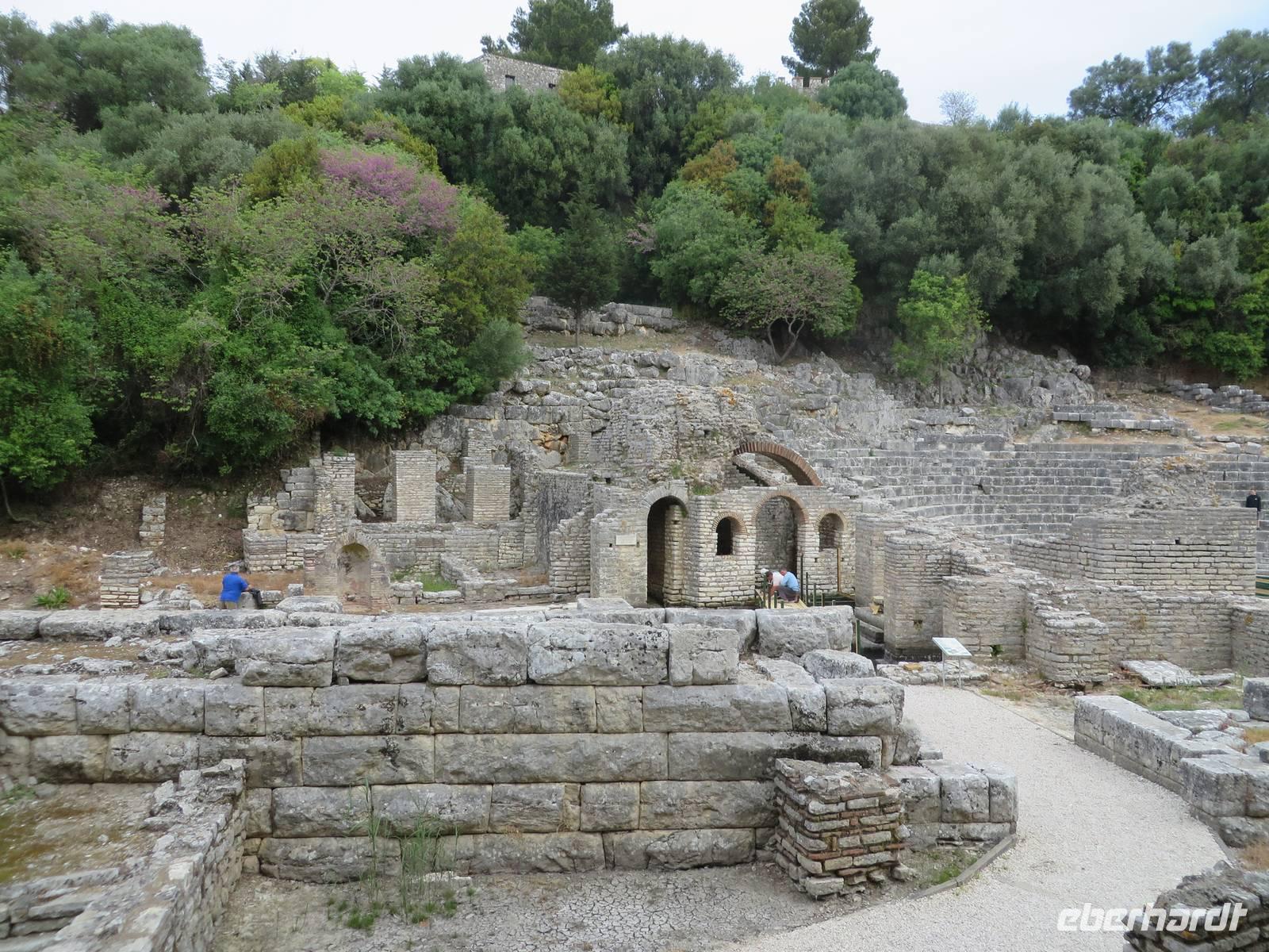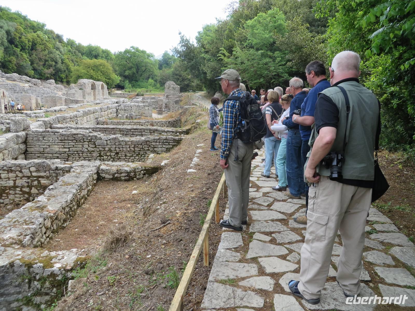 Das Frühstücksrestaurant des Hotels befindet sich in der 4. Etage. Und damit haben wir einen ausgezeichneten Blick auf das Meer. So kann der Tag beginnen. Wir fahren nach Butrint. Heute begleitet uns die örtliche Reiseleiterin Kelly. Die antike Stadt Butrint ist der wichtigste archäologische Ort in Albanien und gehört zum UNESCO Weltkulturerbe. Inmitten eines subtropischen Dschungels, der von Lorbeerbäumen beherrscht wird, befindet sich diese historische Ausgrabungsstätte. Beeindruckend ist das Theater mit 1500 Sitzplätzen, in dem heute noch jedes Jahr im September das Internationale Festival der Theatergruppen statt findet. Derzeit sind Arbeiter dabei, die Bühne zu bauen. Ihr Hämmern und Bohren begleitet die Erklärungen von Kelly, die etwas entnervt, um Ruhe bittet. Und - der albanischen Gastfreundschaft folgend - stellen die Arbeiter tatsächlich ihre Aktivitäten ein, bis wir weiter gehen. Wir kommen vorbei an der eindrucksvollen Basilika aus dem 6. Jahrhundert. Kelly legt für uns ein Mosaik frei, das ansonsten von Sand und Kies bedeckt ist. Wir kommen zum Löwentor, an dem ein Relief angebracht ist, das den Kampf eines Löwen mit einem Stier darstellt. Zum Schluss besuchen wir das Museum, in dem einige Exponate zu sehen sind, die während der Ausgrabungen gefunden wurden. Einige Skulpturen ohne Kopf und einige Köpfe ohne Rumpf (ein bisschen makaber). Als wir zum Bus kommen, verkauft dort ein Einheimischer Teigtaschen, die mit Schafskäse gefüllt sind. Nicht wenige von uns lassen sich verführen, diese Spezialität zu kosten. Lecker! Wir fahren zurück nach Saranda. Der Nachmittag steht zur freien Verfügung. Wir bummeln am Strand entlang, kaufen Souveniere und/oder kehren ein - kurz gesagt, wir lassen es uns gut gehen.