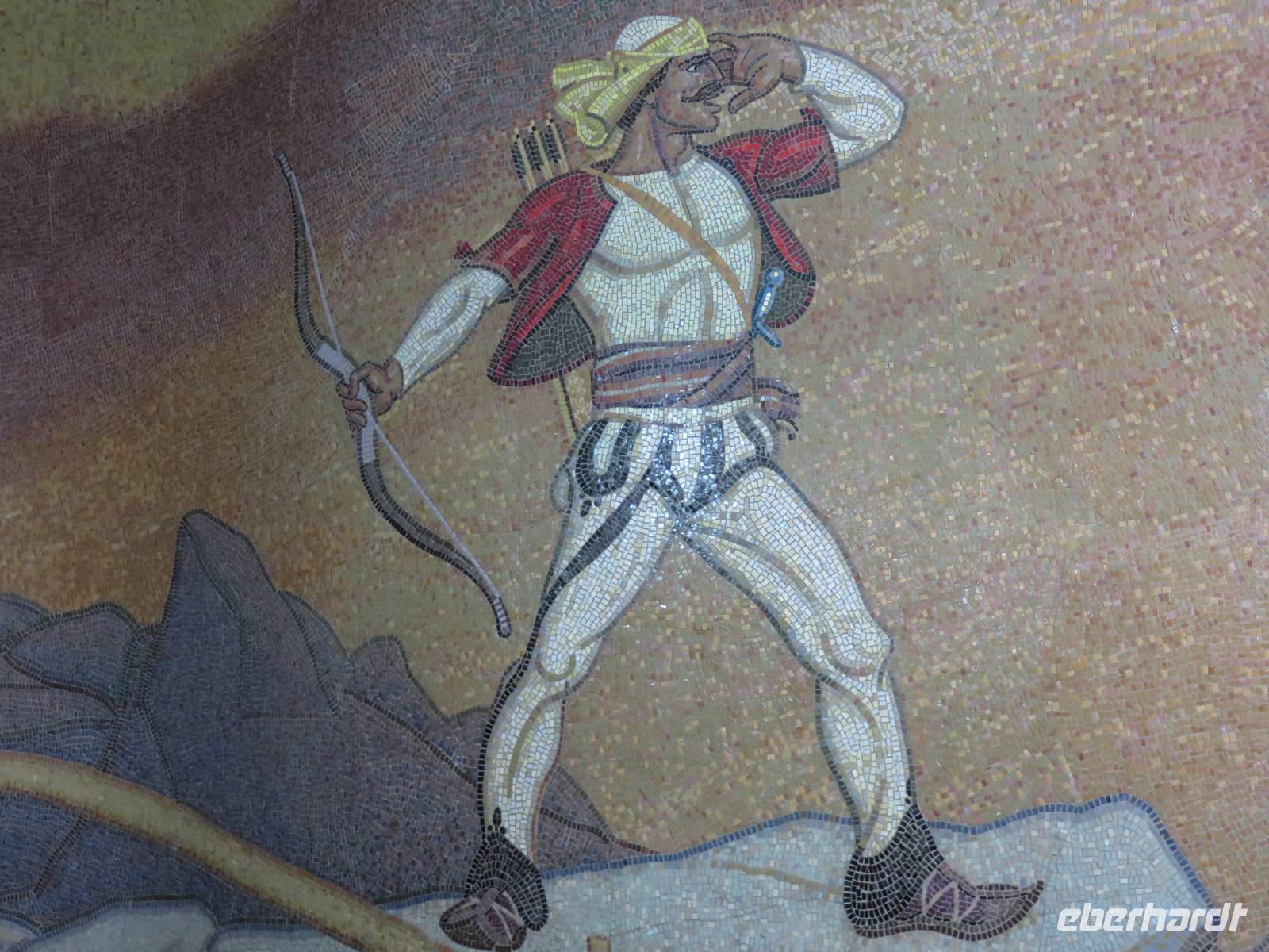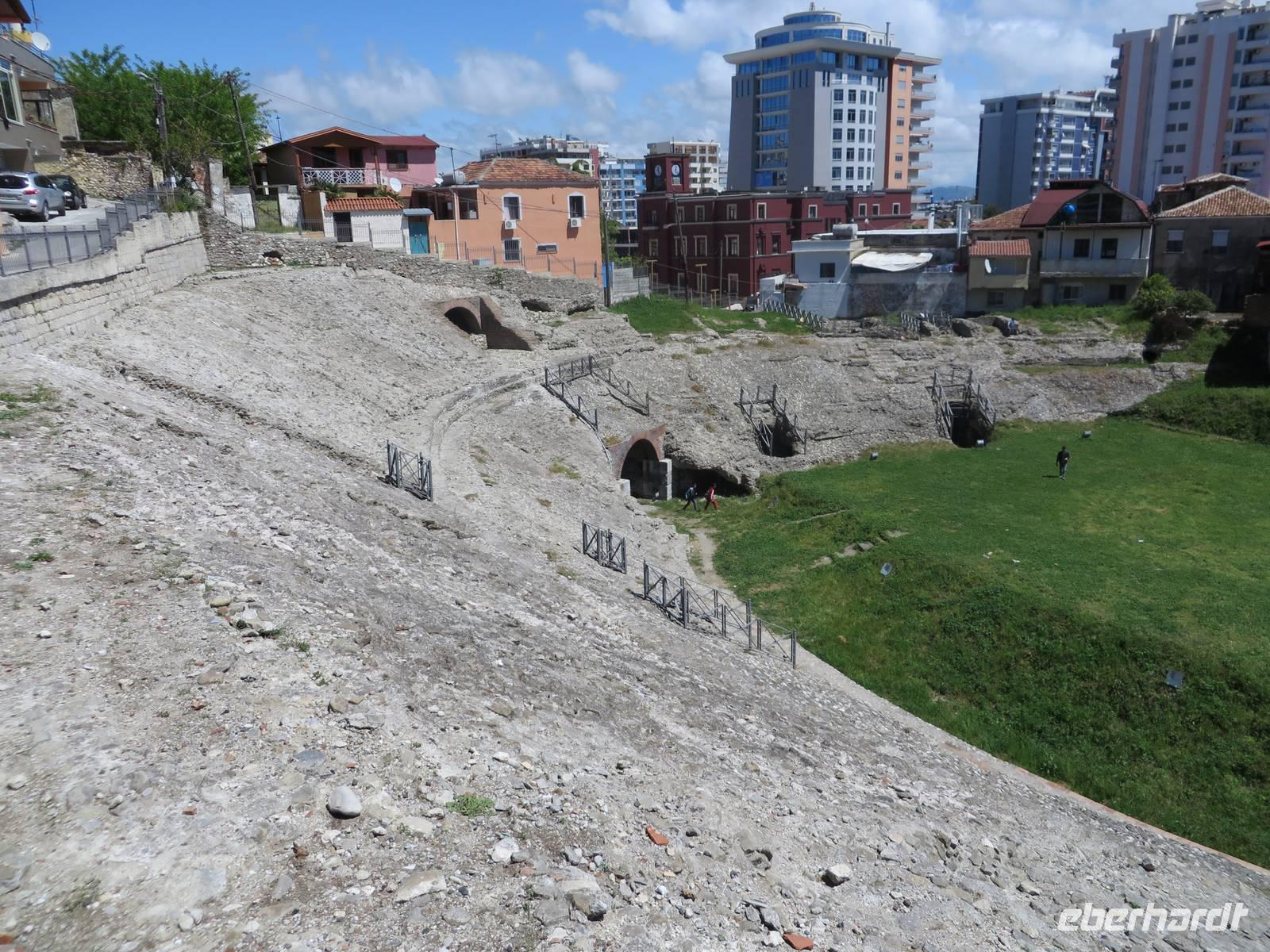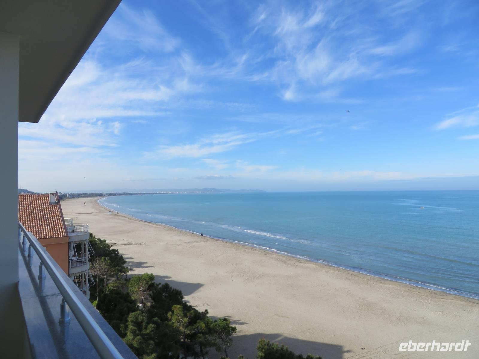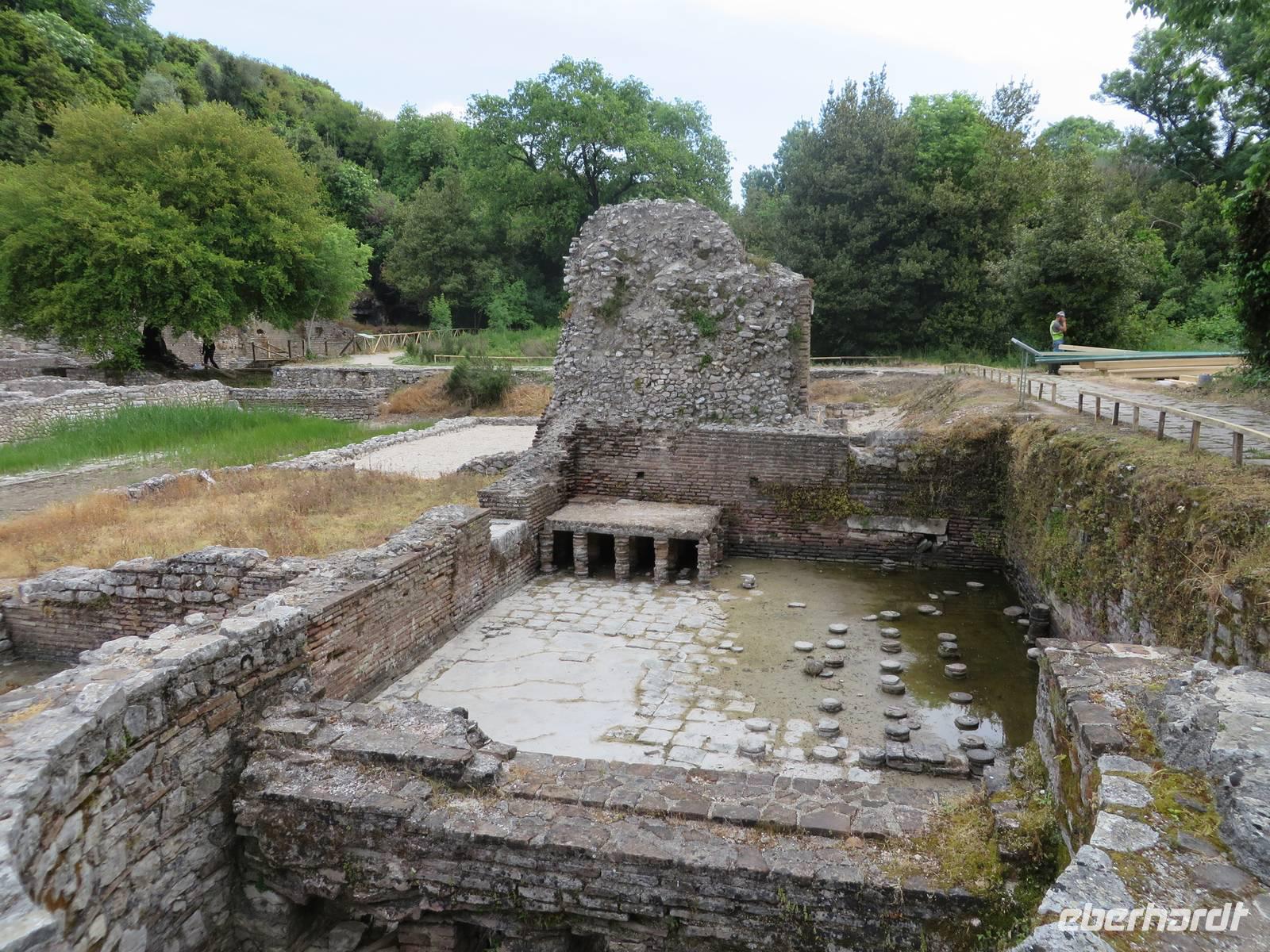 Das Frühstücksrestaurant des Hotels befindet sich in der 4. Etage. Und damit haben wir einen ausgezeichneten Blick auf das Meer. So kann der Tag beginnen. Wir fahren nach Butrint. Heute begleitet uns die örtliche Reiseleiterin Kelly. Die antike Stadt Butrint ist der wichtigste archäologische Ort in Albanien und gehört zum UNESCO Weltkulturerbe. Inmitten eines subtropischen Dschungels, der von Lorbeerbäumen beherrscht wird, befindet sich diese historische Ausgrabungsstätte. Beeindruckend ist das Theater mit 1500 Sitzplätzen, in dem heute noch jedes Jahr im September das Internationale Festival der Theatergruppen statt findet. Derzeit sind Arbeiter dabei, die Bühne zu bauen. Ihr Hämmern und Bohren begleitet die Erklärungen von Kelly, die etwas entnervt, um Ruhe bittet. Und - der albanischen Gastfreundschaft folgend - stellen die Arbeiter tatsächlich ihre Aktivitäten ein, bis wir weiter gehen. Wir kommen vorbei an der eindrucksvollen Basilika aus dem 6. Jahrhundert. Kelly legt für uns ein Mosaik frei, das ansonsten von Sand und Kies bedeckt ist. Wir kommen zum Löwentor, an dem ein Relief angebracht ist, das den Kampf eines Löwen mit einem Stier darstellt. Zum Schluss besuchen wir das Museum, in dem einige Exponate zu sehen sind, die während der Ausgrabungen gefunden wurden. Einige Skulpturen ohne Kopf und einige Köpfe ohne Rumpf (ein bisschen makaber). Als wir zum Bus kommen, verkauft dort ein Einheimischer Teigtaschen, die mit Schafskäse gefüllt sind. Nicht wenige von uns lassen sich verführen, diese Spezialität zu kosten. Lecker! Wir fahren zurück nach Saranda. Der Nachmittag steht zur freien Verfügung. Wir bummeln am Strand entlang, kaufen Souveniere und/oder kehren ein - kurz gesagt, wir lassen es uns gut gehen.