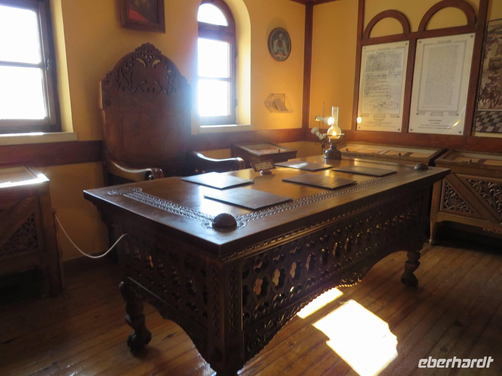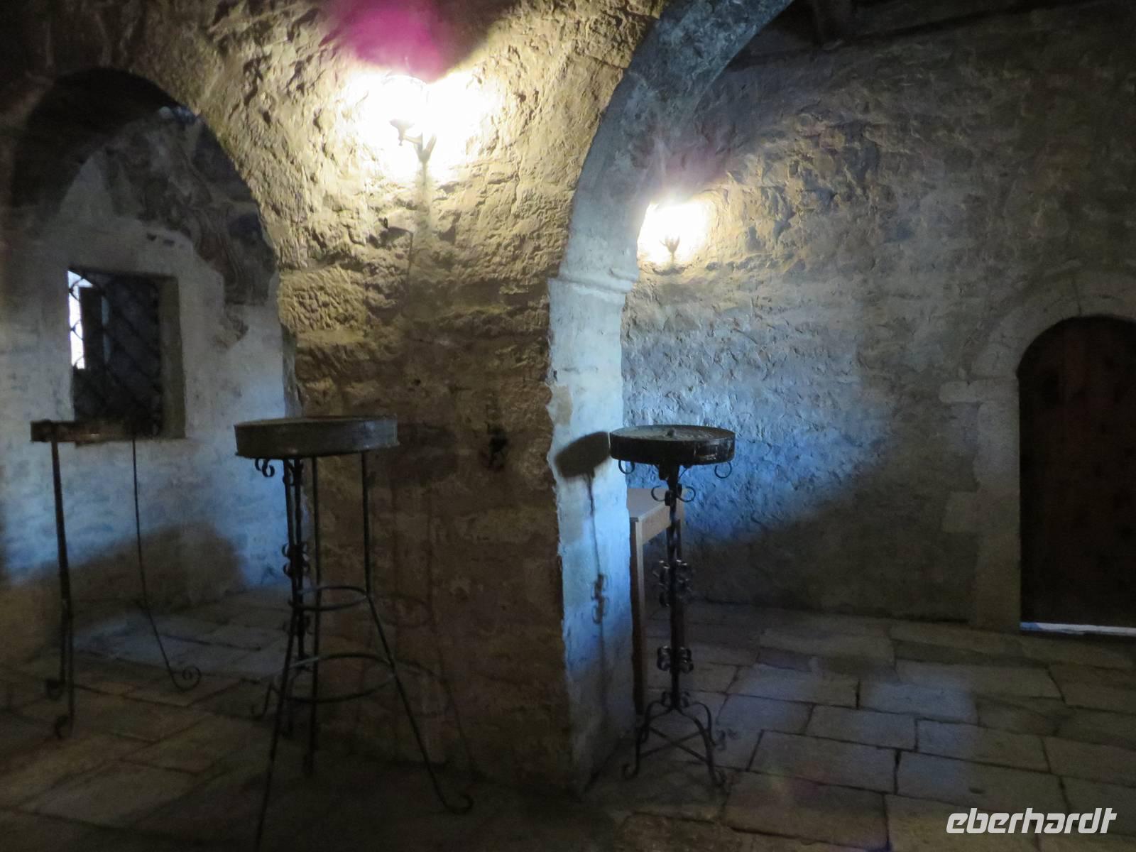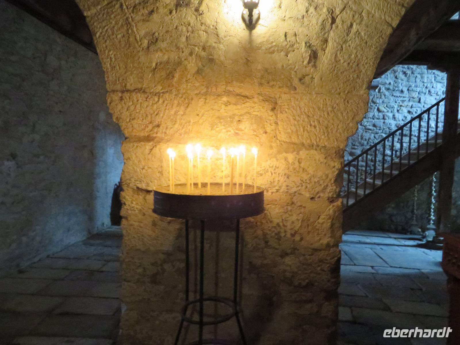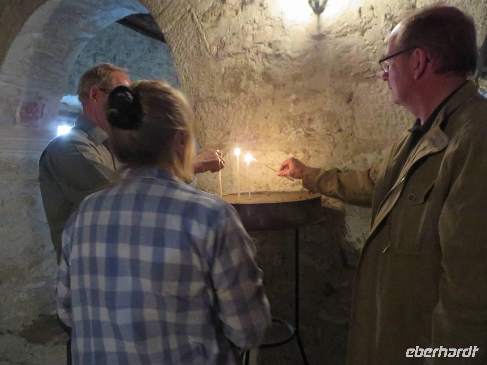 Wir starten um 9.00 Uhr mit gepackten Koffern Richtung Kloster Adrenica. Nach knapp einer Stunde haben wir unser Ziel erreicht. Unterwegs fahren wir ein kleines Stück der alten Straße, wir verstehen, warum die Albaner so stolz auf ihre neuen Straßen sind. Im Kloster erwartet uns zum ersten Mal ein etwas unfreundlicher Gastgeber. Er zieht ein mürrisches Gesicht, verbietet uns das fotografieren und will eigentlich gar nicht, dass wir das Kloster besichtigen. Koli ist unangenehm überrascht. Es dauert jedoch nicht lange und der „Wächter" beruhigt sich. Zunächst erlaubt er einzelnen Gästen zu fotografieren, dann dürfen wir sogar ins Obergeschoss. Einige Gäste zünden Kerzen an, vielleicht trägt das ja dazu bei, dass sich seine Laune bessert. Als wir aber später mit ihm ins Gespräch kommen, verstehen wir, warum er sich so verhält. Am Tag zuvor war eine Filmcrew im Kloster und hat mit viel Lärm und Rücksichtslosigkeit die Klosterruhe gestört. So benehmen wir uns nicht und er schließt uns in sein Herz. Wir bewundern die schöne Ikonostase und atmen den Hauch der Geschichte ein, der über den Klostermauern liegt. Hier soll Skanderbeg getraut worden sein. Gänsehautmoment. Wir beenden unseren Besuch und fahren weiter nach Durres. Durres ist eine der größten Städte Albaniens und hat den größten Seehafen des Landes. Wir besichtigen ein riesiges Amphitheater, das sich mitten in der Stadt befindet. Bis zu 20 000 Personen fanden hier Platz. Entdeckt wurde es 1966 zufällig, als ein Bauer seinen Garten umgrub. Es ist ziemlich verfallen, trotzdem können wir die Sitzreihen erkennen und auch die Eingänge zu den Tunneln, durch die entweder wilde Tiere oder Gladiatoren die Arena betraten. In unmittelbarer Nähe befindet sich die alte Stadtmauer mit einem gut erhaltenen Befestigungsturm. Hier ist inzwischen eine Bar eingerichtet und wir nutzen die Gelegenheit zum Kaffeetrinken. Unser nächstes Ziel ist Kruja. Alle sind schon ganz neugierig auf den alten Basar. Wir nehmen uns die Zeit zum Bummeln und zum Souveniere kaufen. Anschließend besuchen wir das Ethnografische Museum. Es befindet sich in einem typisch albanischen Wohnhaus, das 1764 erbaut wurde. Im Erdgeschoss sind Räume zu besichtigen, in denen Haustiere, Zisternen, Vorräte und Gerätschaften untergebracht waren. In den oberen Stockwerken sehen wir die Wohnräume der Familie und viele Gegenstände aus dem Alltagsleben - Küchengeräte, Musikinstrumente und Waffen. Noch tiefer tauchen wir in die Geschichte ein, als wir das Skanderbeg-Museum besuchen, das sich ebenfalls hier befindet. Am Eingang erwartet uns eine riesige Skulptur des großen Skanderbegs und seiner Gefährten. In den einzelnen Räumen wird der heldenhafte Kampf von Skanderbeg gegen die Türken in verschiedenen Gemälden und Wandmalereien dargestellt. Sein Schwert und seinen Helm können wir in Nachbildungen betrachten. Spannend ist auch die Geschichte, warum ein Ziegenkopf den Helm Skanderbegs ziert (Reiseführer - Trescher Verlag S. 156). Am besten ist aber der Museumsführer, der die ganze Zeit ein sympathisches verschmitztes Lächeln auf den Lippen hat. Wir fühlen uns hier sehr willkommen. Nach diesem spannenden Tag fahren wir in unser Hotel. Es liegt direkt am Strand von Durres und so kommen wir noch in den Genuss, Meeresluft zu schnuppern. Das Abendessen gibt es heute in Buffetform, wir haben die Auswahl zwischen vielen kalten und warmen Vorspeisen, Huhn und Fisch, Kartoffeln und Nudeln und Nachtisch. Das erste Getränk des Abends spendiert unser Reiseveranstalter Eberhardt TRAVEL. Wir stoßen auf eine gelungene Reise an.