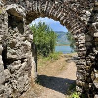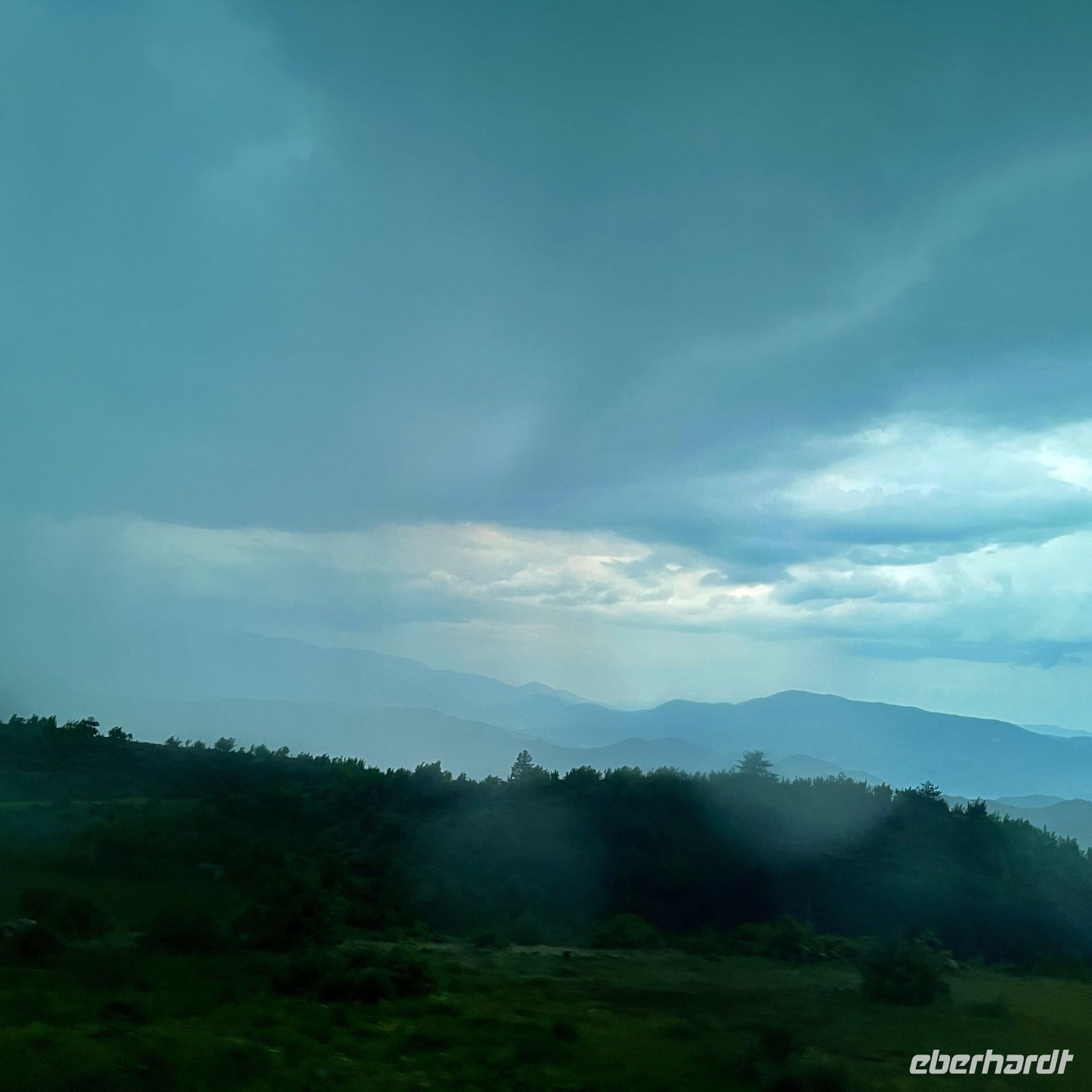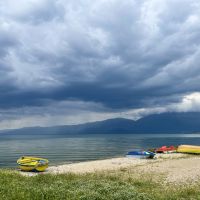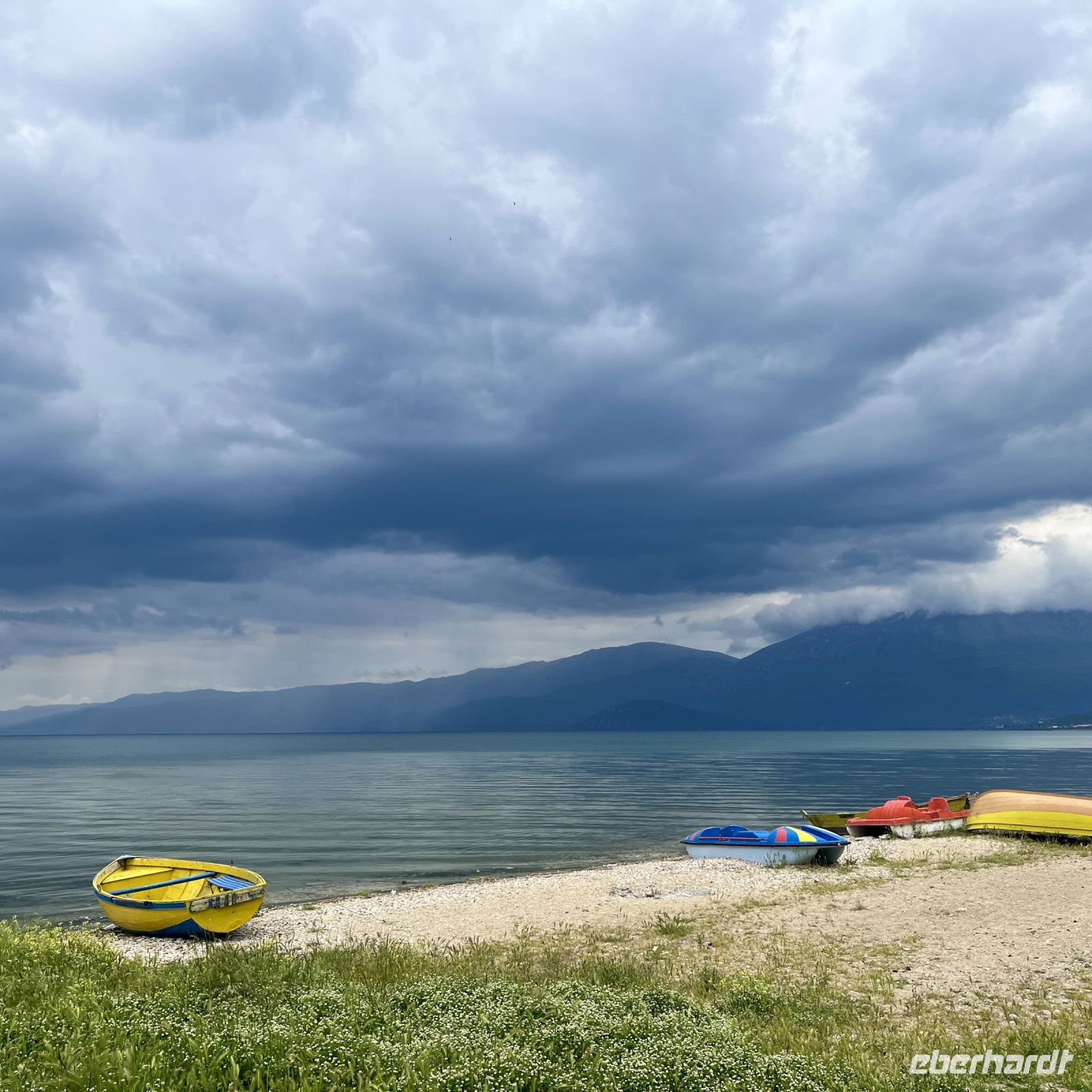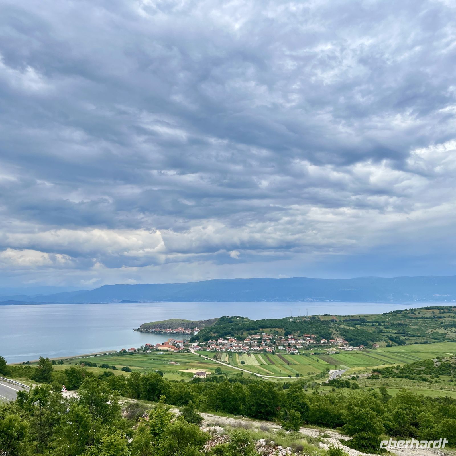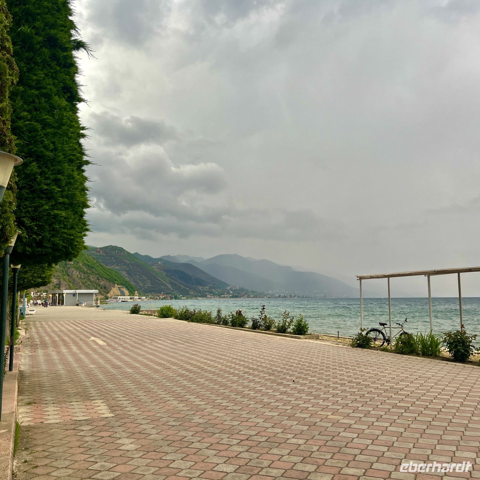 Der zweite Tag sollte den Ton für die folgenden Tage angeben, an denen es immer viel Interessantes zu sehen und zu besichtigen gab. Zunächst ging es an einem warmen und hellen Tag in Richtung Norden zum Schloss Kruje, das auf einer Anhöhe liegt und einen guten Blick sowohl auf das Tal als auch auf die dahinter liegenden größeren Berge bietet. Nach dem Besuch des gut gegliederten Museums zu Ehren des Nationalhelden machten wir einen kurzen Spaziergang durch den Basar. Wir setzten unsere Reise in Richtung Süden fort und allmählich veränderte sich zunächst die Landschaft als auch das Klima, um am Ende einen abrupten Wechsel zu vollziehen. In kurzer Zeit wechselten wir von Landschaften mit bräunlichen Farbtönen und starker Sonne zu mehr grünem, hügeligem Gelände und dann endete alles mit einem heftigen Regen mit Blitz und Donner. Bei etwas weniger sintflutartigem Regen erreichten wir Elbasan, das wir kurz aus dem Fenster sahen. Nach einigen landschaftlich sehr reizvollen Pausen und glücklicherweise ohne Regen kamen wir rechtzeitig in unserem Hotel am Seeufer in Progradec an, um den Sonnenuntergang zu beobachten, bei dem die Farben des Himmels und des Sees ein wunderschönes Schauspiel boten, mit dem wir uns von diesem Tag verabschiedeten. Aber es blieb noch ein Teil des Plans übrig, denn später fuhren wir mit dem Bus zum Abendessen, das nur wenige Minuten entfernt war, und hatten die Gelegenheit, ein wenig mehr von dem Ort zu entdecken.