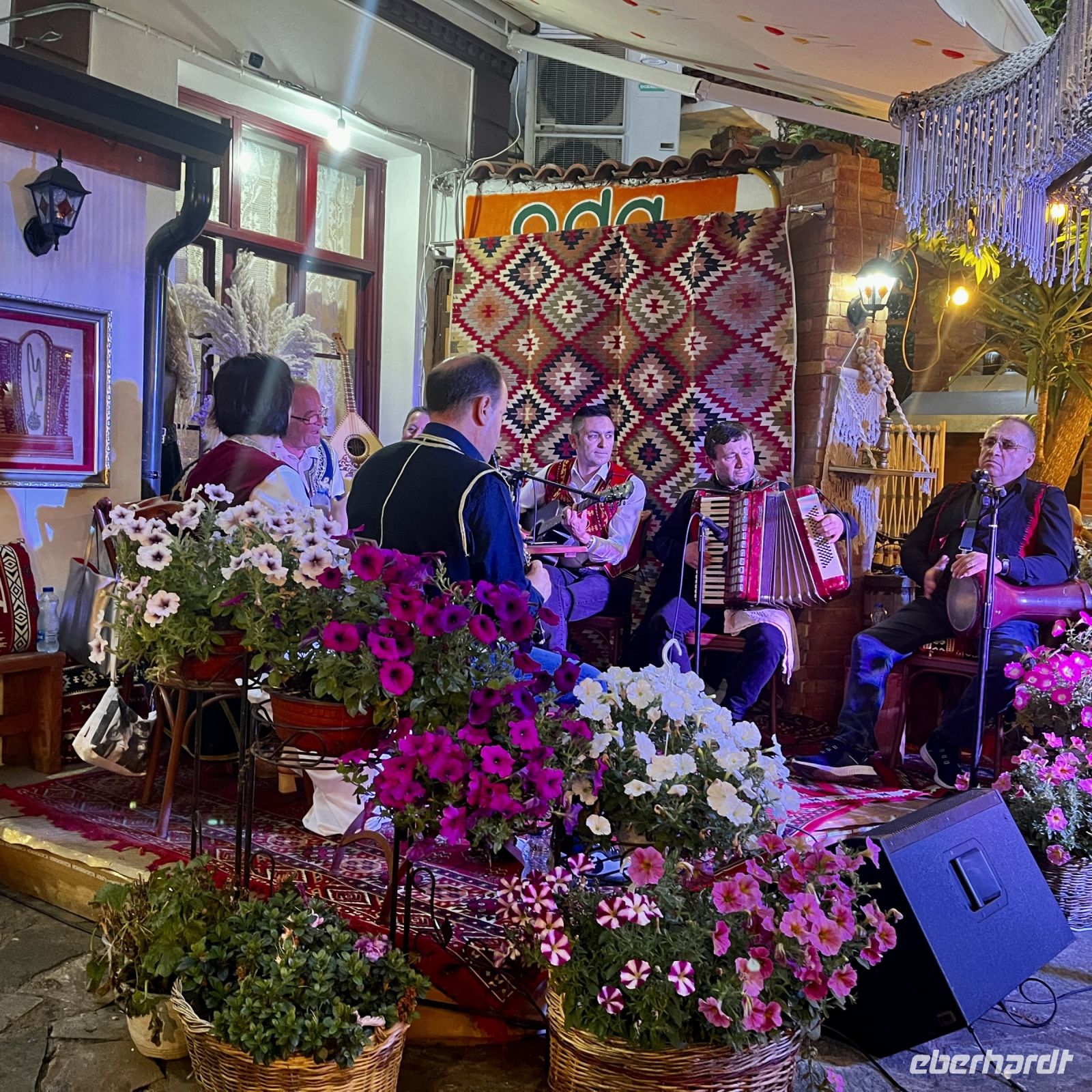 Eins, zwei, drei, los!... nun, es ist schwer zu beschreiben, wie die dreistimmige Darbietung des Geburtstagsliedes in Albanisch ohne Instrumentalbegleitung, nur mit Hilfe des Busmikrofons, ablief. Aber ich bitte Sie, mir Ihr Vertrauen auszusprechen, denn aus meiner Sicht und der des anwesenden Publikums war es sehr gut. So begannen wir unter Gelächter unsere Reise, und obwohl es ein Ziel gab, war unser Ziel für diesen Moment nur die Straße. Dort konzentrierten wir uns darauf, die Reise inmitten wunderschöner Landschaften unter einer herrlichen Sonne zu genießen. Manchmal passierten wir einen wunderschönen Fluss mit türkisfarbenem Wasser, an dem wir eine Pause einlegten, um seine Schönheit ein wenig langsamer zu genießen. Und so kamen wir, fast ohne es zu merken, am Fuße von Girokastër an, einem hübschen, in die Berge eingebetteten Dorf, dessen Krone seine Burg ist. Genau dorthin fuhren wir immer weiter bergauf. Die Burg war interessant, die Aussicht atemberaubend und auch die Relikte des Kalten Krieges erregten unsere Aufmerksamkeit. Nach der Besichtigung erkundeten wir noch ein wenig das Dorf, seine Straßen und das Museum und stärkten uns für das Abendessen. Und hier, an diesem Punkt, begann unser Abenteuer interessanter zu werden. Das Abendessen mit einem herrlichen Blick auf den Sonnenuntergang wurde von einem gefühlvollen und schönen traditionellen einstimmigen Lied a Capela begleitet, das ein Meister des typischen regionalen Gesangs vortrug. Unbegleitet zeigt das Lied erst seine große Schönheit und die Tugend desjenigen, der es interpretieren darf.