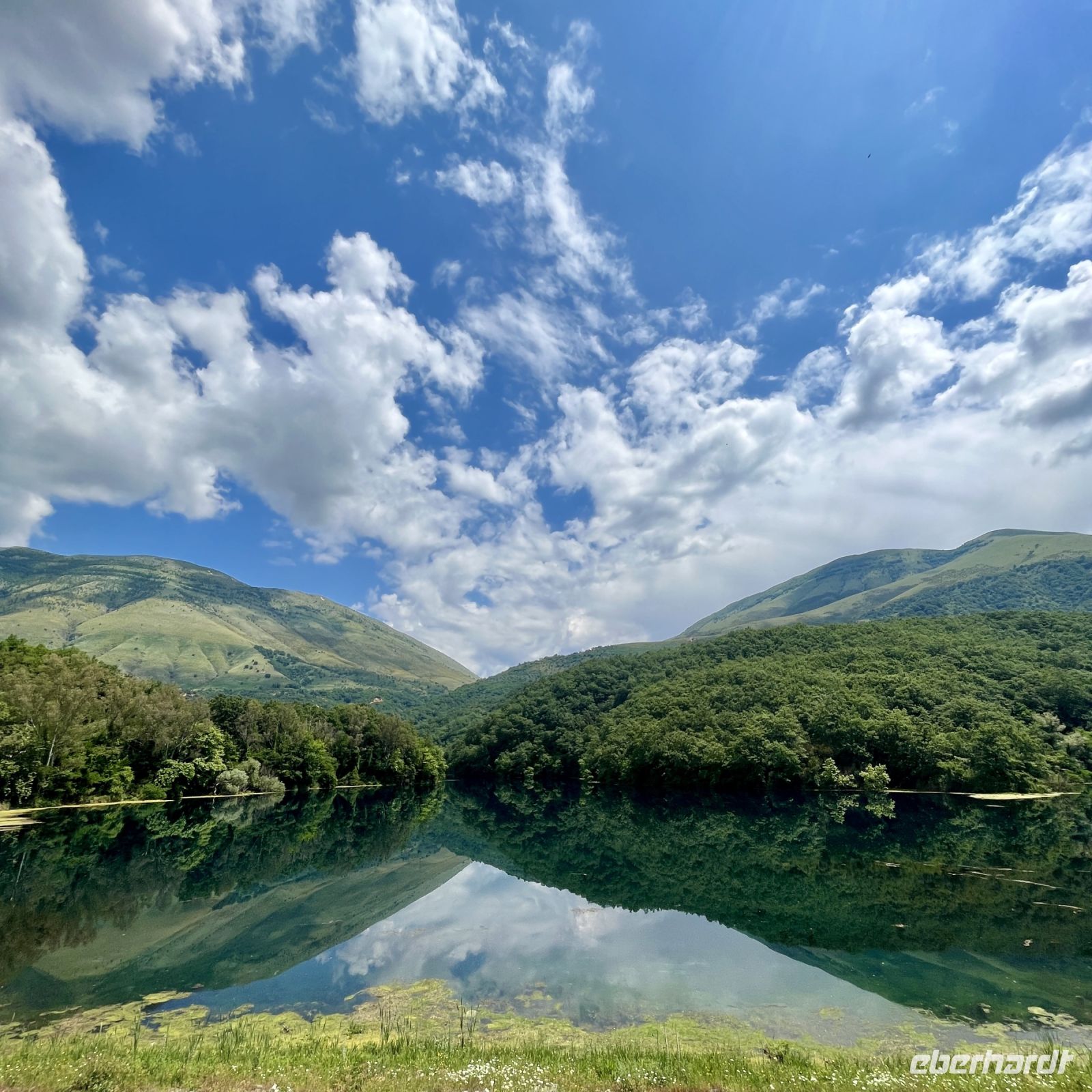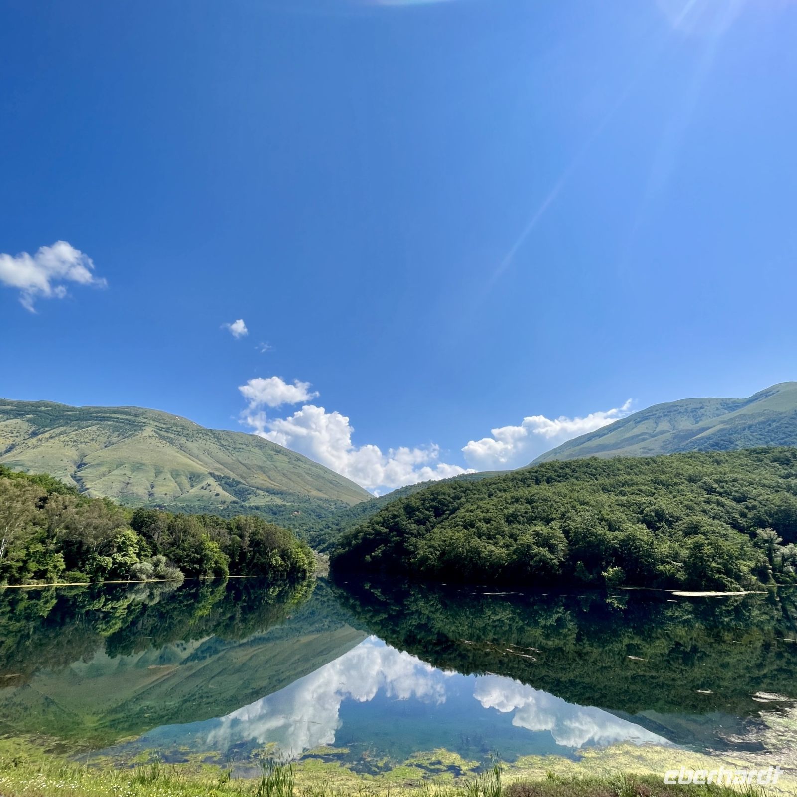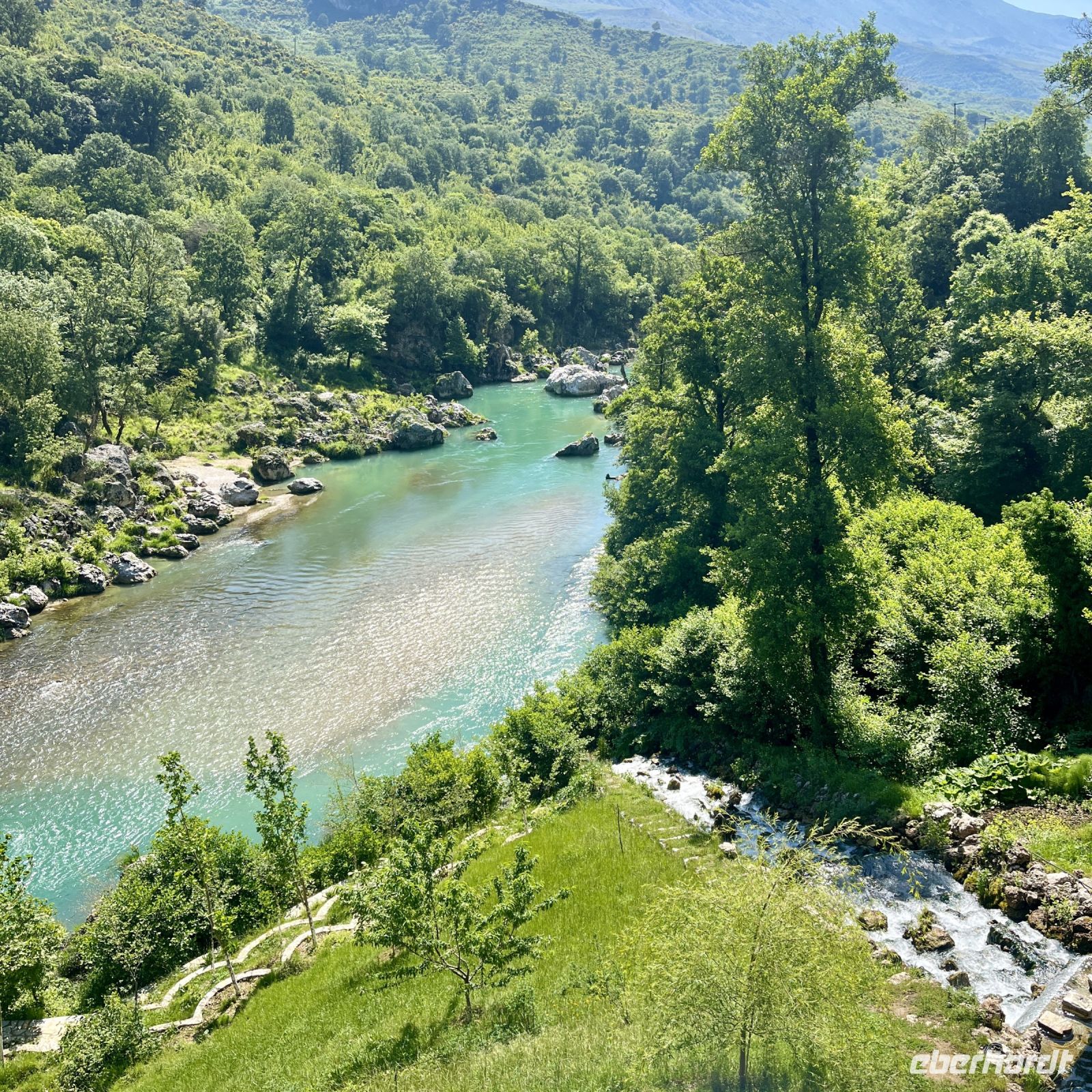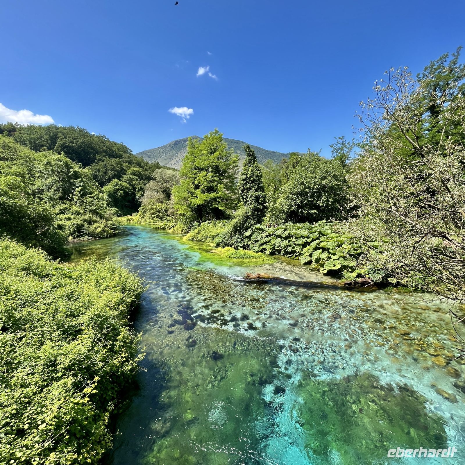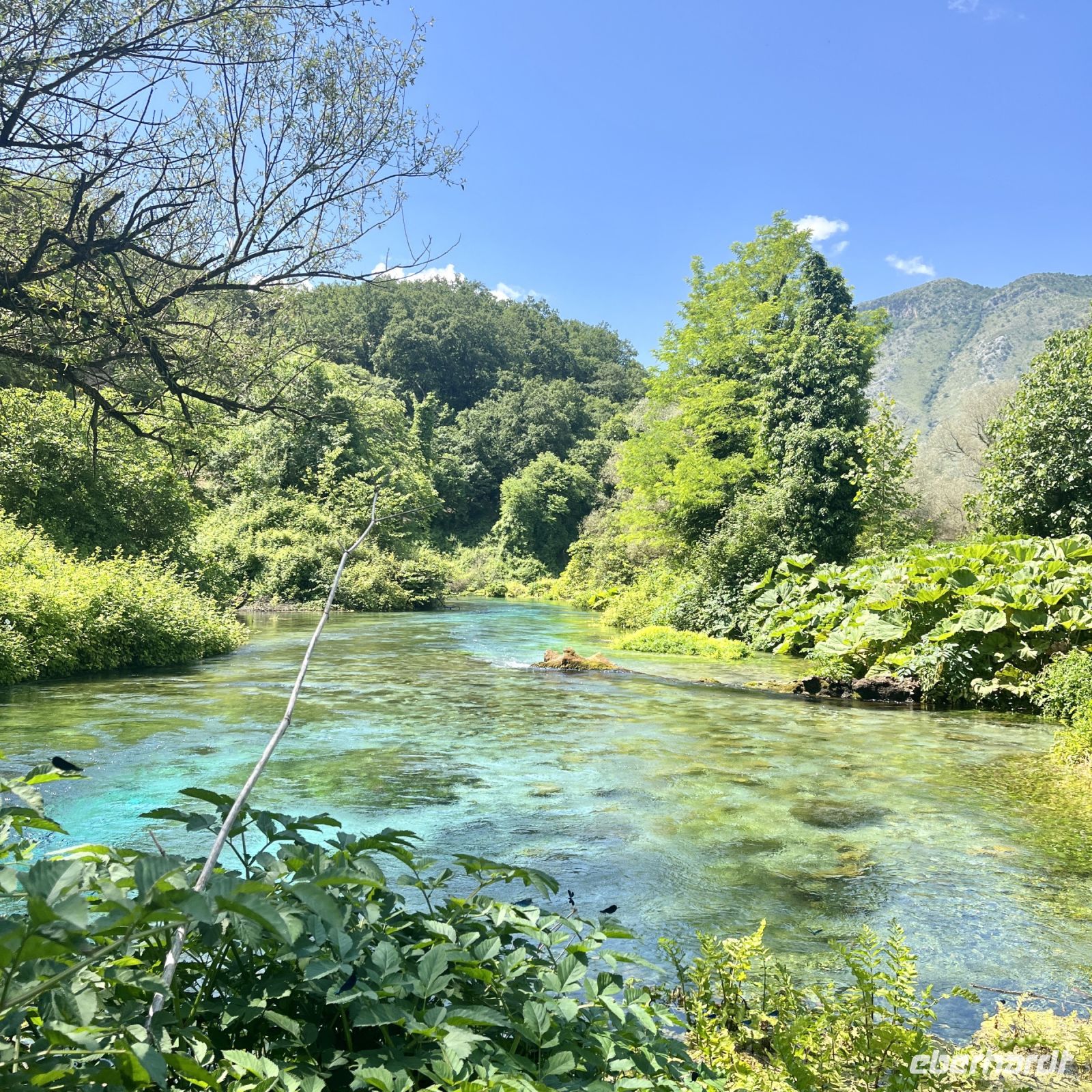 War der letzte Tag sehr energiegeladen, so zeichnete sich dieser neue Tag durch seine Landschaften aus, von denen jede einzelne einer Postkarte würdig war. Obwohl ich der Meinung bin, dass es kein gutes oder schlechtes Wetter gibt, hatten wir dieses Mal einen schönen sonnigen Tag, perfekt für unseren ersten Halt am "Blauen Auge". Dieser Ort hätte keinen anderen Namen haben können, denn in der Tat hat der Fluss kristallklares Wasser in verschiedenen Türkistönen. Seine Schönheit beeindruckte, in seinem Wasser spiegelten sich die Berge und der Himmel perfekt wider. In seinen schnellsten Abschnitten fließt das Wasser schnell und mit einem friedlichen Murmeln. Und wie könnten wir seine Quelle vergessen, die uns immer wieder einlud, kopfüber in dieses kristallklare Wasser einzutauchen. Der starke Sonnenschein intensivierte alle Farben dieser Naturlandschaft.