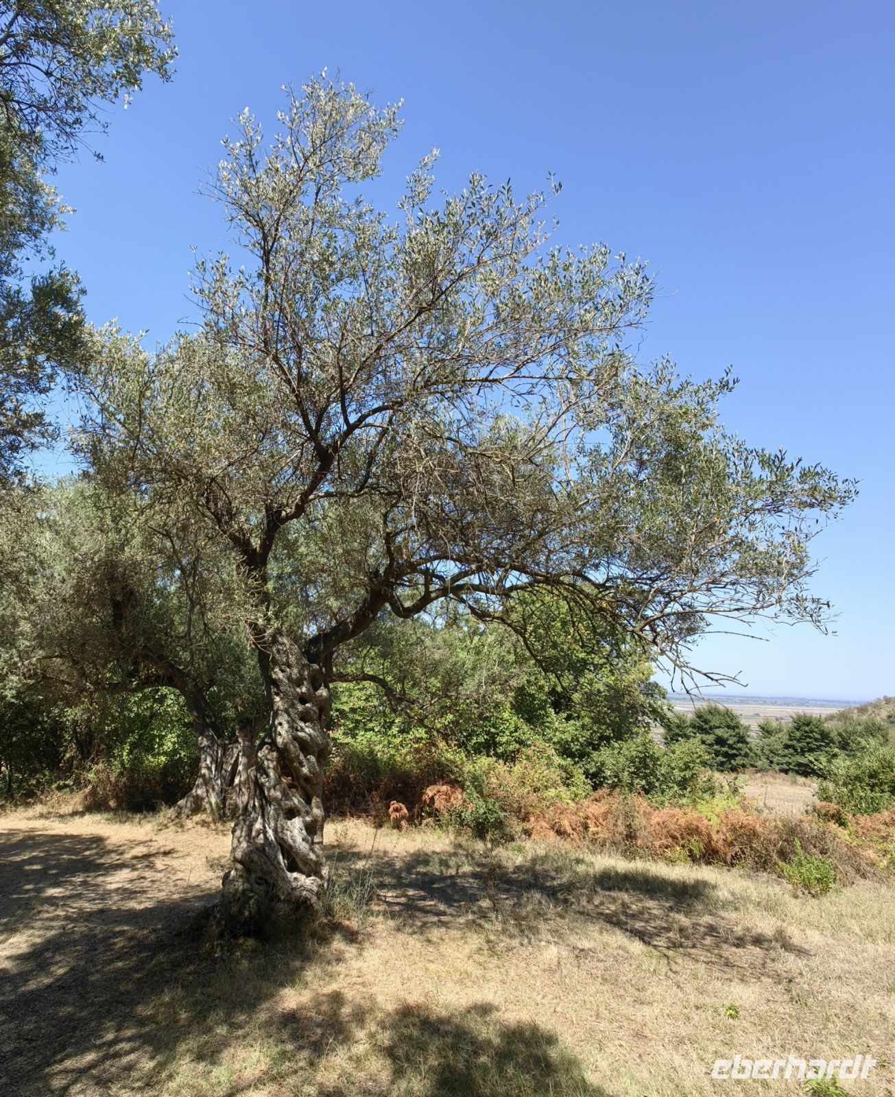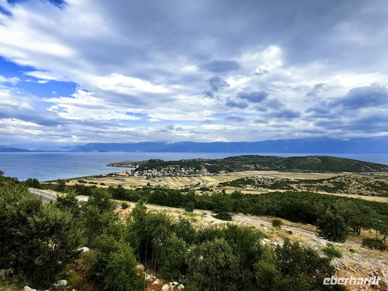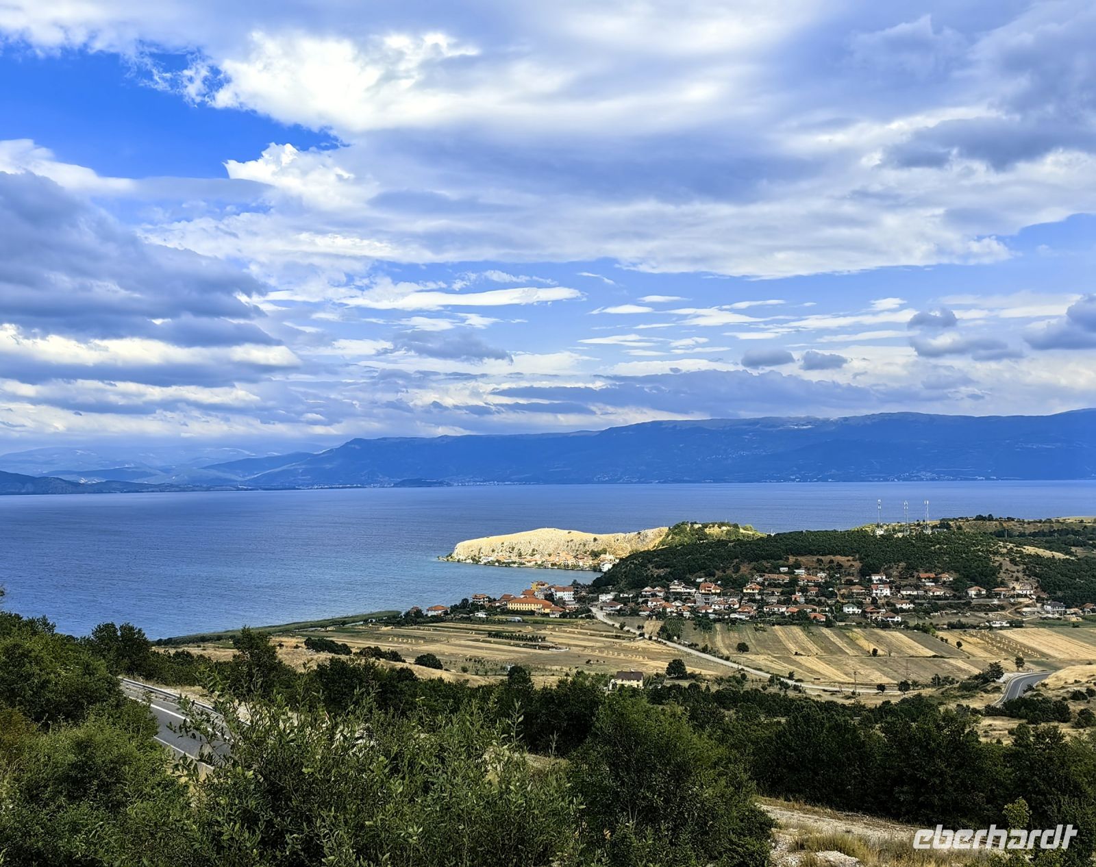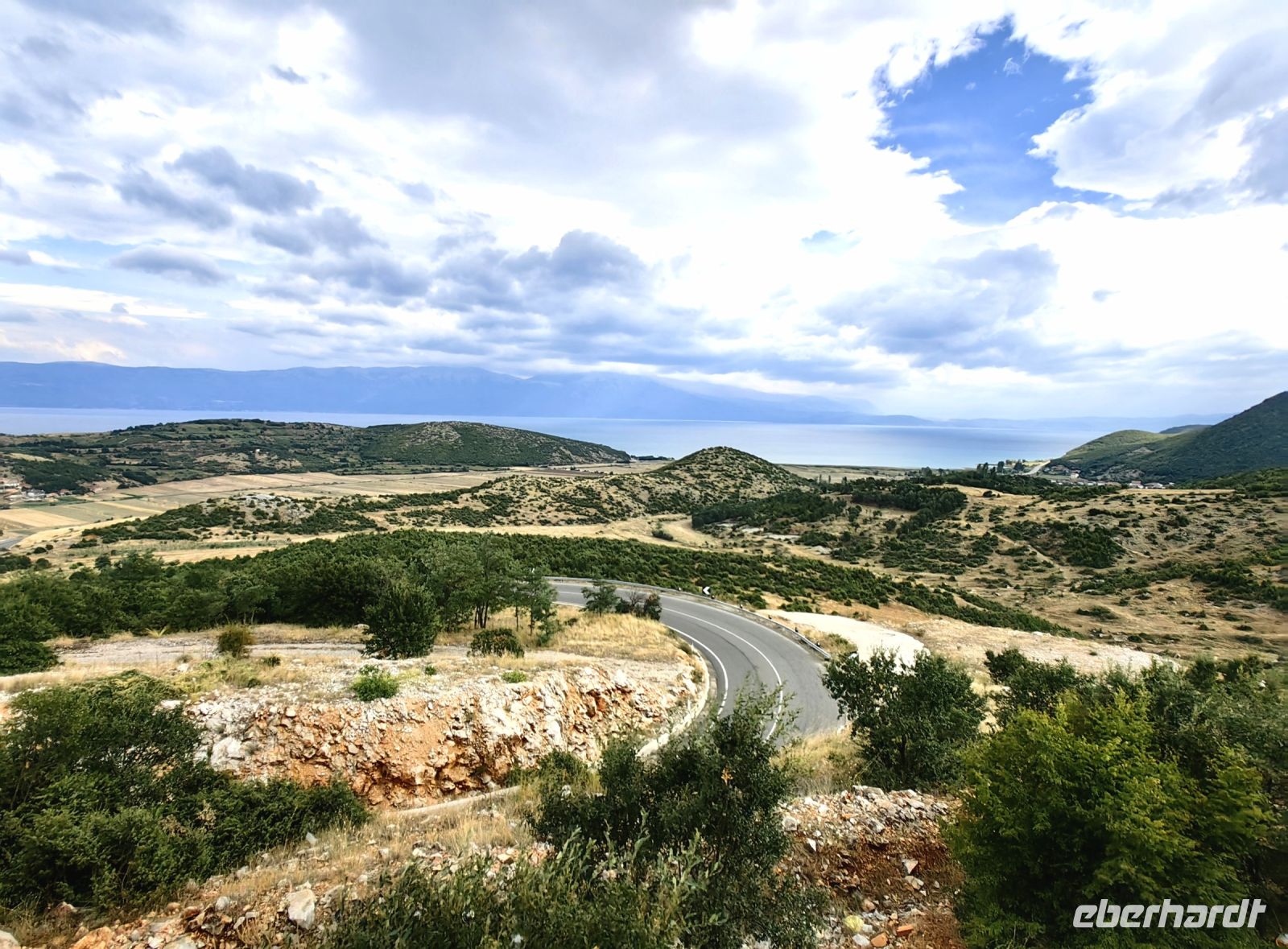 Nach dieser Pause führt uns unser Weg steil hinauf zum Qafe Thana, dem Kornelkirschenpass, einem Gebirgspass der direkt zum Ohridsee und zur Stadt Pogradec führt. Die Landschaft ist atemberaubend, üppig grüne Täler, in denen Oliven, Wein und Khaki wachsen, wechseln sich ab mit schroffen Bergen und hinter dem Paß sehen wir ihn: den strahlend blauen Ohridsee.