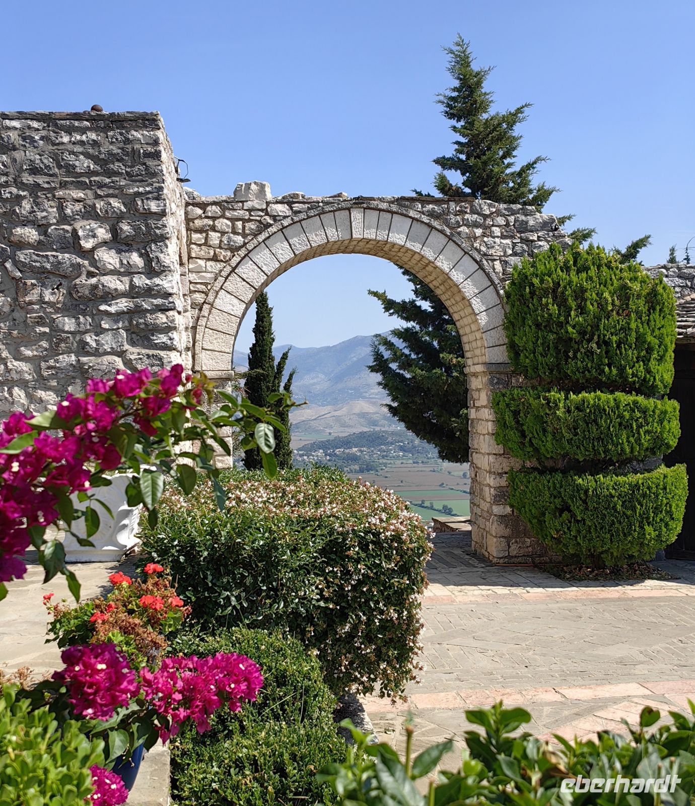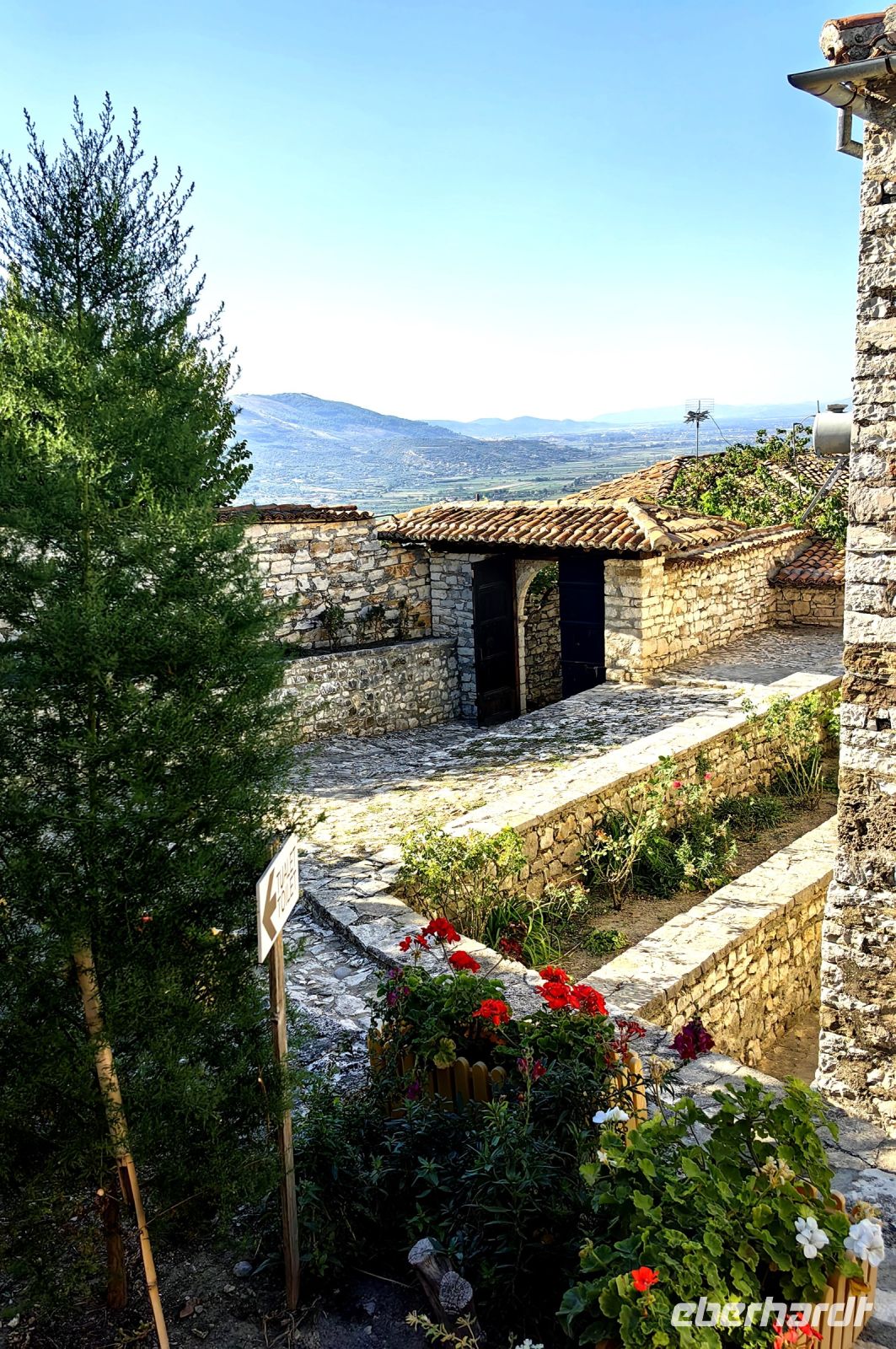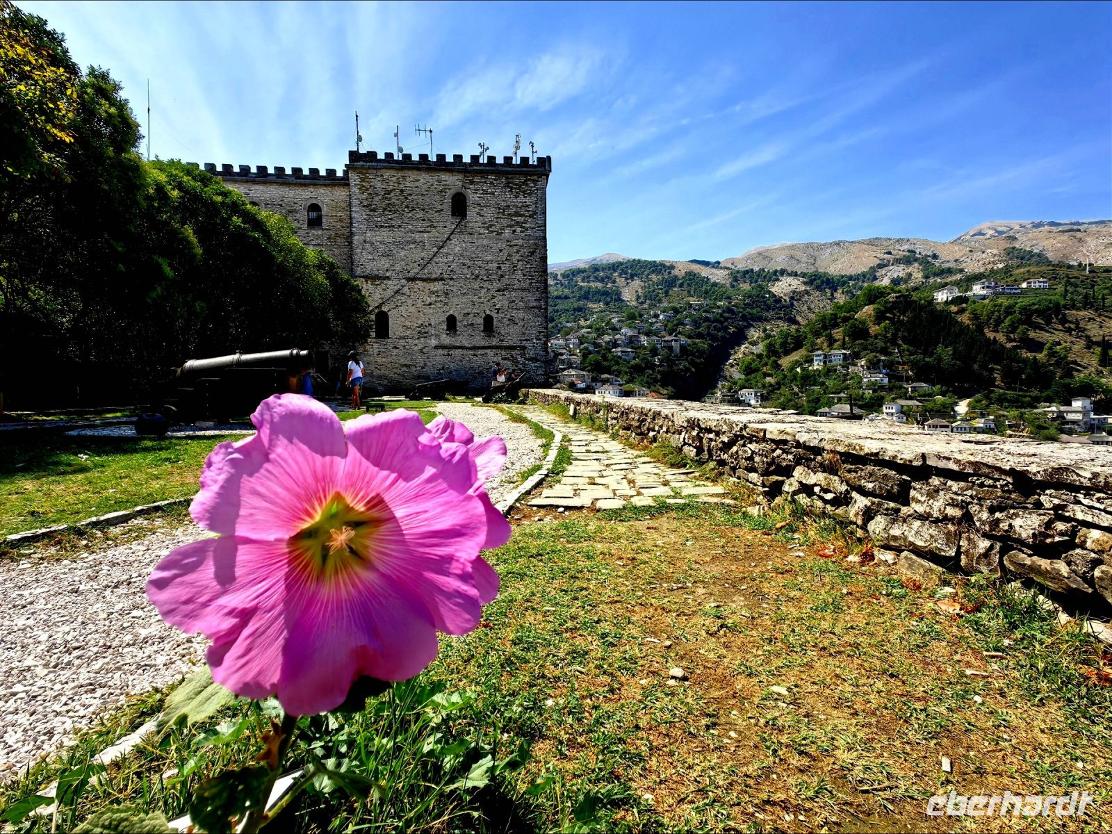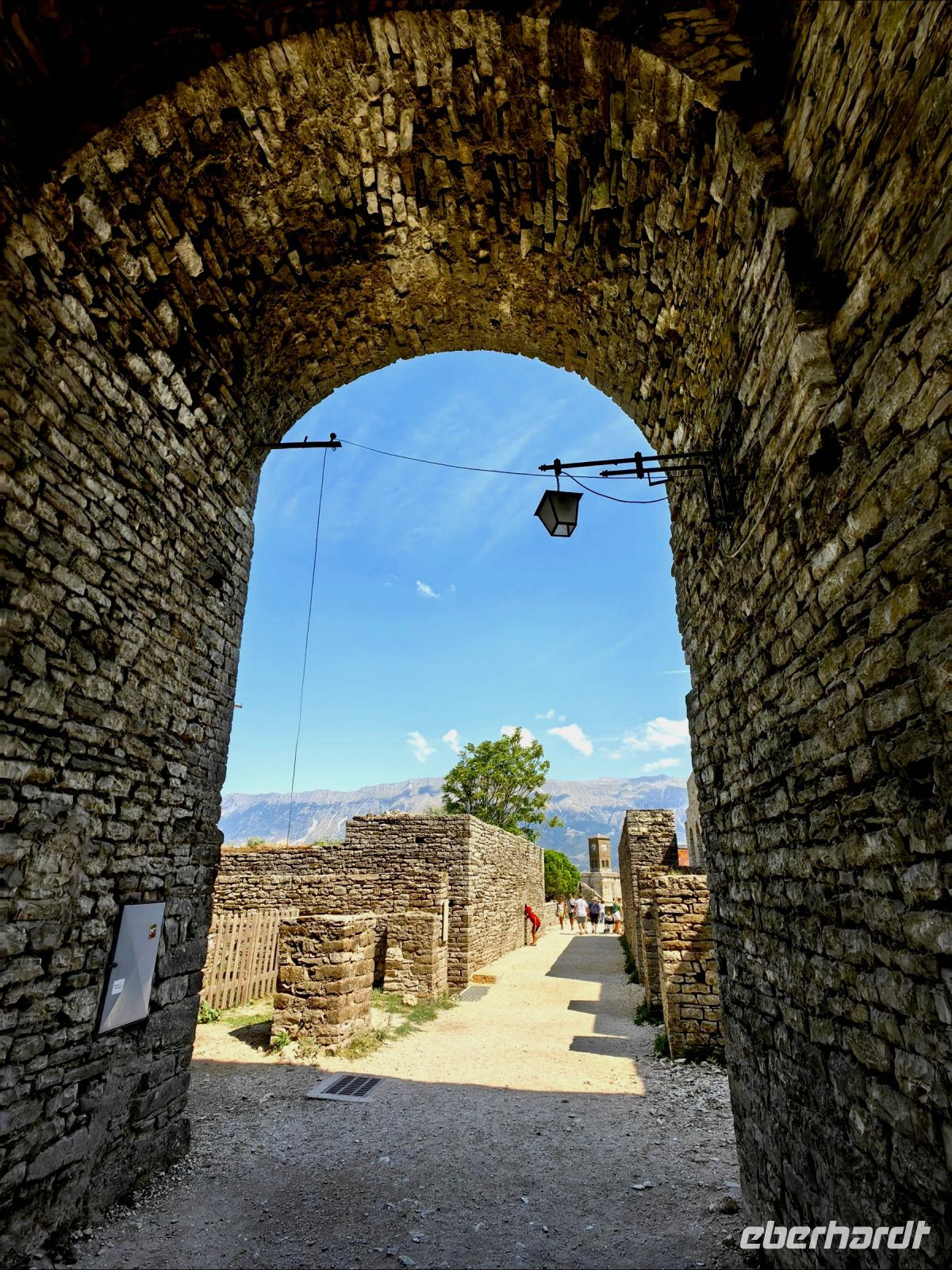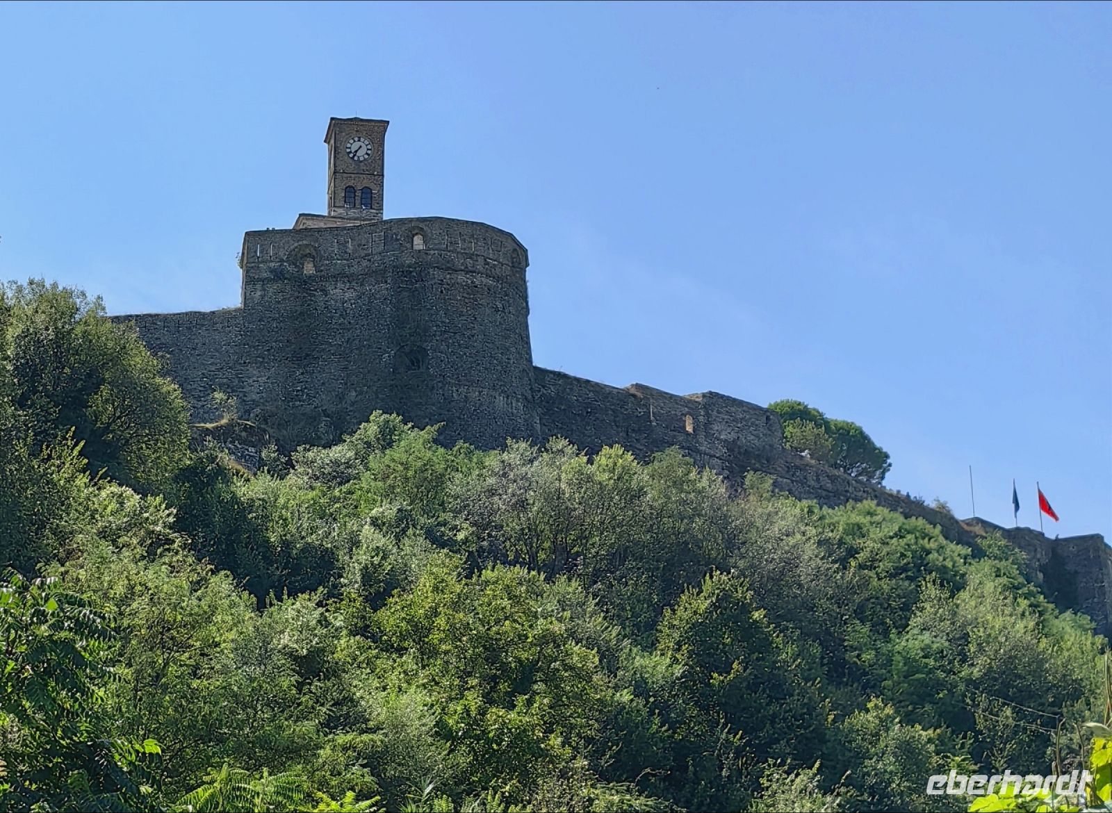 Oben auf dem Bergplateau thront die Burg von Gjirokastra. Einst war sie eine illyrische Festung, die Anfang des 3. Jahrhunderts vor Christus errichtet wurde, unter byzantinischer und osmanischer Herrschaftszeit baute man sie weiter und weiter aus. Heute präsentiert sie sich als eine beeindruckende Verteidigungsfestung mit einem atemberaubenden Panoramablick über die Stadt, das Tal des Drinosflusses und die umliegenden Bergriesen. Im Inneren der massiven Burgmauern sehen wir schwere Waffen und Kanonen, die vom Unabhängigkeitskampf Albaniens zeugen. Mit seinem Roman "Chronik in Stein" setzte Ismail Kadere der Burg und dem Ort ein Denkmal.