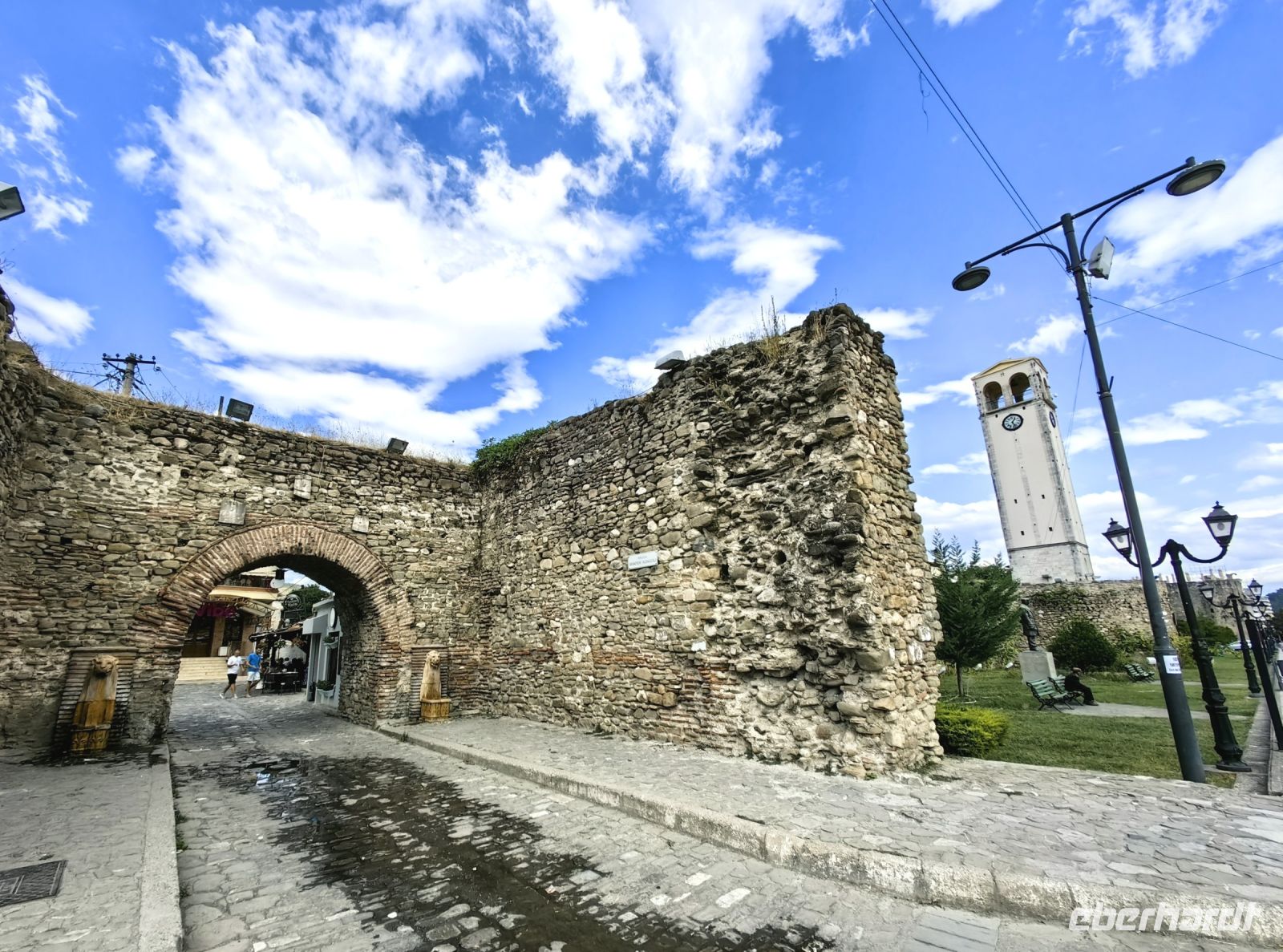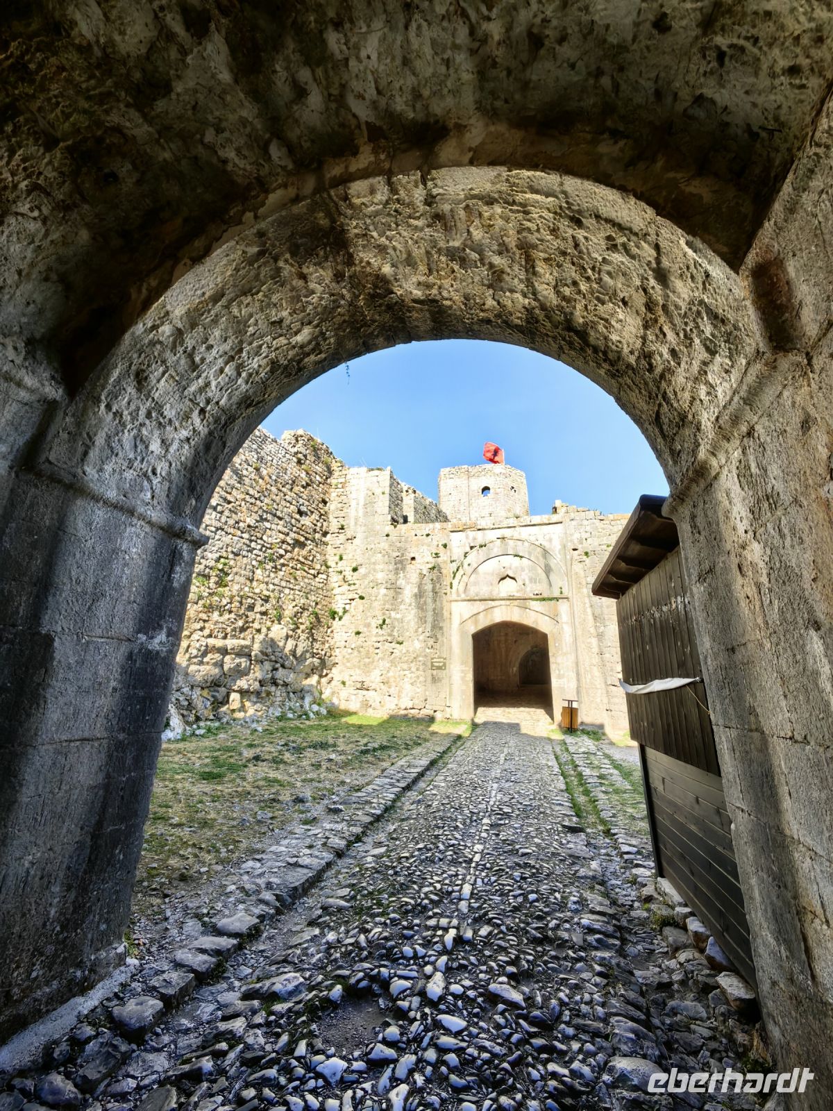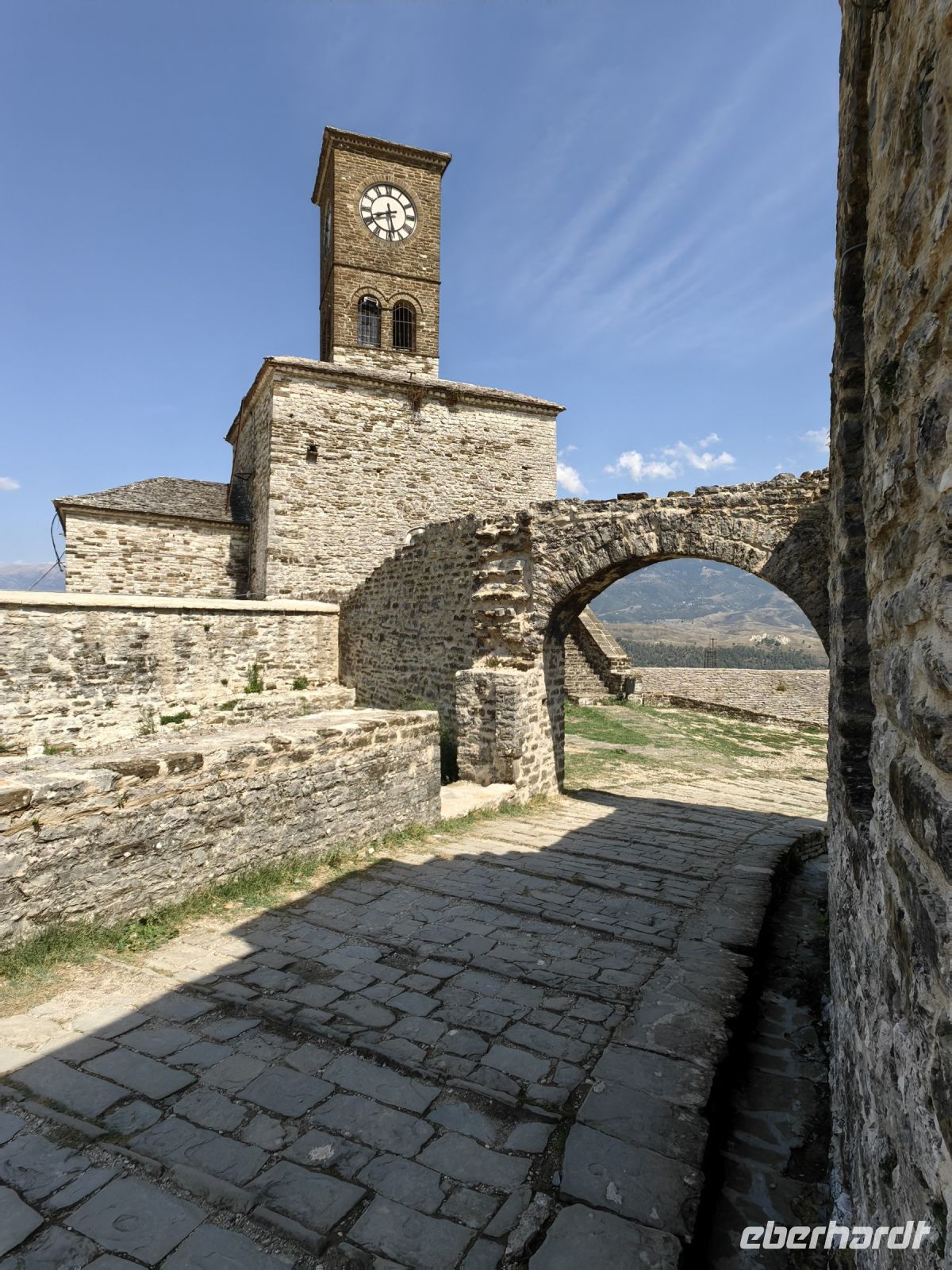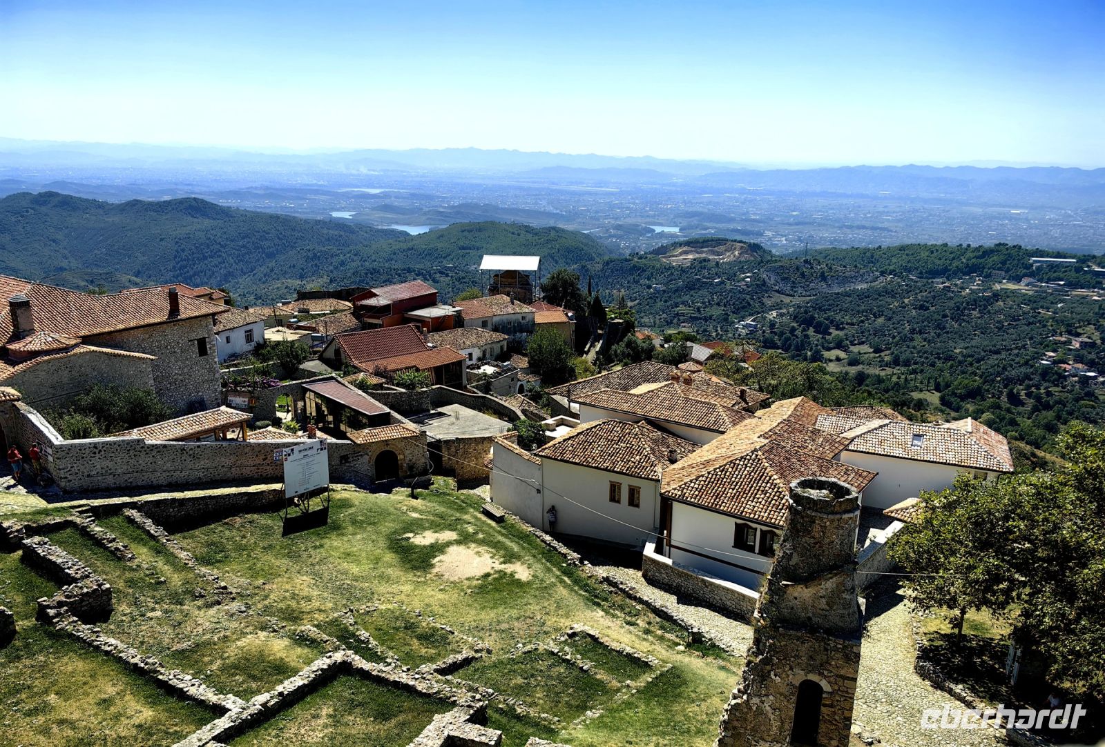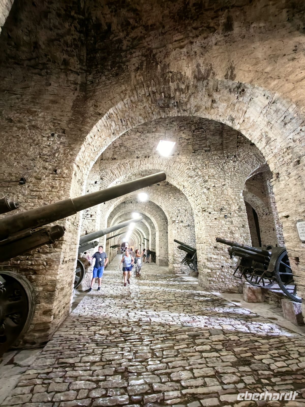 Oben auf dem Bergplateau thront die Burg von Gjirokastra. Einst war sie eine illyrische Festung, die Anfang des 3. Jahrhunderts vor Christus errichtet wurde, unter byzantinischer und osmanischer Herrschaftszeit baute man sie weiter und weiter aus. Heute präsentiert sie sich als eine beeindruckende Verteidigungsfestung mit einem atemberaubenden Panoramablick über die Stadt, das Tal des Drinosflusses und die umliegenden Bergriesen. Im Inneren der massiven Burgmauern sehen wir schwere Waffen und Kanonen, die vom Unabhängigkeitskampf Albaniens zeugen. Mit seinem Roman "Chronik in Stein" setzte Ismail Kadere der Burg und dem Ort ein Denkmal.