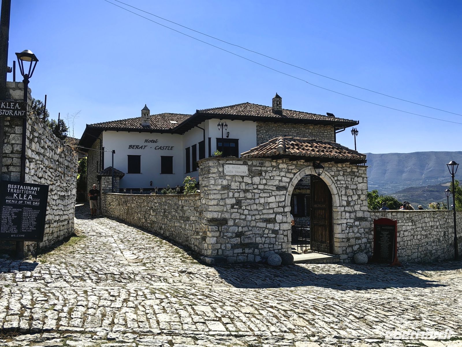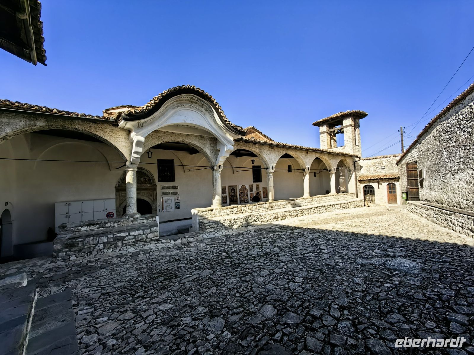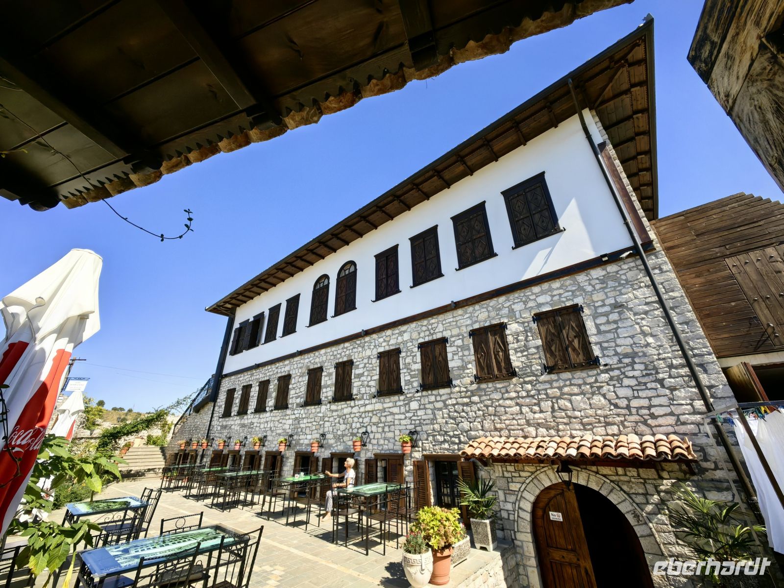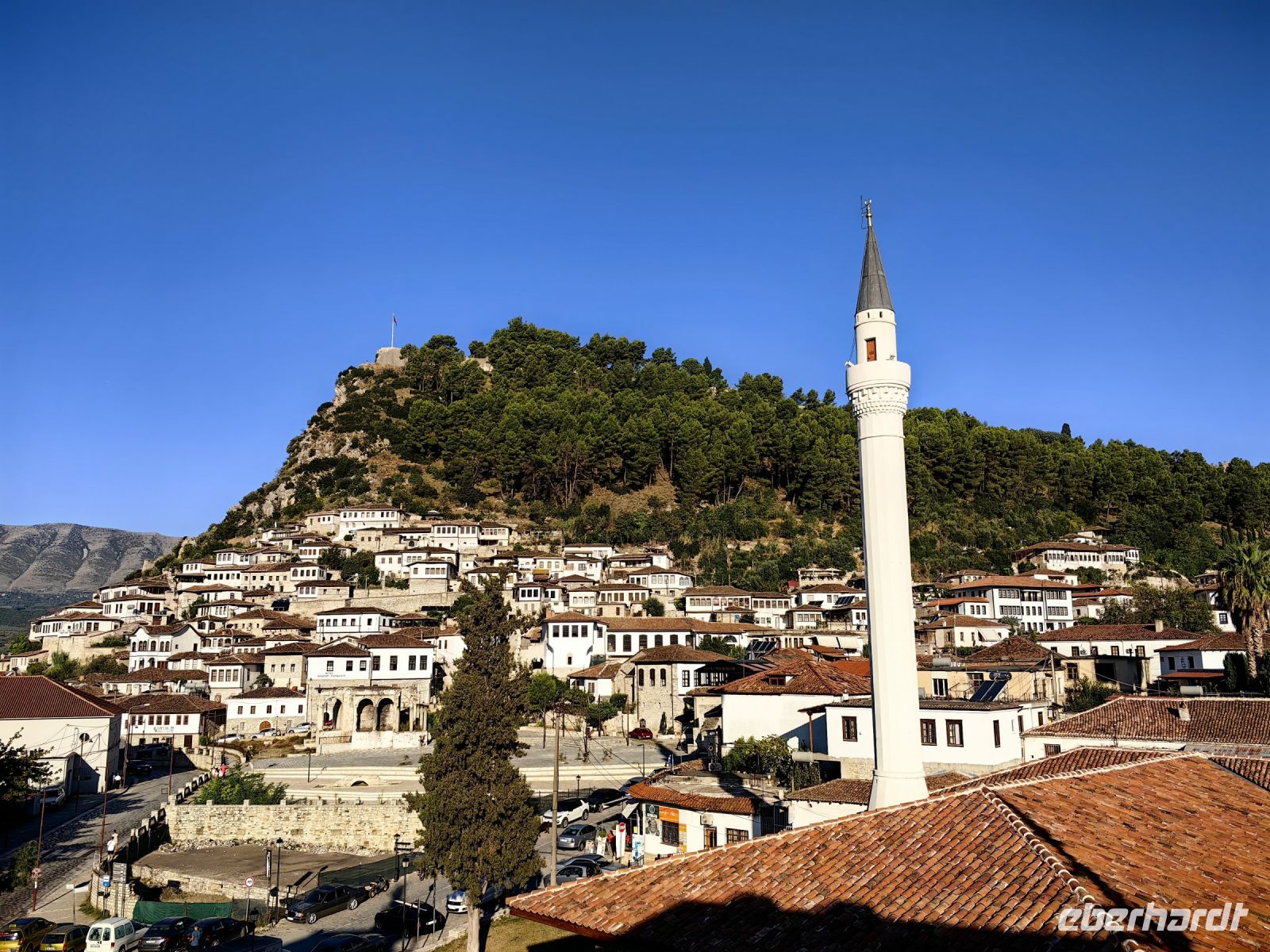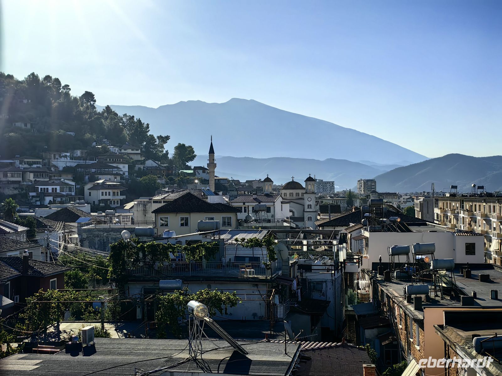 Nach dem Museumsbesuch kraxeln wir die steile und steinige Straße wieder hinab und laufen zu unserem Hotel mitten im Zentrum. Interessanterweise liegt auf der einen Flußseite des Osum der muslimische Teil der Stadt auf der anderen der christliche. Mehrere Brücken verbinden die beiden Stadtteile und unweit unseres Hotels steht sogar eine Moschee direkt neben der Kirche.