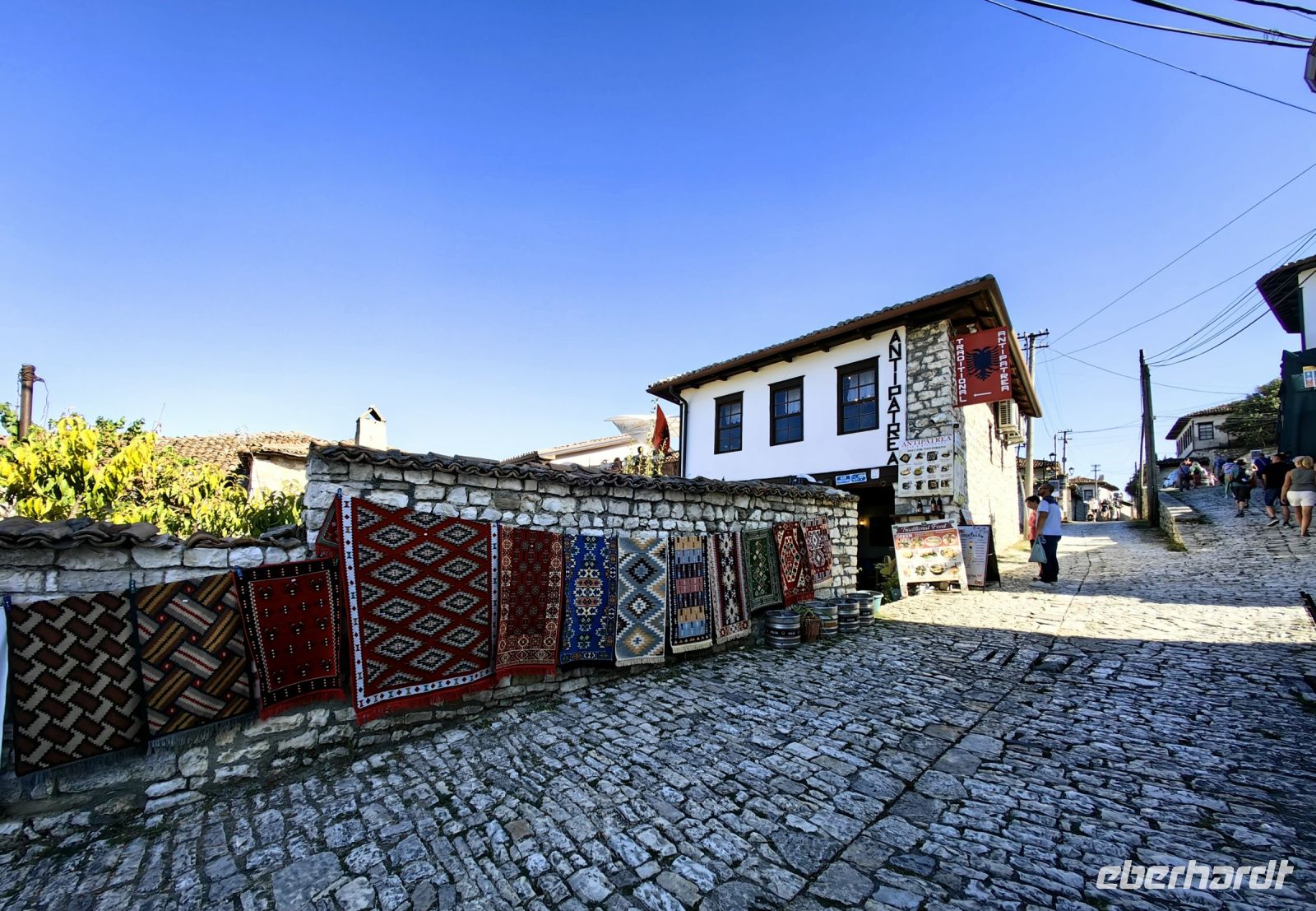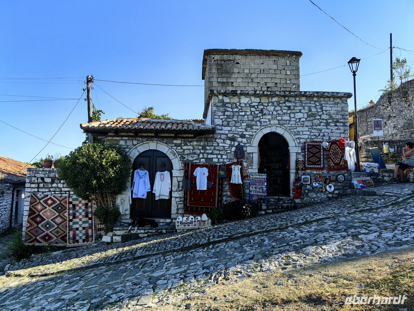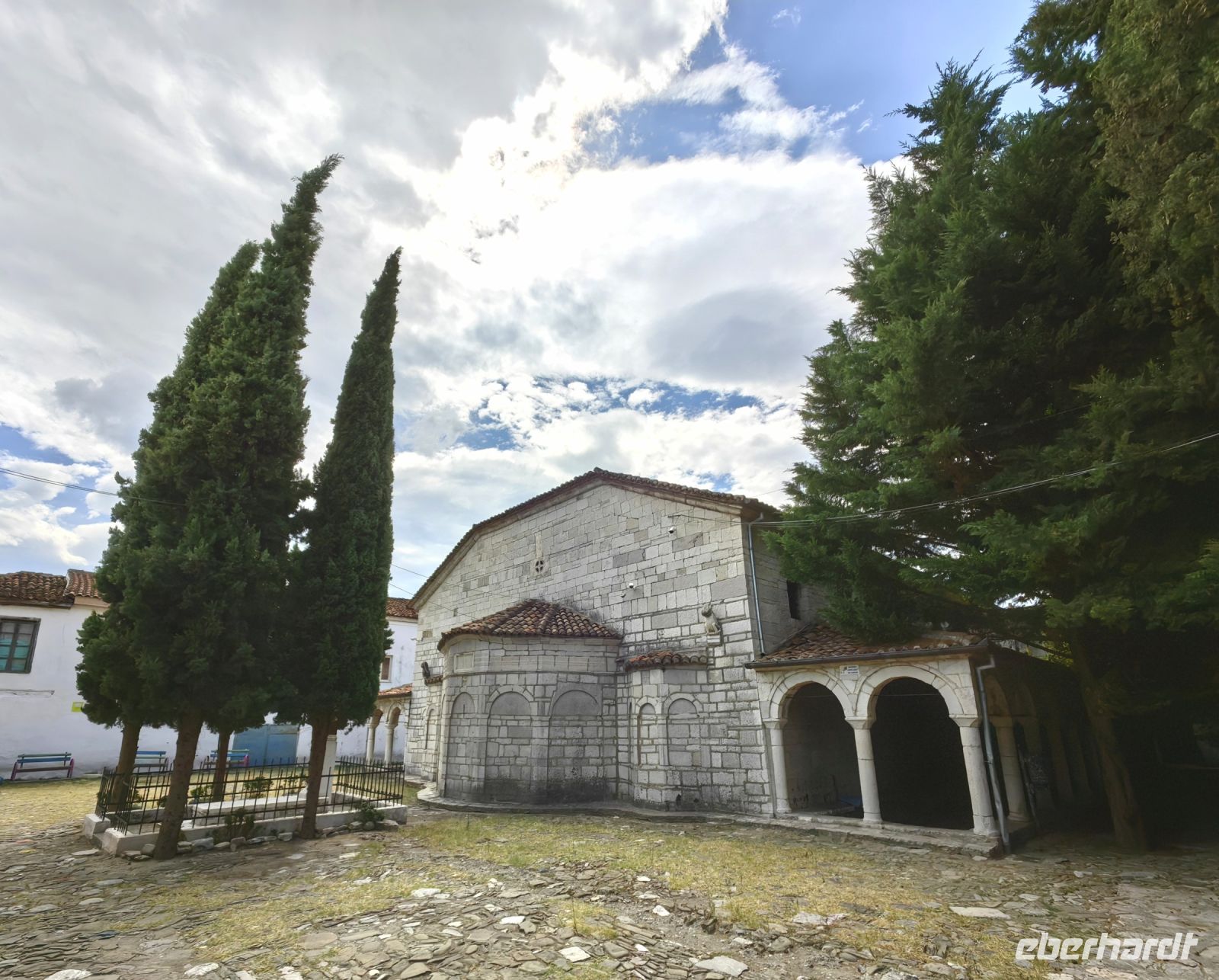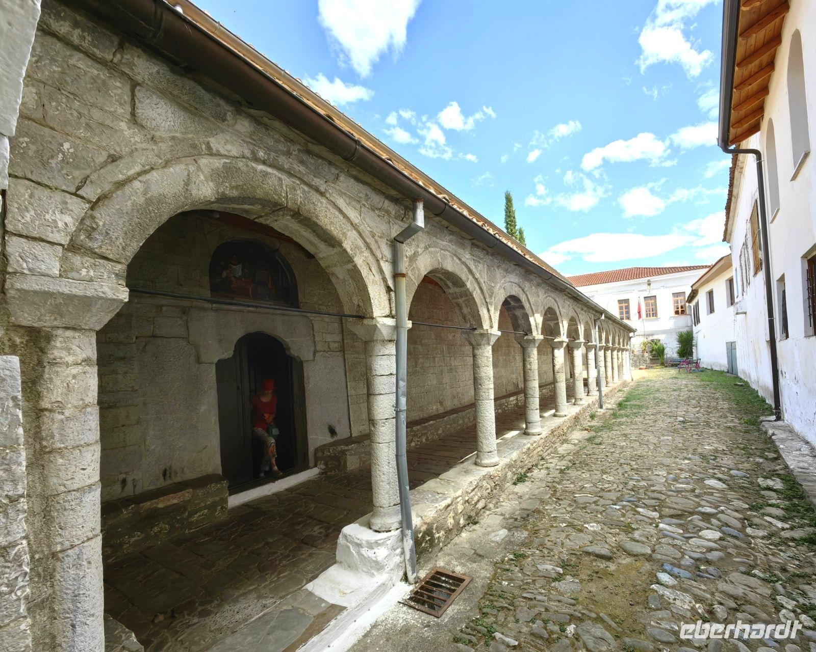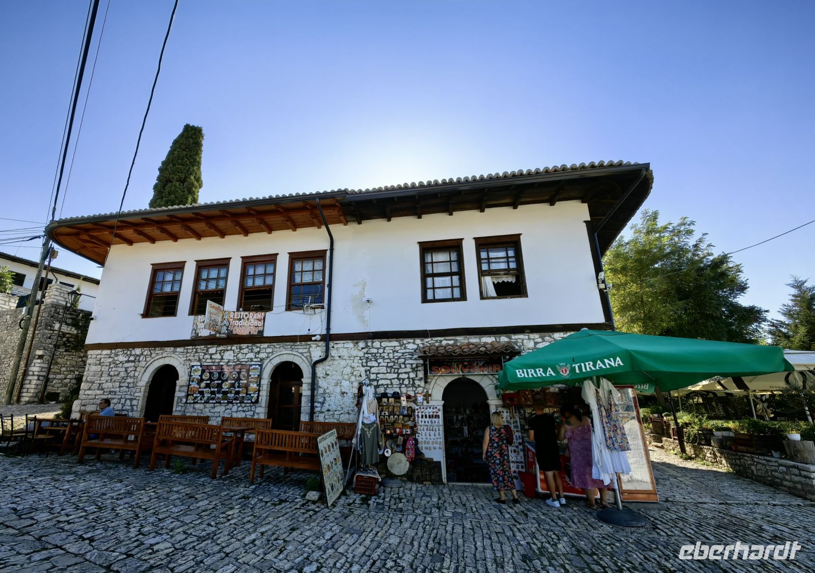 Nach dem Museumsbesuch kraxeln wir die steile und steinige Straße wieder hinab und laufen zu unserem Hotel mitten im Zentrum. Interessanterweise liegt auf der einen Flußseite des Osum der muslimische Teil der Stadt auf der anderen der christliche. Mehrere Brücken verbinden die beiden Stadtteile und unweit unseres Hotels steht sogar eine Moschee direkt neben der Kirche.