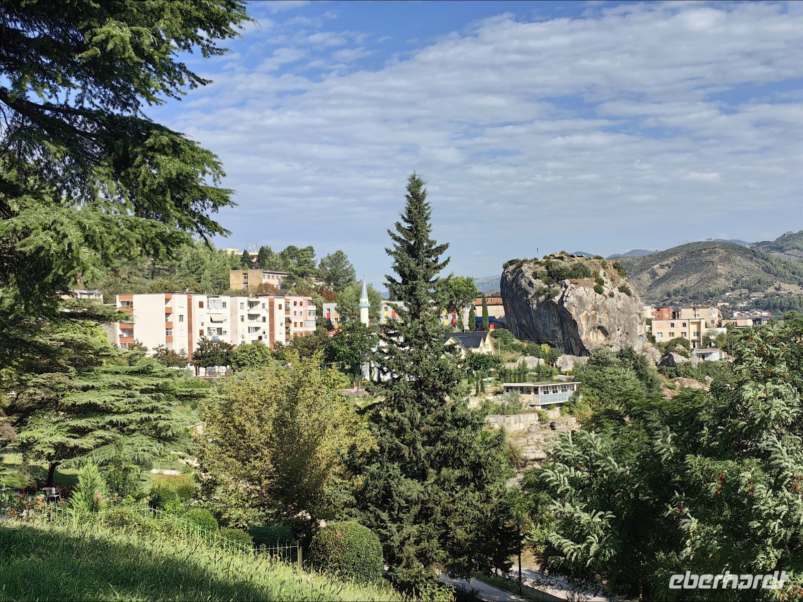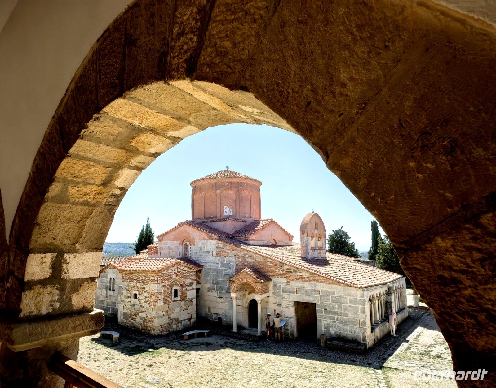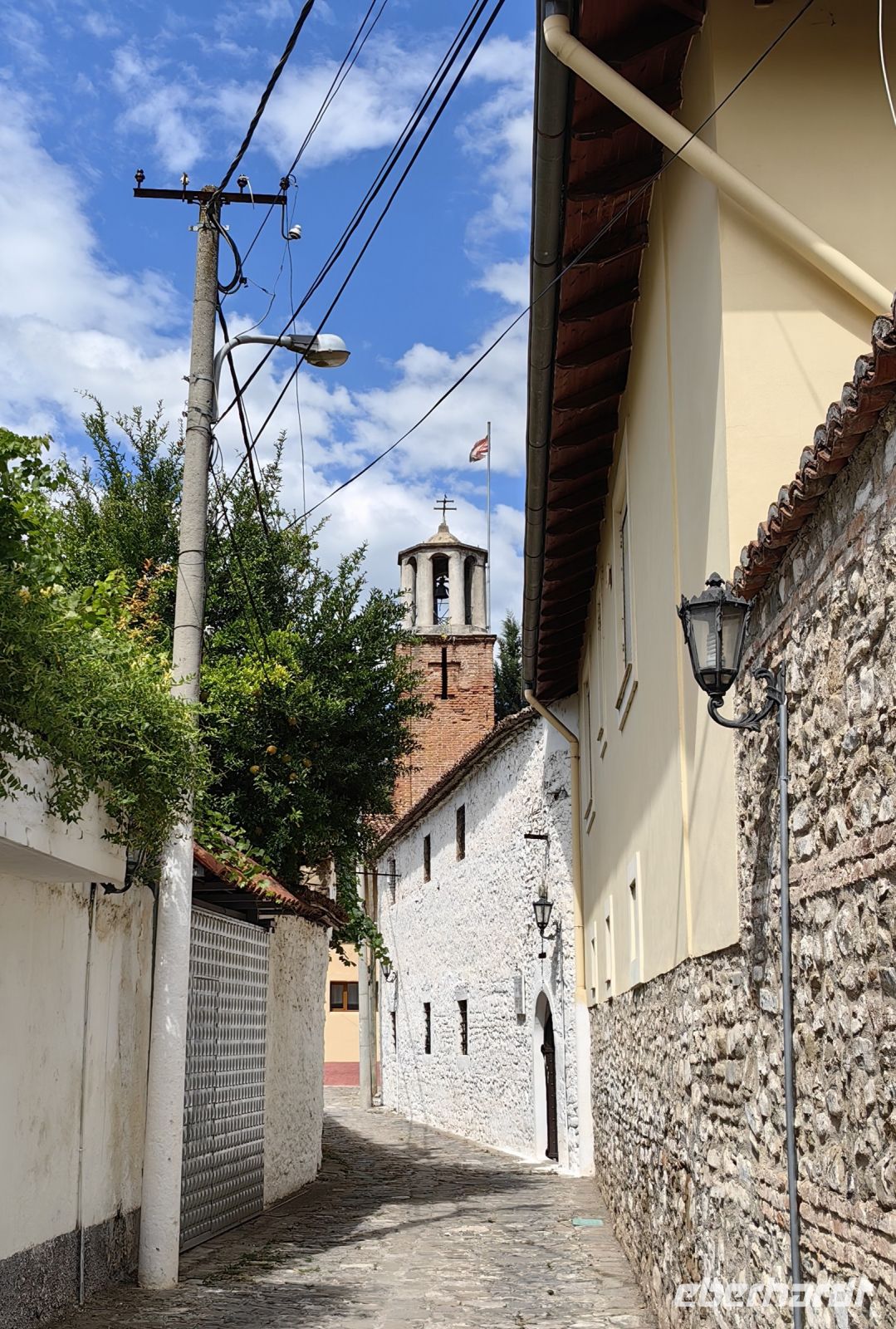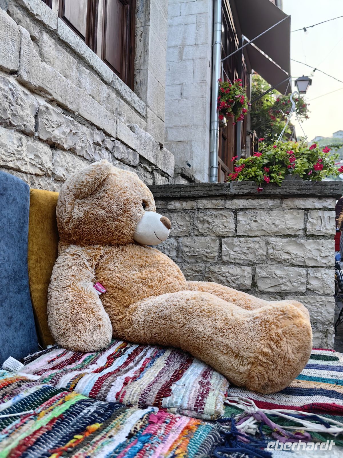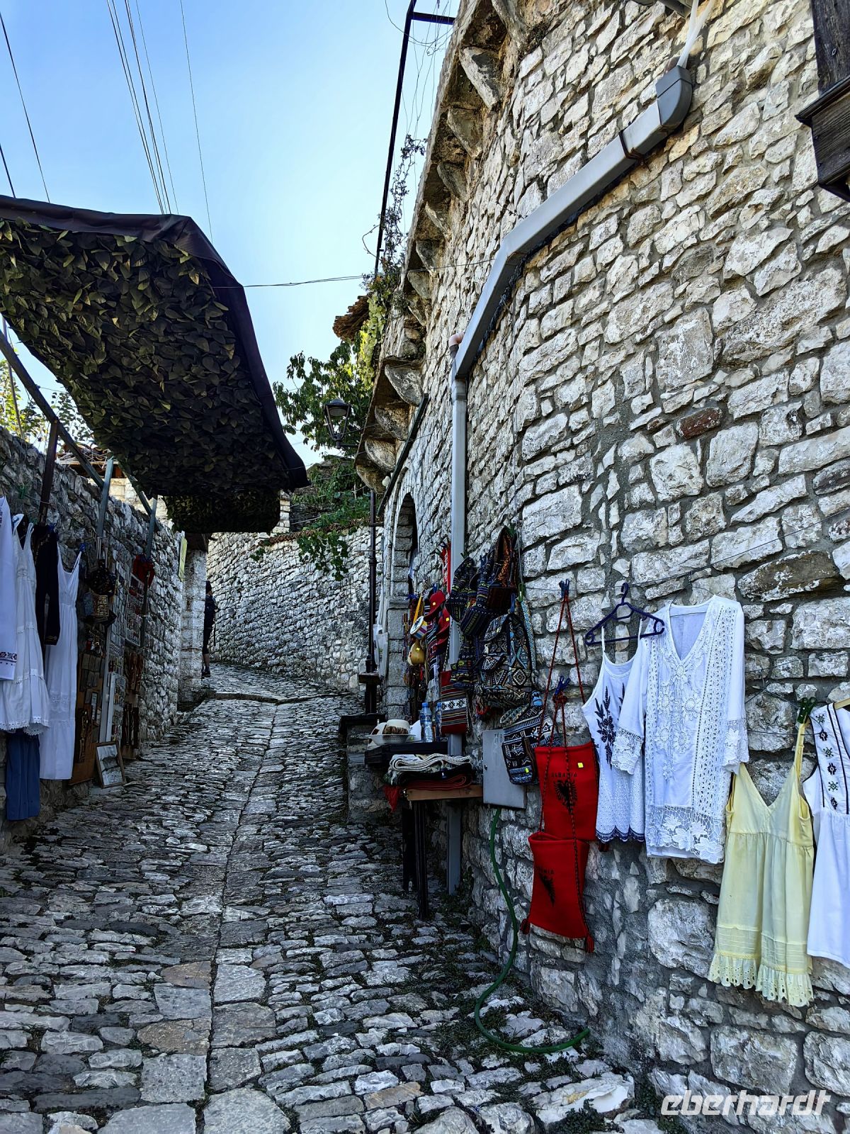 Nach dem Museumsbesuch kraxeln wir die steile und steinige Straße wieder hinab und laufen zu unserem Hotel mitten im Zentrum. Interessanterweise liegt auf der einen Flußseite des Osum der muslimische Teil der Stadt auf der anderen der christliche. Mehrere Brücken verbinden die beiden Stadtteile und unweit unseres Hotels steht sogar eine Moschee direkt neben der Kirche.