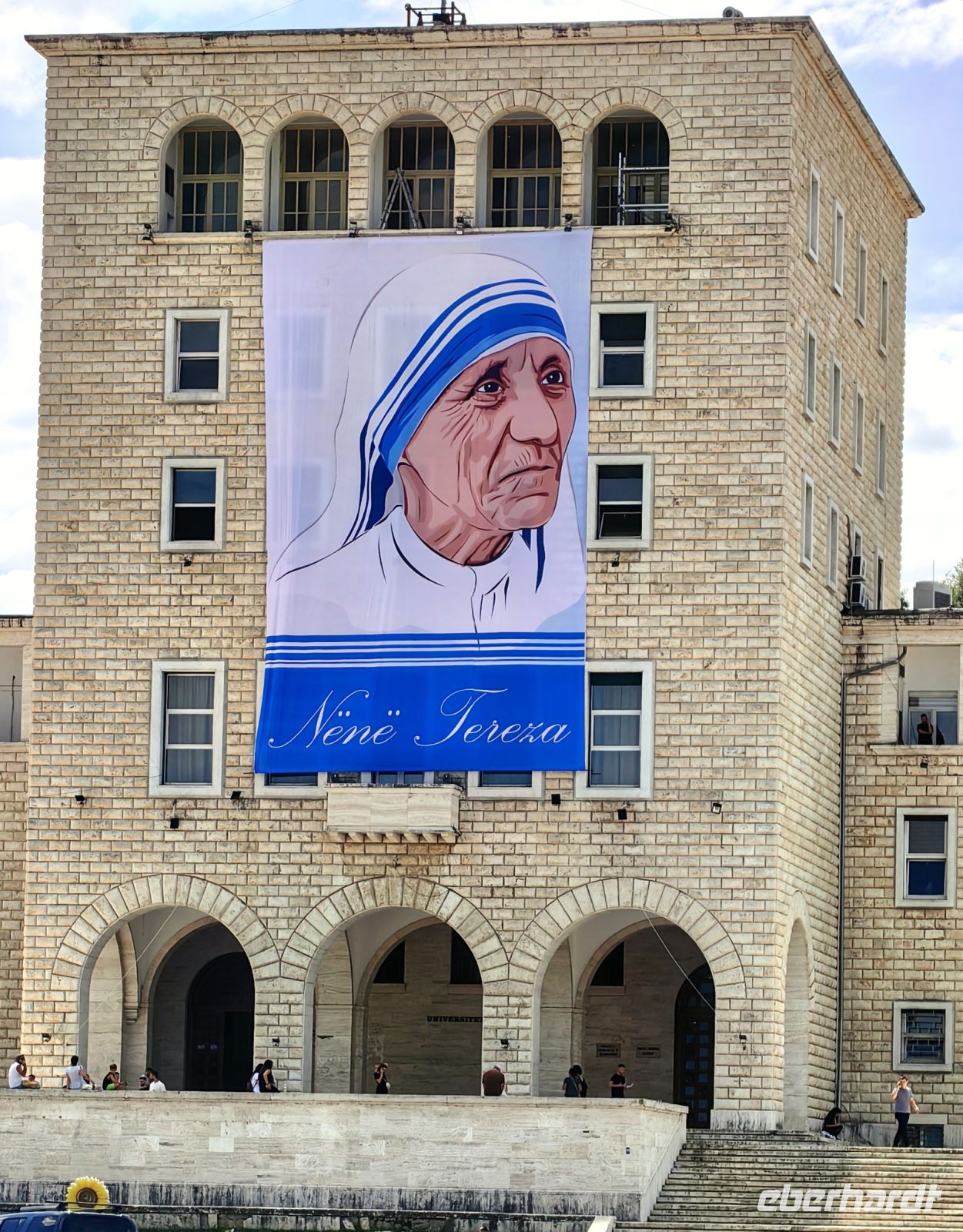 Es bleibt noch Zeit für eine Pause in einem lauschigen Café, wo wir uns im Schatten ein kühles Bier oder eine Limonade gönnen und mit einem Blick auf ein riesiges Bildnis von Mutter Theresa verabschieden wir uns von der Hauptstadt.