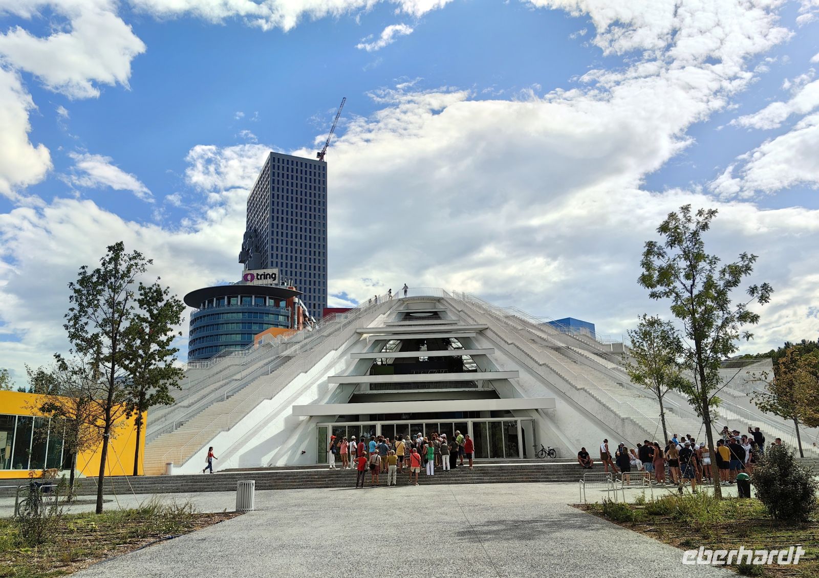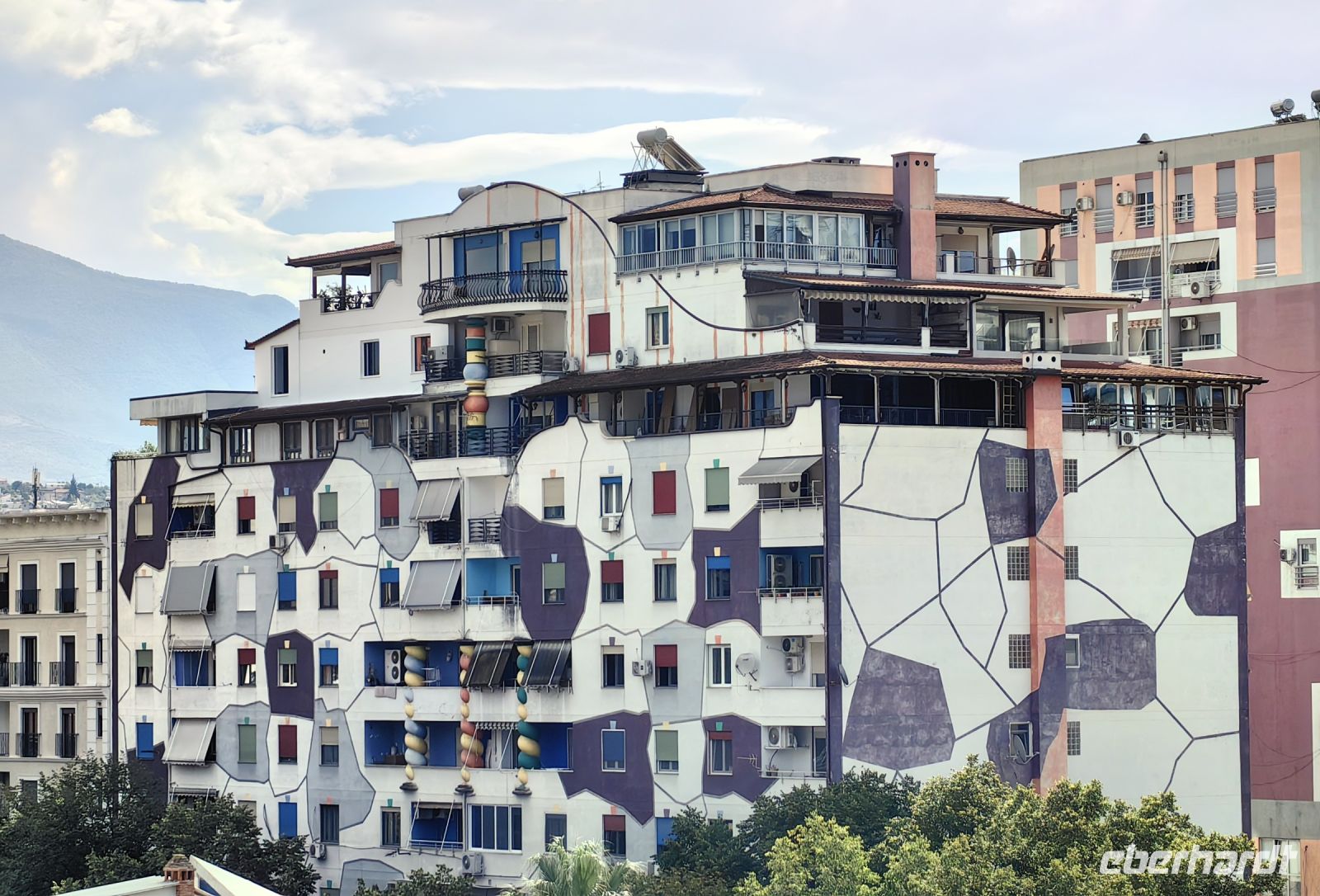Unseren Spaziergang setzen wir an einer ganz neu errichteten Pyramide fort, man kann an allen Seiten hinaufsteigen und einen tollen Ausblick genießen. Im Inneren wird kräftig an bunten flippigen Wohnungen und Geschäften gebaut, wie überhaupt in Tirana an jeder Ecke gebaut wird, Neues entsteht hier in immer kürzerer Zeit und wir schießen kaum ein Foto, auf dem kein Kran zu sehen ist.