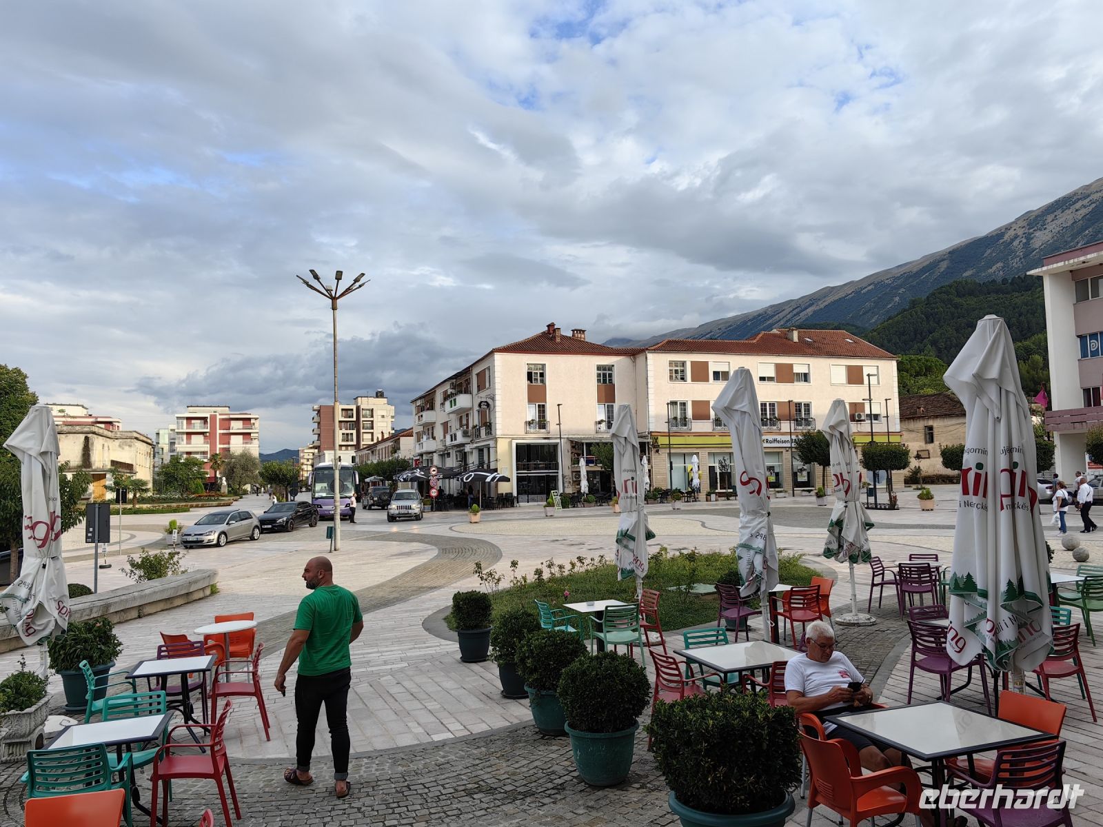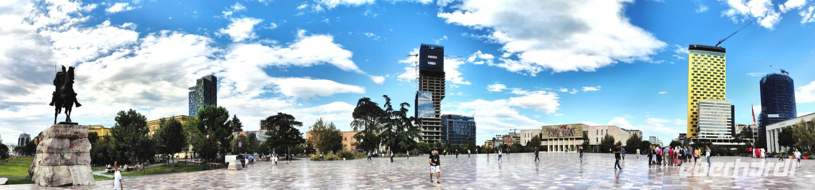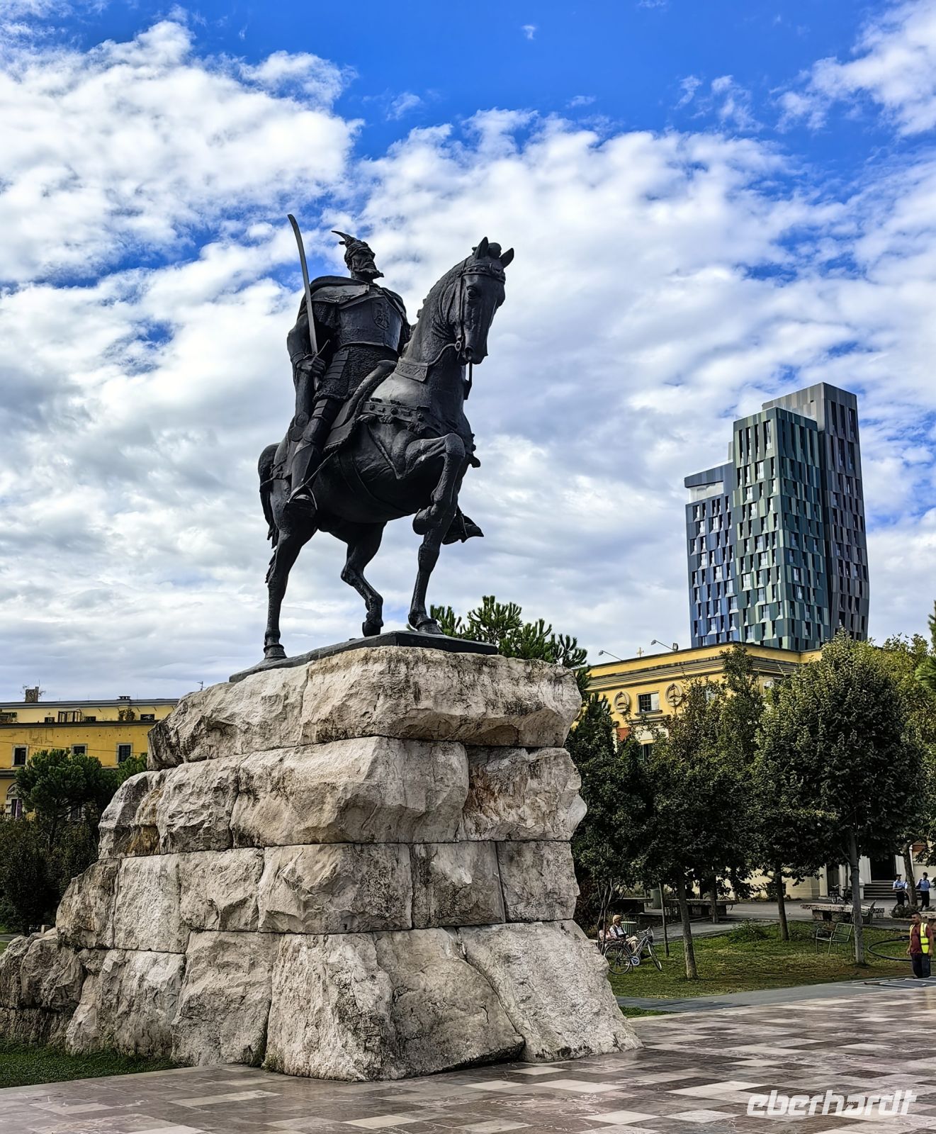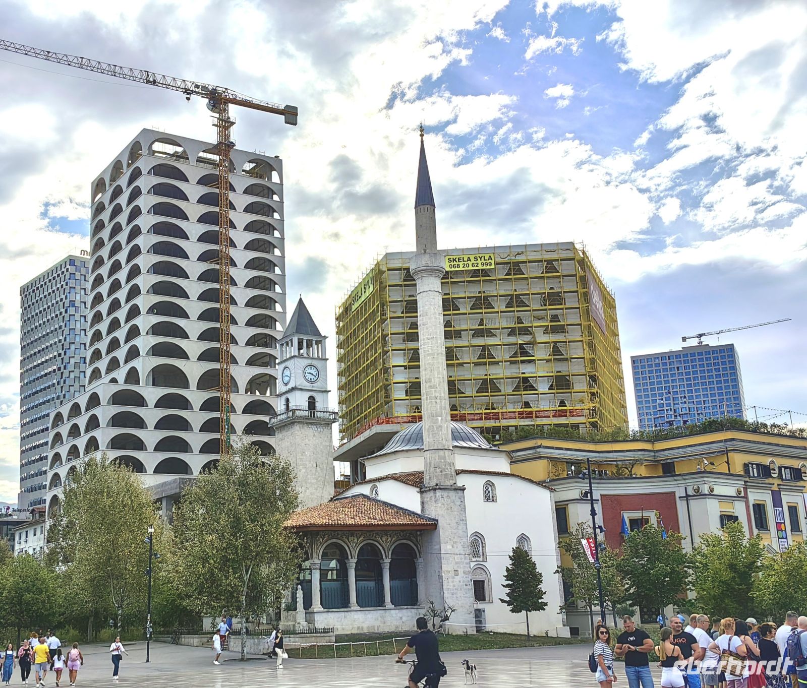 Wir laufen zum Stadtzentrum, dem Skanderbegplatz. In den letzten fünf Jahren ist hier vieles neu entstanden. Zentral in der Mitte befinden sich noch immer eine große Statue von Skanderbeg und eine historische Moschee. Die Enver Hoxha Statue gibt es nicht mehr. Rundherum war einst ein Park. Dieser ist jetzt Pflastersteinen gewichen und einem modernen Opernhaus. Am Rande des Platzes ragen riesige Hochhäuser hervor, die mit ihren Glasfassaden gar nicht so recht zum Rest passen wollen.