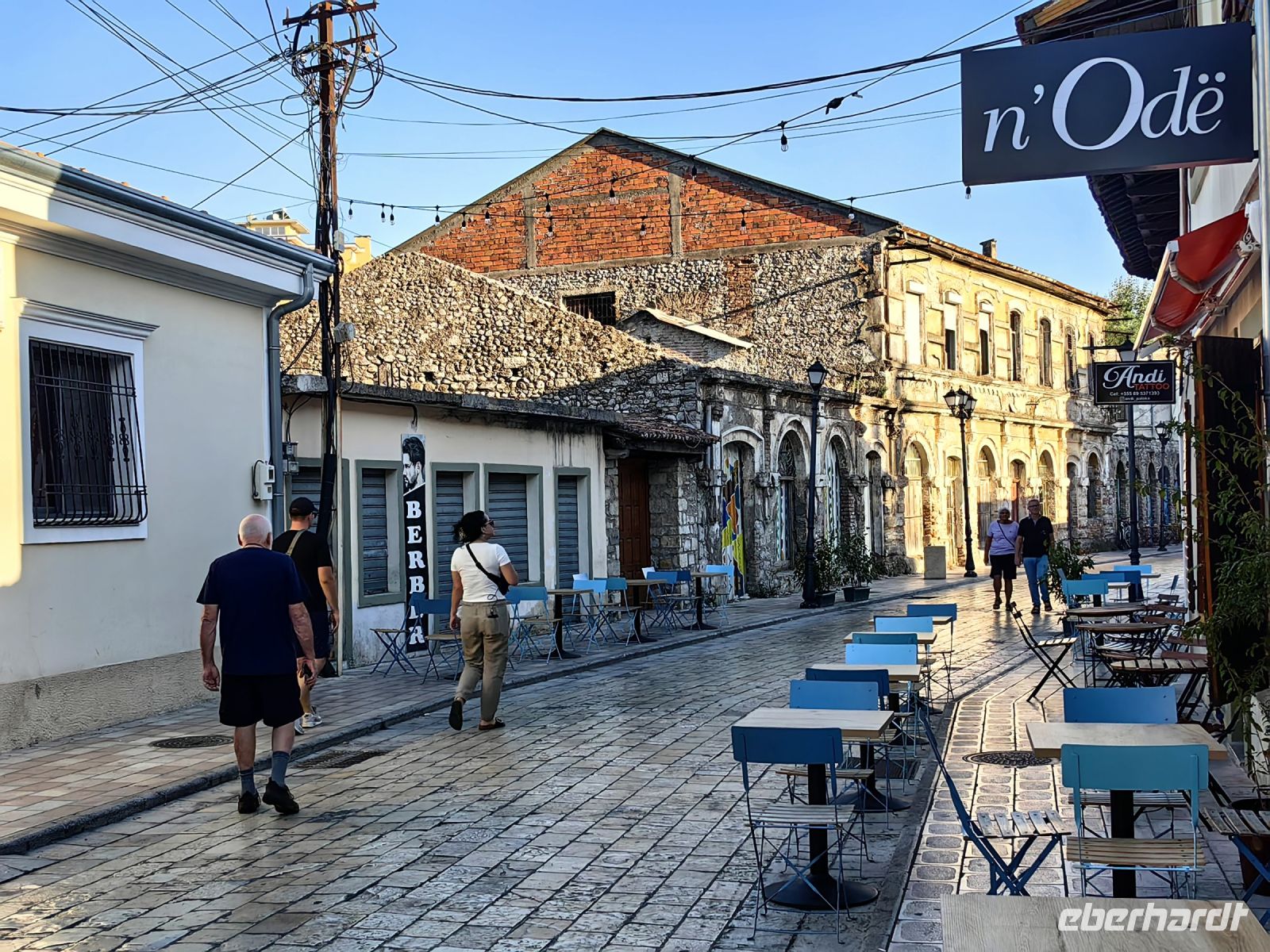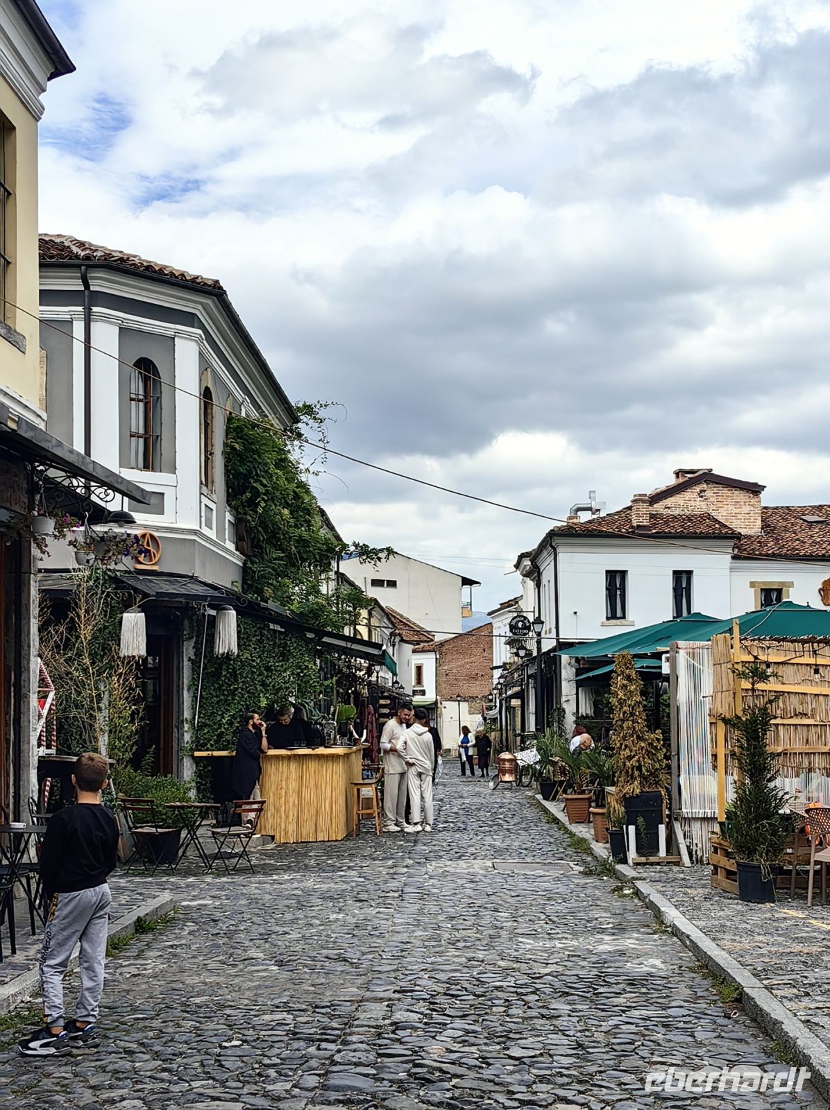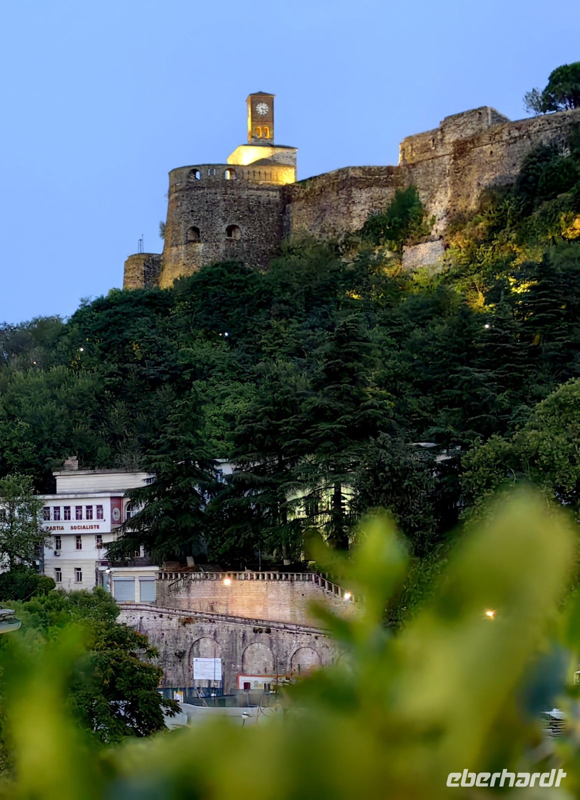 Vor dem Abendessen treffen wir uns im Hotel wieder und laufen gemeinsam in ein nahe gelegenes Restaurant, wo wir das Flair der Stadt auf uns wirken lassen können, wir haben fantastischen Burgblick. Danach machen wir noch einen Abstecher in eine der Gassen, wo heute Livemusik gespielt wird, die Stimmung ist ausgelassen, jung und alt, Albaner und Gäste, alle tanzen und sogar der Polizist hat sein Revier verlassen, um das ganze Spektakel mitzubekommen. Bis Mitternacht wird getanzt und gefeiert in allen Gassen und für uns geht ein wunderschöner, erlebnisreicher Tag zu Ende.