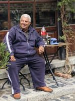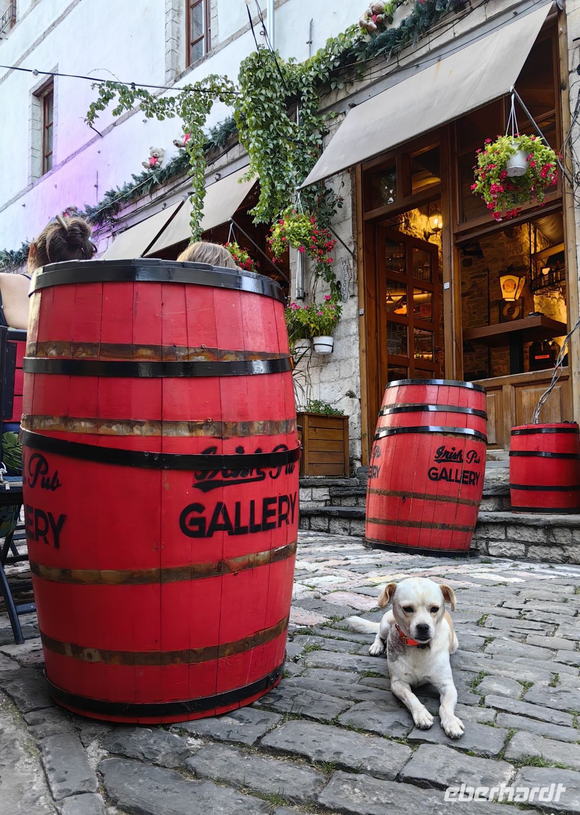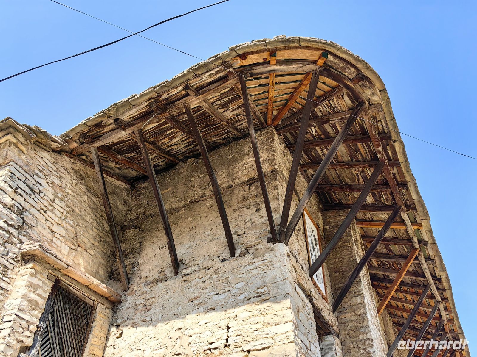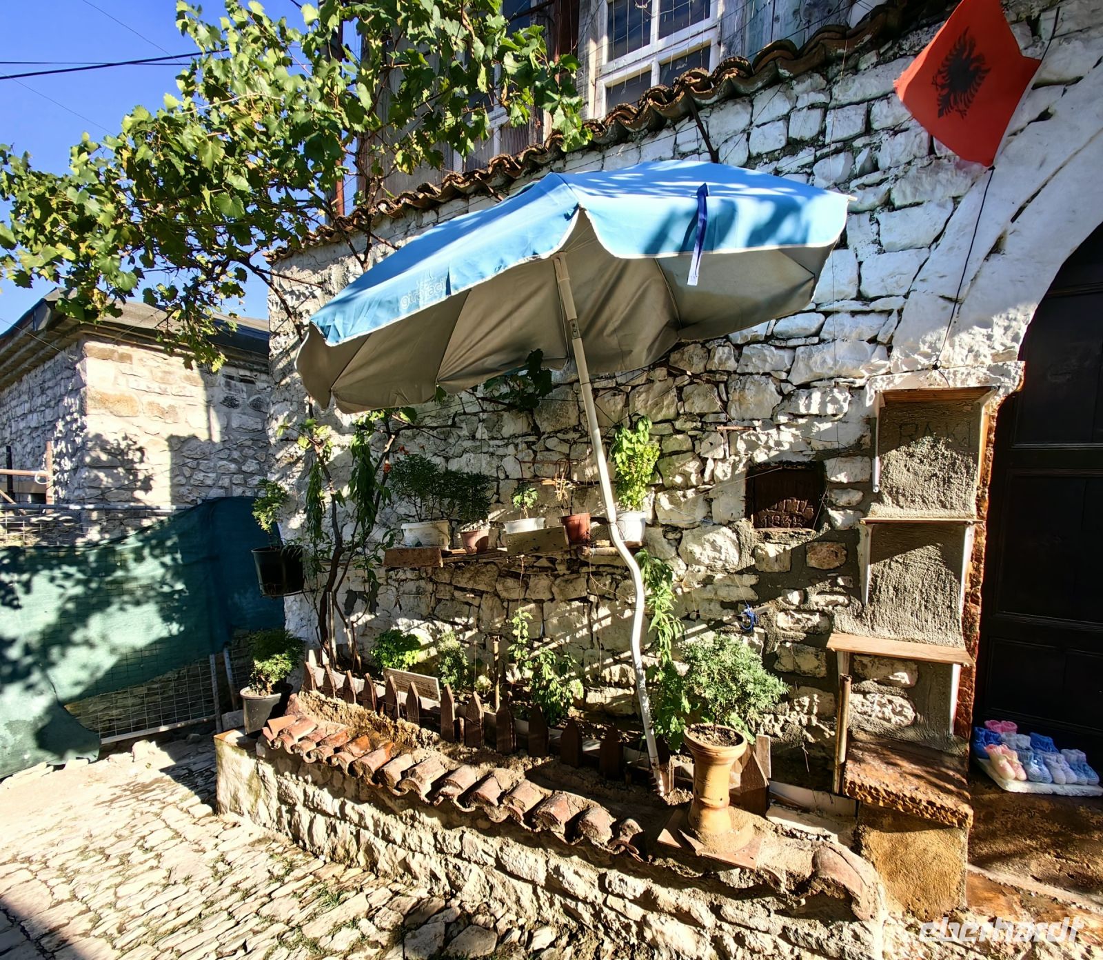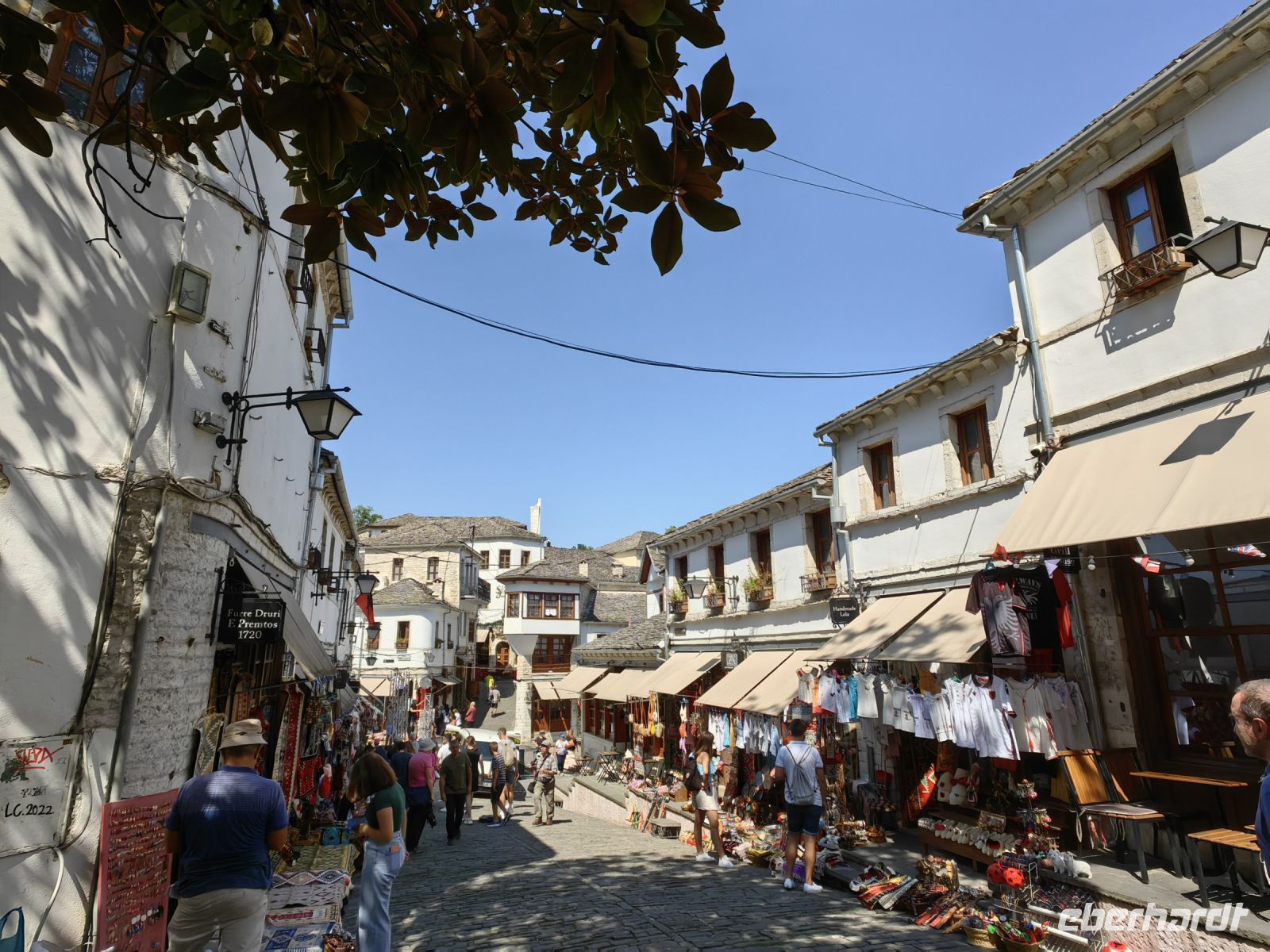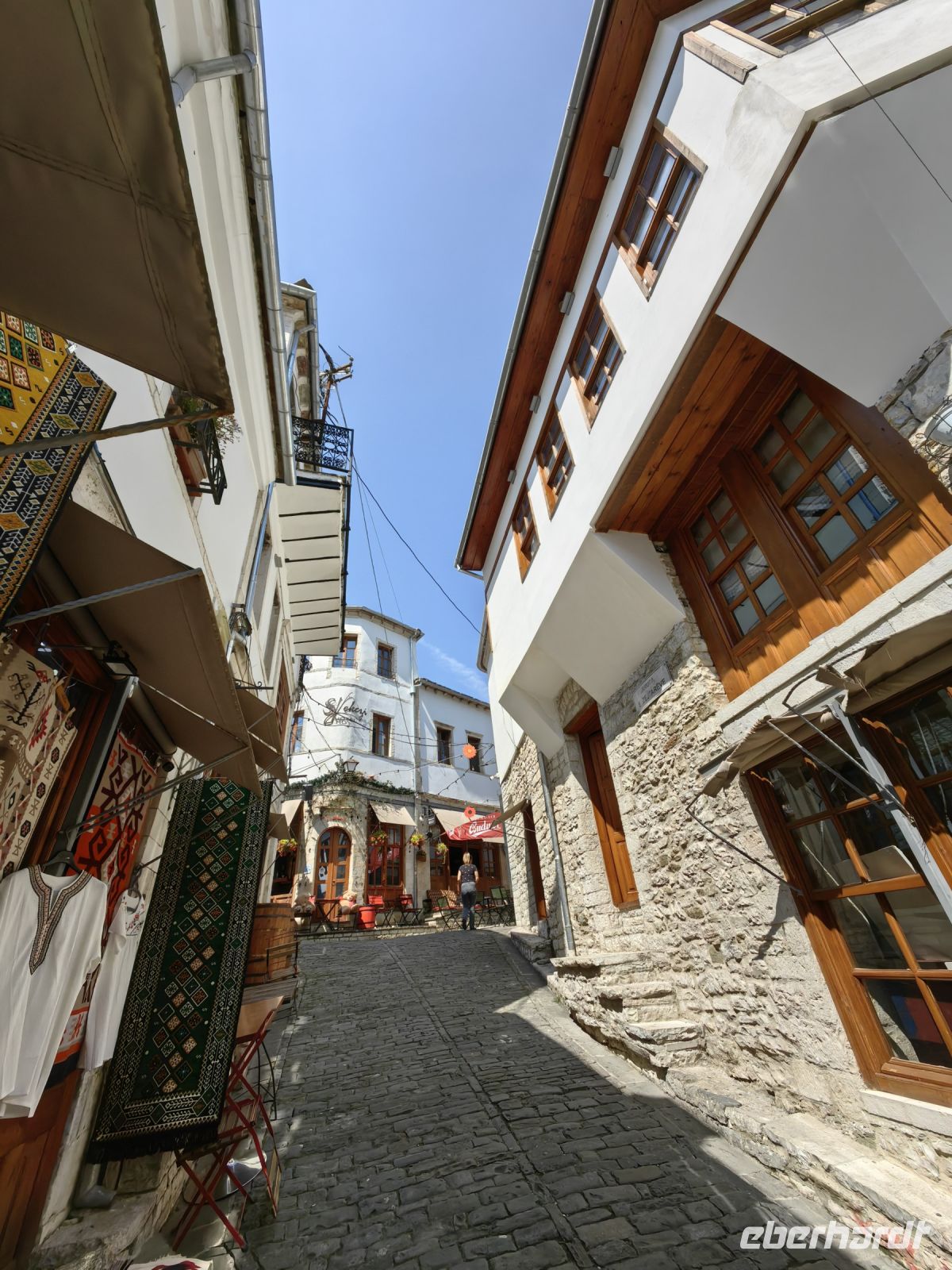Zur Mittagszeit brechen wir gemeinsam mit Alert auf und steigen in der "Stadt der tausend Stufen", wie Gjirokastra auch genannt wird, hoch auf die Burgfestung. Auf dem Weg nach oben sehen wir die Häuser aus nächster Nähe. Der berühmte albanische Schriftsteller Ismail Kadare, der hier geboren wurde, beschreibt seine Heimatstadt in seinen Roman eindrucksvoll. Im Sommer bleibt das Innere dieser Häuser mit den schmalen hohen Fenstern kühl und die Steine wärmen im Winter.