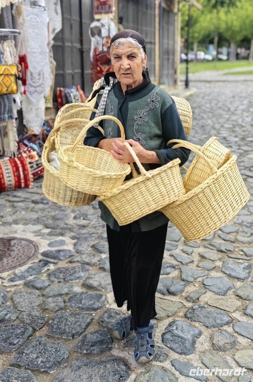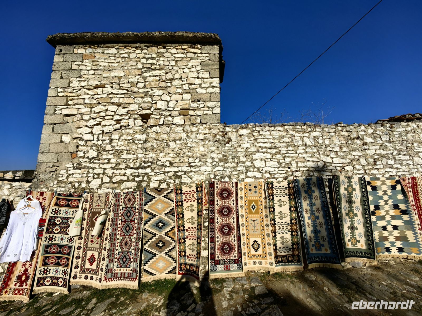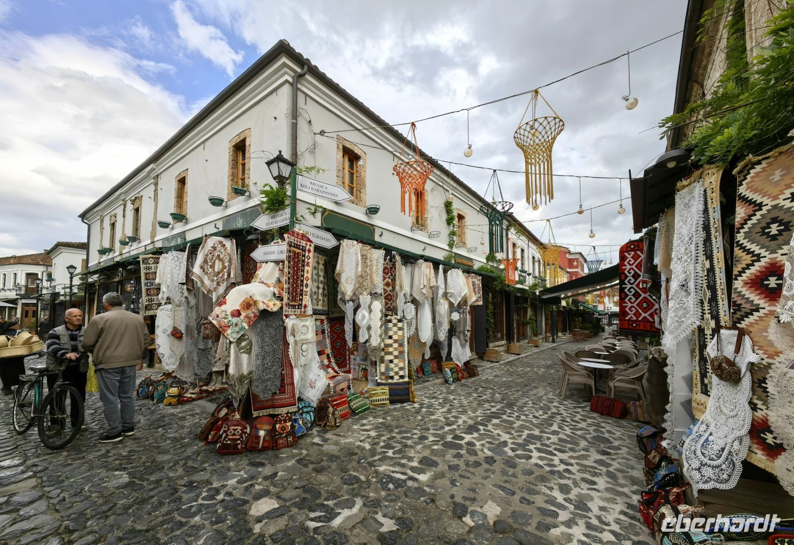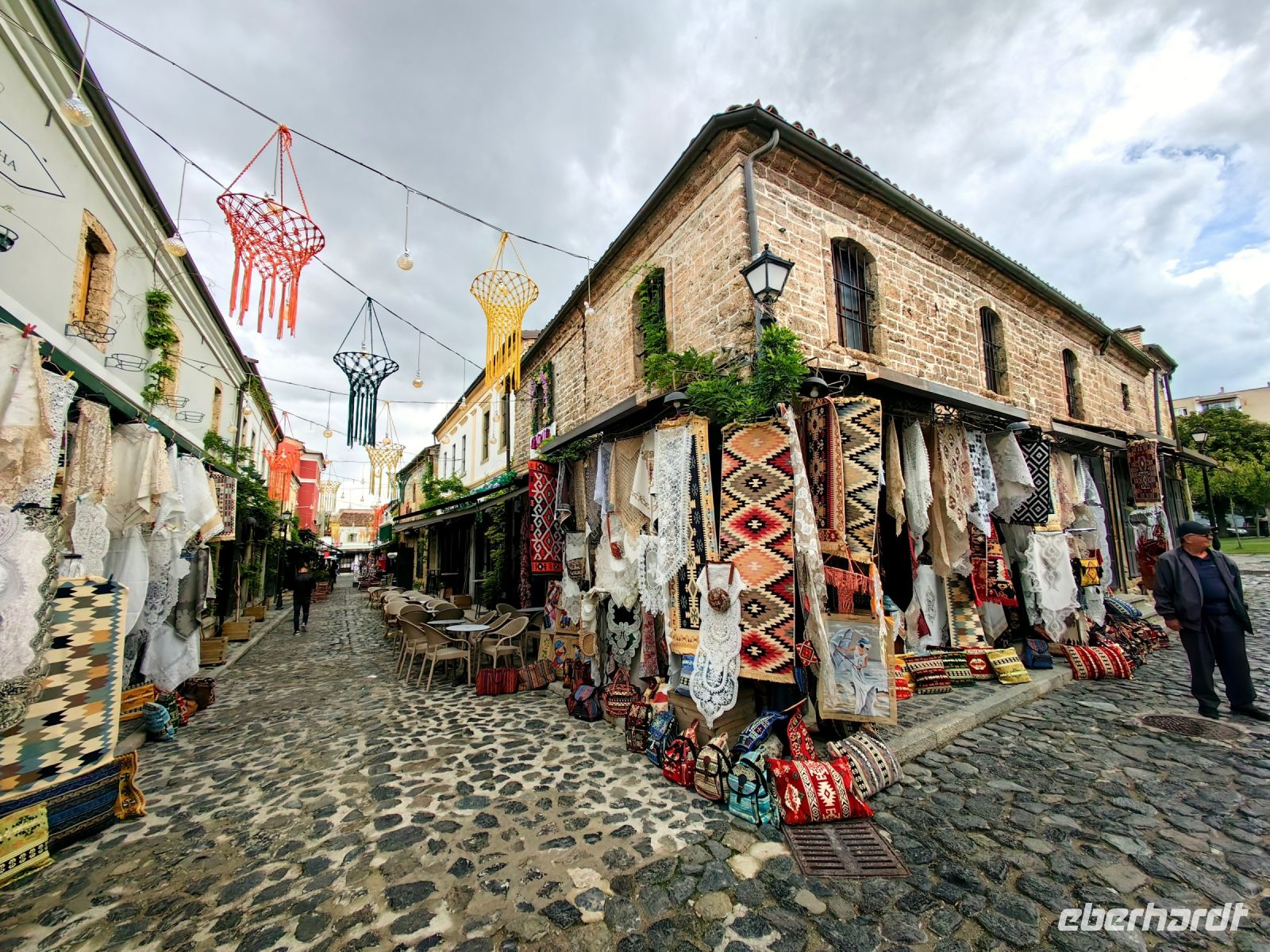 Danach flanieren wir die Fußgängermeile in Richtung der Altstadt entlang. Rechts und links können wir noch einige Zweckbauten aus den kommunistischen Jahren sehen, bevor wir in die pittoresken schmalen Gassen der Altstadt abbiegen. In ihnen befinden sich etliche Handwerkslädchen, ein kupferner Rakibrenner wird uns vorgeführt und unzählige Teppiche und geknüpfte Werke zieren die Auslagen der Souvenirläden. Wir legen auf dem zentralen Marktplatz eine Kaffeepause ein, rundum sind kleine Restaurants und Cafés, alle gut gefüllt, die Atmosphäre ist fast mediterran.