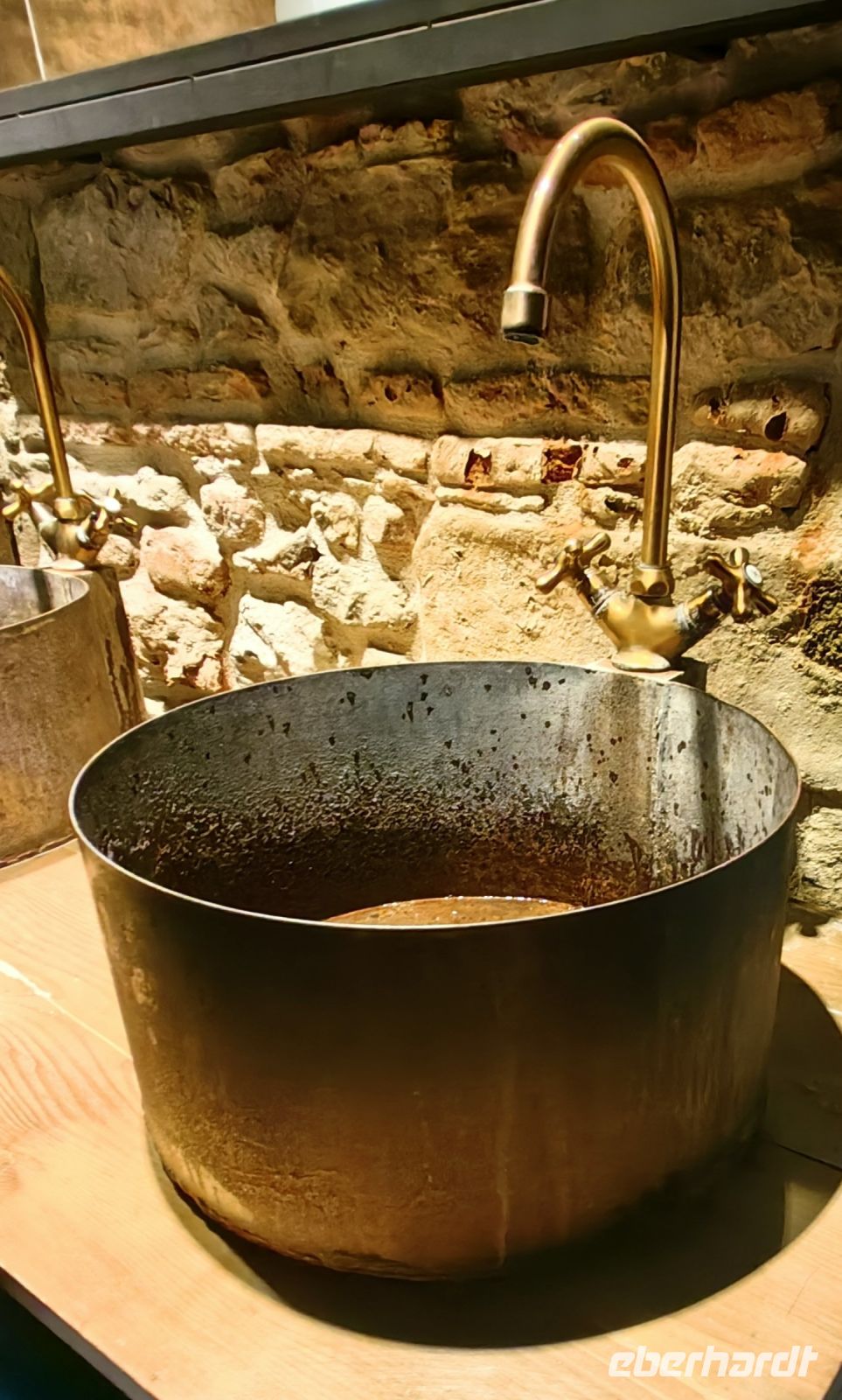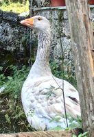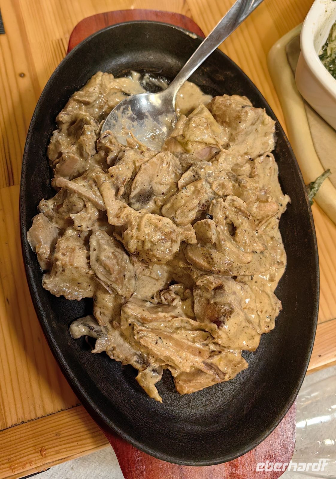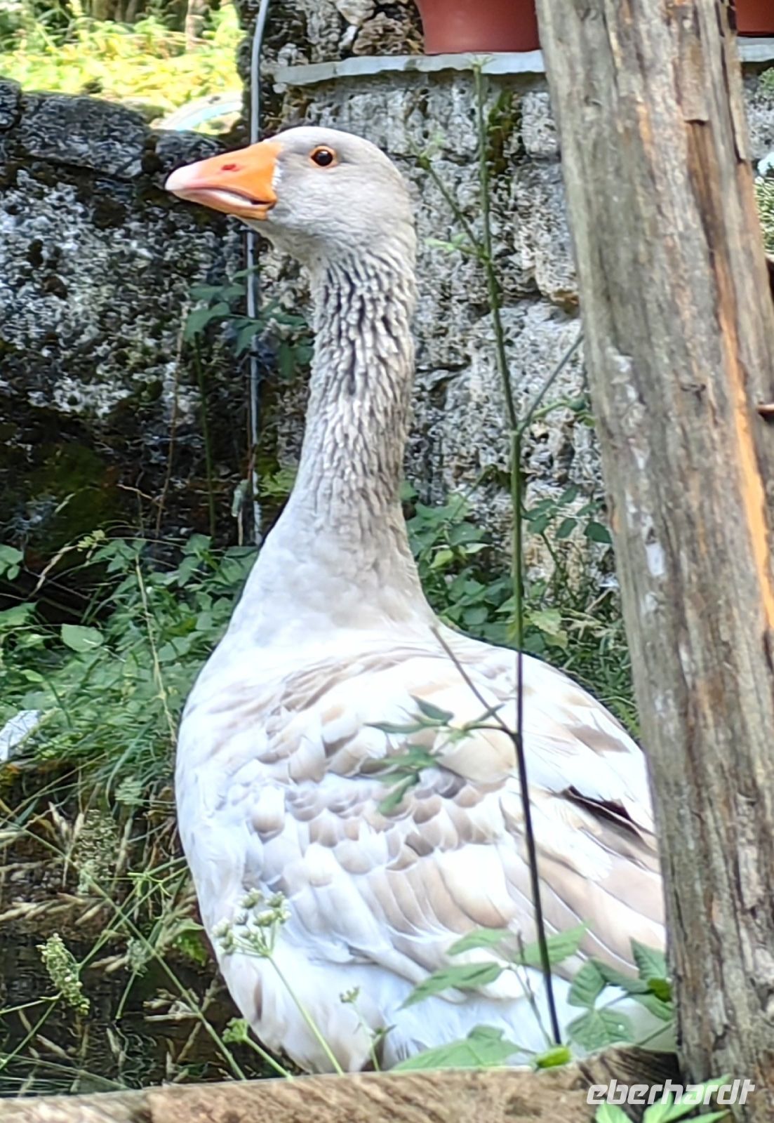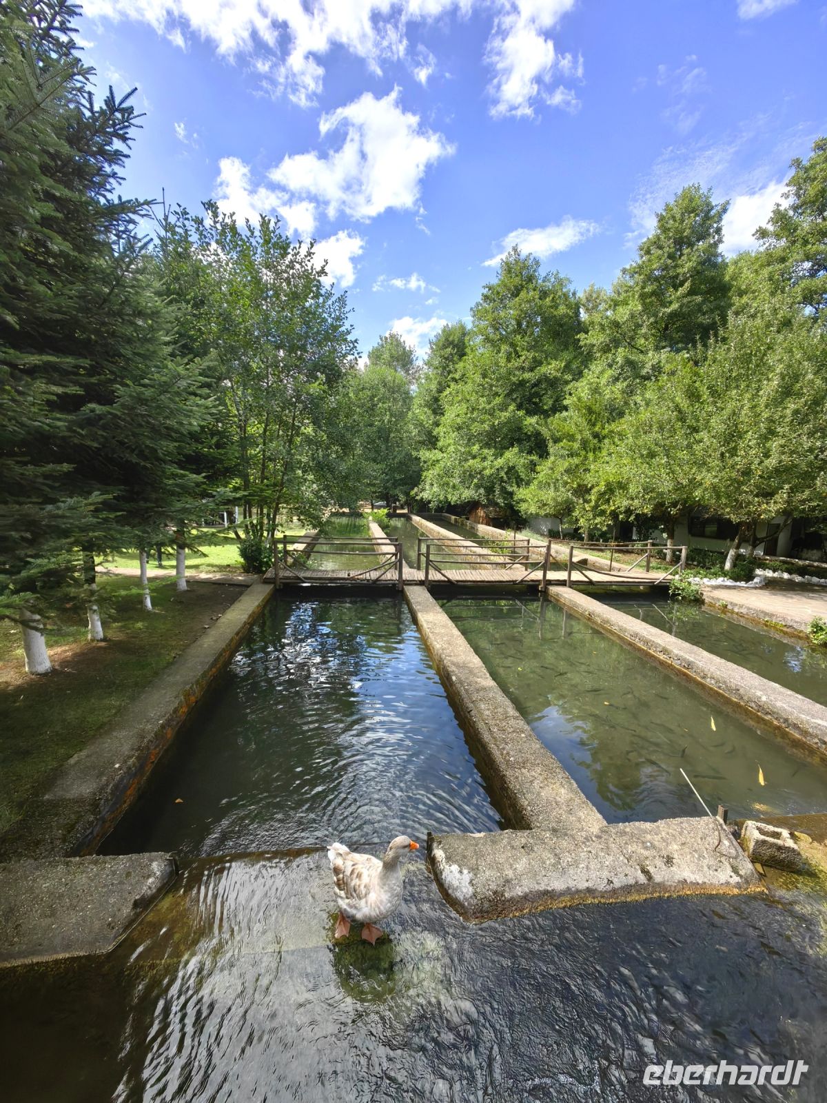 Unsere Mittagspause machen wir auf einer Art Bauernhof. Mitten im Nichts liegt ein gemütliches Gartenlokal. Wir nehmen in schattigen Rondellen platz und sind im Nu umringt von Gänsen, Enten, Hühnern, Hunden und Katzen. Im eigens fürs Lokal angelegten Bach schwimmen munter die Forellen, und als zwei Gäste Fisch bestellen, kommt der Besitzer persönlich und fischt zwei Prachtexemplare mit dem Käscher eigenhändig aus dem Bach, was wiederum die Katze des Hofes sehr interessiert. Wir bestaunen das ganze Spektakel, essen nebenbei und kommen uns um zwei Jahrhunderte in der Zeit zurück versetzt vor.