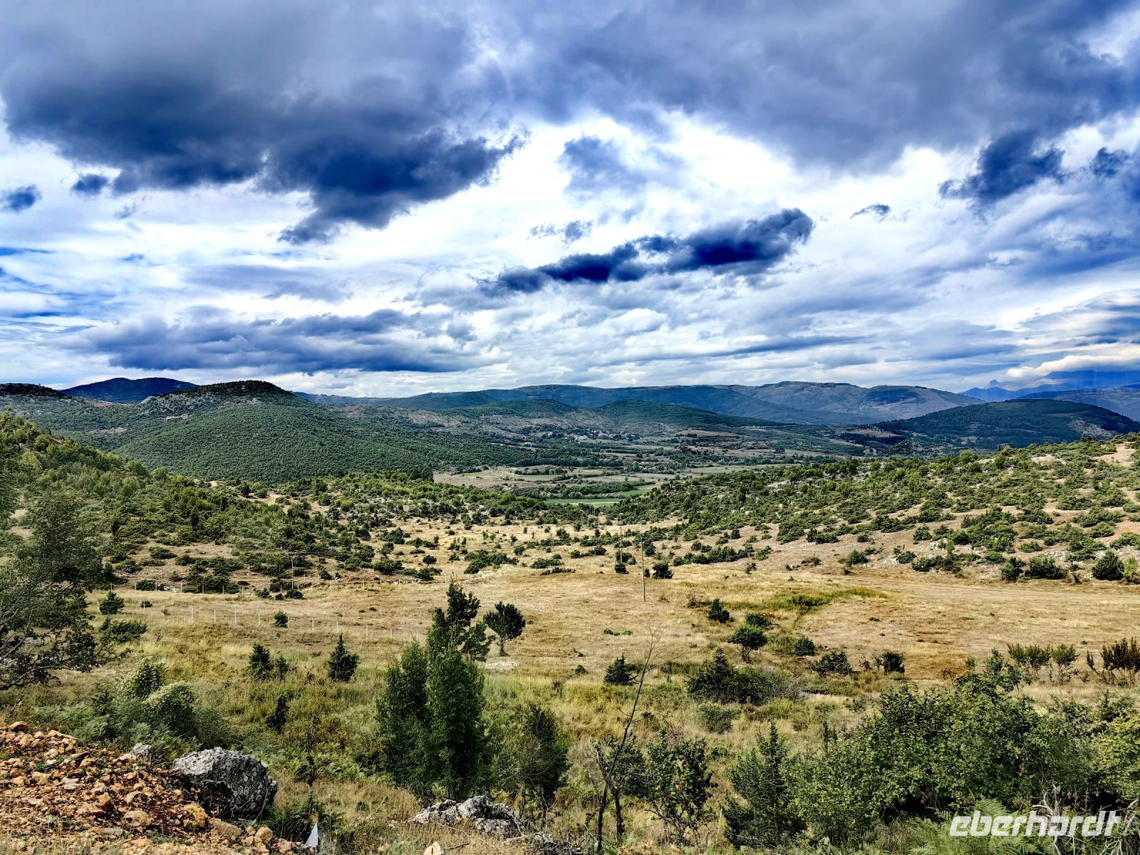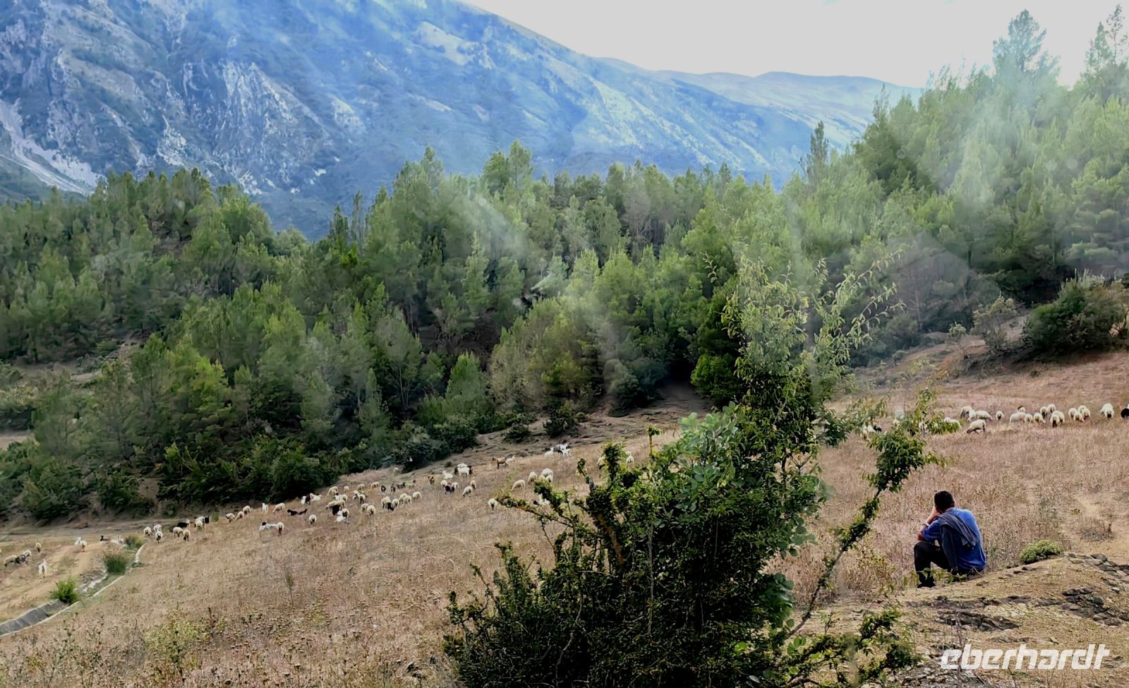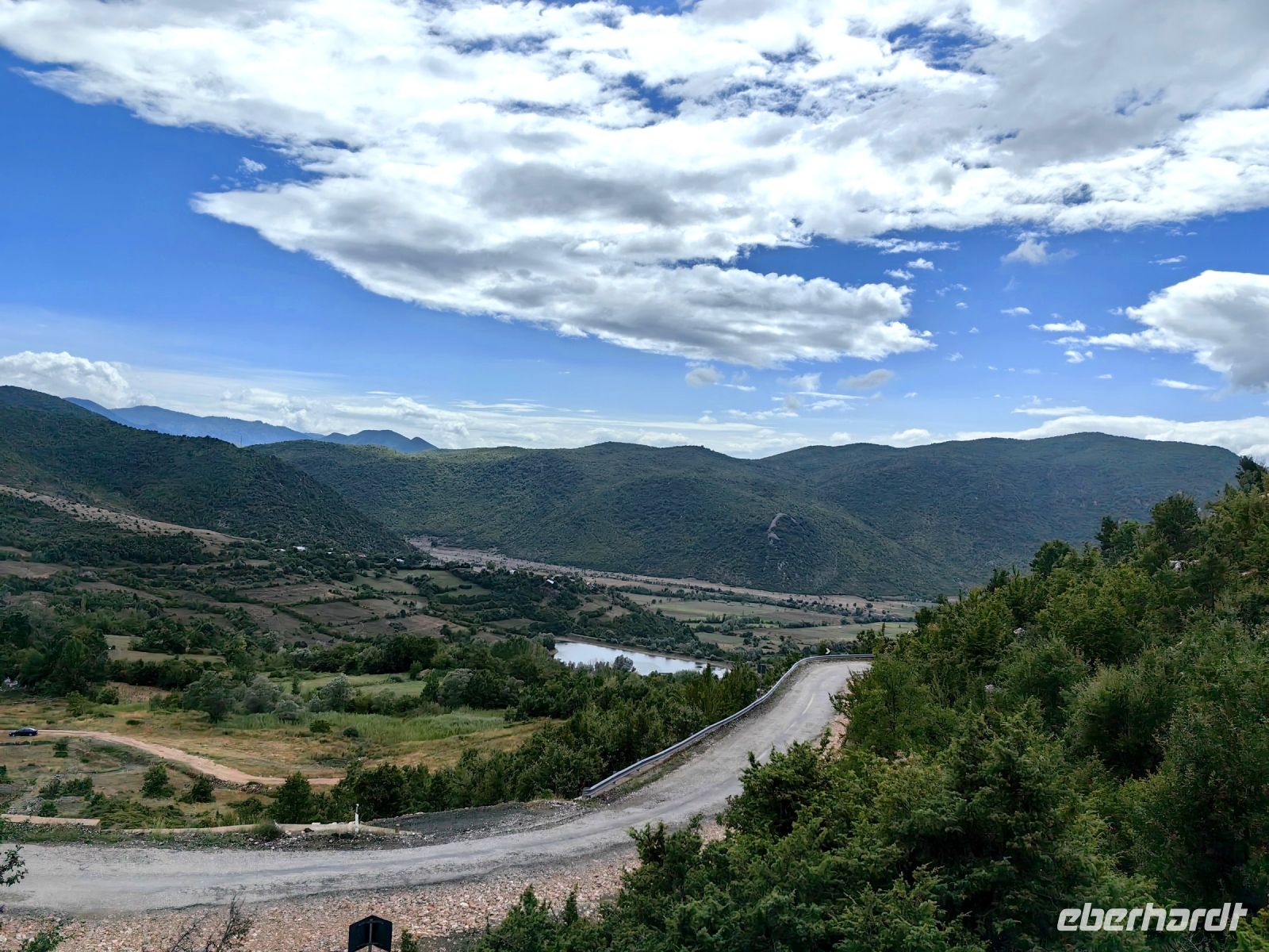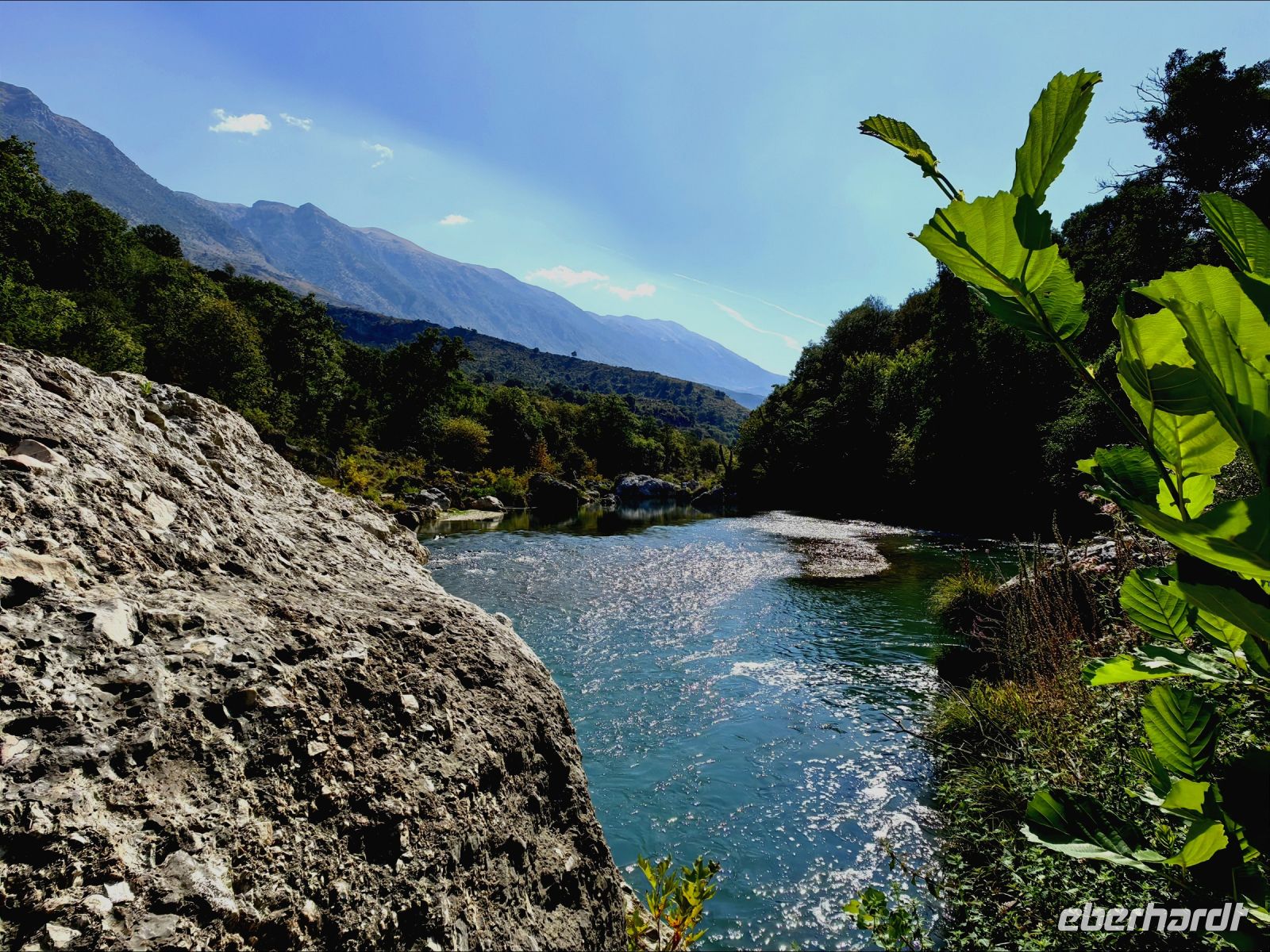 Nach dem Essen fahren wir auf dem gerade neu asphaltierten Stück weiter und werden mit bezaubernden Ausblicken auf Bergdörfer und die malerische Bergwelt mit grünen Tälern und weidenden Tieren belohnt. Als I-Tüpfelchen kommt hinzu, daß wir an den Ufern des Vjosa entlang fahren, dem letzten lebendigen Wildfluß in ganz Europa, der im Tal ungezähmt durch wunderschöne Schluchten strömt. Leider führt er am Ende des Sommers nicht viel Wasser aber dadurch entdecken wir ursprüngliche Flußabschnitte mit Inseln, vielen Seitenarmen und weitläufige Mäandern.