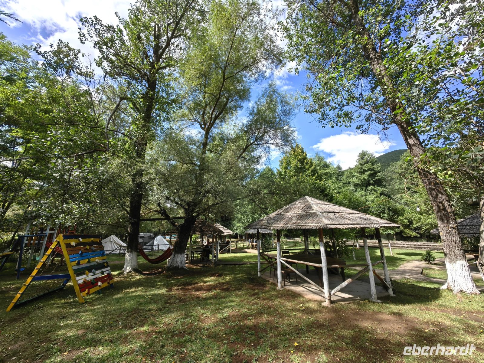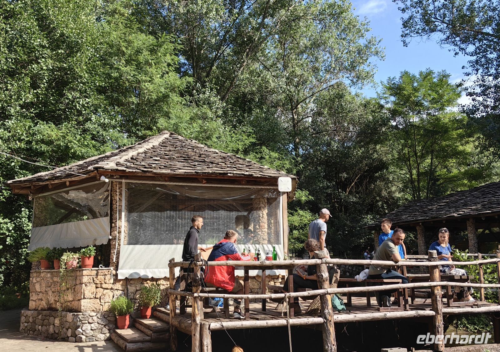 Es ist früher Nachmittag geworden und wir verspüren ein wenig Hunger. Also fahren wir weiter immer entlang des Shkumbin-Flusses und halten an einem Restaurant, wo wir eine späte Mittagspause im Grünen einlegen. Beliebt bei den Herren der Gruppe ist das einheimische Korca Bier.