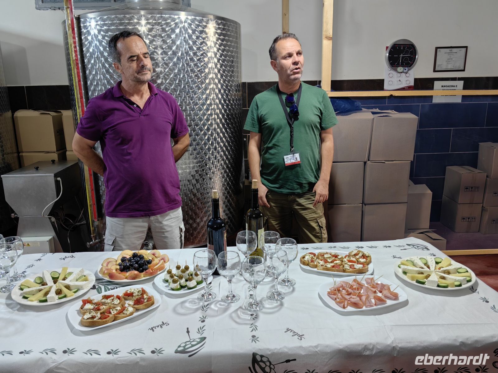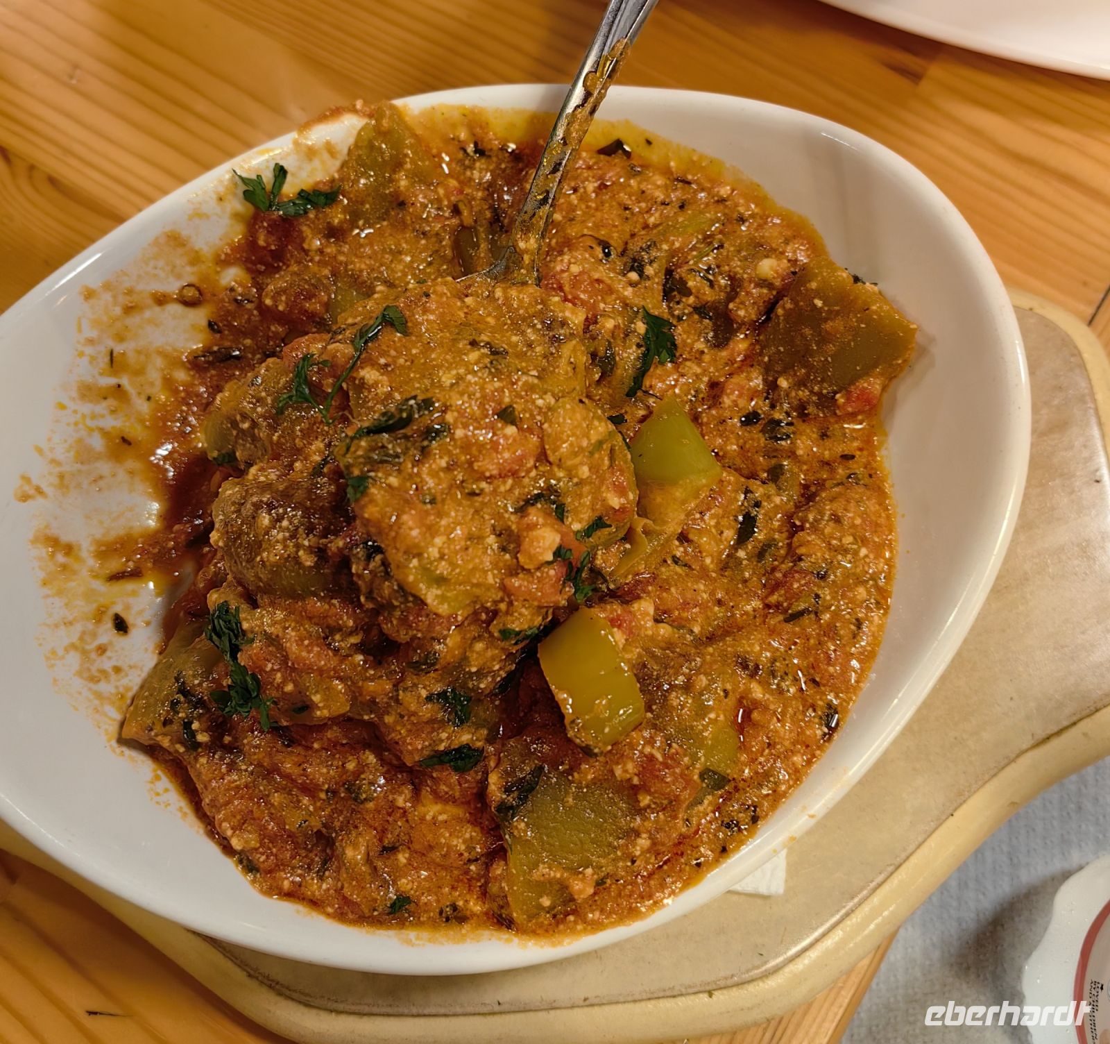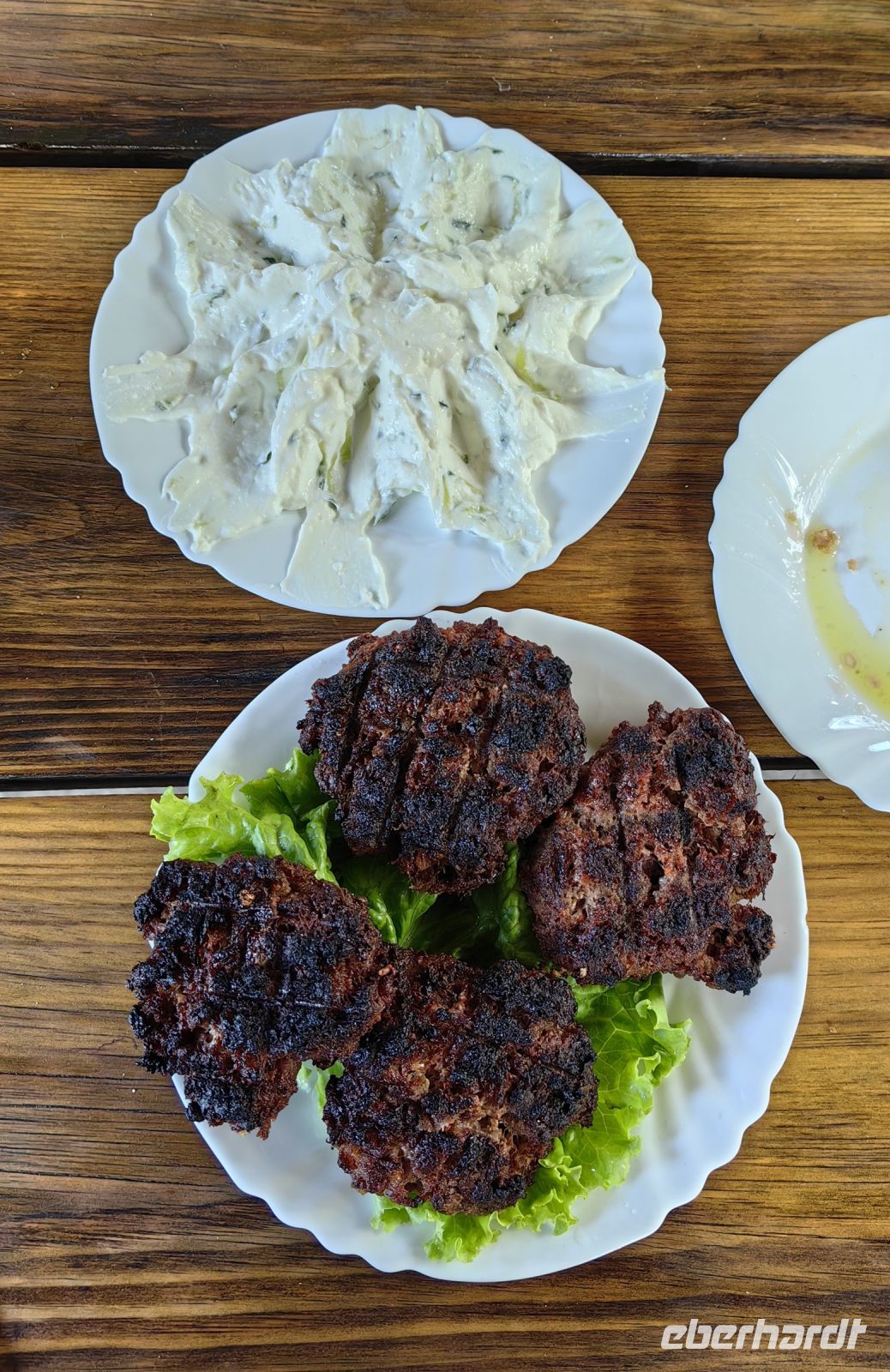 Nach einer kurzen Stippvisite auf den Zimmern laufen wir zum nächstgelegenen Weingut, wo wir einheimische Weiß- und Rotweine und zum krönenden Abschluß den bei Albanern beliebten Raki probieren dürfen. Die Weine schmecken für europäische Gaumen etwas gewöhnungsbedürftig, dafür mundet uns der Raki um so besser und nach dem ganzen Alkohol laufen wir beschwingt direkt zum Abendessen in einem Restaurant auf der Hauptstraße des Ortes. Durften wir die letzten beiden Abende schon sehr gute albanische Hausmannskost probieren, serviert man uns heute ein Essen, daß wirklich außerordentlich lecker schmeckt. Angefangen vom Salat, bis zum selbst gebackenen Brot, dem fantastischen mit Käste überbackenen Spinat und der sämigen Eierspeise mit Gemüse (Fergez), Blätterteigtaschen mit Spinat (Burek) bis hin zum in Sahnesauce marinierten Räucherschwein sind unsere Gaumen so verwöhnt worden am Ende des Mahls, daß wir kurzerhand überlegen, die tolle Köchin bis zum Ende unserer Reise einfach mitzunehmen. Diese findet den Gedanken überaus amüsant, will aber nicht umher reisen und so müssen wir uns leider am späten Abend glücklich, sehr gesättigt und zufrieden von ihr verabschieden.